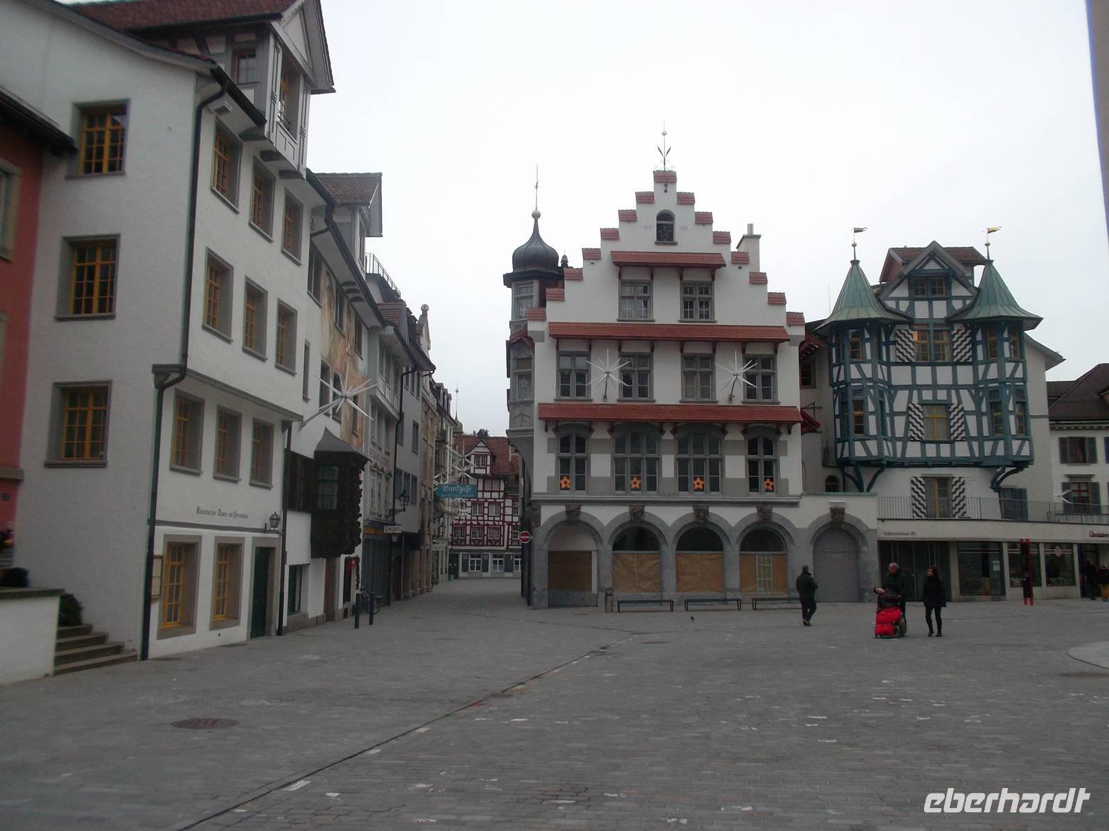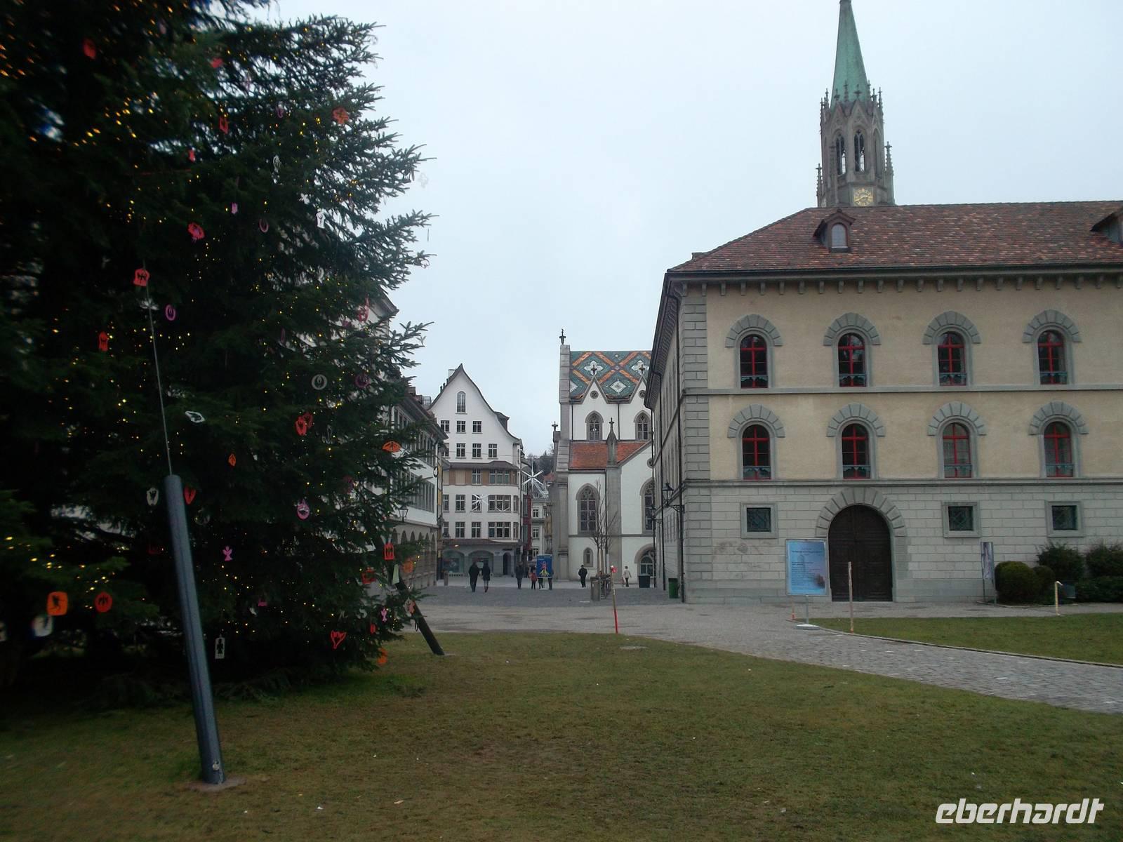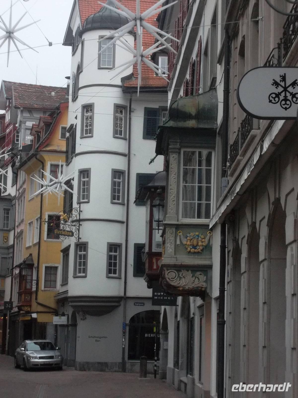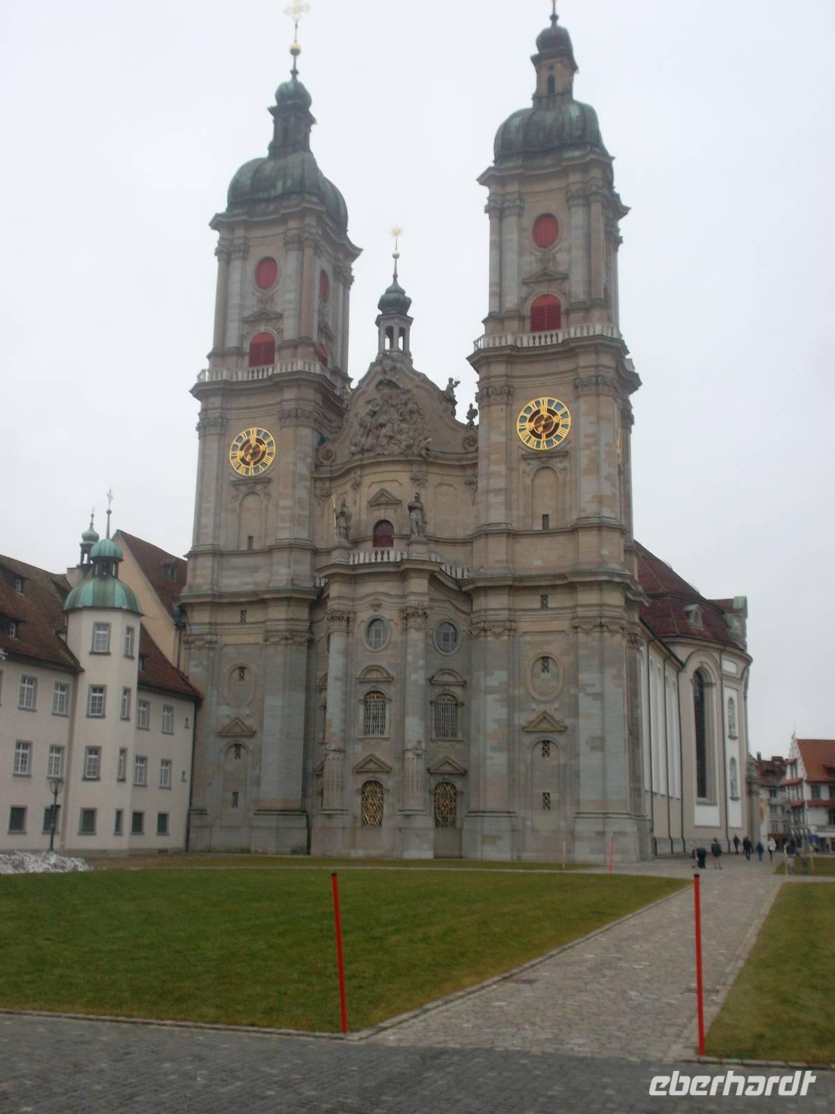 Heute, zu Neujahr mussten wir nicht so früh aufstehen - das Frühstück war als Brunch gedacht und etwas später aber auch länger als sonst angesetzt. Gegen Mittag trafen sich alle Eberhardt-Reisenden am Bus, der auf dem Parkplatz vor der etwa hundert Meter entfernten Talstation der Säntis-Seilbahn stand. Hier hatten wir, der Buschauffeur und ich, einen kleinen Umtrunk vorbereitet und wir stießen im Namen von Eberhardt-Travel mit den Gästen nochmals mit einem Becher Sekt auf ein gutes und gesundes neues Jahr 2013 an (der Buschauffeur allerdings nur mit Apfelschorle....) Danach fuhren wir Uhr nach St.Gallen. Die Hauptstadt des gleichnamigen Kantons ist die siebtgrößte Stadt der Schweiz, ihre Altstadt wie auch ihr Kloster stehen unter UNESCO-Weltkulturerbe-Schutz und sind äußerst sehenswert. Pünktlich trafen die beiden Stadtführerinnen am Busparkplatz ein und wir konnten, nachdem die Gruppe in zwei Kleingruppen geteilt war, einen interessanten Rundgang durch die völlig ausgestorbene Altstadt gemacht. Fachwerkhäuser, schlossähnliche Patrizierbauten und vor allem viele herrlich verzierte Erkervorbauten - 110 sollen es insgesamt in der Altstadt sein - faszinierten auf unserem Weg. Die Stadt St. Gallen war lange Zeit durch Textilgestaltung und -Handel reich und berühmt. Den Ursprung bildete jedoch ein Kloster, entstanden aus der Einsiedelei eines irischen Mönches. Von Irland ist wohl auch die Kunst der Buchmalerei ins St. Galler Scriptorium überkommen, denn das Kloster war einst berühmt für seine Schreibstube, seine Bibelabschriften und seine Gelehrten, wie z.B. gleich drei berühmte Mönche namens Notker von St. Gallen. Schon im Spätmittelalter wurden Stadt und Kloster - im Range einer Fürstabtei - rechtlich getrennt. Nachdem das Kloster 1805 aufgehoben wurde, machte man St. Gallen zu einem selbständigen Bistum und die herrliche Abteikirche wurde zur Kathedrale. Nach einem Besuch im Inneren und einem Gang über den an den Klosterbezirk angrenzenden Gallusplatz sahen wir uns noch einige Straßenzüge mit hübschen Häusern an und hatten dann noch etwas Freizeit - z.B. für einen Kaffee oder einen kleinen Streifzug auf eigene Faust. Am Abend ging es dann über die Autobahn und über Landstraße zurück zur Schwägalp und zum letzten Abendessen.