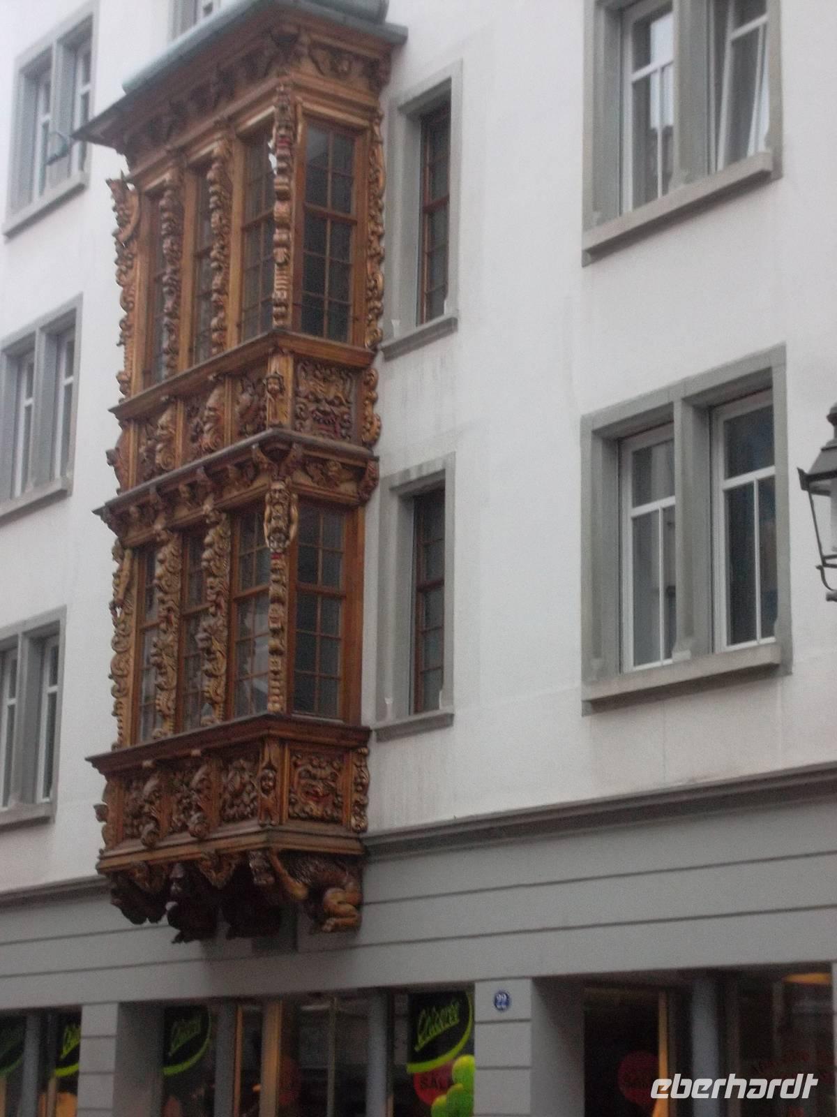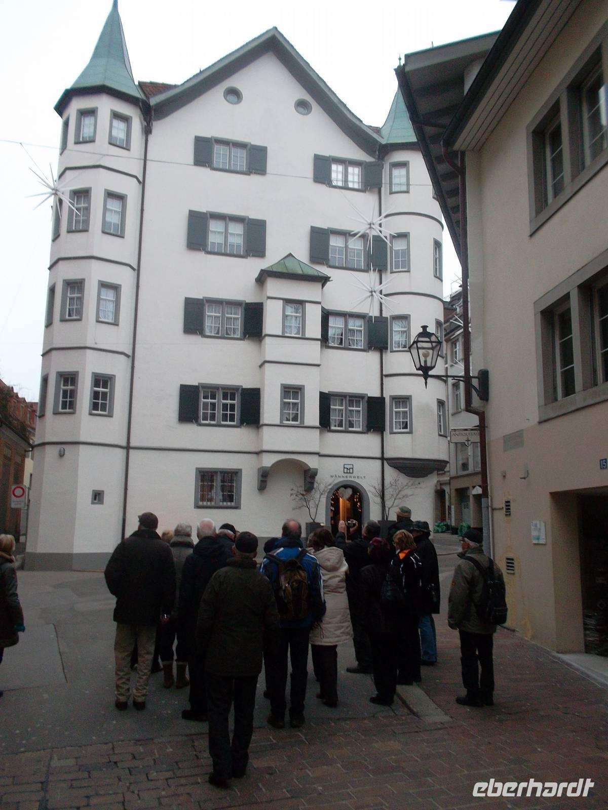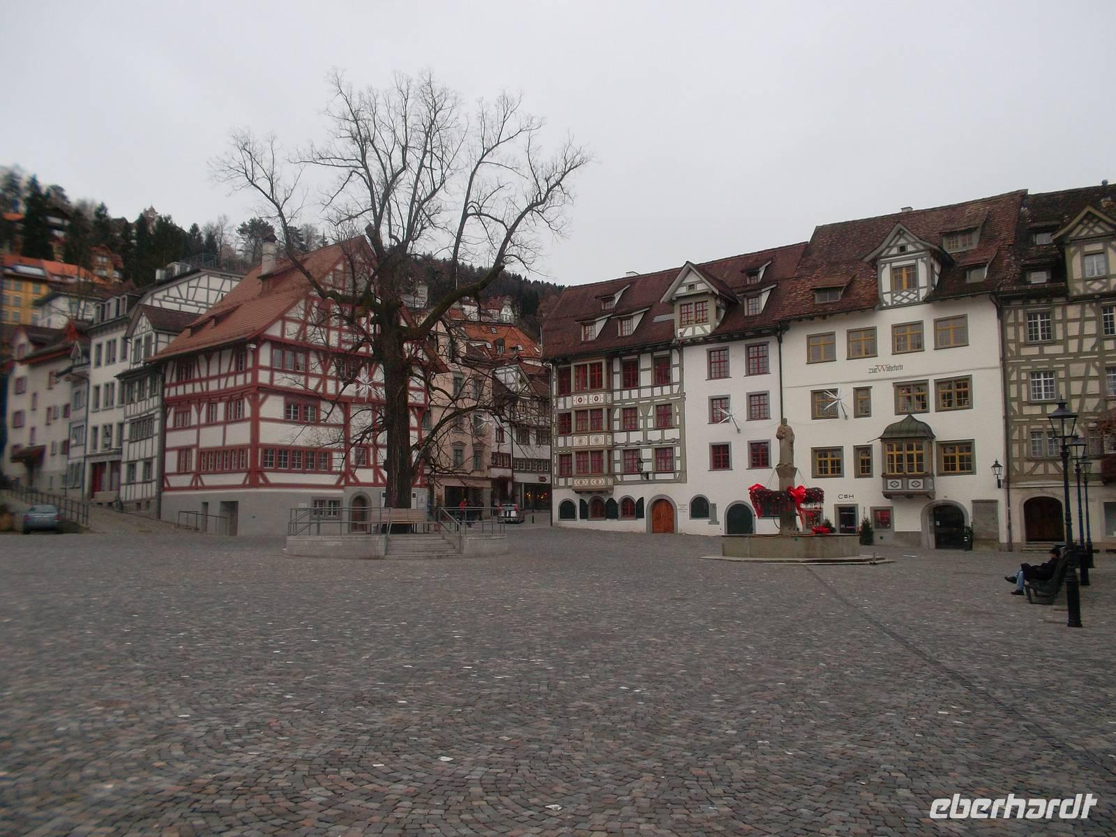 Heute, zu Neujahr mussten wir nicht so früh aufstehen - das Frühstück war als Brunch gedacht und etwas später aber auch länger als sonst angesetzt. Gegen Mittag trafen sich alle Eberhardt-Reisenden am Bus, der auf dem Parkplatz vor der etwa hundert Meter entfernten Talstation der Säntis-Seilbahn stand. Hier hatten wir, der Buschauffeur und ich, einen kleinen Umtrunk vorbereitet und wir stießen im Namen von Eberhardt-Travel mit den Gästen nochmals mit einem Becher Sekt auf ein gutes und gesundes neues Jahr 2013 an (der Buschauffeur allerdings nur mit Apfelschorle....) Danach fuhren wir Uhr nach St.Gallen. Die Hauptstadt des gleichnamigen Kantons ist die siebtgrößte Stadt der Schweiz, ihre Altstadt wie auch ihr Kloster stehen unter UNESCO-Weltkulturerbe-Schutz und sind äußerst sehenswert. Pünktlich trafen die beiden Stadtführerinnen am Busparkplatz ein und wir konnten, nachdem die Gruppe in zwei Kleingruppen geteilt war, einen interessanten Rundgang durch die völlig ausgestorbene Altstadt gemacht. Fachwerkhäuser, schlossähnliche Patrizierbauten und vor allem viele herrlich verzierte Erkervorbauten - 110 sollen es insgesamt in der Altstadt sein - faszinierten auf unserem Weg. Die Stadt St. Gallen war lange Zeit durch Textilgestaltung und -Handel reich und berühmt. Den Ursprung bildete jedoch ein Kloster, entstanden aus der Einsiedelei eines irischen Mönches. Von Irland ist wohl auch die Kunst der Buchmalerei ins St. Galler Scriptorium überkommen, denn das Kloster war einst berühmt für seine Schreibstube, seine Bibelabschriften und seine Gelehrten, wie z.B. gleich drei berühmte Mönche namens Notker von St. Gallen. Schon im Spätmittelalter wurden Stadt und Kloster - im Range einer Fürstabtei - rechtlich getrennt. Nachdem das Kloster 1805 aufgehoben wurde, machte man St. Gallen zu einem selbständigen Bistum und die herrliche Abteikirche wurde zur Kathedrale. Nach einem Besuch im Inneren und einem Gang über den an den Klosterbezirk angrenzenden Gallusplatz sahen wir uns noch einige Straßenzüge mit hübschen Häusern an und hatten dann noch etwas Freizeit - z.B. für einen Kaffee oder einen kleinen Streifzug auf eigene Faust. Am Abend ging es dann über die Autobahn und über Landstraße zurück zur Schwägalp und zum letzten Abendessen.