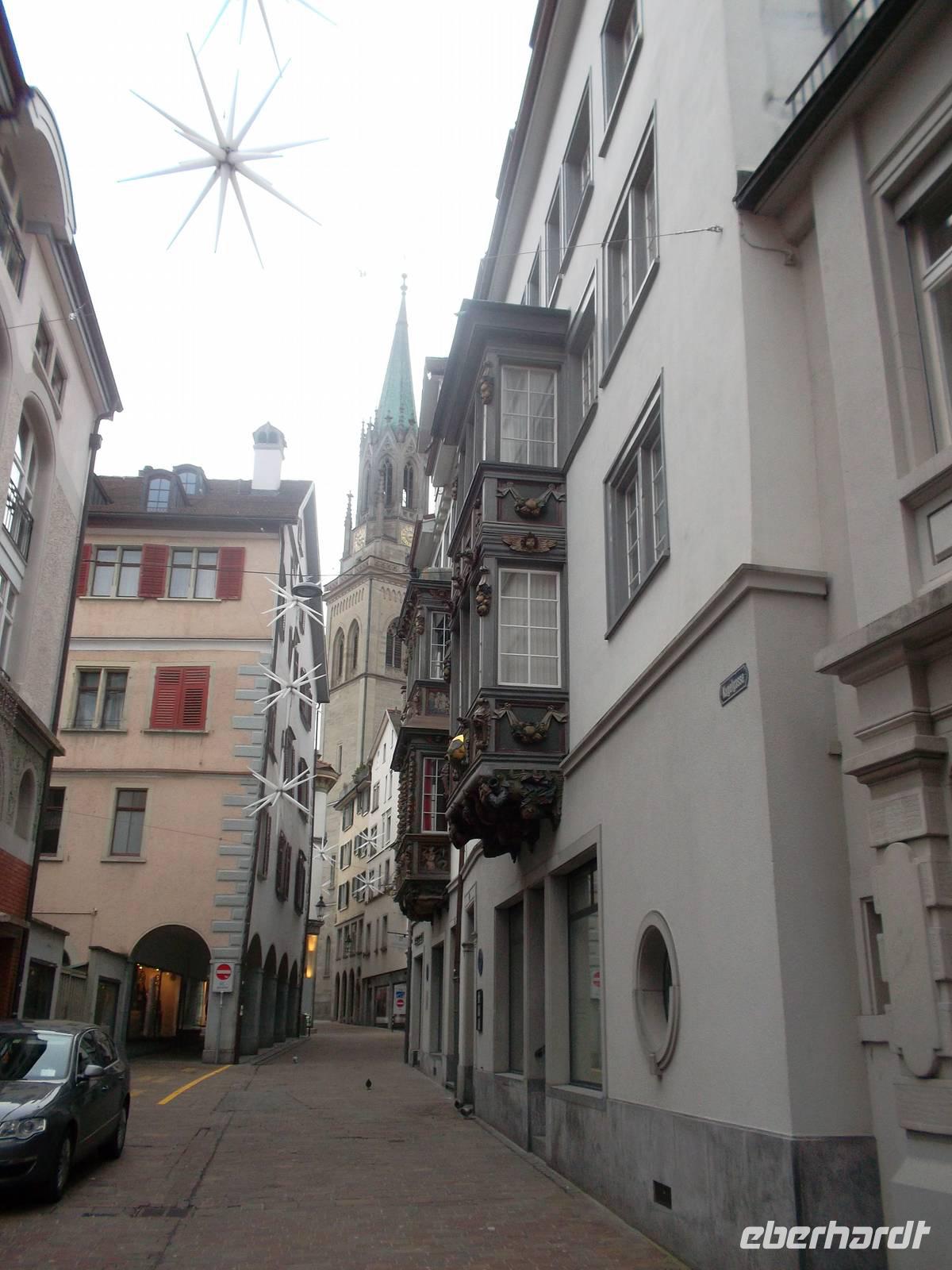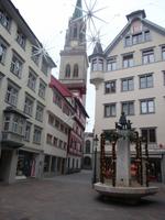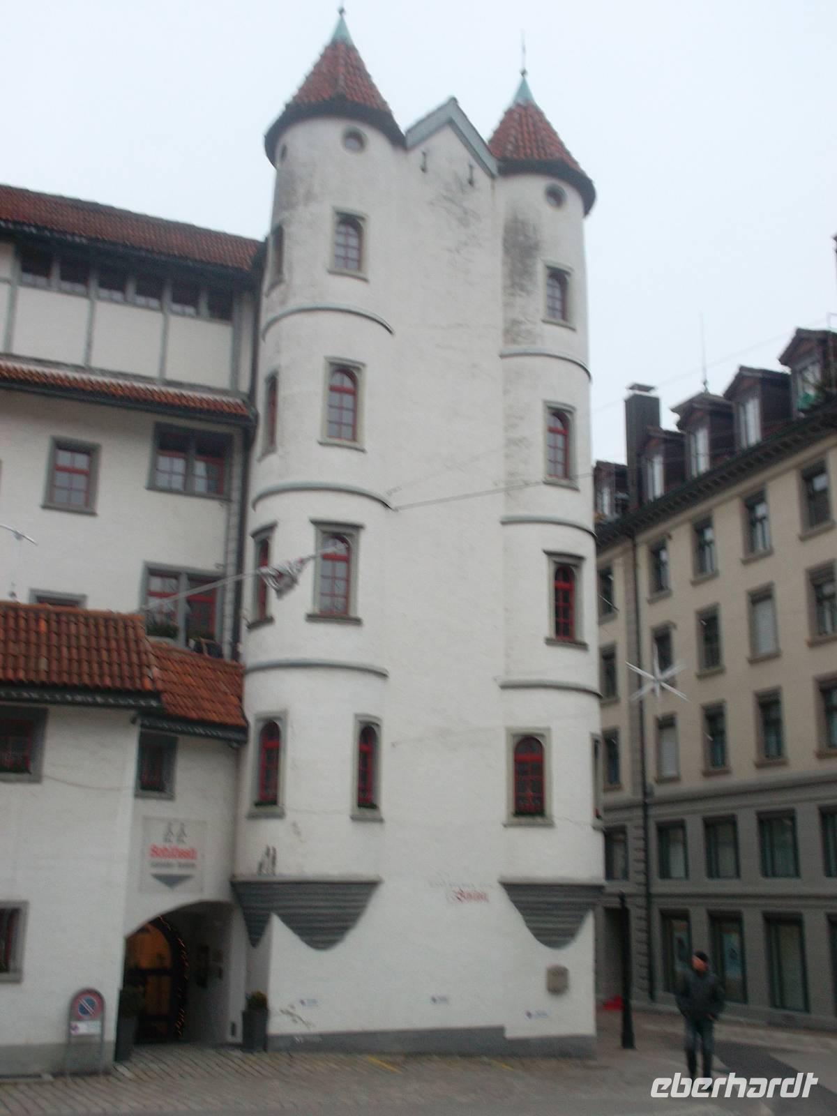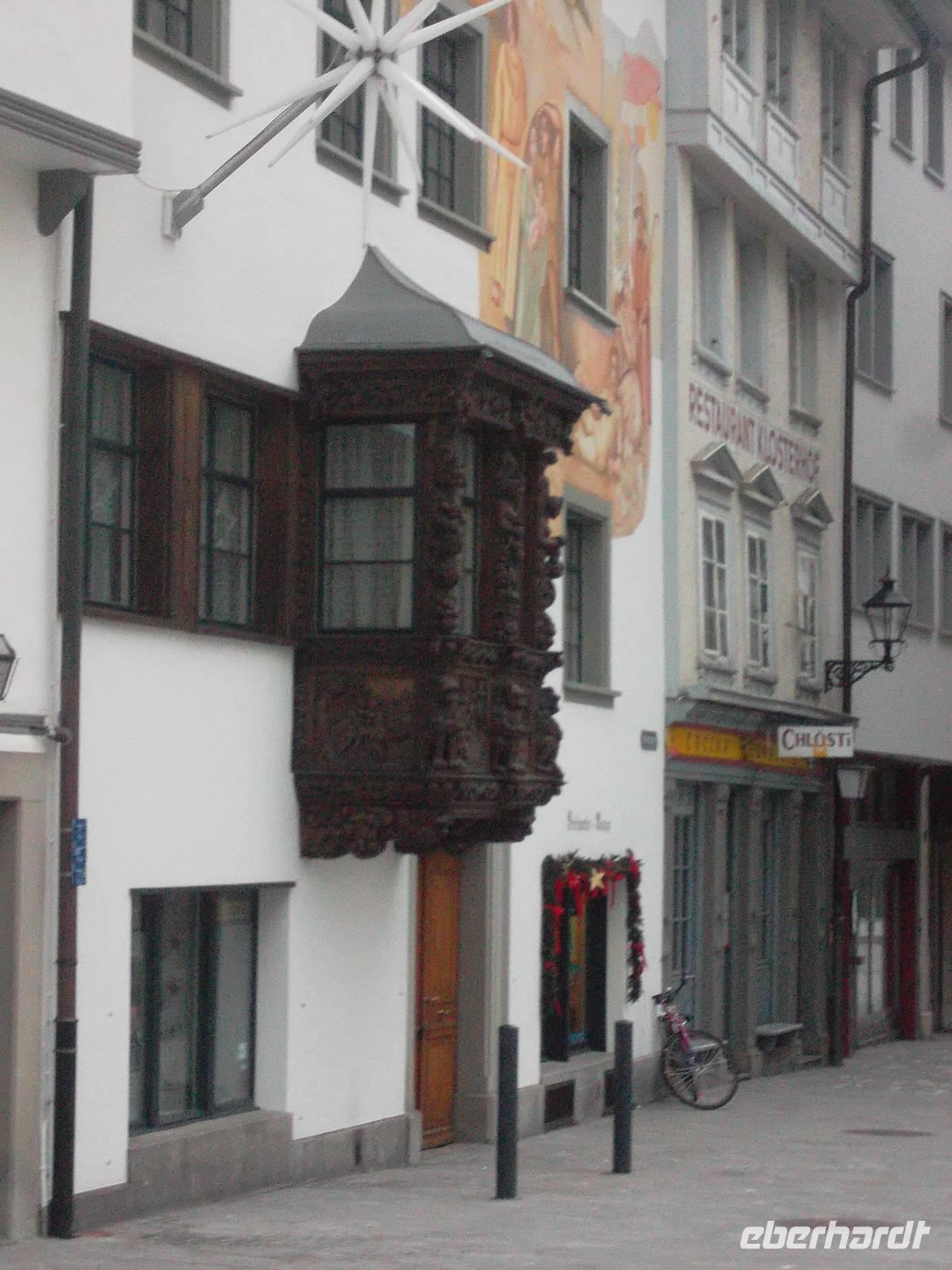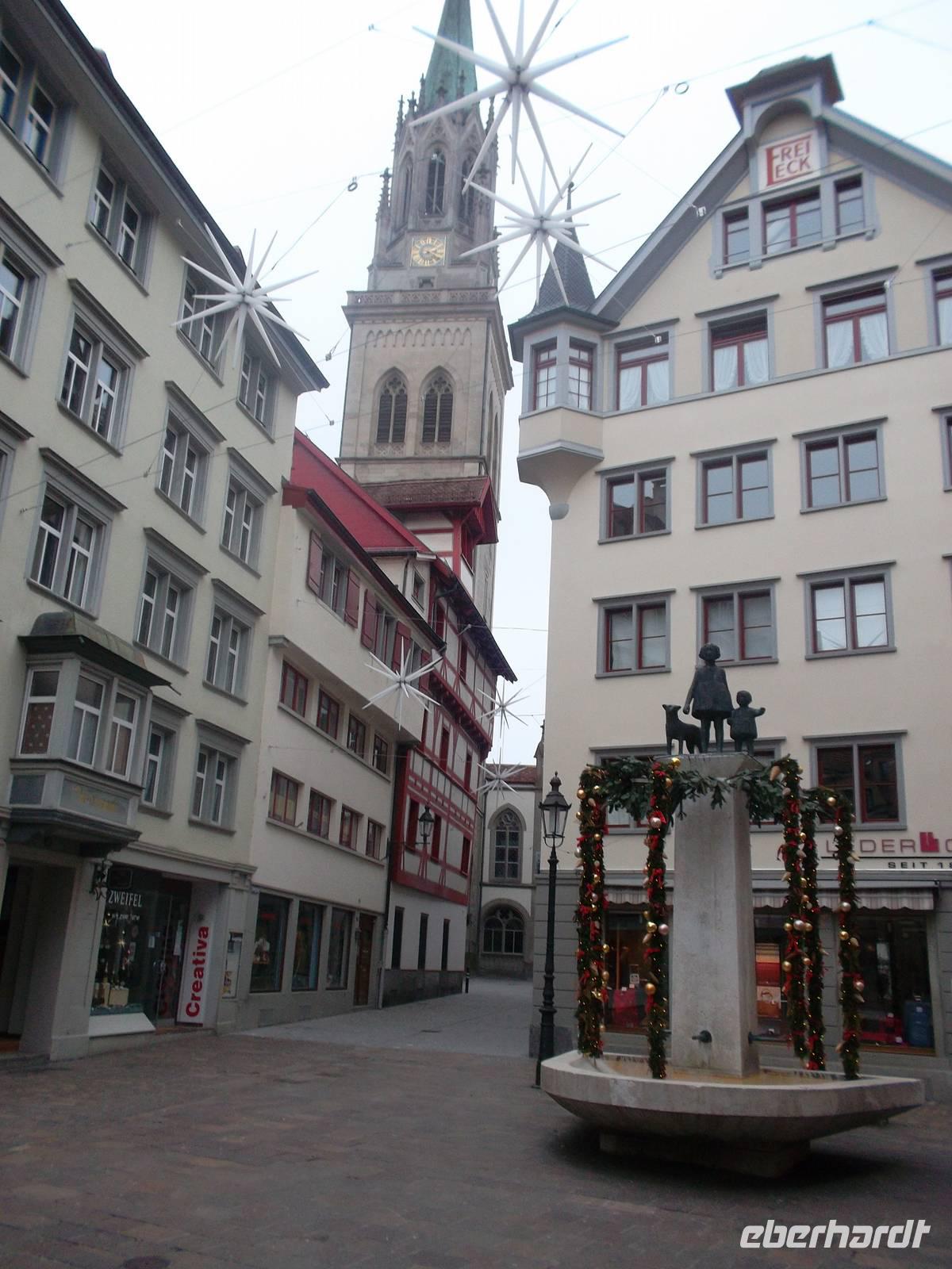 Heute, zu Neujahr mussten wir nicht so früh aufstehen - das Frühstück war als Brunch gedacht und etwas später aber auch länger als sonst angesetzt. Gegen Mittag trafen sich alle Eberhardt-Reisenden am Bus, der auf dem Parkplatz vor der etwa hundert Meter entfernten Talstation der Säntis-Seilbahn stand. Hier hatten wir, der Buschauffeur und ich, einen kleinen Umtrunk vorbereitet und wir stießen im Namen von Eberhardt-Travel mit den Gästen nochmals mit einem Becher Sekt auf ein gutes und gesundes neues Jahr 2013 an (der Buschauffeur allerdings nur mit Apfelschorle....) Danach fuhren wir Uhr nach St.Gallen. Die Hauptstadt des gleichnamigen Kantons ist die siebtgrößte Stadt der Schweiz, ihre Altstadt wie auch ihr Kloster stehen unter UNESCO-Weltkulturerbe-Schutz und sind äußerst sehenswert. Pünktlich trafen die beiden Stadtführerinnen am Busparkplatz ein und wir konnten, nachdem die Gruppe in zwei Kleingruppen geteilt war, einen interessanten Rundgang durch die völlig ausgestorbene Altstadt gemacht. Fachwerkhäuser, schlossähnliche Patrizierbauten und vor allem viele herrlich verzierte Erkervorbauten - 110 sollen es insgesamt in der Altstadt sein - faszinierten auf unserem Weg. Die Stadt St. Gallen war lange Zeit durch Textilgestaltung und -Handel reich und berühmt. Den Ursprung bildete jedoch ein Kloster, entstanden aus der Einsiedelei eines irischen Mönches. Von Irland ist wohl auch die Kunst der Buchmalerei ins St. Galler Scriptorium überkommen, denn das Kloster war einst berühmt für seine Schreibstube, seine Bibelabschriften und seine Gelehrten, wie z.B. gleich drei berühmte Mönche namens Notker von St. Gallen. Schon im Spätmittelalter wurden Stadt und Kloster - im Range einer Fürstabtei - rechtlich getrennt. Nachdem das Kloster 1805 aufgehoben wurde, machte man St. Gallen zu einem selbständigen Bistum und die herrliche Abteikirche wurde zur Kathedrale. Nach einem Besuch im Inneren und einem Gang über den an den Klosterbezirk angrenzenden Gallusplatz sahen wir uns noch einige Straßenzüge mit hübschen Häusern an und hatten dann noch etwas Freizeit - z.B. für einen Kaffee oder einen kleinen Streifzug auf eigene Faust. Am Abend ging es dann über die Autobahn und über Landstraße zurück zur Schwägalp und zum letzten Abendessen.