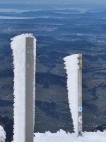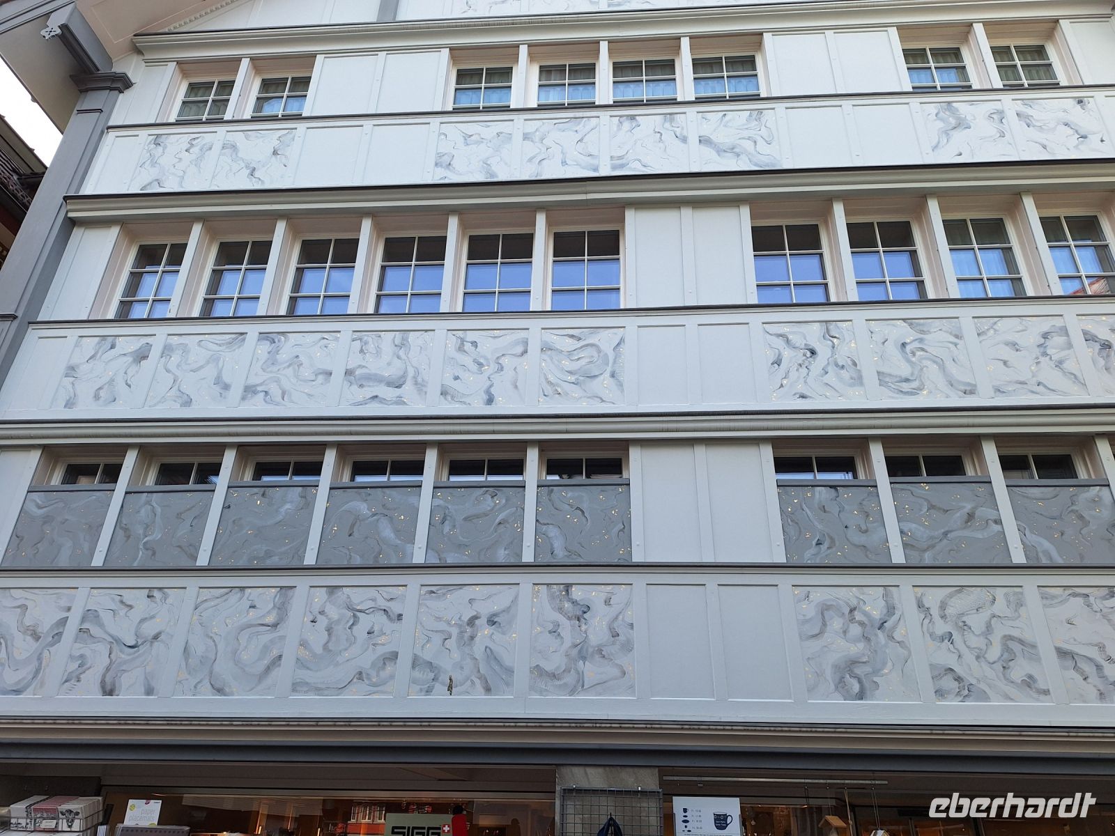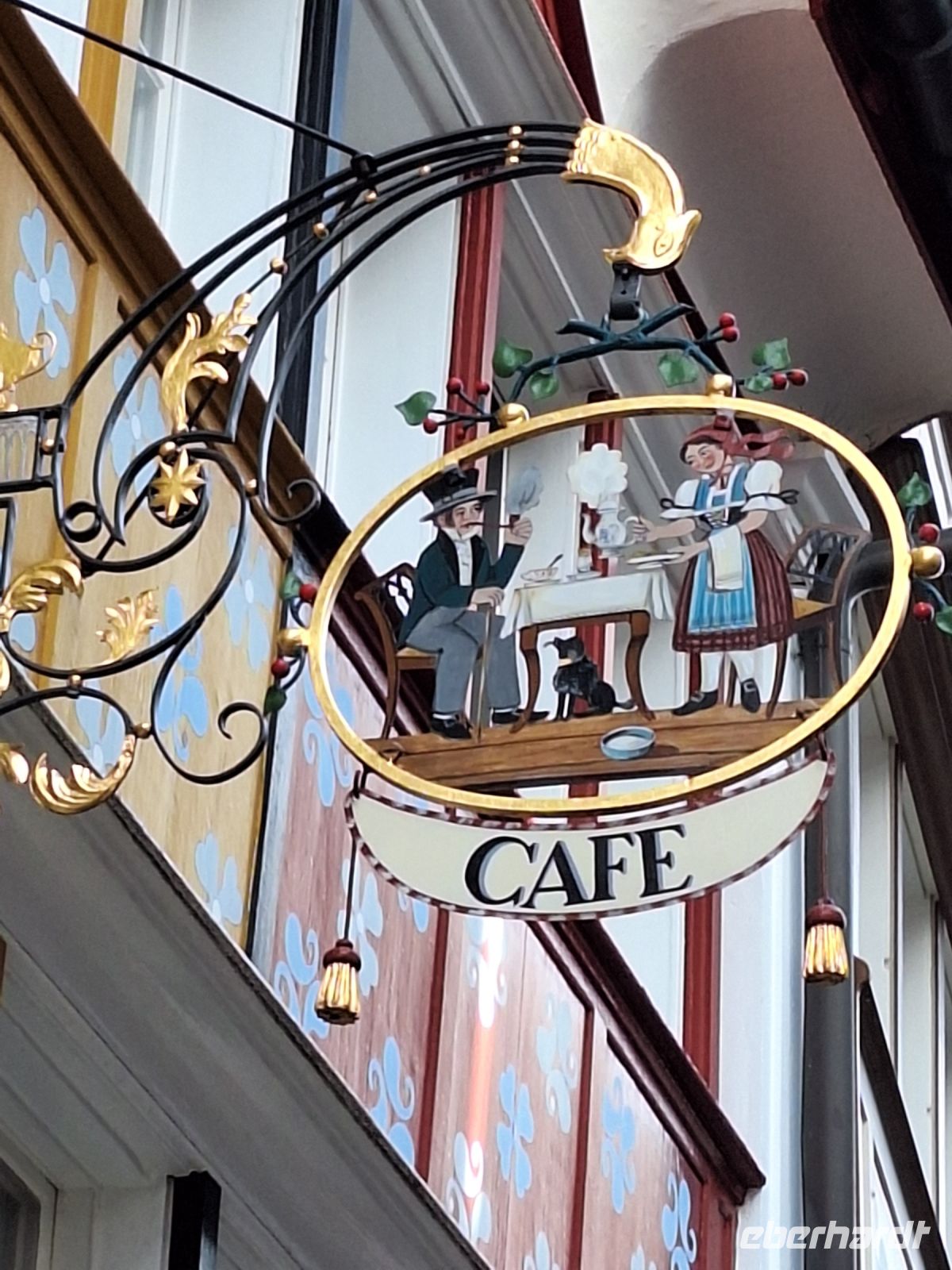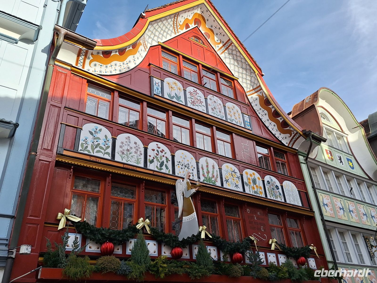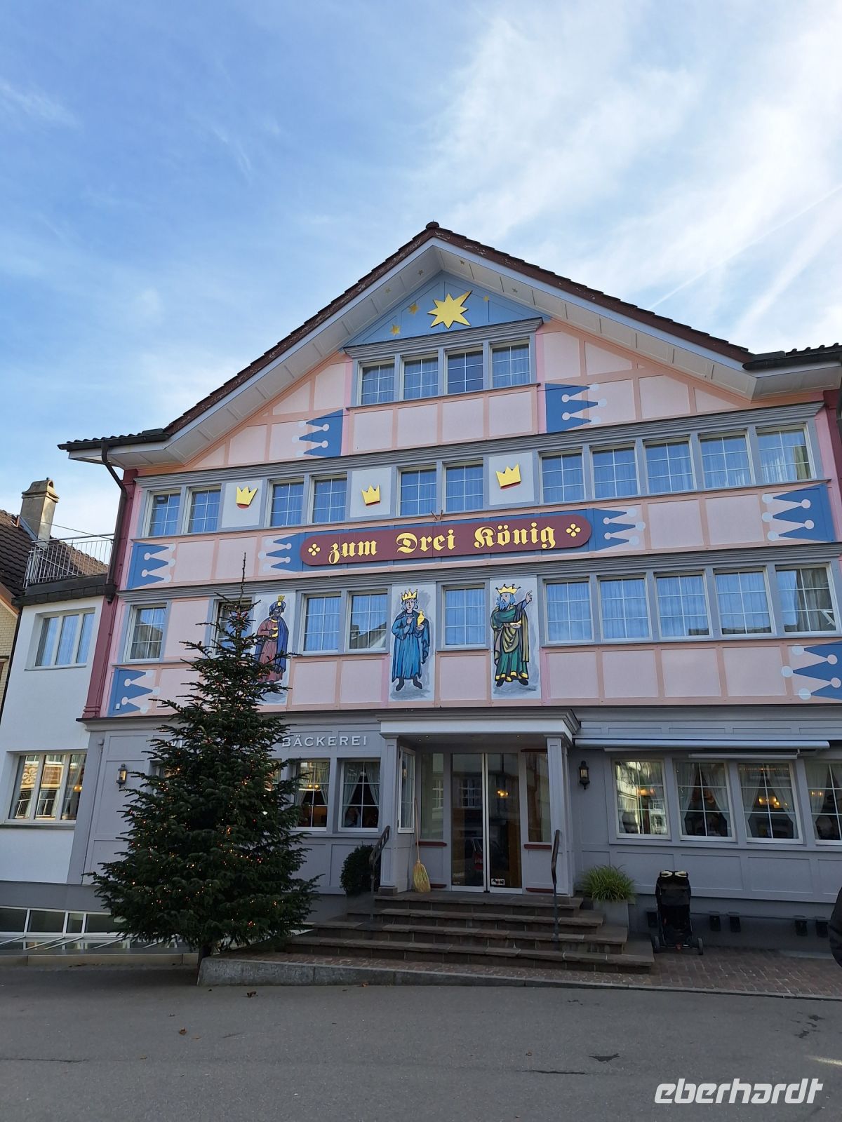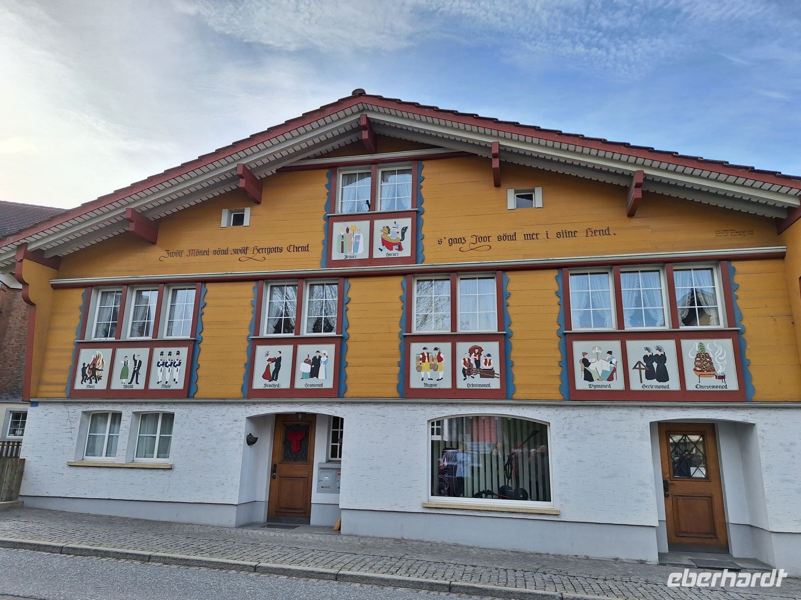 Danach fahren wir nach Appenzell. Bei einem kleinen Rundgang erkunden wir den kleinen Ort. Im gut erhaltenen Dorfkern entdecken wir überall, wie tief auch die Appenzeller mit ihrer Tradition verwurzelt sind. Typisch sind aufwendig bemalten Holzhäuser mit geschwungenen Giebeln. Dies sind einzigartige Werke der traditionellen Bauernmalerei. Steinbauten aus dem 16. Jahrhundert wie das Rathaus, das Schloss und die Pfarrkirche vervollständigen das Ortsbild. Der Landsgemeindeplatz vermittelt uns einen kleinen Eindruck, wie noch heute die die direkte Demokratie funktioniert. Einmal im Jahr kommen die Bürger zusammen und stimmen durch Handerheben über Gesetze oder Entscheidungen ab. Es bleibt Zeit durch den hübschen Ort zu spazieren. Am frühen Nachmittag kehren wir zur Schwägalp zurück. Leider schlägt nun das Wetter um. Dicke Schneewolken hüllen den Säntis ein. Es beginnt zu schneien und der Wind frischt auf. Die Kollegen der Rezeption informieren uns, dass leider das Anstoßen auf dem Säntis nicht stattfinden kann. Der Wind auf dem Gipfel ist zu stark und es wäre zu riskant, die Bahn fahren zu lassen. Wir sind zwar etwas traurig, aber da wir am Morgen so tolle Sicht hatten, sind wir nicht ganz so sehr enttäuscht und freuen uns auf den Abend.