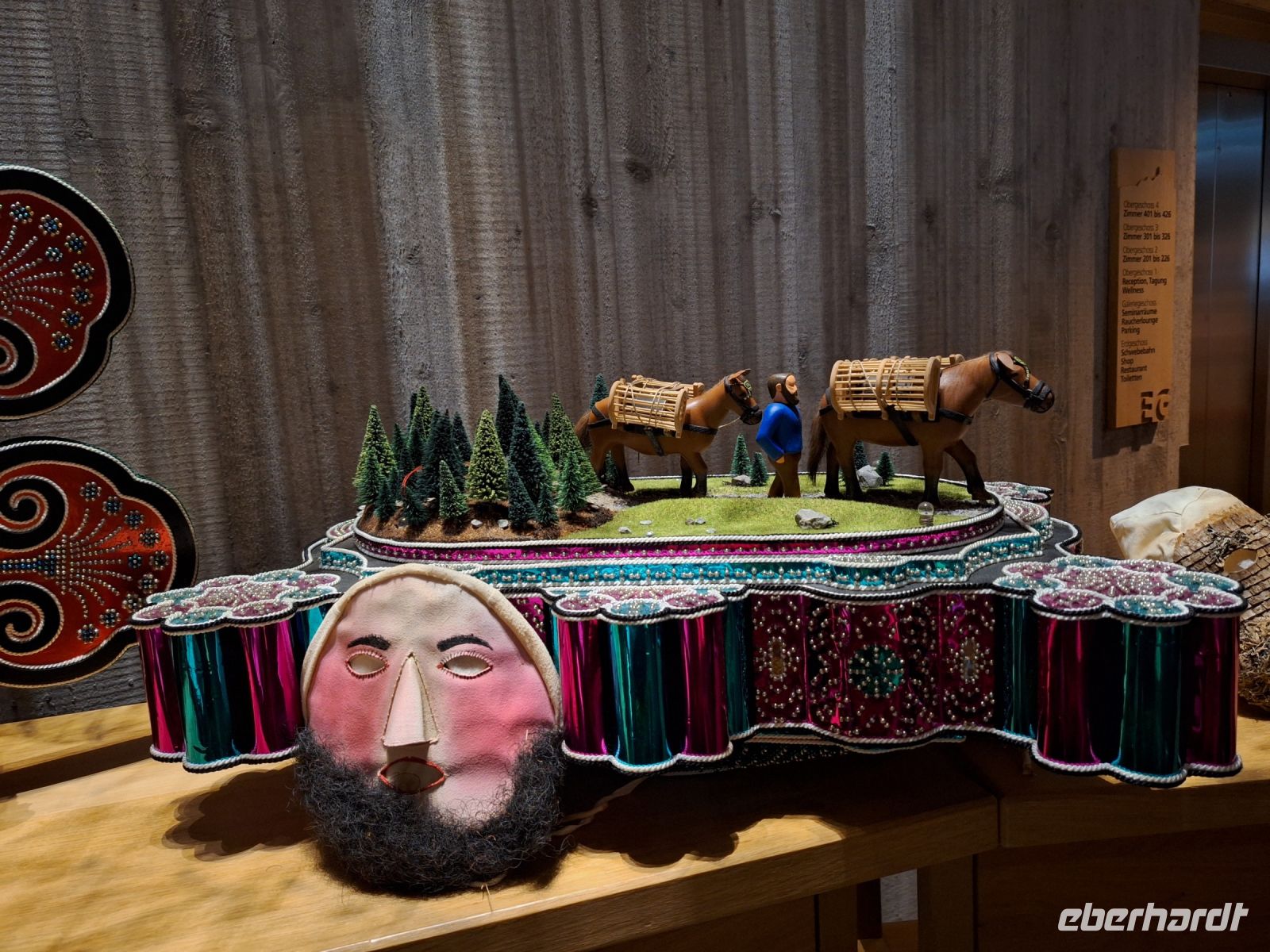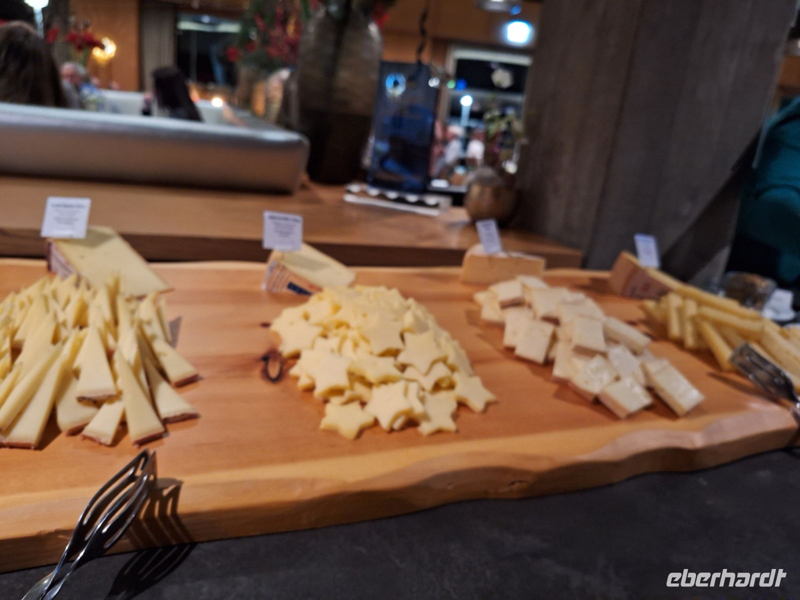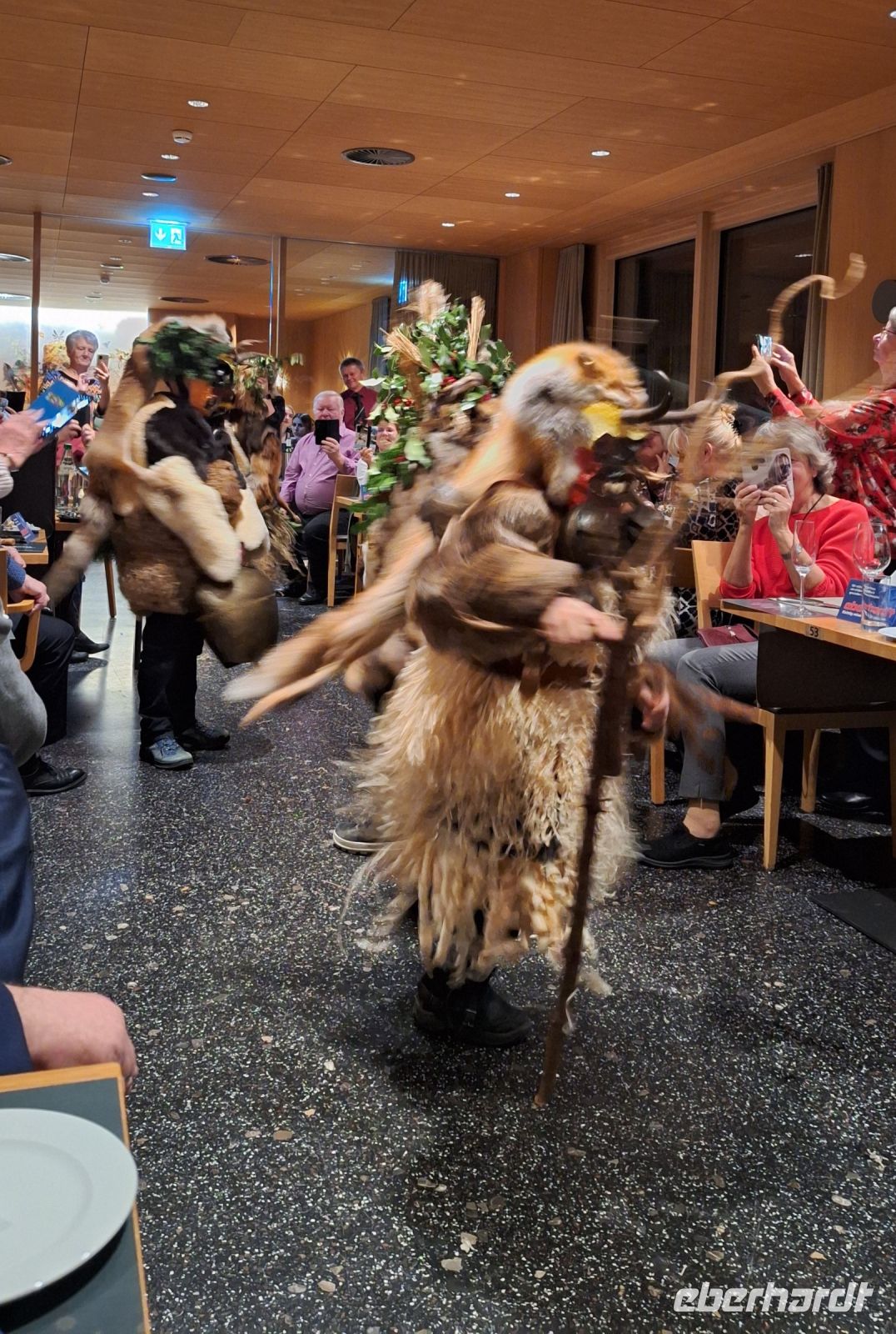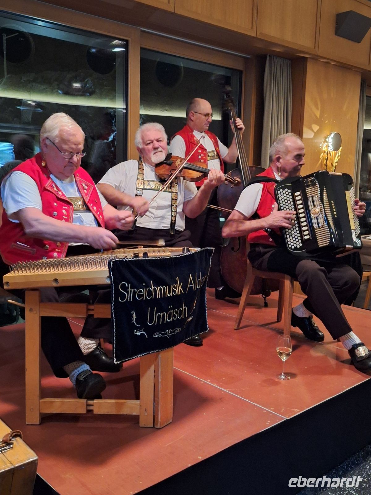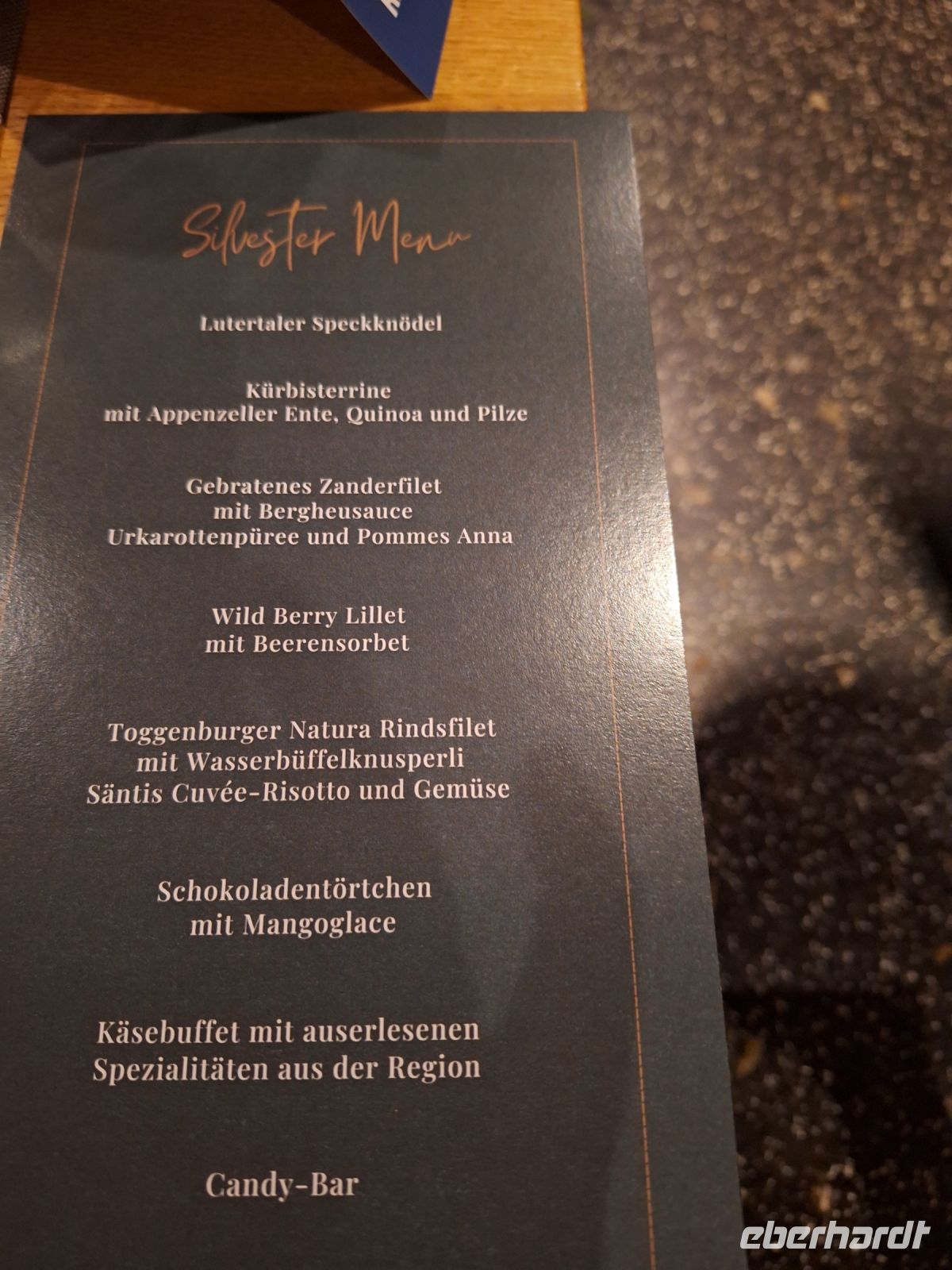 Der Silvester-Abend wird mit einem Apéro im Hotel eingeleitet. Mit einem Glas Wein stoßen wir auf den letzten Abend des Jahres an. Anschließend nehmen wir unsere Plätze im liebevoll vorbereiteten Restaurant ein. Mit einem vorzüglichen 7-Gang-Gourmet-Dinner und exzellentem Service durch die Küchen- und Service-Crew werden wir verwöhnt. Jeder Gang des Menüs ist eine Augenweide und ein kulinarischer Hochgenuss. Für Unterhaltung sorgt eine typische Appenzeller-Streichmusik. Die Musiker spielen auf traditionellen Instrumenten wie dem Hackbrett - vergleichbar mit einer Zither - und dem Handörgeli - einer speziellen Ziehharmonika. Als Überraschung besucht uns nochmals eine Kindergruppe Wüste-Silvesterchläuse. Wir dürfen einigen ihrer Zäuerle lauschen und sie wünschen uns ein gutes Neues Jahr. Ein tolles Käsebuffet und eine Candy-Bar verleiten uns immer noch zum Naschen.