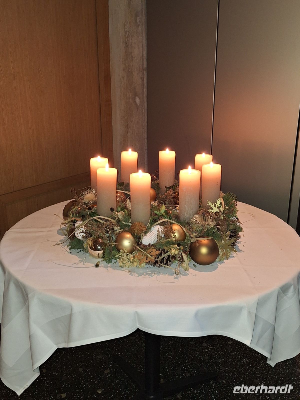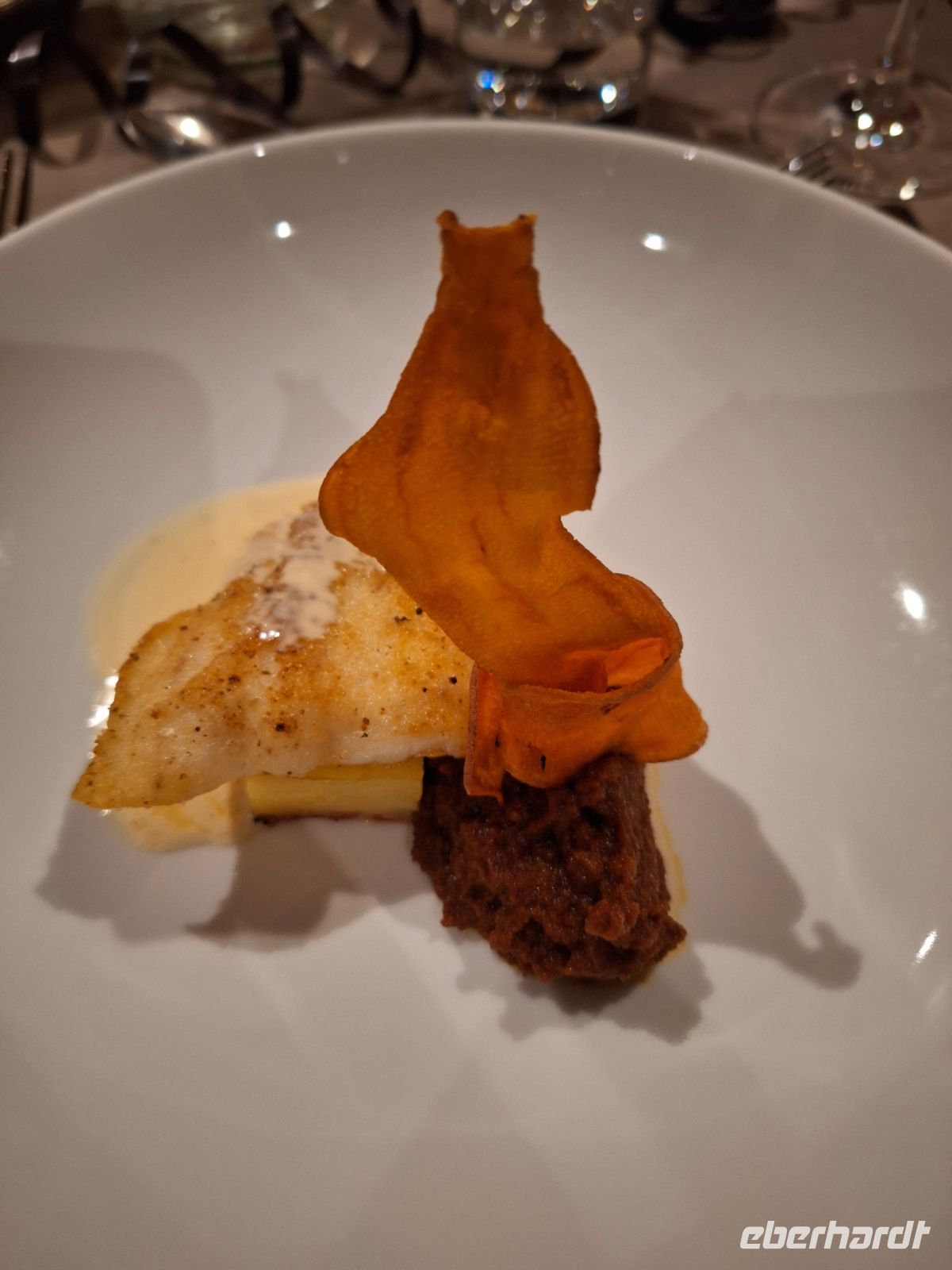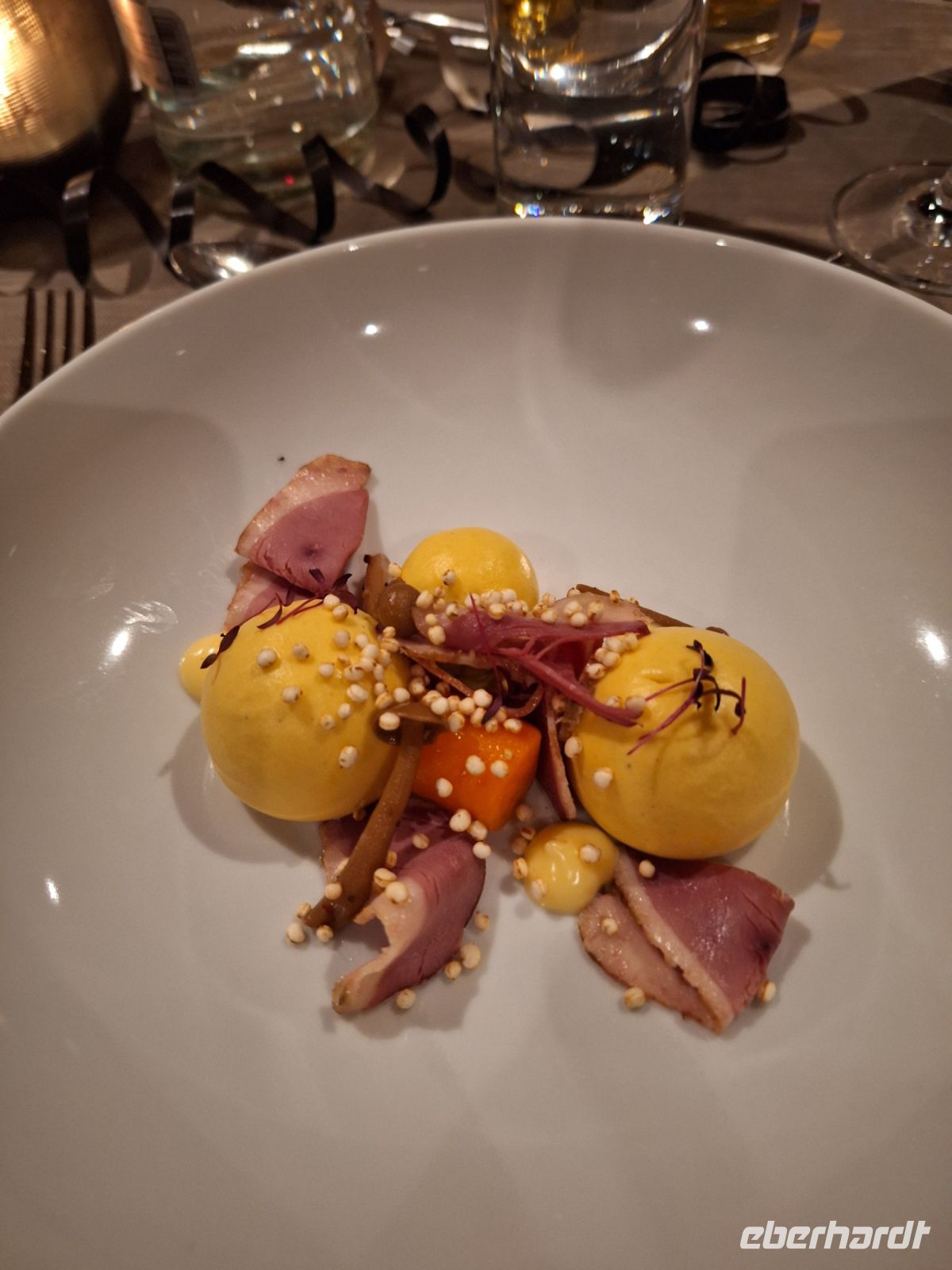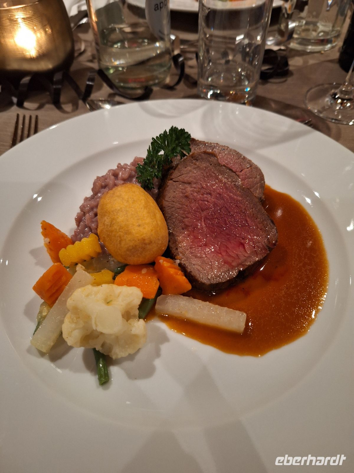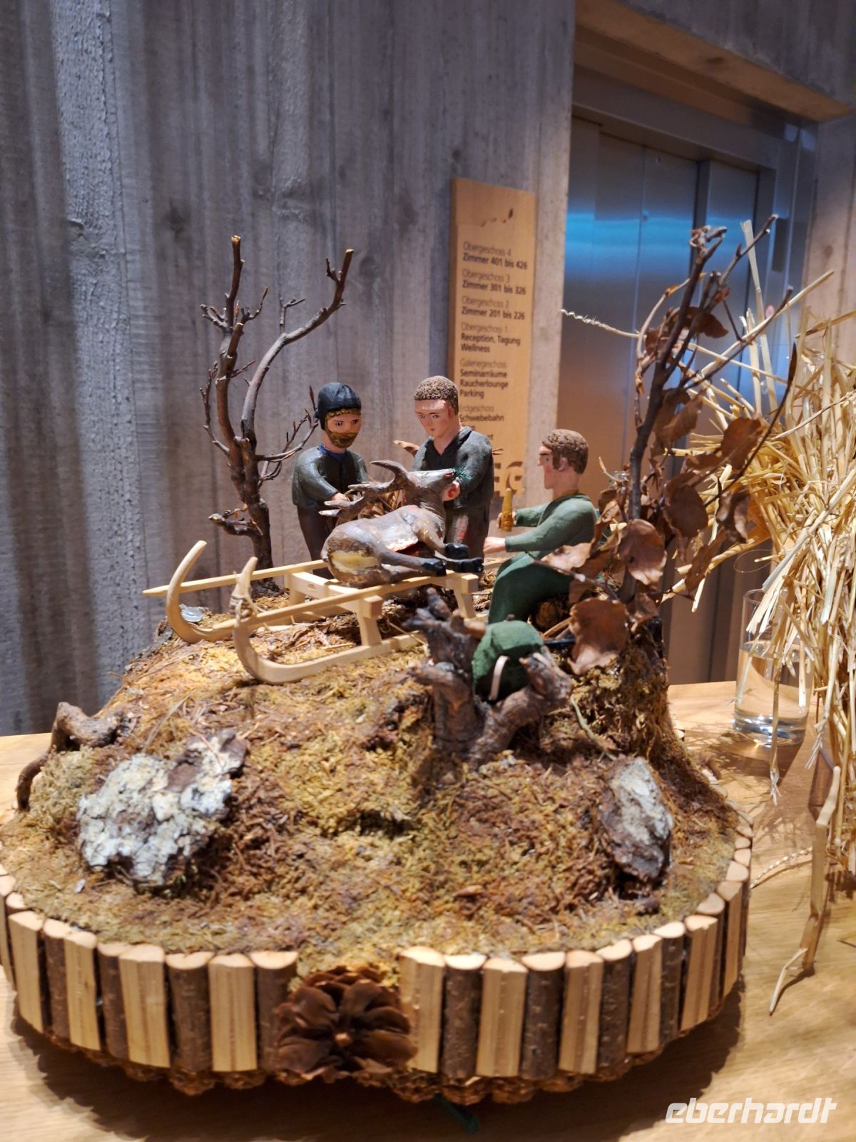 Der Silvester-Abend wird mit einem Apéro im Hotel eingeleitet. Mit einem Glas Wein stoßen wir auf den letzten Abend des Jahres an. Anschließend nehmen wir unsere Plätze im liebevoll vorbereiteten Restaurant ein. Mit einem vorzüglichen 7-Gang-Gourmet-Dinner und exzellentem Service durch die Küchen- und Service-Crew werden wir verwöhnt. Jeder Gang des Menüs ist eine Augenweide und ein kulinarischer Hochgenuss. Für Unterhaltung sorgt eine typische Appenzeller-Streichmusik. Die Musiker spielen auf traditionellen Instrumenten wie dem Hackbrett - vergleichbar mit einer Zither - und dem Handörgeli - einer speziellen Ziehharmonika. Als Überraschung besucht uns nochmals eine Kindergruppe Wüste-Silvesterchläuse. Wir dürfen einigen ihrer Zäuerle lauschen und sie wünschen uns ein gutes Neues Jahr. Ein tolles Käsebuffet und eine Candy-Bar verleiten uns immer noch zum Naschen.