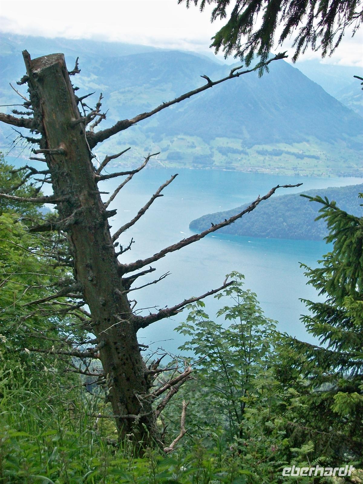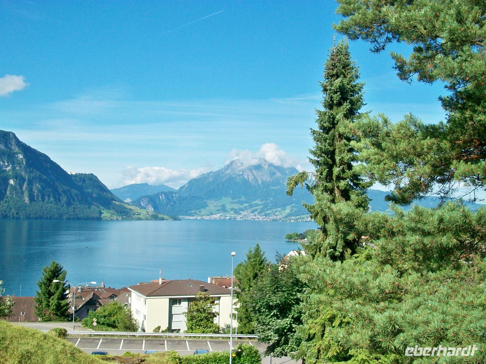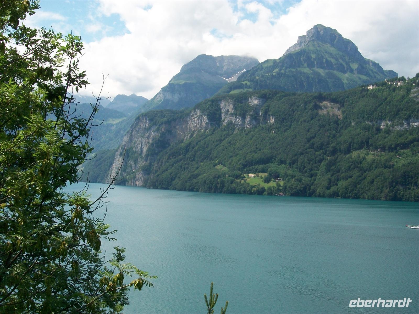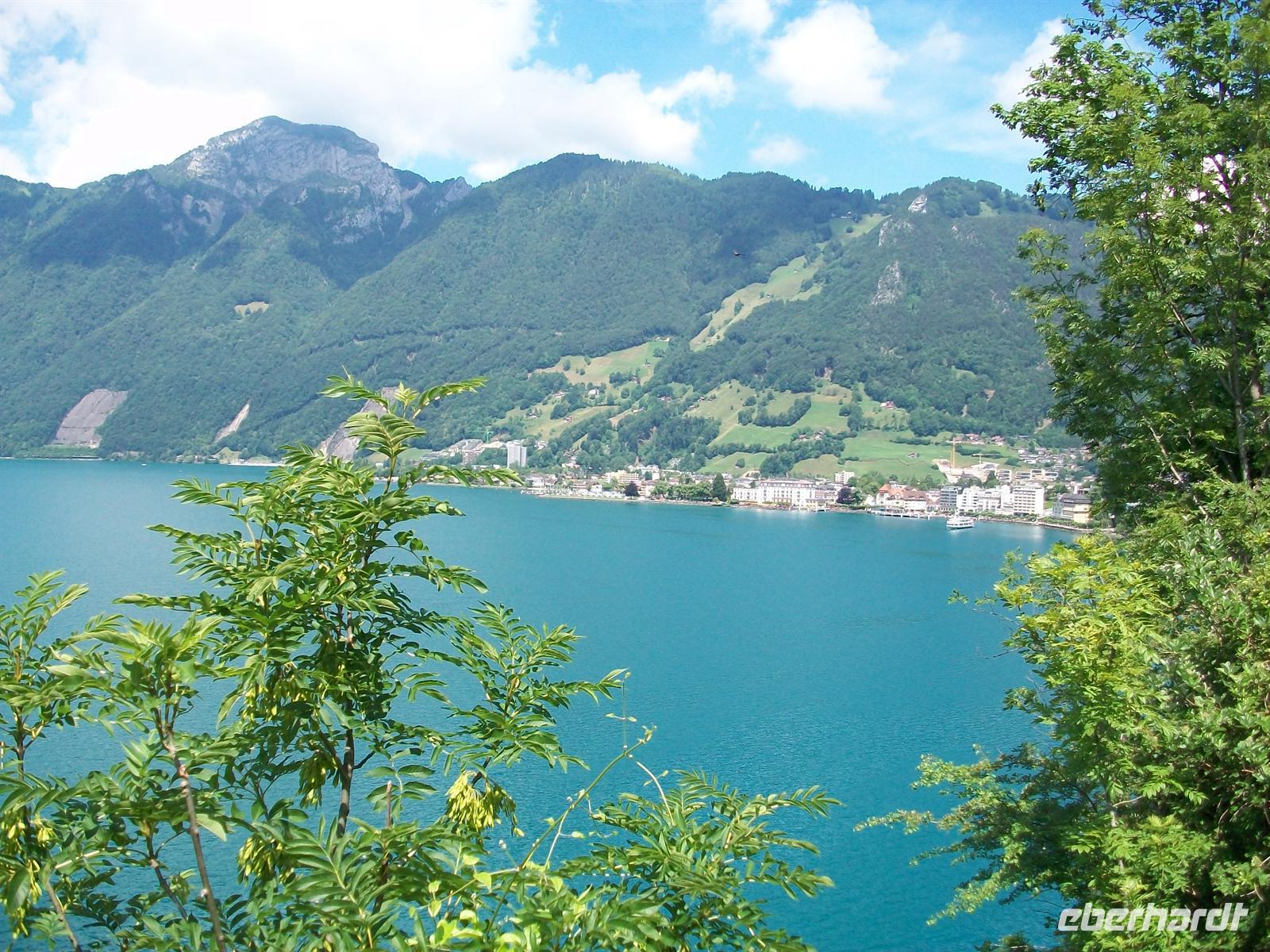 am Vierwaldstätter See und Petrus hat ein Einsehen für uns, er hat uns heute heiteres Wetter beschert. Unsere weitere Fahrt führt uns an den Ostzipfel des Sees, wo wir an einem Rastpunkt einen Stopp für einen Mittagsimbiss einlegen. Von hier haben wir einen grandiosen Blick über diese Wasserfläche.