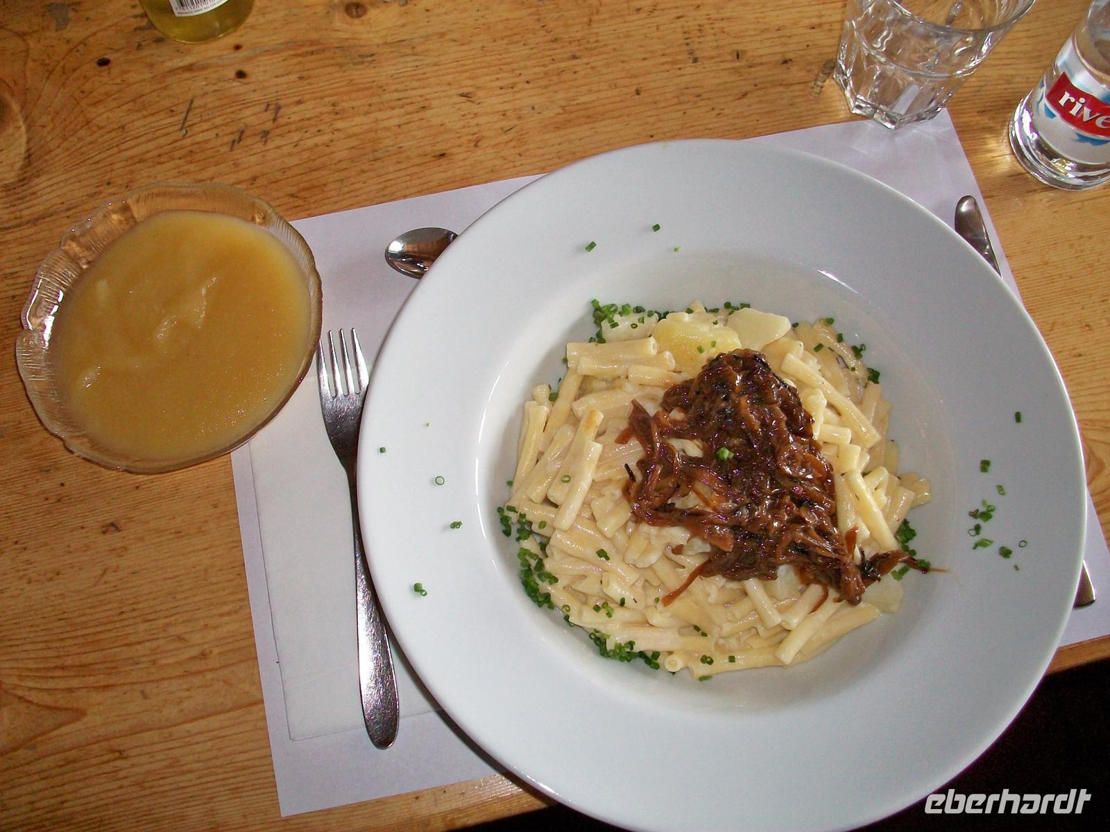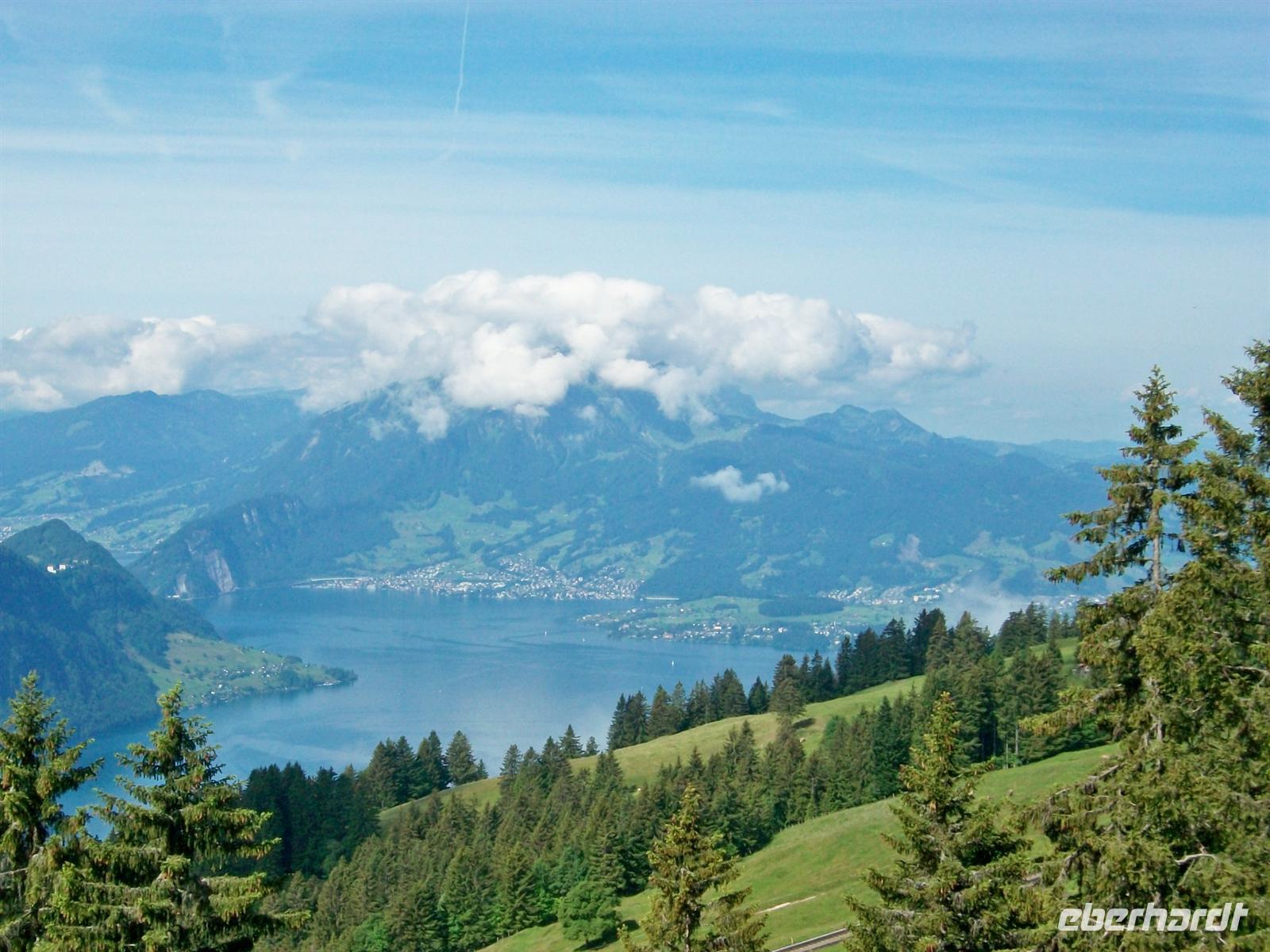 Später geht es wieder hinunter nach Kaltbad, nach einem kleinen Spaziergang erreichen wir das Restaurant wo für uns schon eine Schweizer Spezialität vorbereitet wurde: die Älplermagronen. Es ist die nahrhafte Speise der Bergbauern und besteht aus Makkaroni, Kartoffelstückchen, Sahnesoße und Käse. Darüber kommen noch geröstete Zwiebeln- sehr lecker. Die Zeit reicht aus um auf dem Rundweg noch einen schönen Blick hinunter zum Vierwaldstätter See zu werfen, auf dem spielzeugklein die Schiffe ihre Bahnen ziehen.
