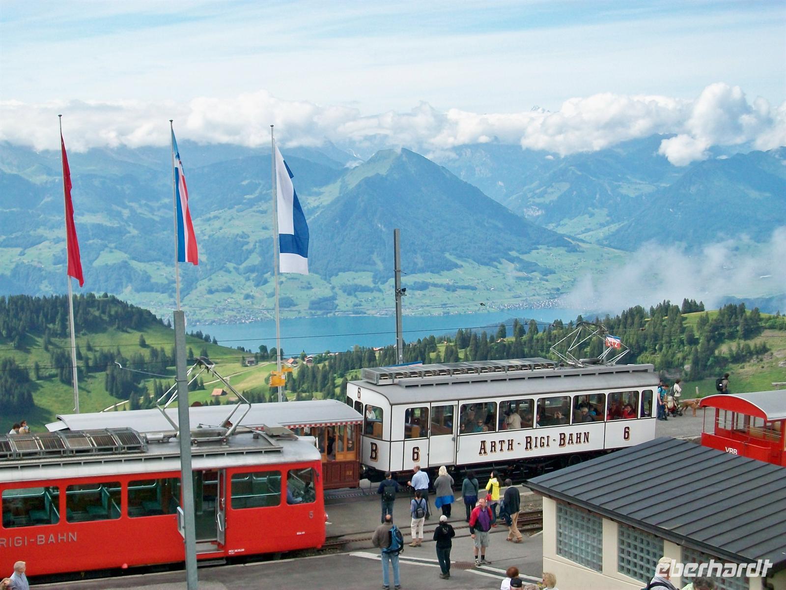 Wir sind kurz nach neun Uhr in Weggis angelangt. Von hier beginnt nun der Aufstieg zuerst mit der Luftseilbahn. Vom Ort haben wir einen grandiosen Blick auf den Vierwaldstätter See; die Luft lässt uns bei seltener Klarheit weit ins Land hineinschauen. Dann geht es hinauf, die Bahn bringt uns nach Rigi- Kaltbad, hier steigen wir um in die historische Zahnradbahn, die uns dann gemächlich