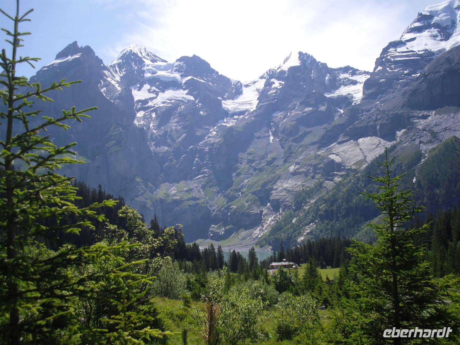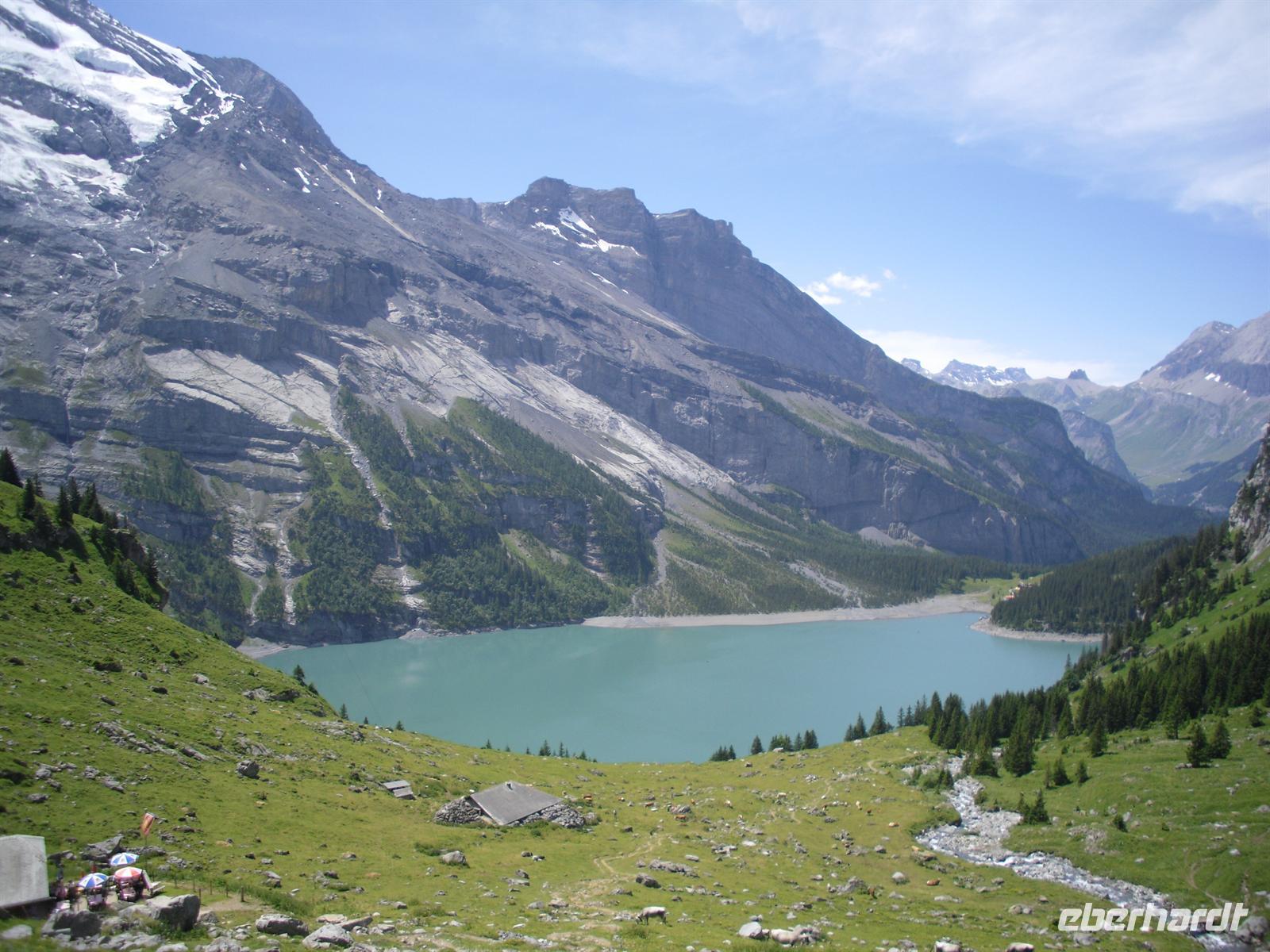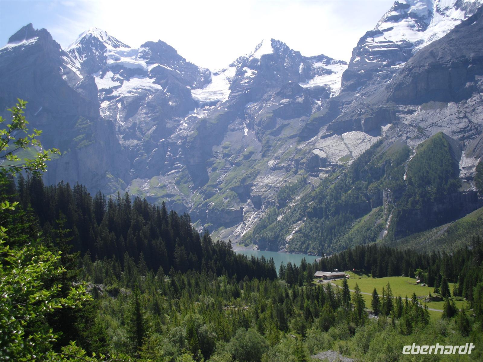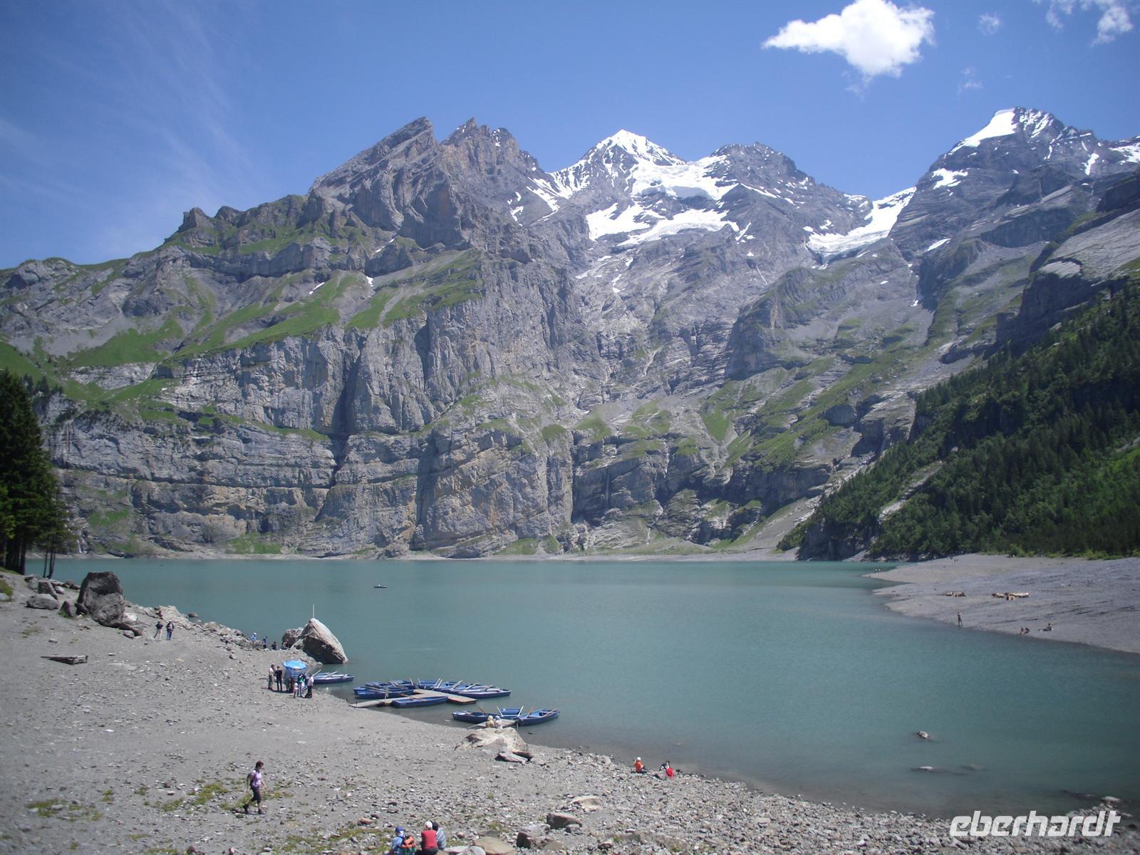 Mit einer modernen Umlaufbahn geht es in nur etwa knapp 10 Minuten zur Bergstation, von wo aus wir dann noch etwa 20 Minuten zum See spazieren müssen. Im etwa knapp 1.600 Meter hoch gelegenen Oeschinensee spiegelt sich der gewaltige Fels- und Gletscherzirkus der Blümlisalp, wahrlich beeindruckend! Hier kann man unter verschiedenen Wanderrouten wählen oder man entscheidet sich für eine Bootspartie auf dem See. Manch einer von uns genießt heute jedoch einfach nur die traumhaften Ausblicke hier oben und sonnt sich auf einer der Terrassen der gastronomischen Einrichtungen. Am Abend treffen wir uns schließlich alle wieder zum Abendessen und werden mit einem Barbecue-Buffet im Hotel verwöhnt. Gemütlich lassen wir somit diesen schönen sonnigen Tag ausklingen.