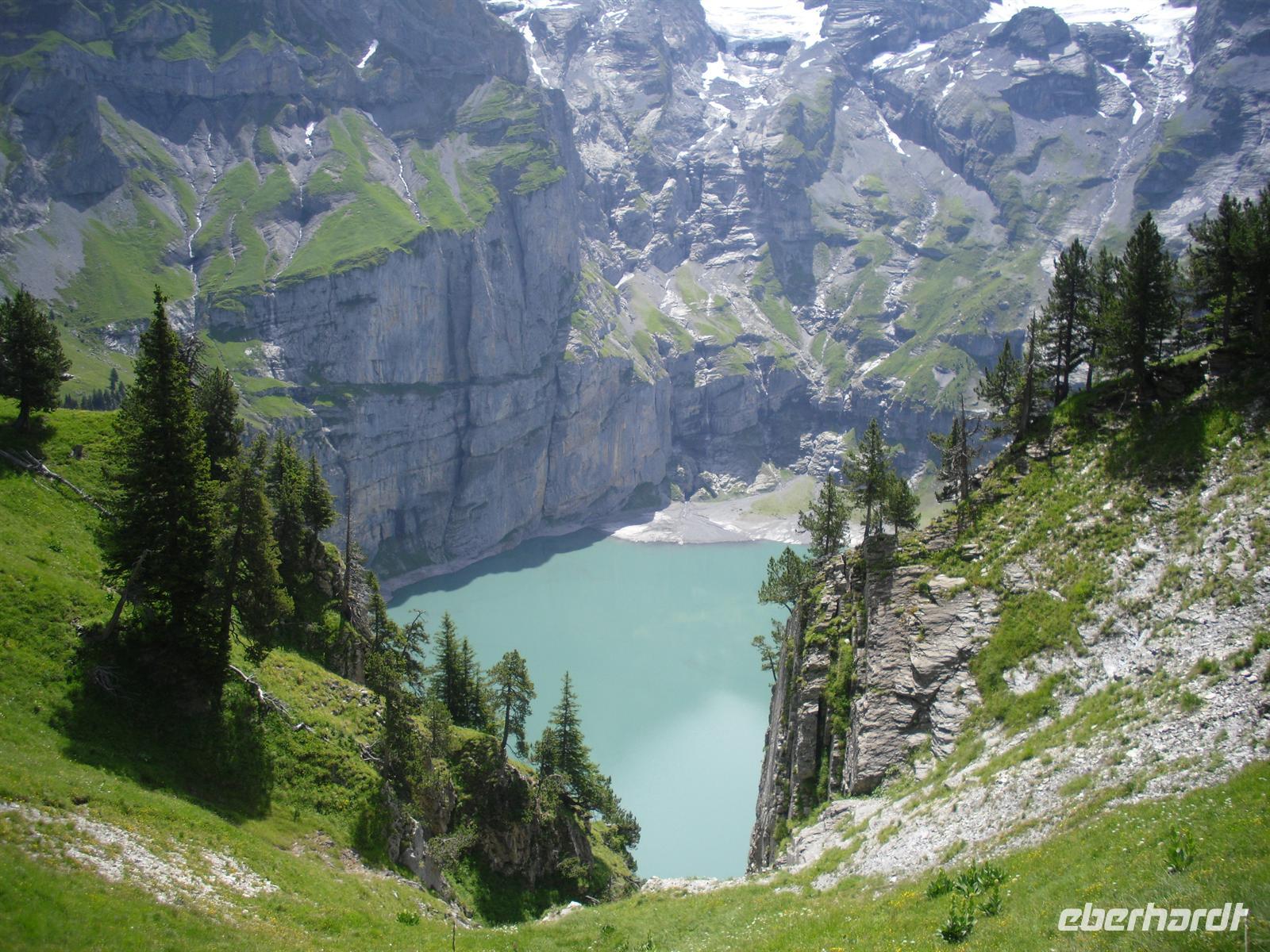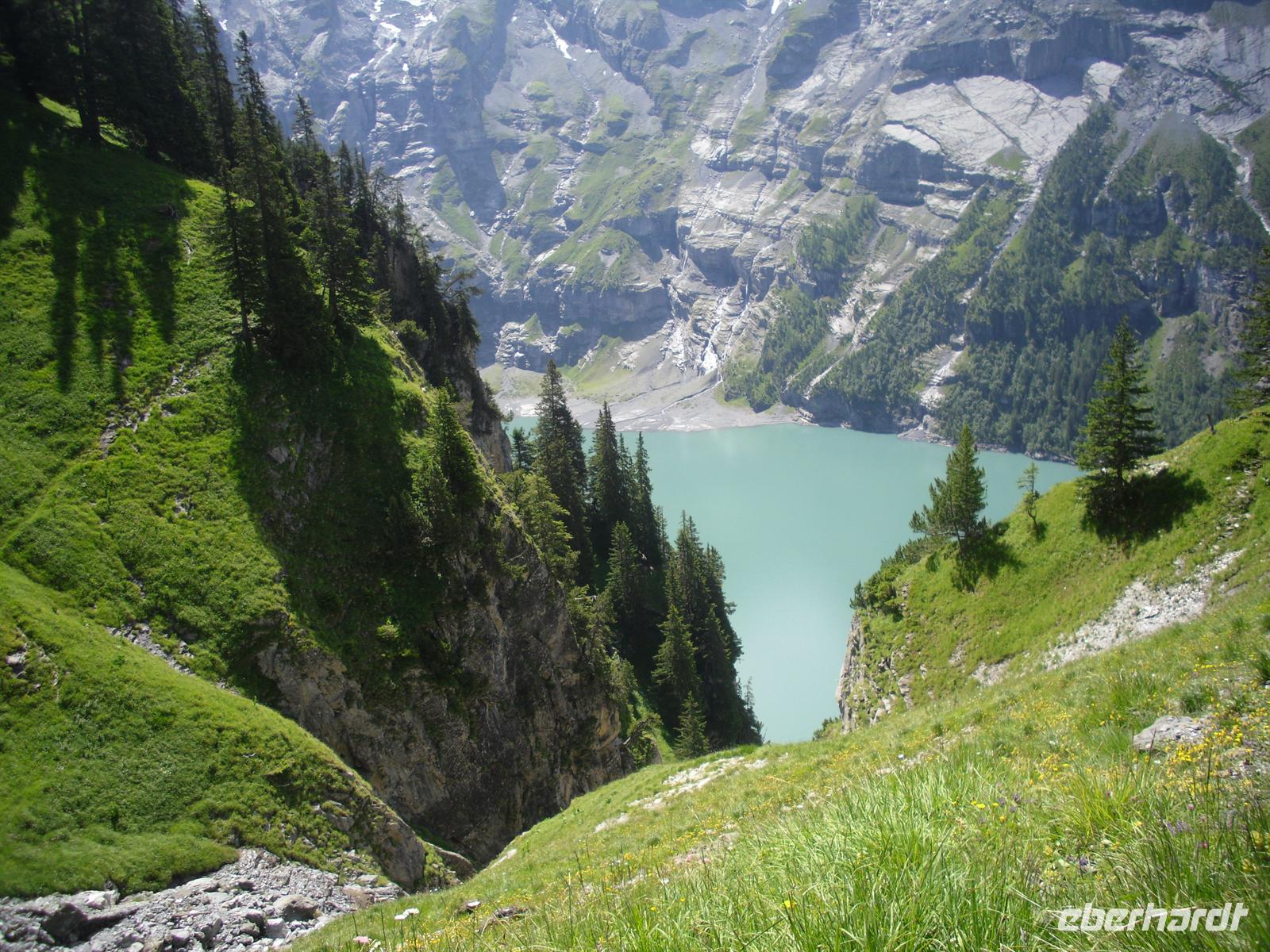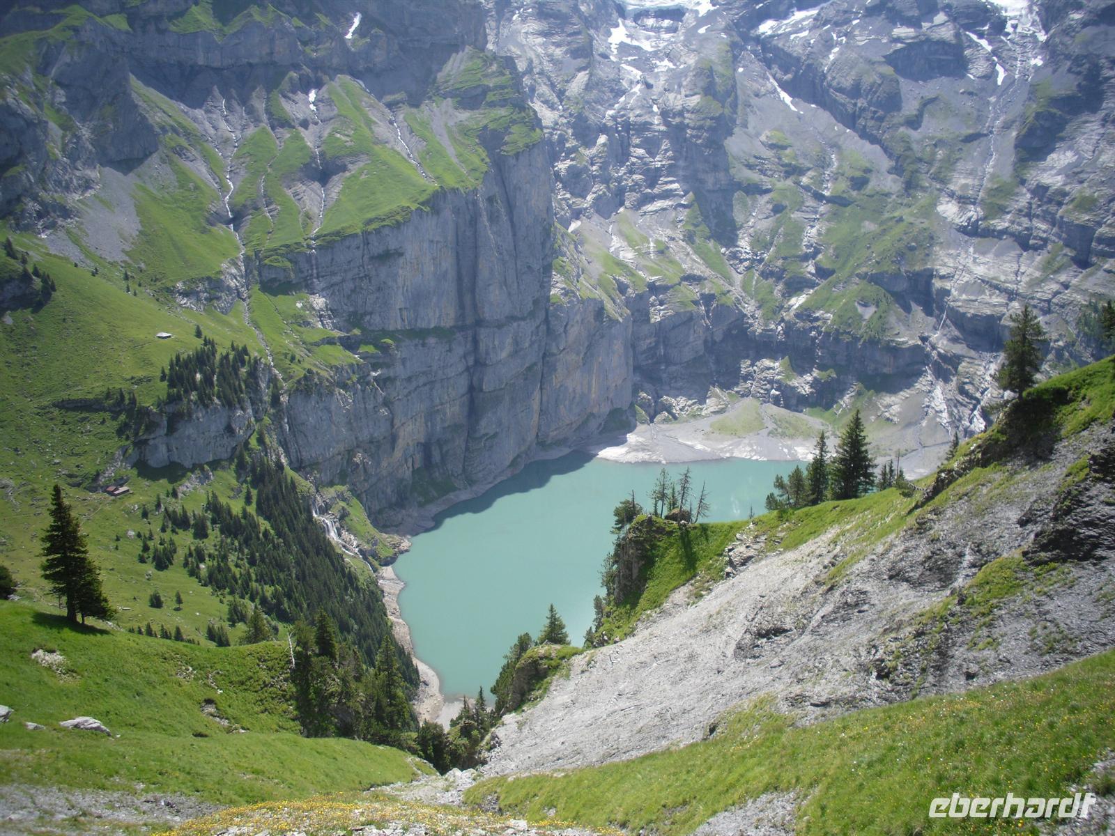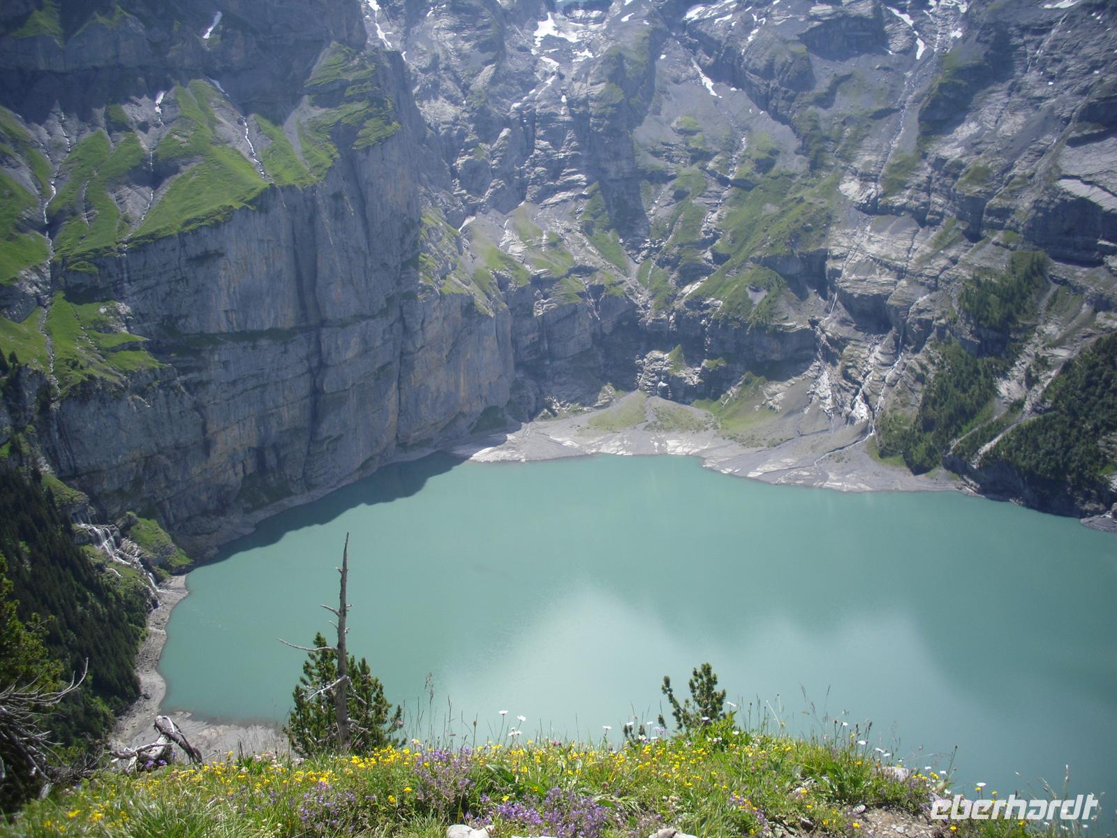 Mit einer modernen Umlaufbahn geht es in nur etwa knapp 10 Minuten zur Bergstation, von wo aus wir dann noch etwa 20 Minuten zum See spazieren müssen. Im etwa knapp 1.600 Meter hoch gelegenen Oeschinensee spiegelt sich der gewaltige Fels- und Gletscherzirkus der Blümlisalp, wahrlich beeindruckend! Hier kann man unter verschiedenen Wanderrouten wählen oder man entscheidet sich für eine Bootspartie auf dem See. Manch einer von uns genießt heute jedoch einfach nur die traumhaften Ausblicke hier oben und sonnt sich auf einer der Terrassen der gastronomischen Einrichtungen. Am Abend treffen wir uns schließlich alle wieder zum Abendessen und werden mit einem Barbecue-Buffet im Hotel verwöhnt. Gemütlich lassen wir somit diesen schönen sonnigen Tag ausklingen.
