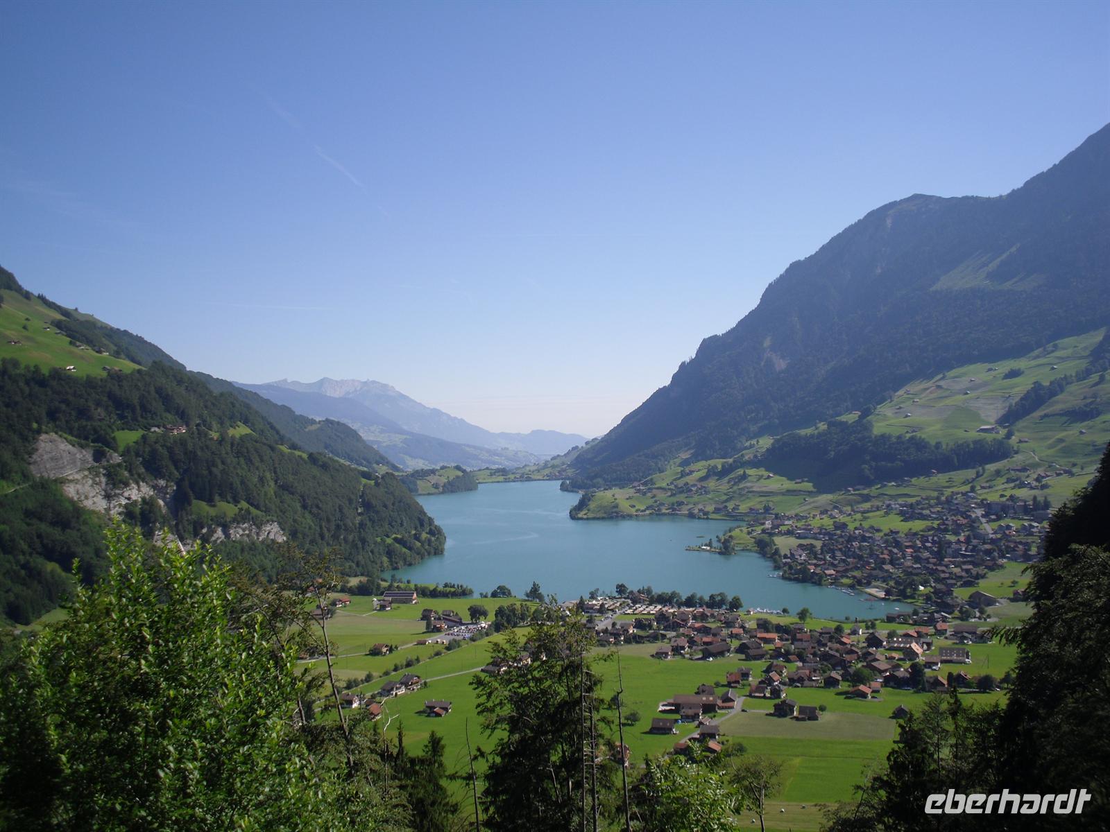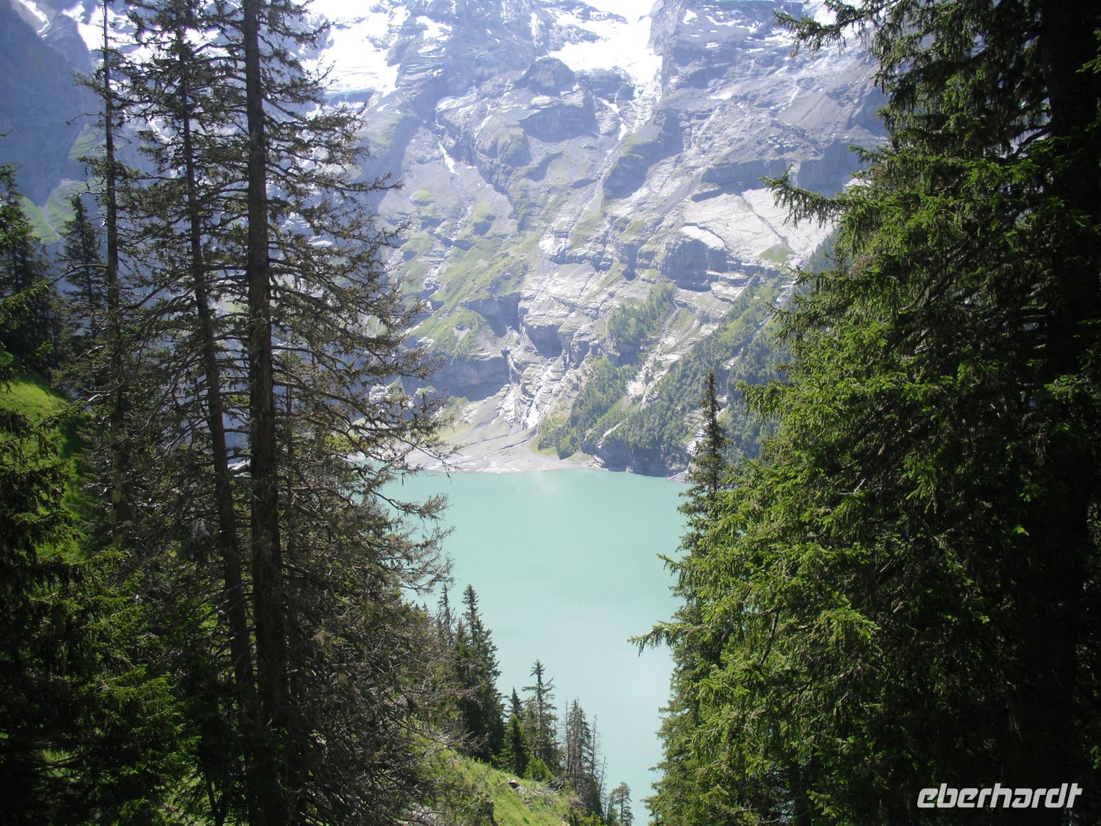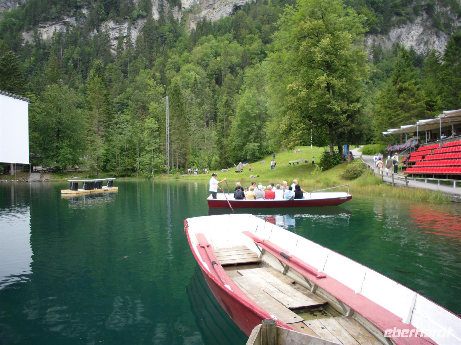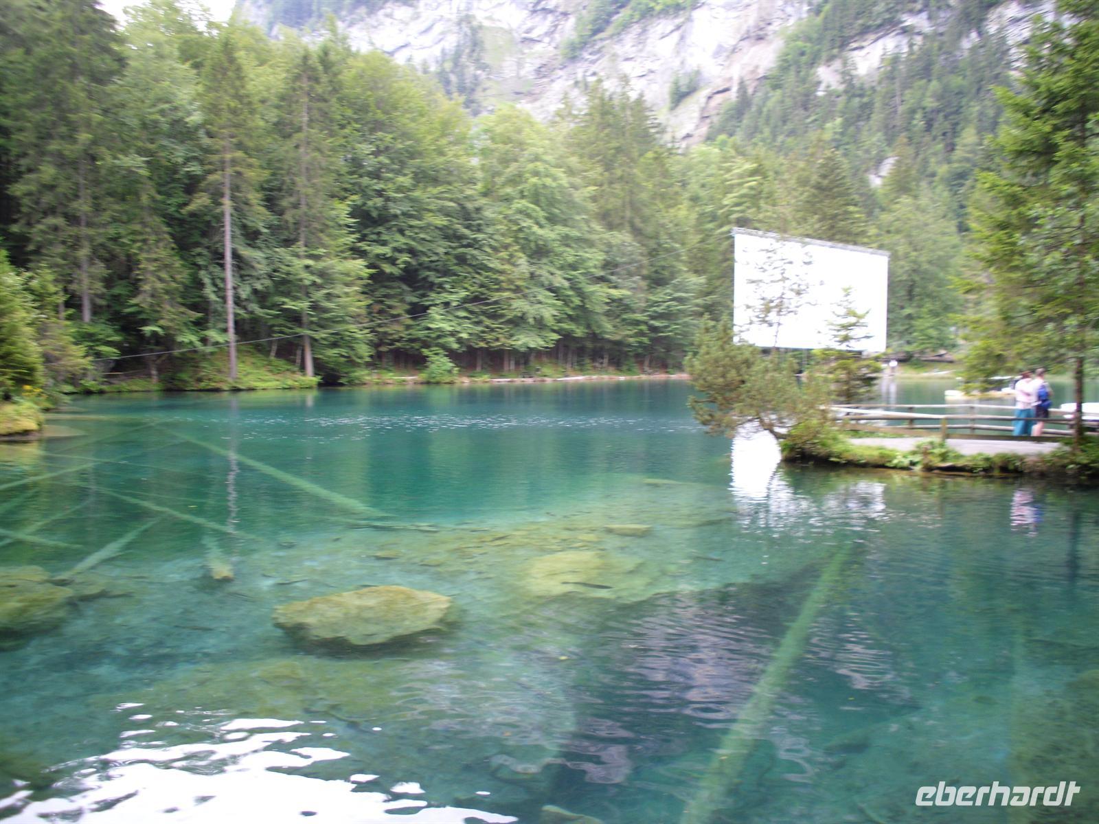 Während einer Besichtigung erfahren wir viele interessante Details zur Herstellung und Lagerung des Käses und verkosten diesen. Und zu gutem Käse gehört ein guter Schweizer Wein, den wir ebenfalls probieren können. Anschließend holt uns unser Bus im Ortszentrum von Kandersteg ab und wir fahren zum nur etwa 6 Kilometer entfernten Blausee. Vor ca. 15.000 Jahren sorgte ein Bergsturz für die Entstehung des Blausees. Der Kessel von Kandersteg war in dieser Zeit von einer Gletscherzunge bedeckt. Die Felsmassen rissen große Teile des Eises los und vermengten sich zum Teil mit ihm. Löcher oder kleine Täler - so genannte Hohlformen - kamen nach dem Schmelzen dieser Blöcke zum Vorschein. Einige dieser Hohlformen wurden später durch Bäche wieder eingeebnet, andere blieben bis heute bestehen - so auch der Blausee. Der Blausee ist übrigens ausgesprochen klar, so dass die in 12 Meter Tiefe liegenden Baumstämme und Felsen deutlich zu sehen sind und der Eindruck entsteht, sie lägen gleich unter der Wasseroberfläche.