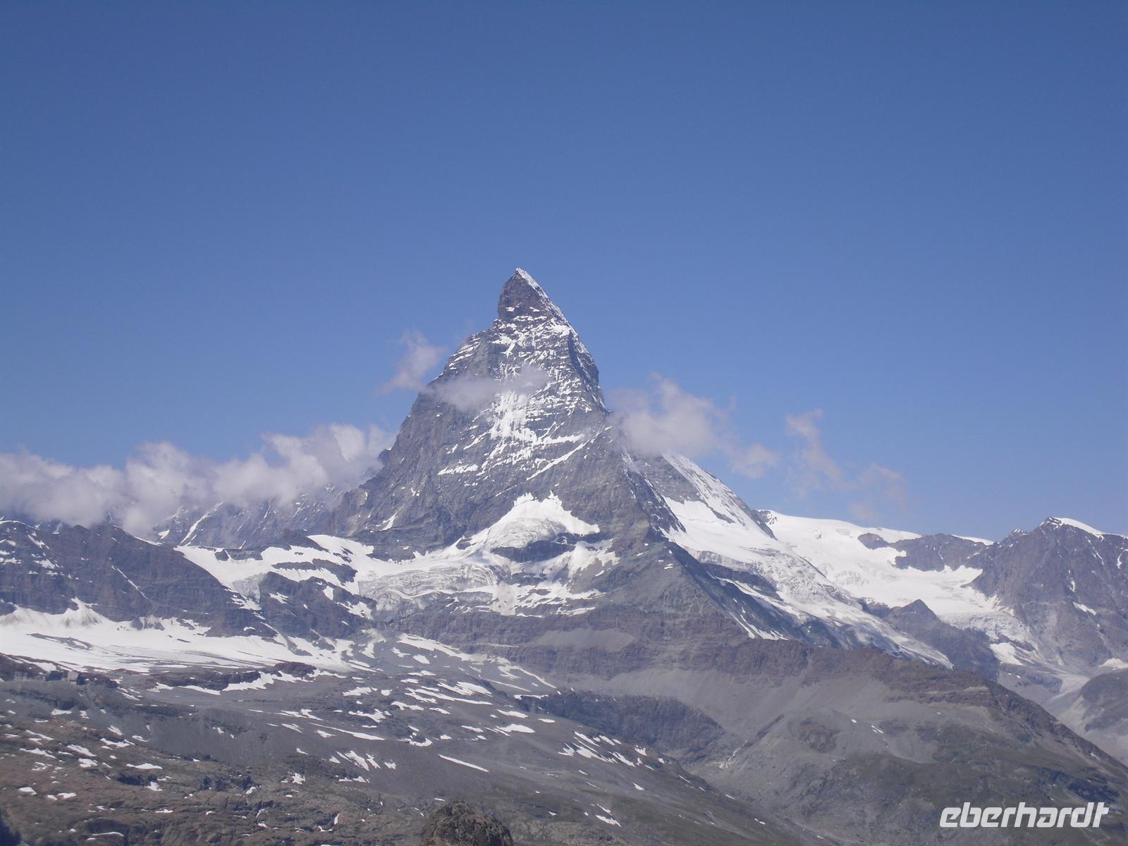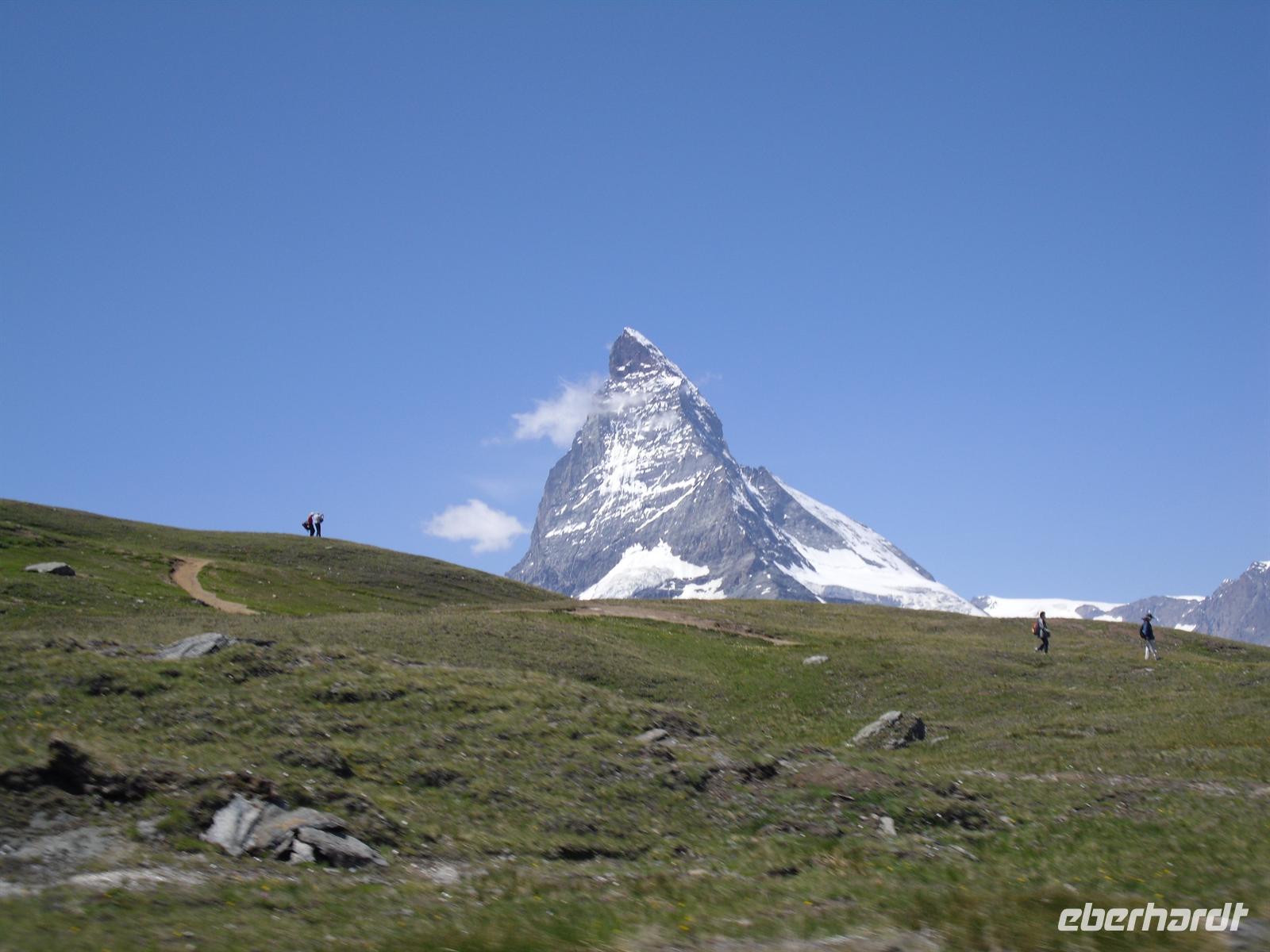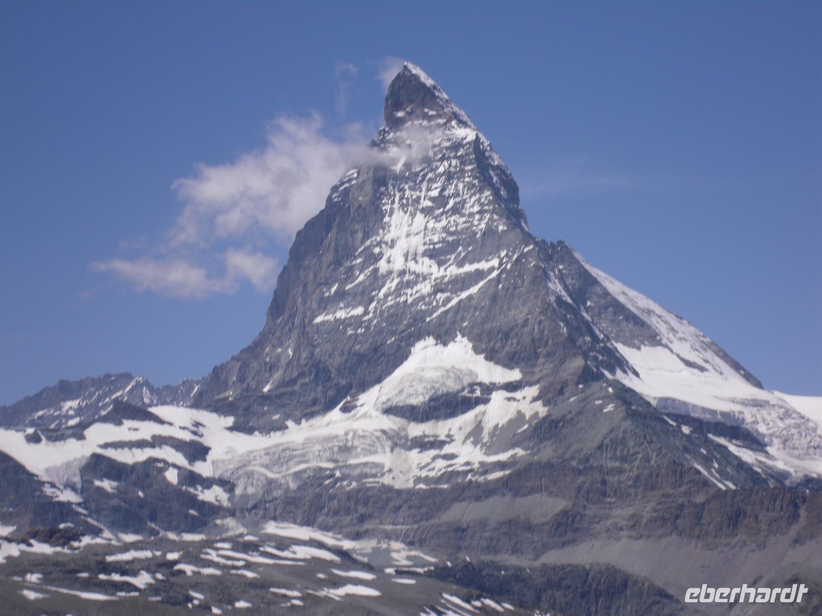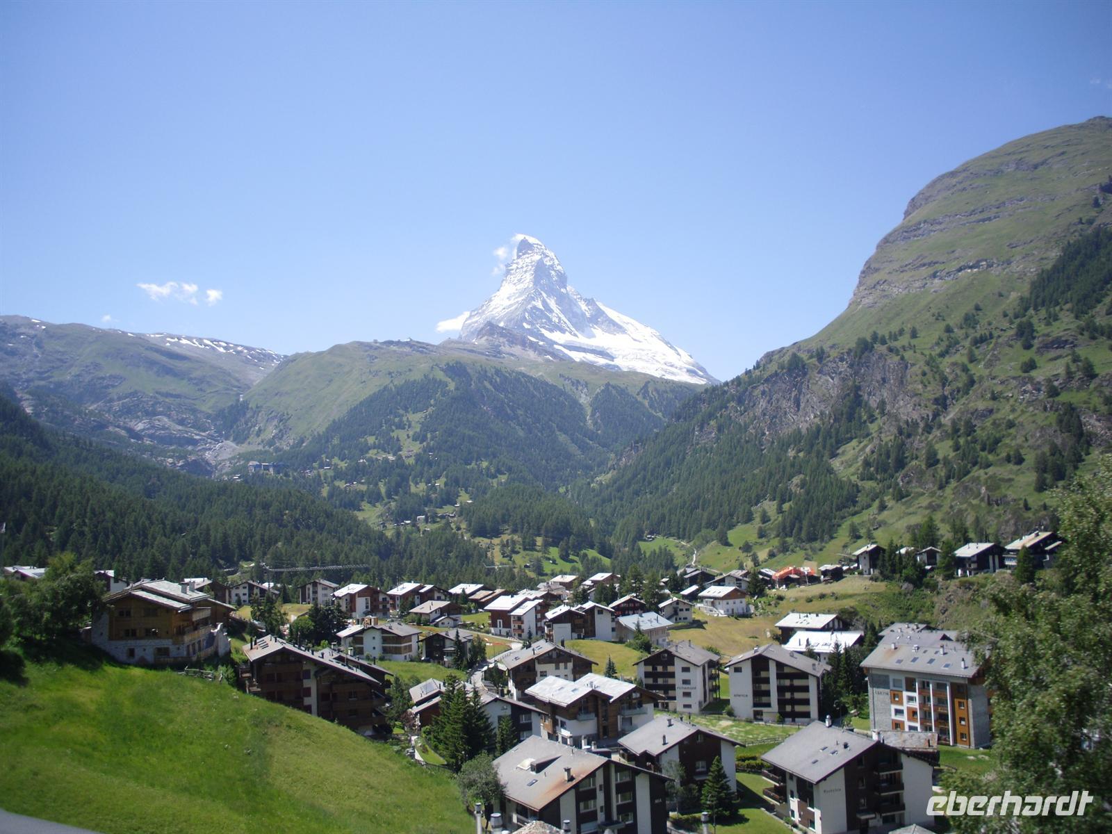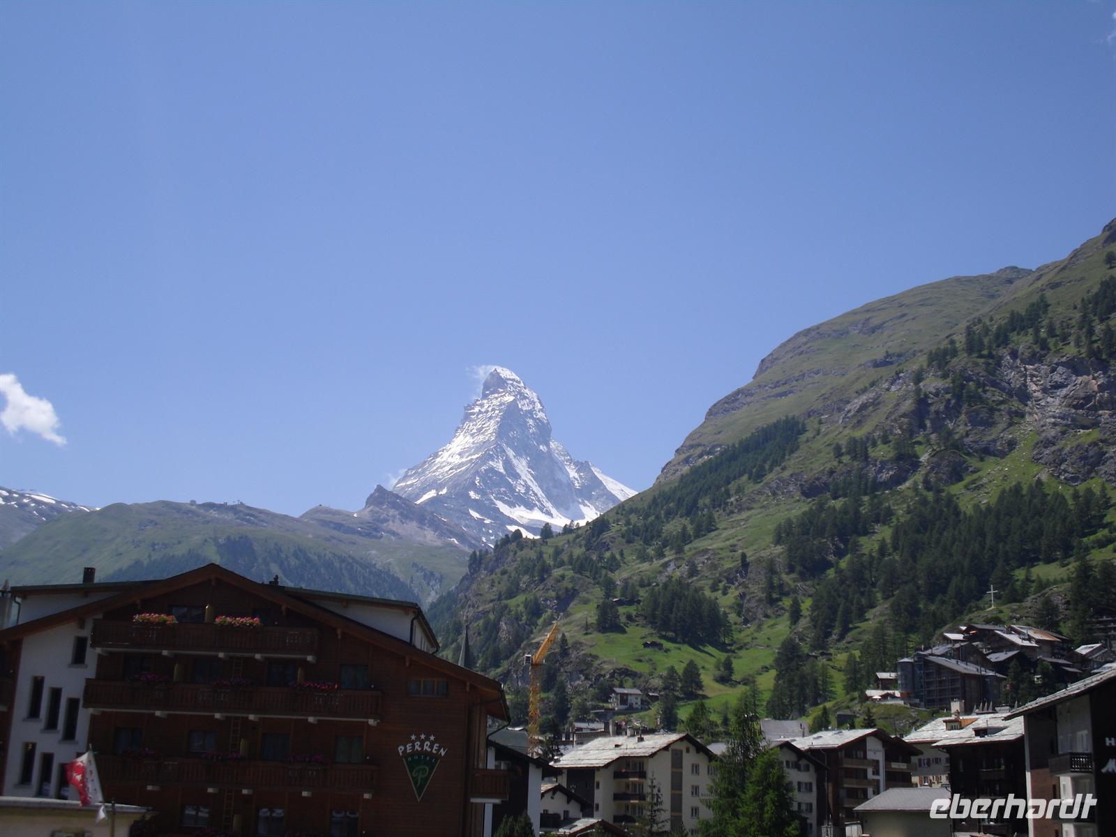 Unseren Bus lassen wir in Täsch, etwa 5 Kilometer nördlich von Zermatt, stehen und steigen in den Pendelzug nach Zermatt um. Zermatt ist nämlich autofrei und selbst die Einheimischen dürfen nur mit speziellen Elektro-Fahrzeugen umherfahren. Wir alle hoffen auf eine gute Sicht auf den Berg der Berge - das Matterhorn! Wir können das Wahrzeichen von Zermatt in voller Pracht genießen, was für ein Glück! Ein Großteil unserer Gruppe fährt daher auf den 3.089 Meter hohen Gornergrat. Er stellt die Endstation der 1898 eröffneten Gornergratbahn dar, die über Riffelalp und Riffelberg führt und dabei eine Höhendifferenz von fast 1500 Metern überwindet. Die Gornergratbahn ist eine elektrisch
