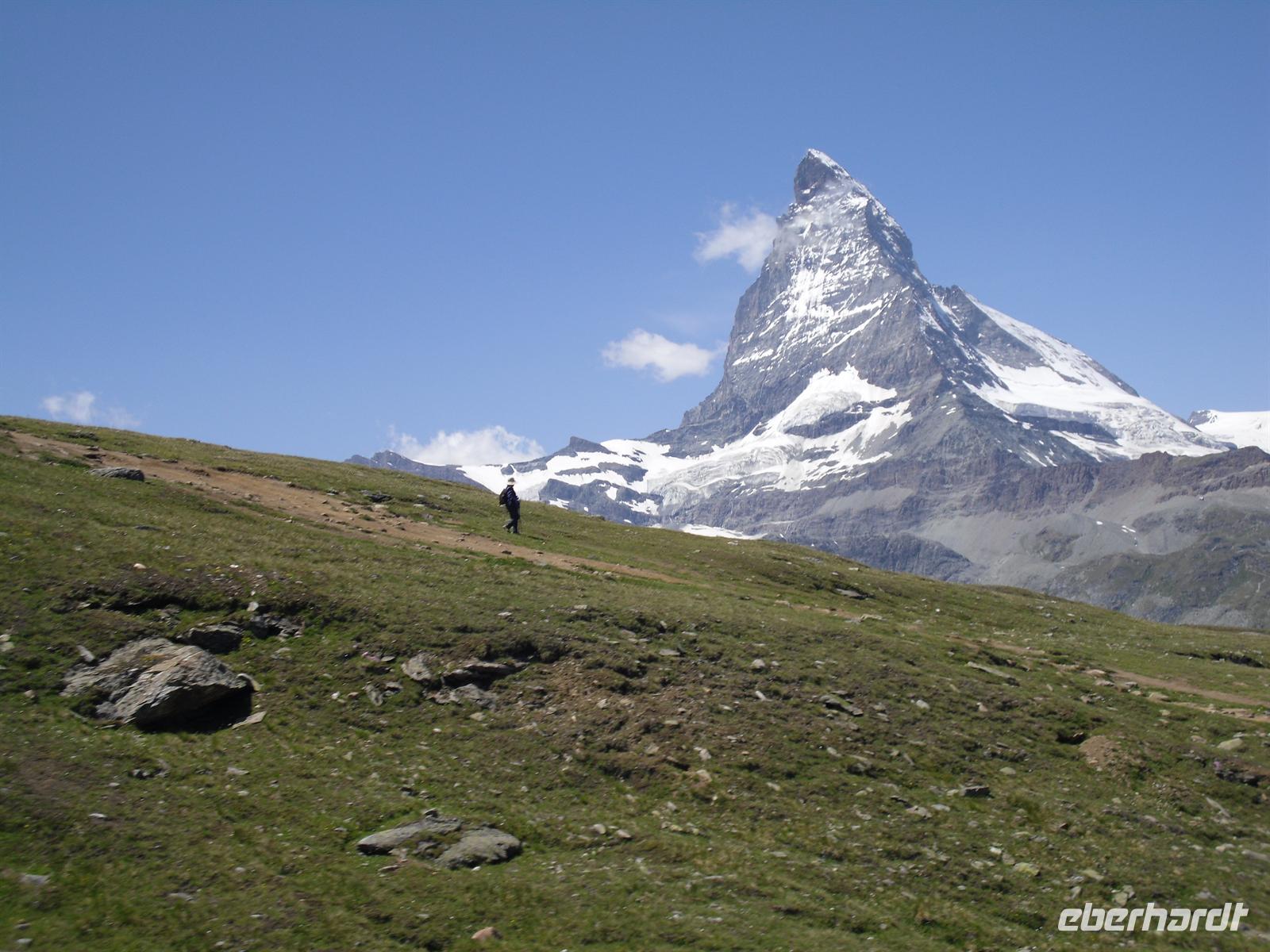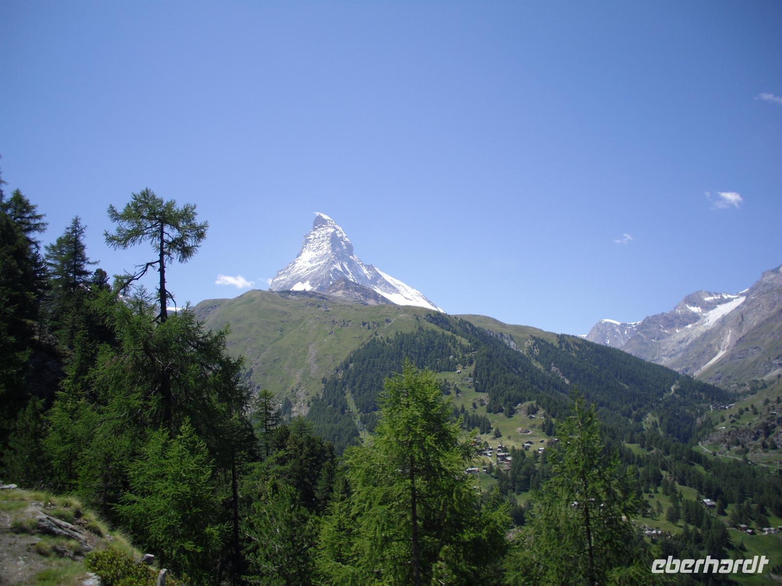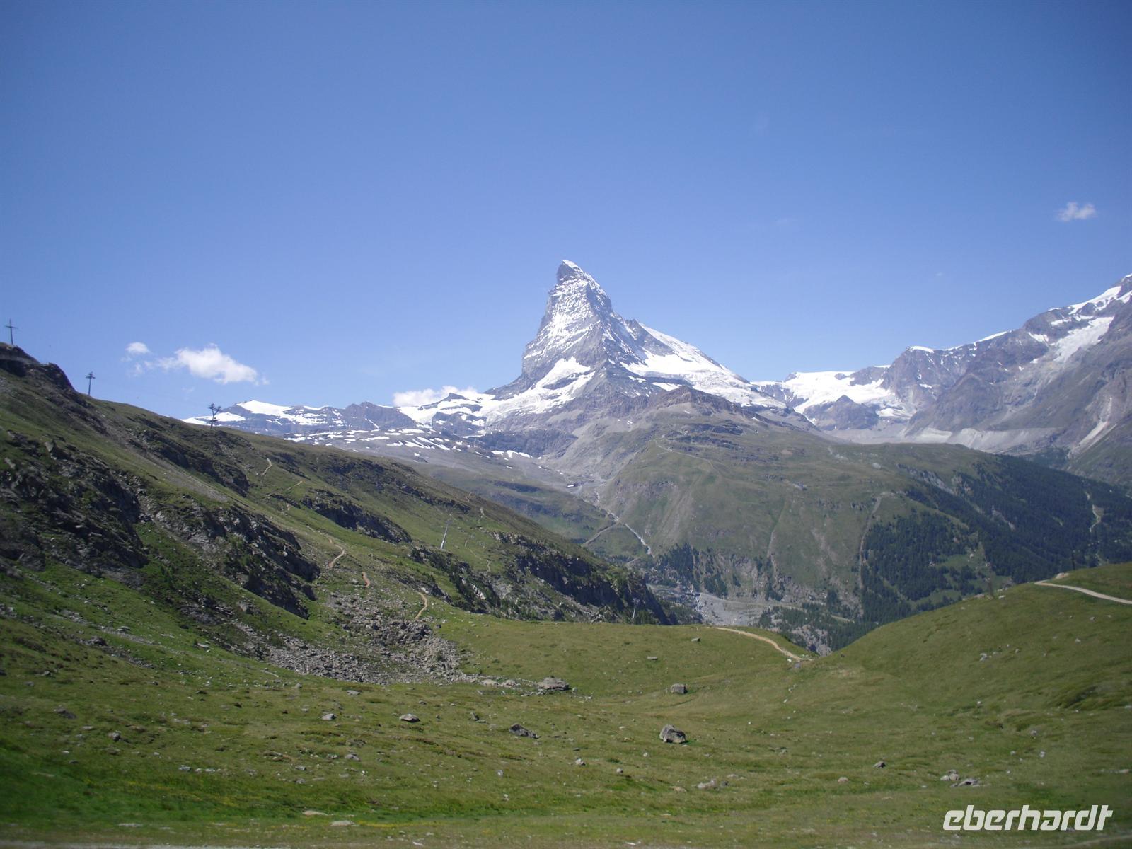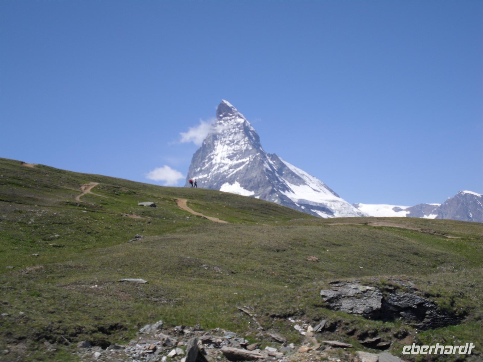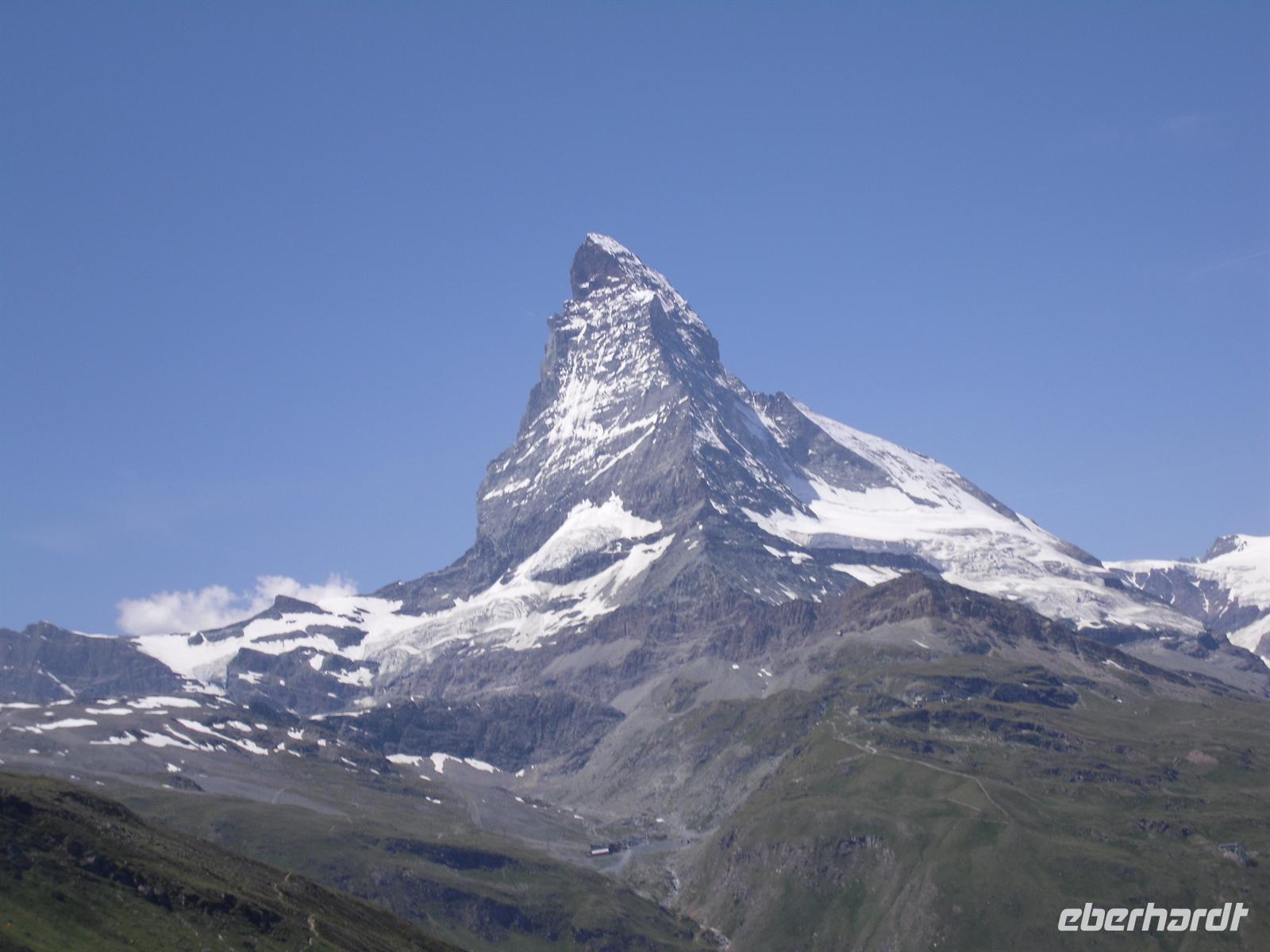 Unseren Bus lassen wir in Täsch, etwa 5 Kilometer nördlich von Zermatt, stehen und steigen in den Pendelzug nach Zermatt um. Zermatt ist nämlich autofrei und selbst die Einheimischen dürfen nur mit speziellen Elektro-Fahrzeugen umherfahren. Wir alle hoffen auf eine gute Sicht auf den Berg der Berge - das Matterhorn! Wir können das Wahrzeichen von Zermatt in voller Pracht genießen, was für ein Glück! Ein Großteil unserer Gruppe fährt daher auf den 3.089 Meter hohen Gornergrat. Er stellt die Endstation der 1898 eröffneten Gornergratbahn dar, die über Riffelalp und Riffelberg führt und dabei eine Höhendifferenz von fast 1500 Metern überwindet. Die Gornergratbahn ist eine elektrisch