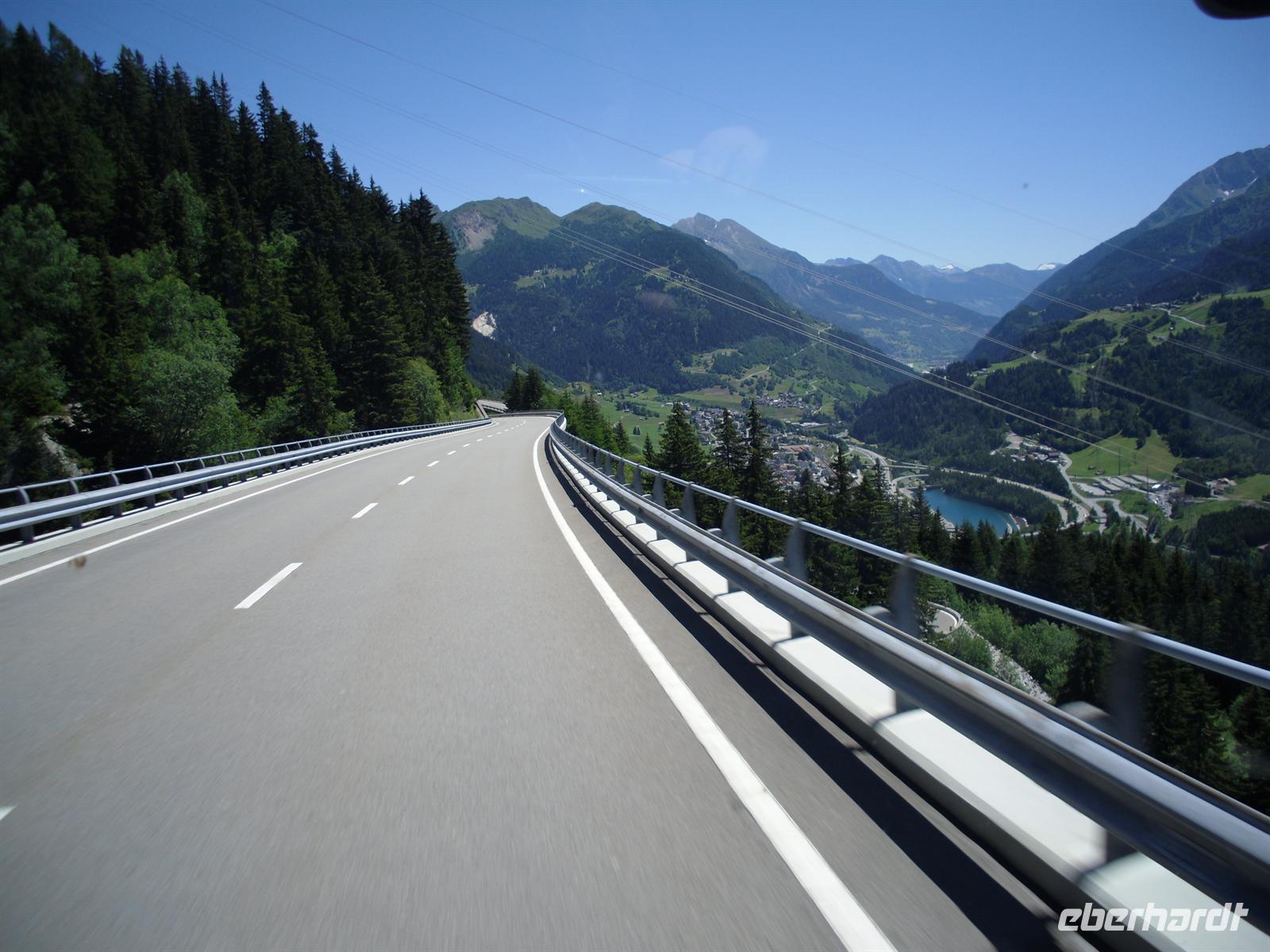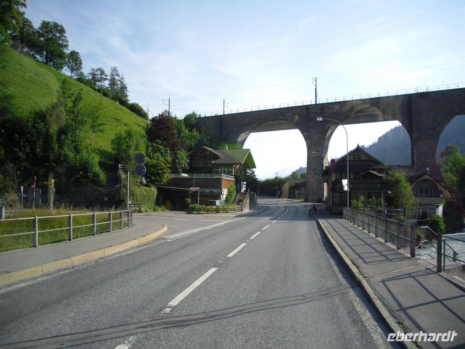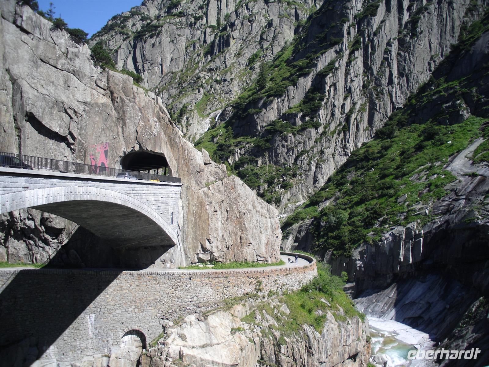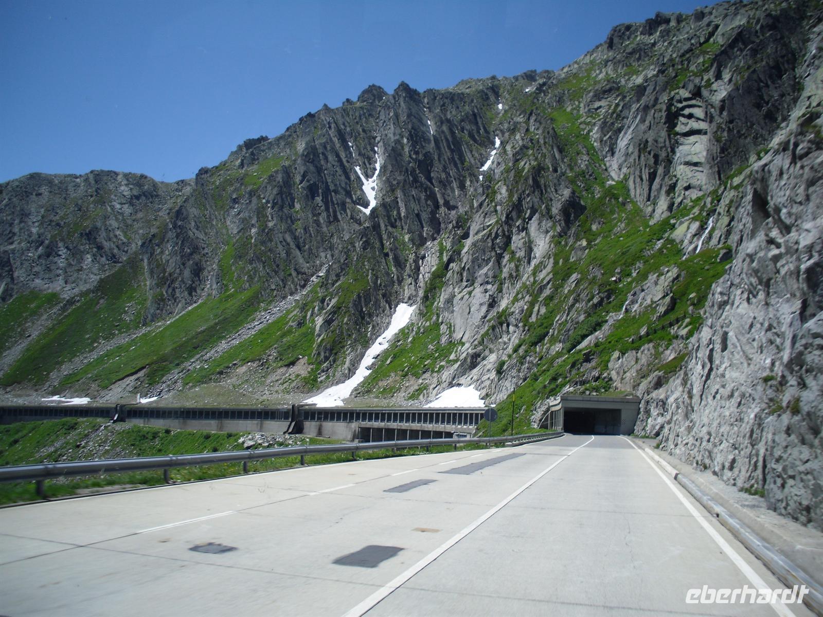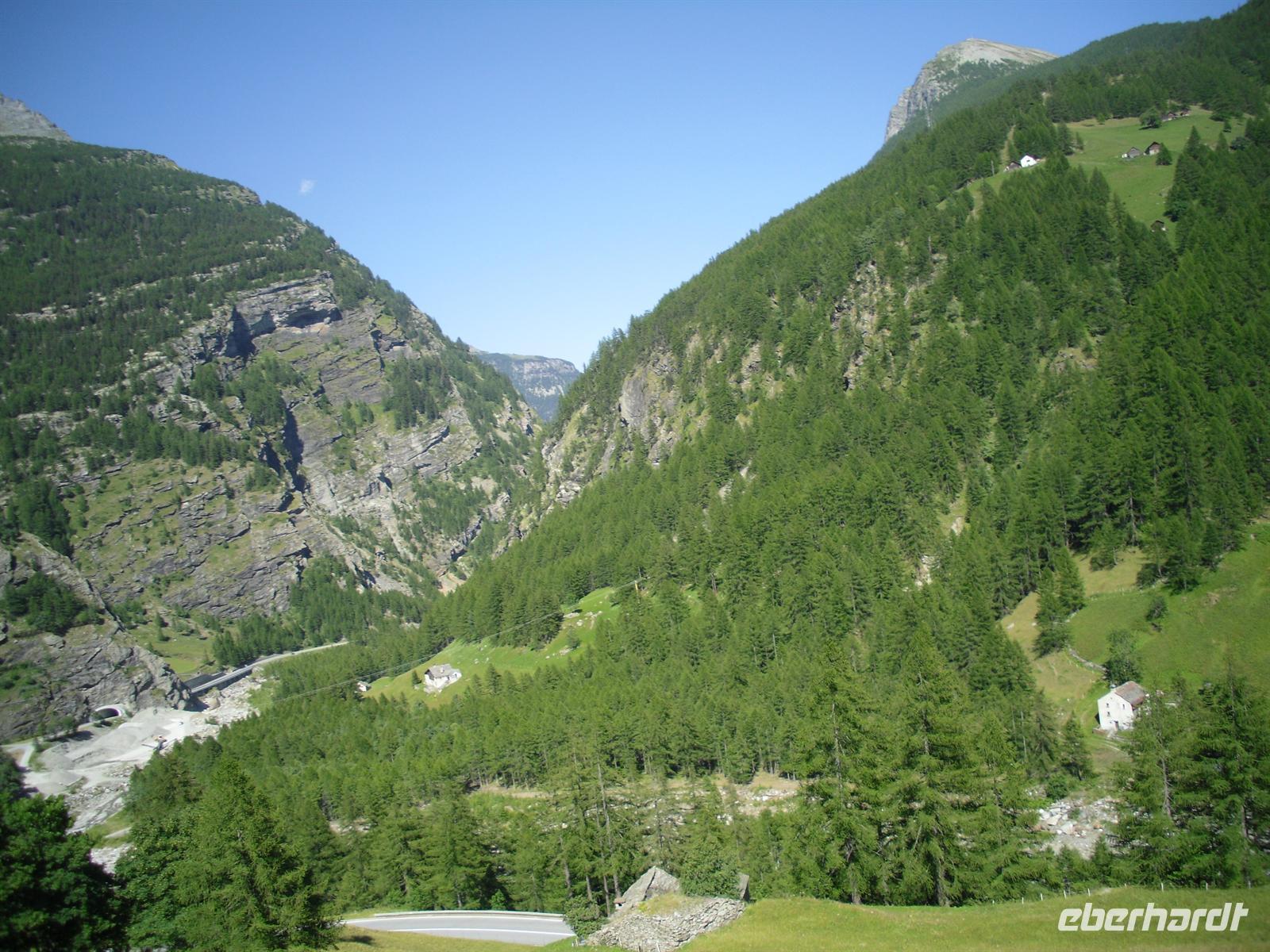 Kurz vor Gondo fahren wir wieder in die Schweiz hinein. Der 2.005 Meter hohe Simplonpass ist eine Verbindung zwischen Domodossola in Norditalien und Brig im schweizerischen Kanton Wallis. Die Strasse ist breit, hat nur wenige Kurven und dürfte unter den Alpenpassstraßen den Rekord für Lawinengalerien und Tunnels halten. Der Simplon hat eine lange Geschichte. Die erste Trasse wurde von Kaspar Jodok Stockalper im 17. Jahrhundert angelegt. Der wurde mit dem Transport von Gütern so reich, dass sein prunkvolles Schloss noch heute Wahrzeichen von Brig ist. Napoleon baute 1801-1805 eine neue Trasse. Die heutige Trasse folgt zum Teil der Napoleontrasse, ist teilweise aber auch ganz neu. Die Ganterbrücke wurde z.B. erst 1980 fertig gestellt. Am frühen Abend kommen wir dann in Brig im Rhonetal an und von dort aus nehmen wir die Lötschbergbahn, die uns zurück nach Kandersteg bringt.