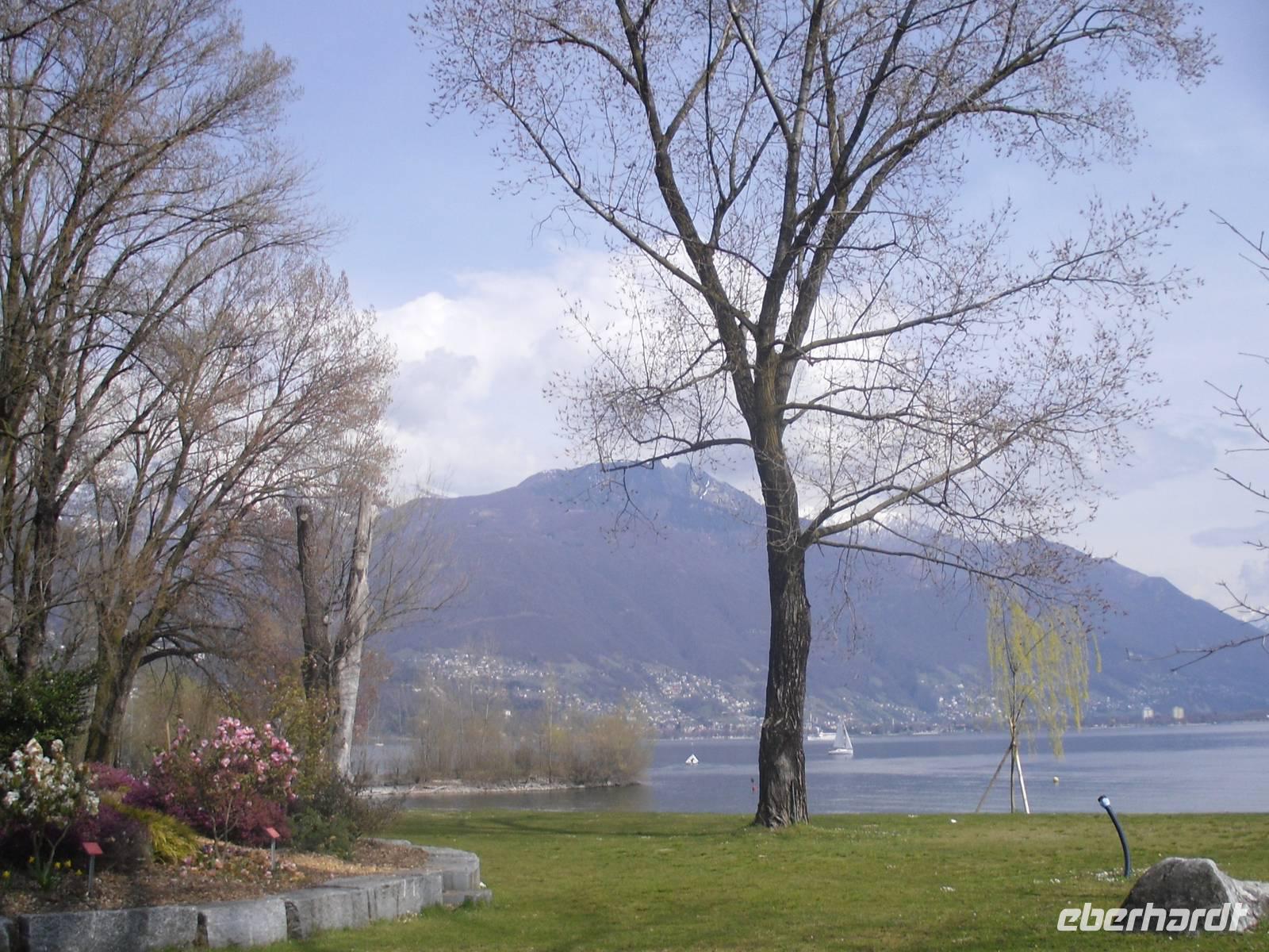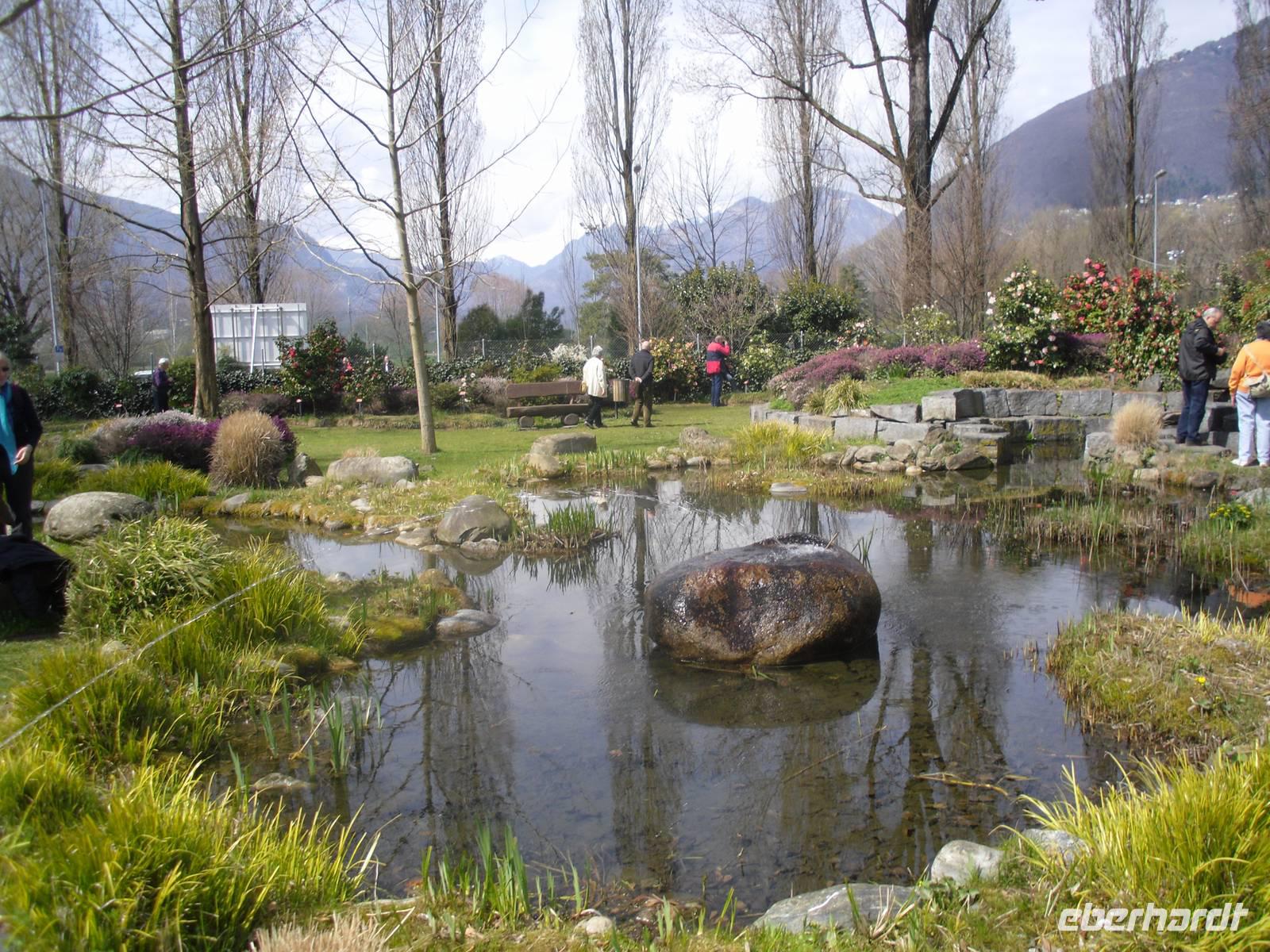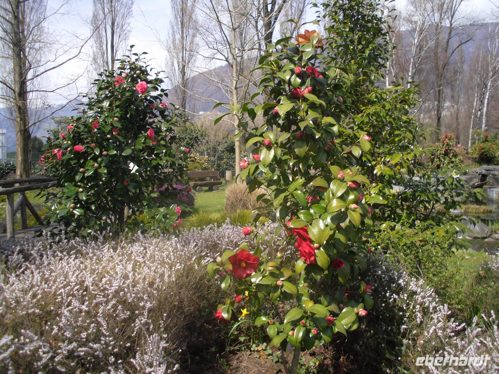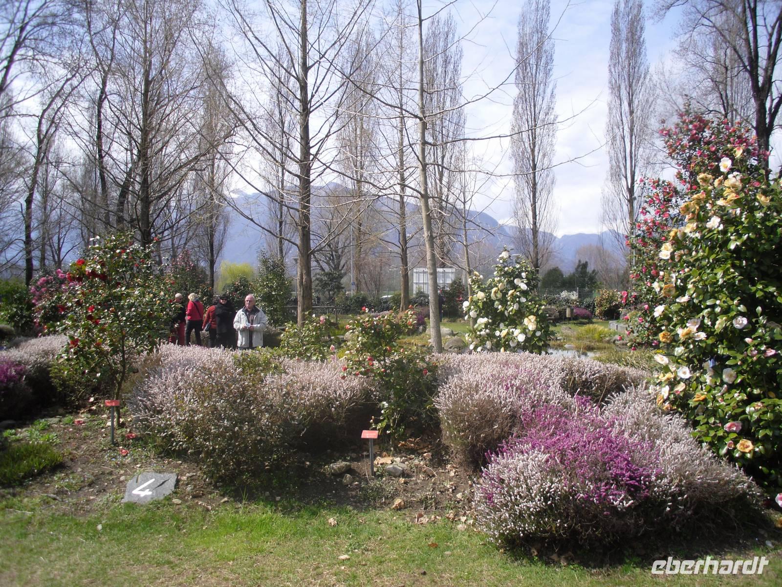 Am heutigen Vormittag stand ein weiterer Höhepunkt unserer Traumreise an. Der Landschaftswechsel auf dieser kurzen Strecke ins Verzascatal hinein ist einfach unglaublich! Von den lieblichen Ufern des Lago Maggiore steigt die Straße, zuerst zwischen herrlichen Weinbergen bis hinauf zum Verzasca-Stausee, welcher den höchsten Staudamm Europas aufweist (220 m). Von dort, dem See entlang fahrend, erreichten wir Vogorno. Gegenüber, hoch am Hang gelegen, sahen wir Corippo, das kleine typische Dorf, das infolge seiner architektonischen Einheit unter Denkmalschutz gestellt wurde. Auf der Strecke zwischen Corippo und Lavertezzo erfreute uns immer wieder der Anblick des Verzasca-Flusses, der hier seine ganze Schönheit entfaltet. Zwischen steilen, von der Erosionskraft polierten Steinen, die wunderbares Geäder aufweisen, strömt der Fluss in seiner unbeschreiblich grünen Farbe, die dem Tal den Namen gegeben hat (Verzasca, abgeleitet von "verde acqua" - grünes Wasser). Imposante, über 2.000 Meter hohe Berge umrahmen das ganze Tal. Typisch sind die Verzasca-Häuser aus grauem Stein mit weißen Umrandungen an den Fenstern und Steinplattendächern. Die vielen Kapellen entlang der Wege, zeugen vom tiefreligiösen Glauben der Talbewohner. Sehr bemerkenswert im Tal ist die doppelwölbige Brücke "Ponte dei Salti", wo wir einen Fotostopp einlegten. Schließlich erreichten wir den Ort Sonogno, am Ende des Tales gelegen. Hier gab es im Anschluss an einen kleinen Rundgang ein fürstliches Picknick für alle Gäste - natürlich im Namen von "Eberhardt TRAVEL", na dann "Guten Appetit!" Wir ließen uns verschiedene Spezialitäten der Region - wie Käse, Salami und Schinken - schmecken, dazu gab es frisch gebackenes Brot und selbstverständlich auch Wein! Gut gelaunt und gestärkt kamen wir nach diesem ausgiebigen Mittagsimbiss in Locarno an - die Stadt erfreut sich außergewöhnlich günstiger klimatischer Bedingungen. Es liegt in der Region mit den meisten Sonnenstunden der Schweiz. Die durchschnittliche Jahrestemperatur liegt bei 11 Grad Celsius, außerdem dämpft der nahe See die Temperaturschwankungen und trägt zu einer erhöhten Luftfeuchtigkeit bei. Das Ausbleiben längerer Frostzeiten und der saure Boden sind weitere Faktoren, die hier zum kräftigen Gedeihen einer einmaligen, spontan wachsenden, dekorativen und variantenreichen Flora beitragen. Viele Gärten der Villen und Hotels aus dem 19. Jahrhundert sind erhalten geblieben. Sie wurden dank reichen Leuten angelegt, die sich hier niedergelassen haben, begünstigt durch die beneidenswerten klimatischen Bedingungen. Wir besuchten den Kamelienpark von Locarno, eine herrliche Parkanlage direkt am See, wo man interessante und besonders große Kameliensträucher bewundern kann, die hier ideale Wachstumsvoraussetzungen haben. Die meisten Kamelienarten blühten gerade jetzt im April, was natürlich ein besonderes Glück für uns war.