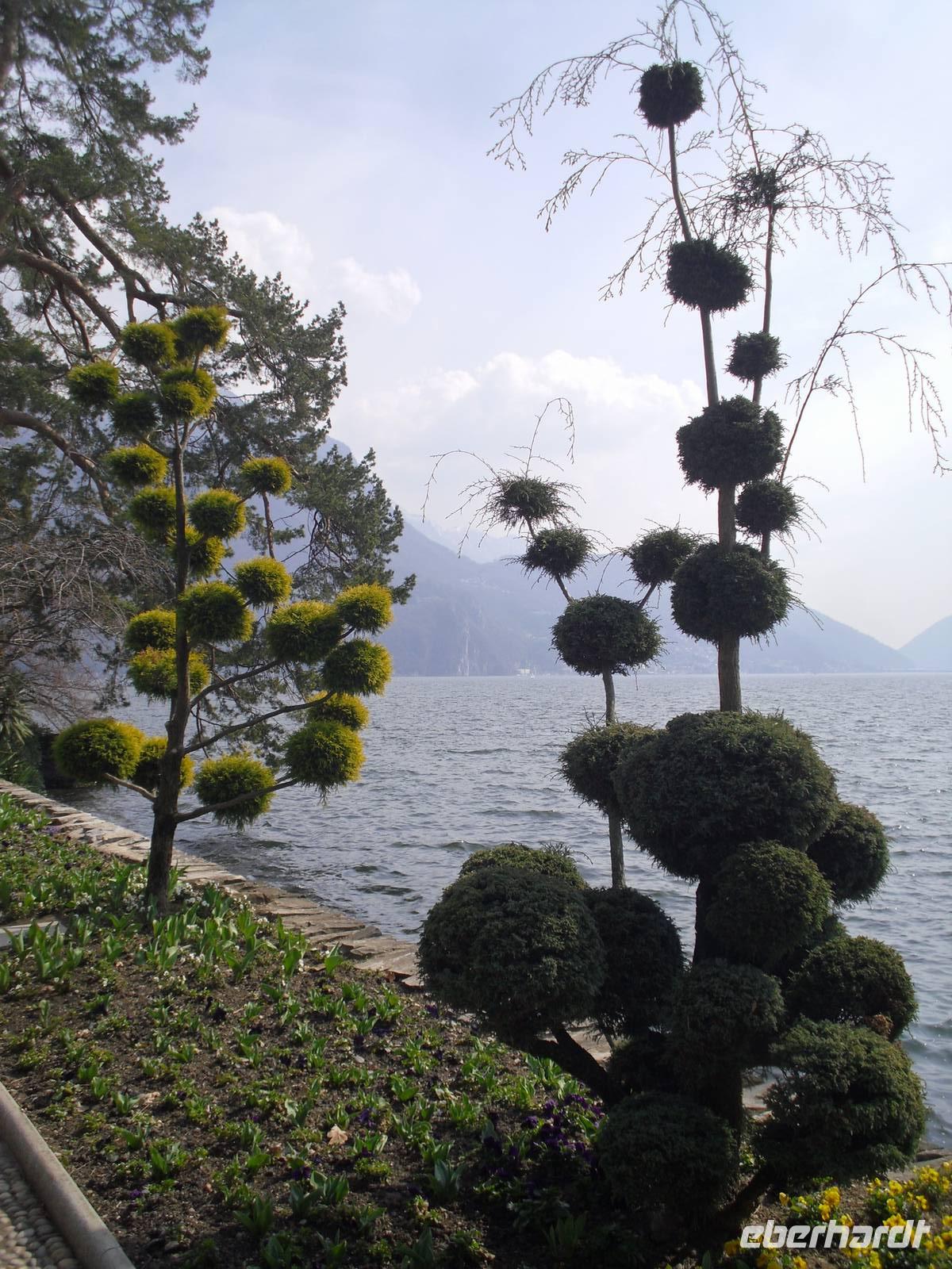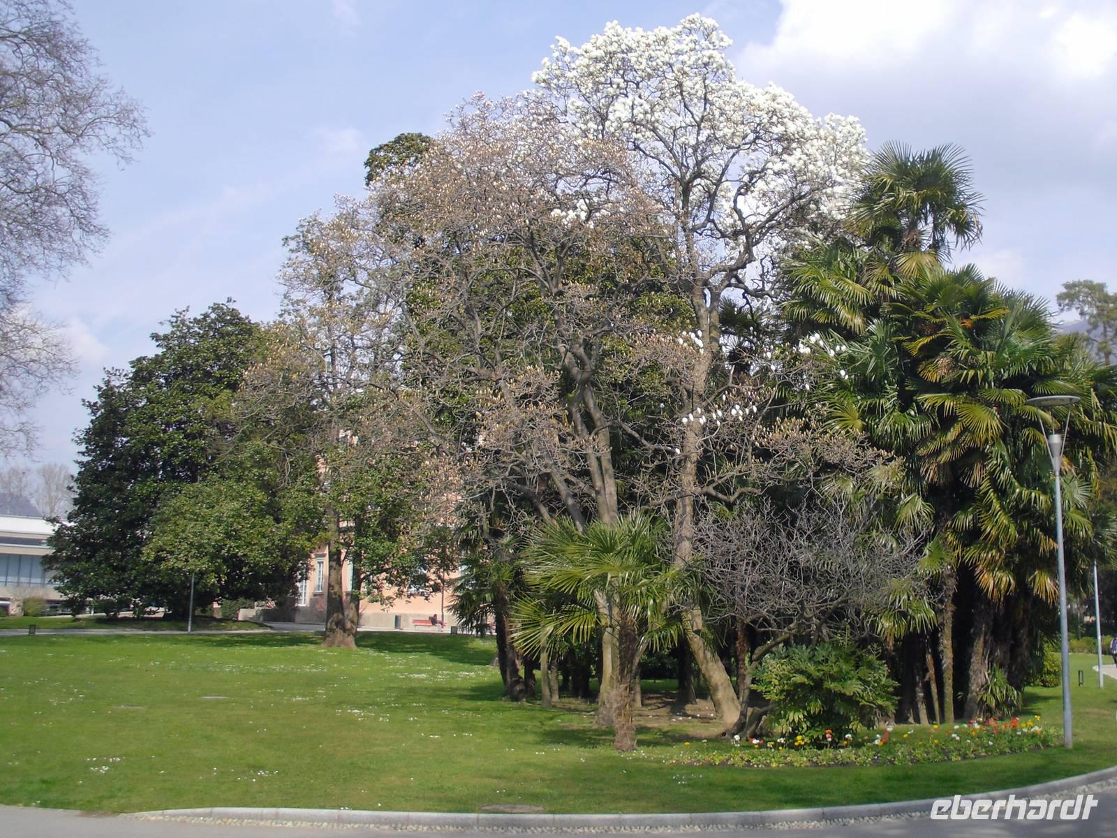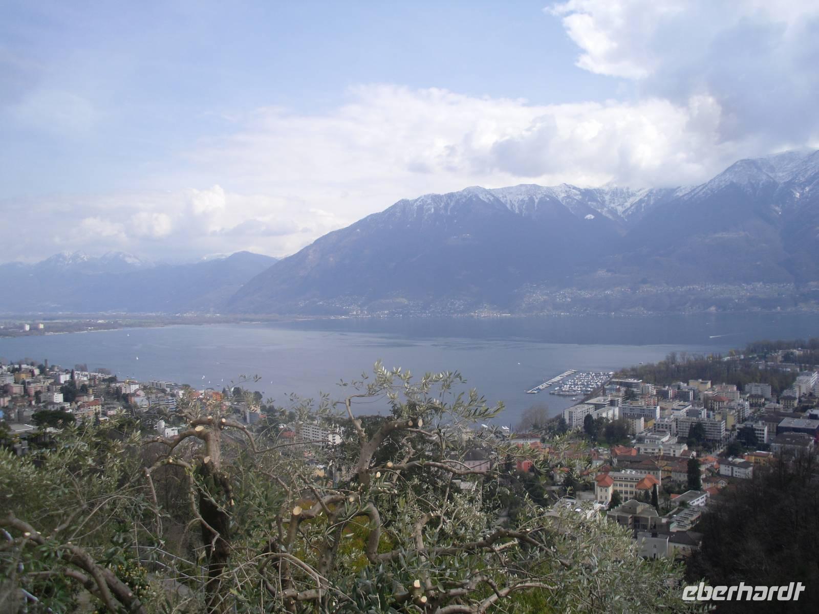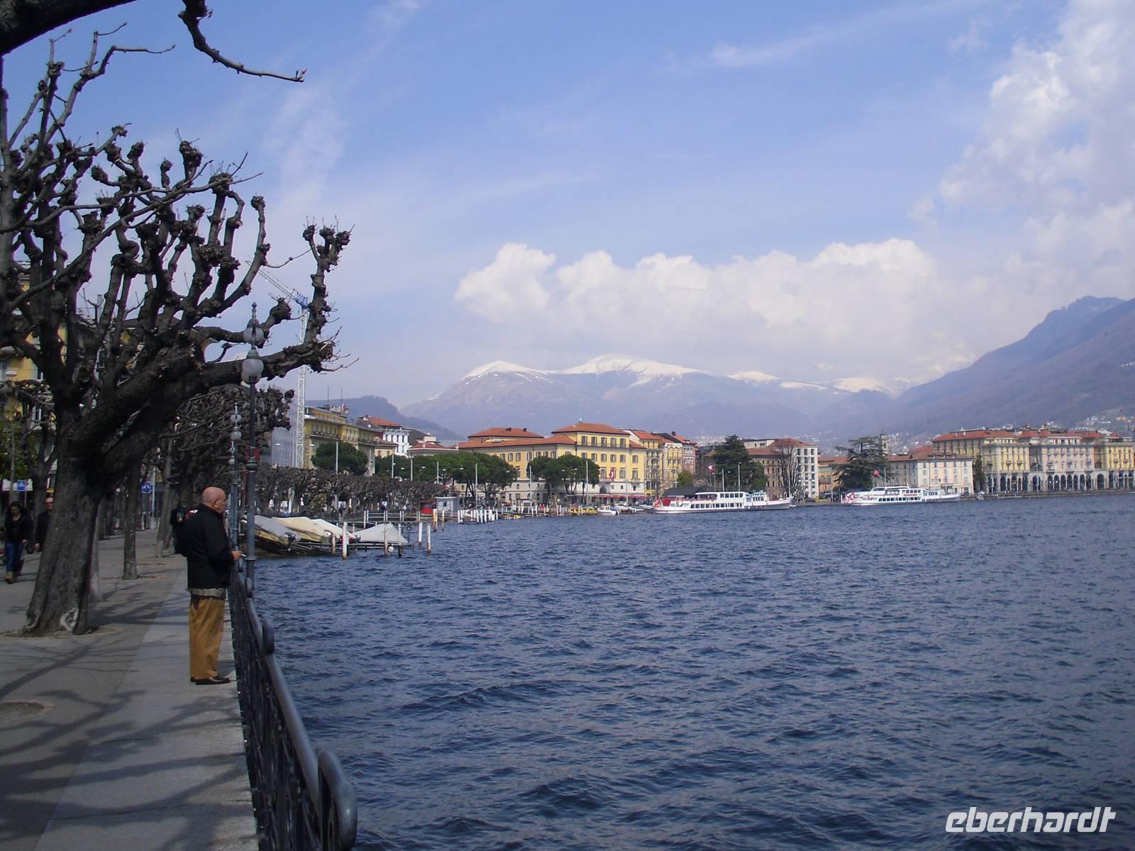 Am heutigen Vormittag stand ein weiterer Höhepunkt unserer Traumreise an. Der Landschaftswechsel auf dieser kurzen Strecke ins Verzascatal hinein ist einfach unglaublich! Von den lieblichen Ufern des Lago Maggiore steigt die Straße, zuerst zwischen herrlichen Weinbergen bis hinauf zum Verzasca-Stausee, welcher den höchsten Staudamm Europas aufweist (220 m). Von dort, dem See entlang fahrend, erreichten wir Vogorno. Gegenüber, hoch am Hang gelegen, sahen wir Corippo, das kleine typische Dorf, das infolge seiner architektonischen Einheit unter Denkmalschutz gestellt wurde. Auf der Strecke zwischen Corippo und Lavertezzo erfreute uns immer wieder der Anblick des Verzasca-Flusses, der hier seine ganze Schönheit entfaltet. Zwischen steilen, von der Erosionskraft polierten Steinen, die wunderbares Geäder aufweisen, strömt der Fluss in seiner unbeschreiblich grünen Farbe, die dem Tal den Namen gegeben hat (Verzasca, abgeleitet von "verde acqua" - grünes Wasser). Imposante, über 2.000 Meter hohe Berge umrahmen das ganze Tal. Typisch sind die Verzasca-Häuser aus grauem Stein mit weißen Umrandungen an den Fenstern und Steinplattendächern. Die vielen Kapellen entlang der Wege, zeugen vom tiefreligiösen Glauben der Talbewohner. Sehr bemerkenswert im Tal ist die doppelwölbige Brücke "Ponte dei Salti", wo wir einen Fotostopp einlegten. Schließlich erreichten wir den Ort Sonogno, am Ende des Tales gelegen. Hier gab es im Anschluss an einen kleinen Rundgang ein fürstliches Picknick für alle Gäste - natürlich im Namen von "Eberhardt TRAVEL", na dann "Guten Appetit!" Wir ließen uns verschiedene Spezialitäten der Region - wie Käse, Salami und Schinken - schmecken, dazu gab es frisch gebackenes Brot und selbstverständlich auch Wein! Gut gelaunt und gestärkt kamen wir nach diesem ausgiebigen Mittagsimbiss in Locarno an - die Stadt erfreut sich außergewöhnlich günstiger klimatischer Bedingungen. Es liegt in der Region mit den meisten Sonnenstunden der Schweiz. Die durchschnittliche Jahrestemperatur liegt bei 11 Grad Celsius, außerdem dämpft der nahe See die Temperaturschwankungen und trägt zu einer erhöhten Luftfeuchtigkeit bei. Das Ausbleiben längerer Frostzeiten und der saure Boden sind weitere Faktoren, die hier zum kräftigen Gedeihen einer einmaligen, spontan wachsenden, dekorativen und variantenreichen Flora beitragen. Viele Gärten der Villen und Hotels aus dem 19. Jahrhundert sind erhalten geblieben. Sie wurden dank reichen Leuten angelegt, die sich hier niedergelassen haben, begünstigt durch die beneidenswerten klimatischen Bedingungen. Wir besuchten den Kamelienpark von Locarno, eine herrliche Parkanlage direkt am See, wo man interessante und besonders große Kameliensträucher bewundern kann, die hier ideale Wachstumsvoraussetzungen haben. Die meisten Kamelienarten blühten gerade jetzt im April, was natürlich ein besonderes Glück für uns war.
