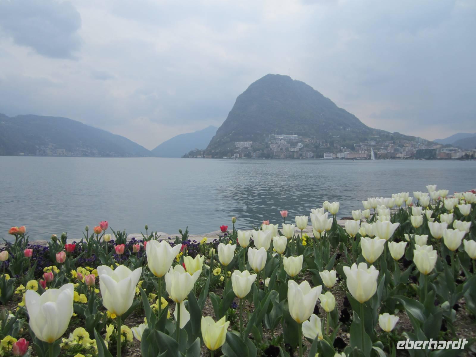 Gegen Mittag verlassen wir Como und fahren an der Westseite des Sees nach Lugano. Die Straße ist sehr eng wir haben aber immer wieder einen herrlichen Blick auf den See mit seinen Villen. An der Villa Carlotta nehmen wir uns Zeit zum Fotografieren. Es war Prinzessin Mariane von Nassau, die gegen Mitte des 19. Jahrhunderts die Villa ihrer Tochter Charlotte als Brautgabe zur Hochzeit mit Georg Kronprinz von Sachsen-Meinigen schenkte. Auf der Fahrt nach Lugano "schrauben" wir uns in die Höhe und haben immer noch einen schönen Blick auf den Comer See. Gegen 14.00 Uhr kommen wir in Lugano und wieder in der Schweiz an, nicht ohne Respekt vor dem fahrerischen Geschick unseres Busfahrers. Lugano mit dem Hausberg Monte Bri und dem Berg S. Salvatore ist die heimliche Hauptstadt des Kantons Tessin und drittgrößte Finanzplatz der Schweiz. Die Zeit in Lugano ist ausreichend um sich die Altstadt anzusehen.