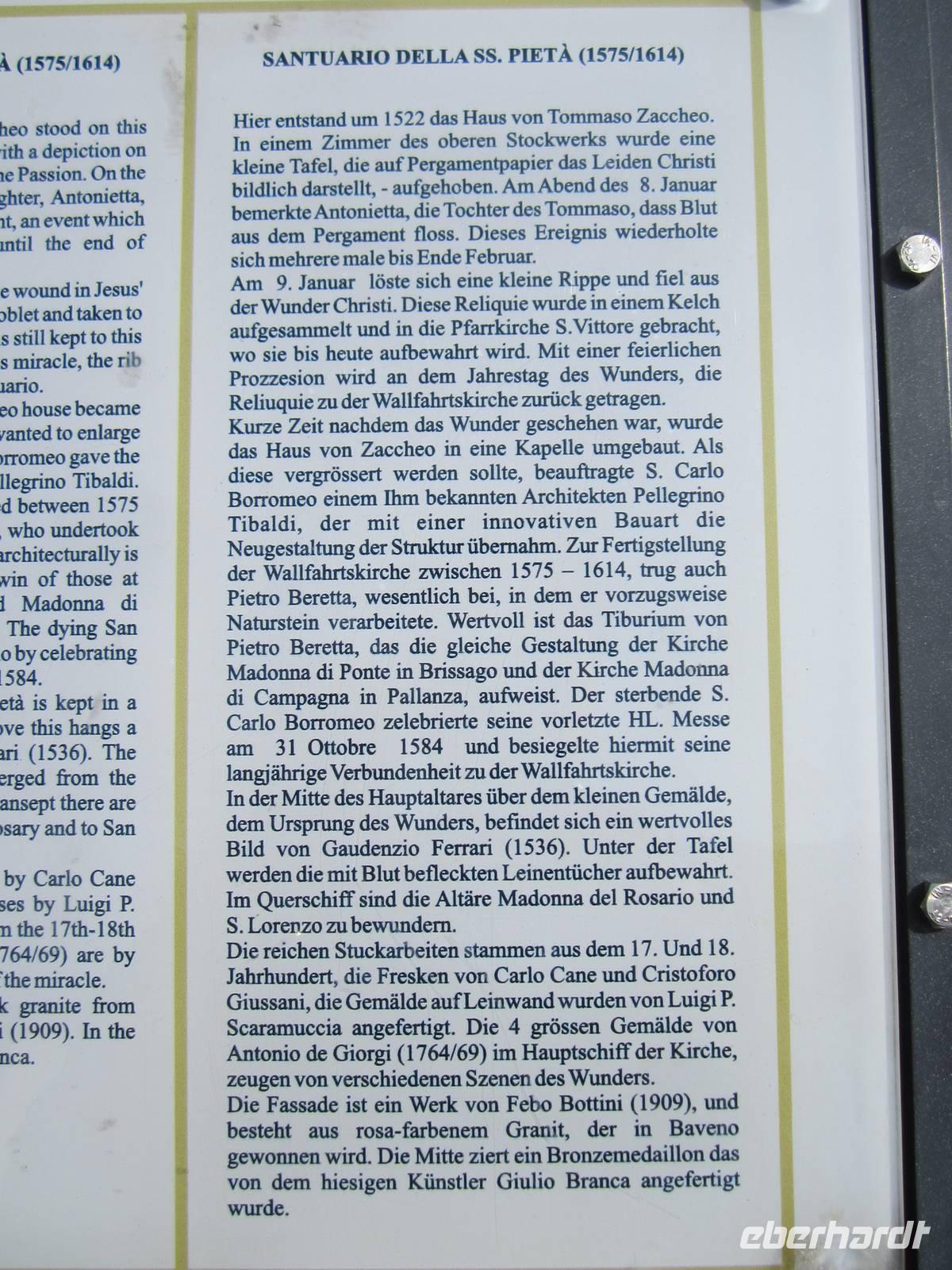 Mit der Standseilbahn geht es auf 355 m hoch. Nach Überlieferung hatte an dieser Stelle ein Franziskaner Mönch Bortolomeo 1480 eine Marienerscheinung. Nach jahrelanger Sanierung ist der Besuch der Wallfahrtskirche ein bleibendes Erlebnis. Die Fahrt zur Kirche lohnt sich schon, um den herrlichen Blick auf den Lago Maggiore zu haben.