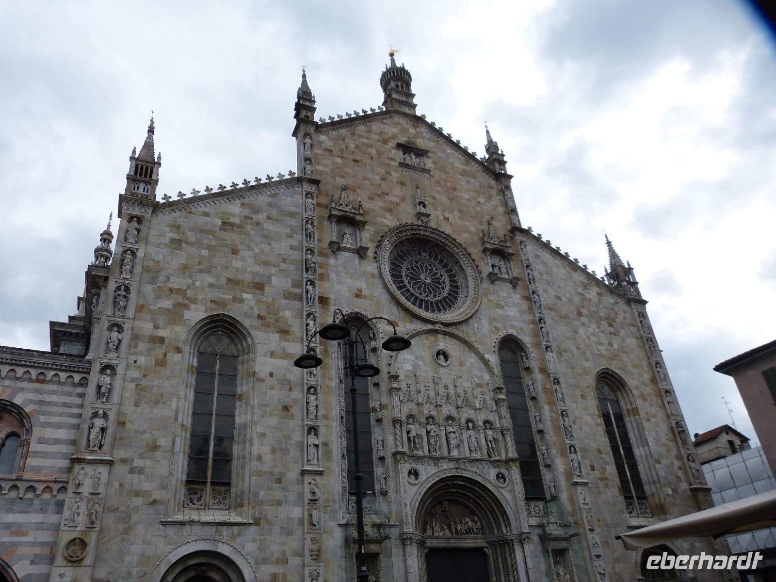 Nach dem reichlichen Frühstück fuhren wir heute an den Comer See. Zunächst am Luganer See entlang kamen wir bald in Menaggio, einem kleinen Ort am Comer See an. Von nun an ging es durch enge Gassen und unübersichtlichen Kurven unmittelbar am Comer See entlang. Leider nieselte es schon wieder, sodass wir die vielen Villen und schicken Häuser in denen viel Prominenz aus Politik sowie Film und Fernsehen wohnt nicht sehen konnten. Zum Glück waren zu diesem Zeitpunkt die Einheimischen und Touristen noch nicht auf der Straße. Wir kamen zügig in Como an.