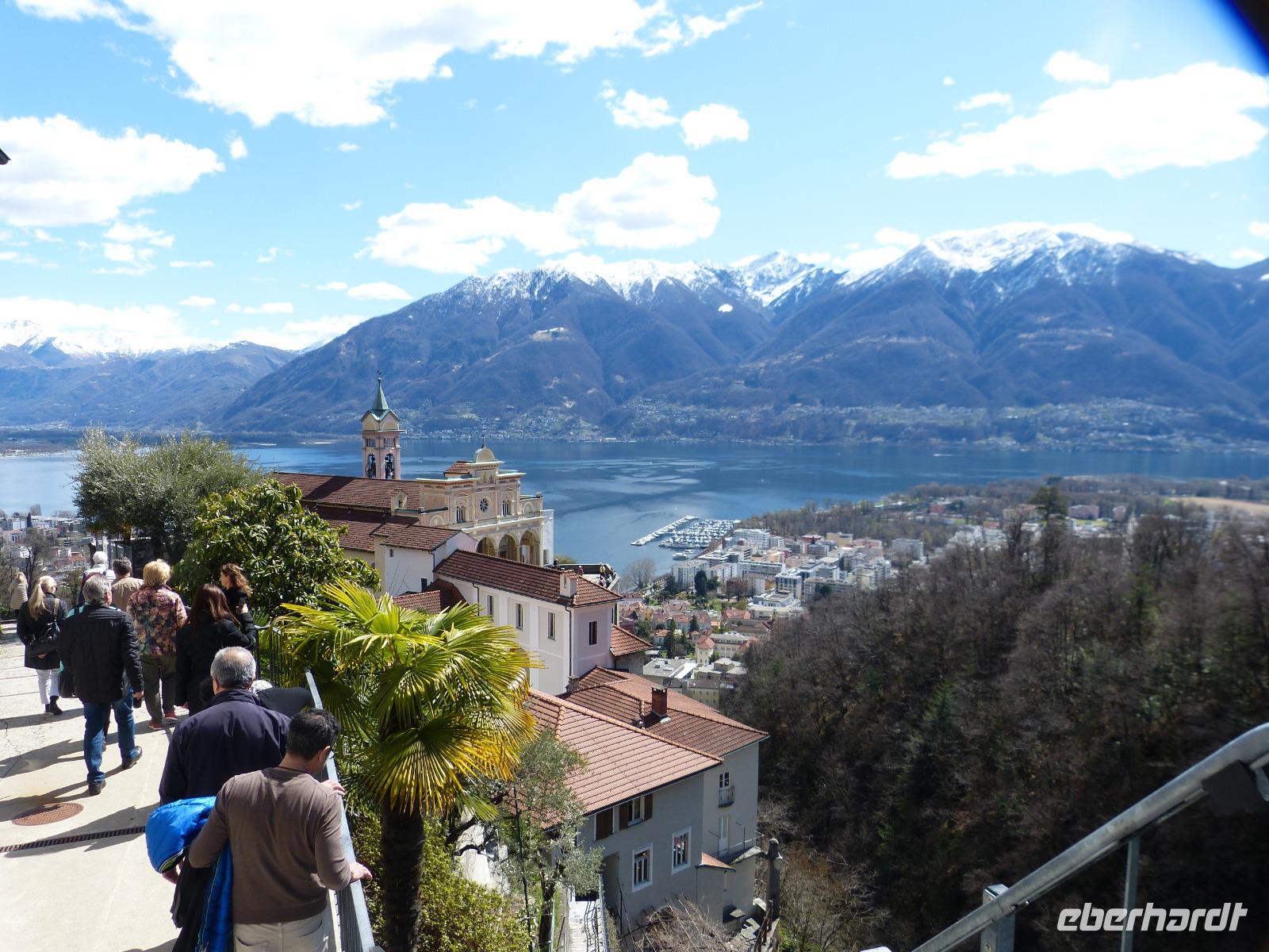 Im Tal angekommen fuhren wir nach Locarno. Hier unternahmen wir einen Ausflug zur Wallfahrtskirche Madonna del Sasso. Mit der Standseilbahn ging es auf 355 m hoch. Von dort hat man nicht nur einen herrlichen Blick auf den Lago Maggiore sondern auch einen wunderbaren Einblick und die Historie der Wallfahrtskirche. Wer noch Zeit hatte schlenderte zum Piazza Grande und stellte sich das jährlich stattfindende Filmfestival auf diesem Platz vor, natürlich bei einem schmackhaften original italienischem Eis.