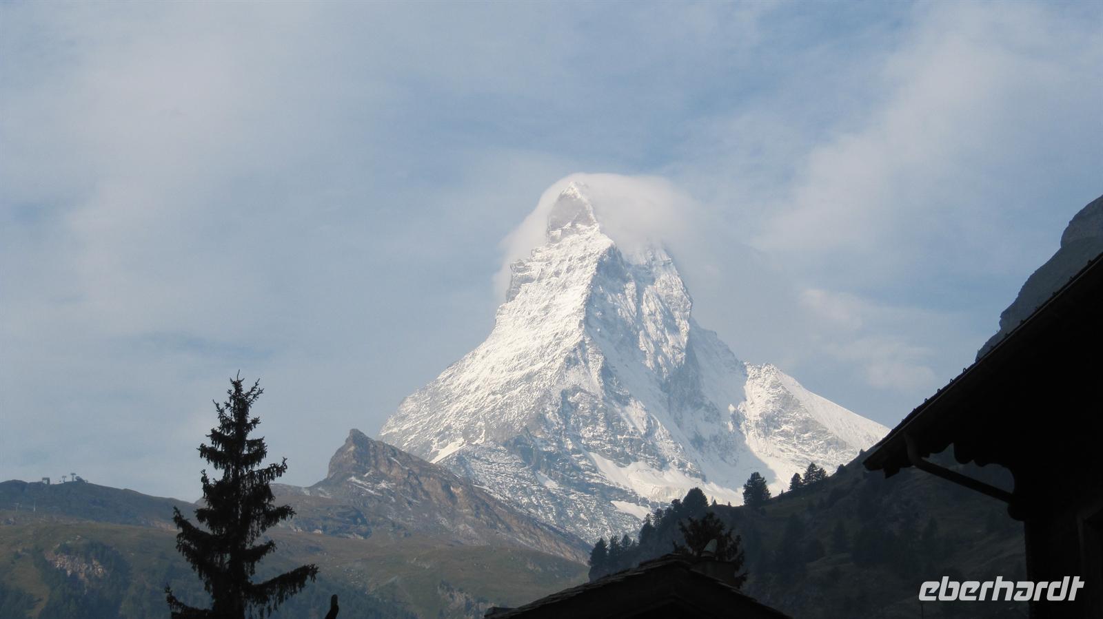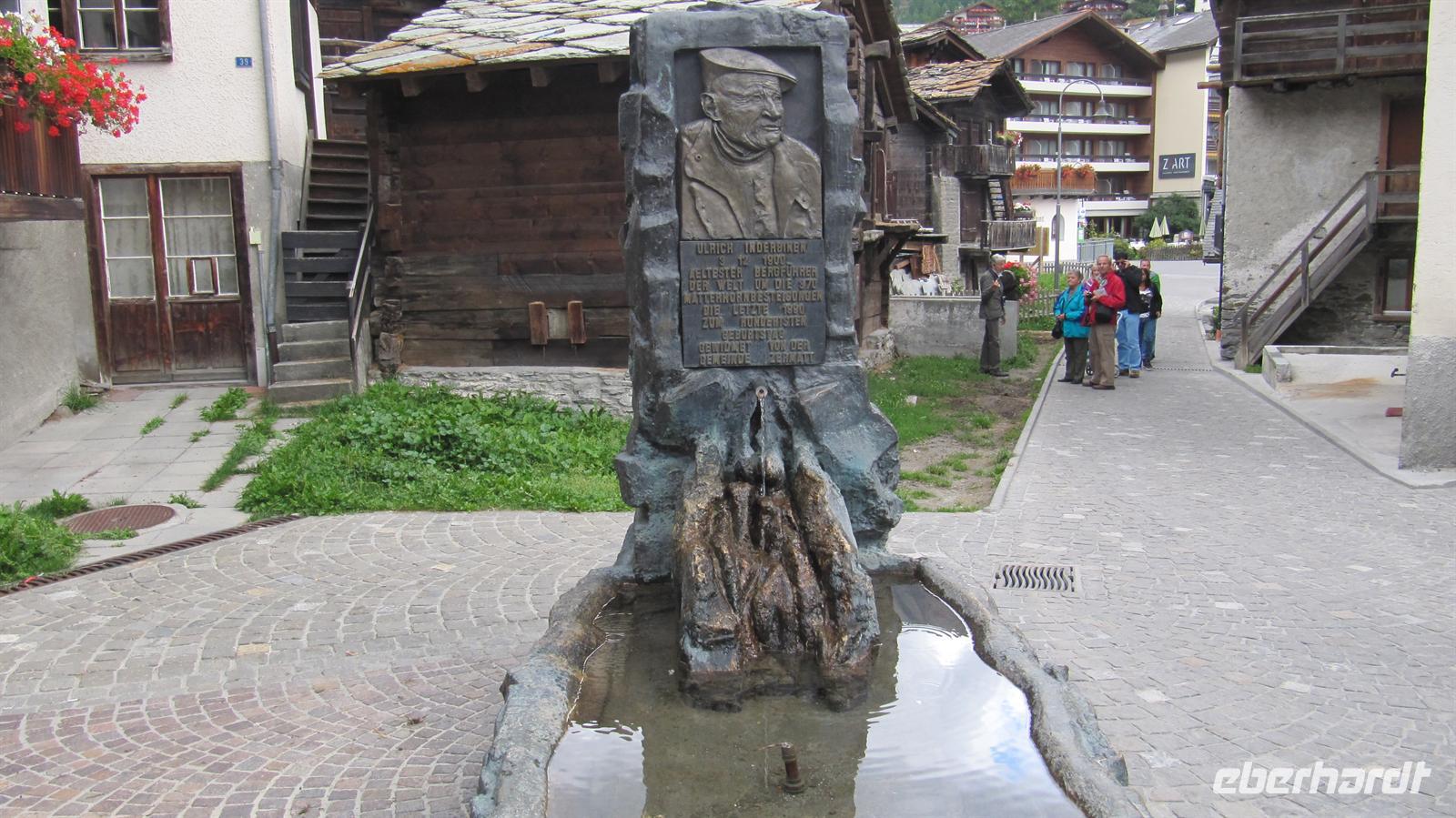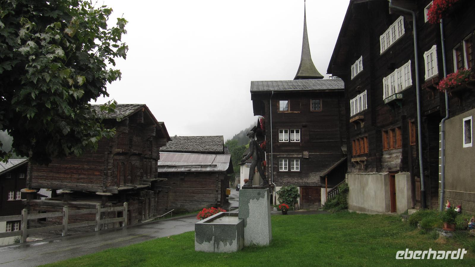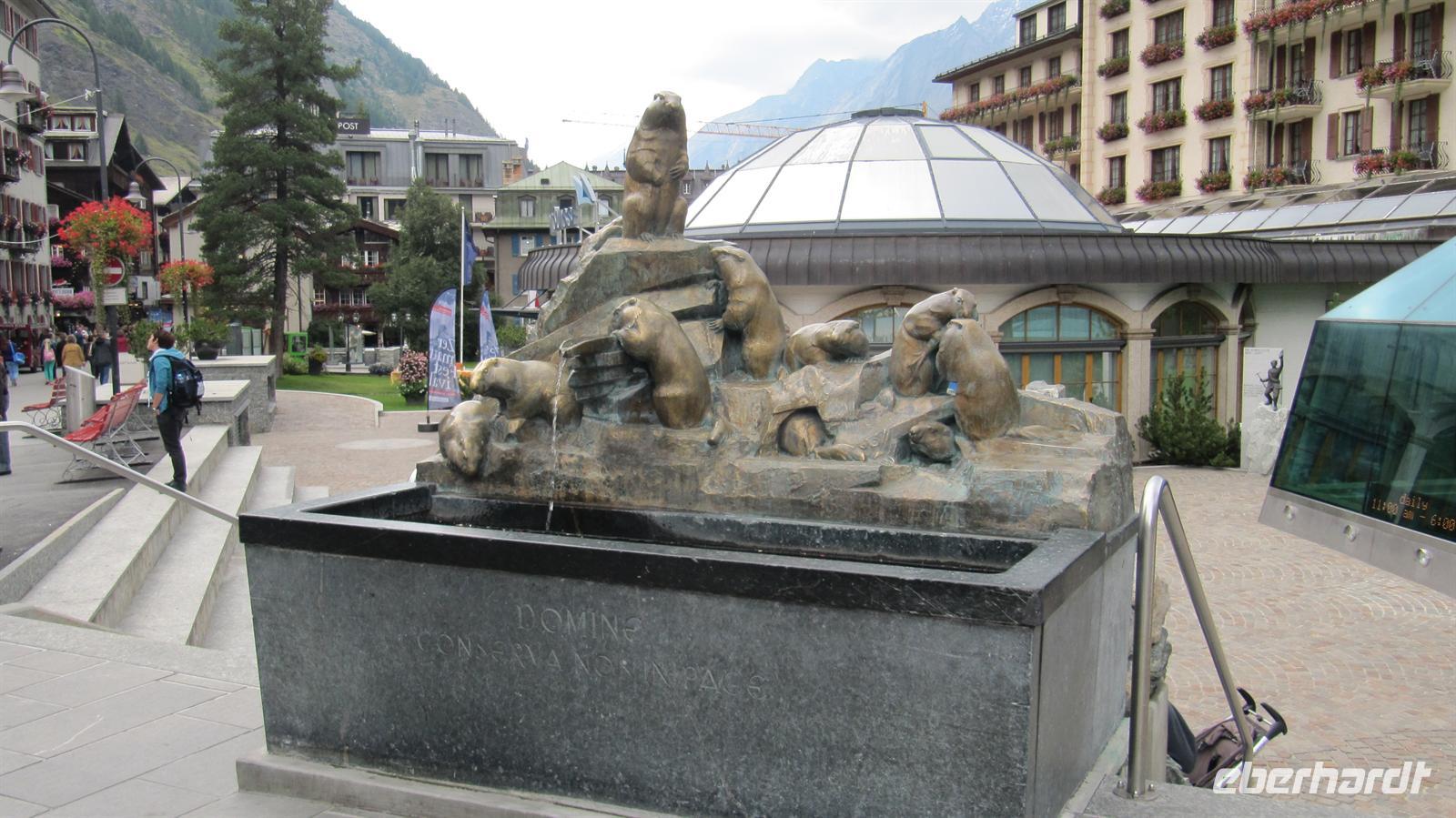 der Bergkirche wurde in den siebziger Jahren des 20. Jahrhunderts eine Felsenkirche in den Felsen gebaut. Diese besichtigten wir. Anschließend fuhren wir durch das Mattertal hinauf nach Täsch. Hier wurde unser Gepäck wieder umgeladen und mit dem Zug erreichten wir den berühmten Ferienort Zermatt am Fuße des Matterhorns. Leider verhüllte sich der Berg der Berge in Wolken. Nachdem wir unsere gemütlichen Zimmer im Hotel Perren bezogen hatten, spazierten wir gemeinsam durch Zermatt. Ich zeigte meinen Gästen das alte Zermatt mit den dunklen wettergegerbten Holzhäusern und Spychern. Wir sahen den Brunnen, der zu Ehren von Ullrich Inderbinen errichtet wurde. Ullrich Inderbinen war der älteste Bergführer der Welt und ist 104jährig 2004 verstorben. Er hatte das Matterhorn ca. 370 Mal bestiegen und letztmalig zu seinem neunzigsten Geburtstag. Danach besuchten wir die Englische Kirche und den Kirschplatz. Natürlich mussten wir die Murmeltiere am Murmeltierbrunnen streicheln. Die Legende sagt, dass man immer wieder nach Zermatt zurück kehrt, wenn man die Murmeltiere streichelt. Bei mir funktionierte es immer wieder. Die Geschichte Zermatts ist eng mit dem Matterhorn und seiner Erstbesteigung im Jahre 1865 verbunden. Sie trifft man immer wieder auf Suren dieser Bergbesteigung, ob in der Englischen Kirche, auf dem Friedhof oder am heutigen Hotel Monte Rosa. Nach unserem kleinen Rundgang erkundeten wir noch ganz individuell den berühmten Ort und hofften, dass sich uns das Matterhorn noch in seiner vollen Schönheit zeigt. Doch an diesem Nachmittag und Abend tat es uns diesen Gefallen nicht mehr.