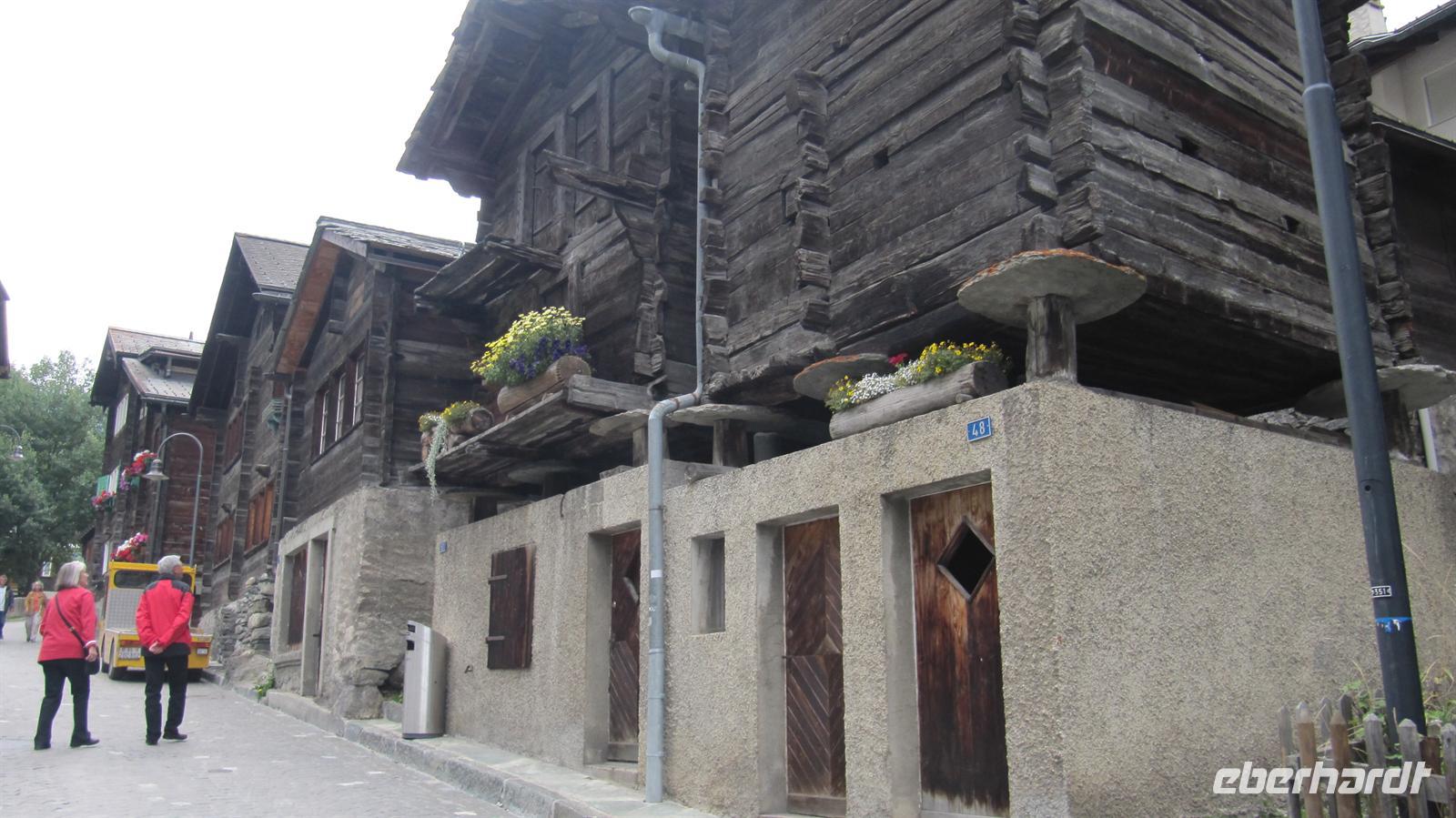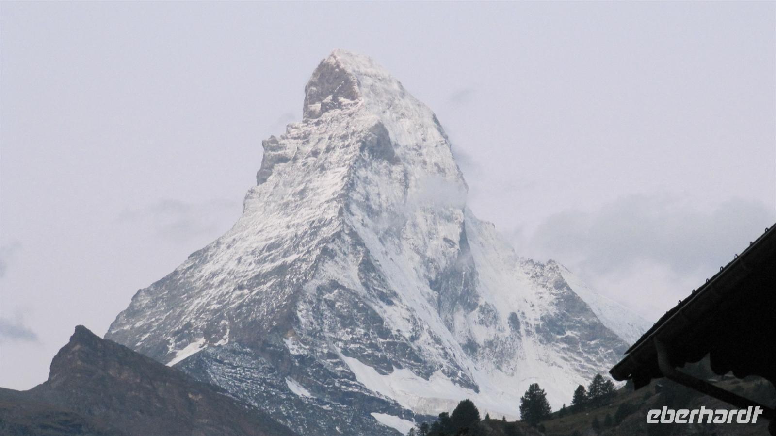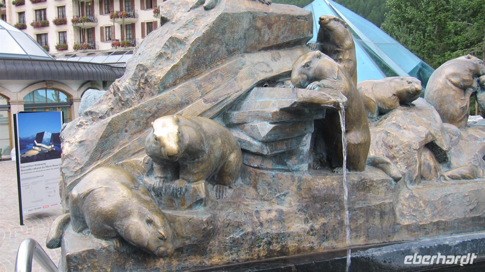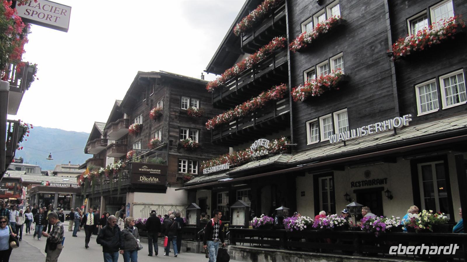 der Bergkirche wurde in den siebziger Jahren des 20. Jahrhunderts eine Felsenkirche in den Felsen gebaut. Diese besichtigten wir. Anschließend fuhren wir durch das Mattertal hinauf nach Täsch. Hier wurde unser Gepäck wieder umgeladen und mit dem Zug erreichten wir den berühmten Ferienort Zermatt am Fuße des Matterhorns. Leider verhüllte sich der Berg der Berge in Wolken. Nachdem wir unsere gemütlichen Zimmer im Hotel Perren bezogen hatten, spazierten wir gemeinsam durch Zermatt. Ich zeigte meinen Gästen das alte Zermatt mit den dunklen wettergegerbten Holzhäusern und Spychern. Wir sahen den Brunnen, der zu Ehren von Ullrich Inderbinen errichtet wurde. Ullrich Inderbinen war der älteste Bergführer der Welt und ist 104jährig 2004 verstorben. Er hatte das Matterhorn ca. 370 Mal bestiegen und letztmalig zu seinem neunzigsten Geburtstag. Danach besuchten wir die Englische Kirche und den Kirschplatz. Natürlich mussten wir die Murmeltiere am Murmeltierbrunnen streicheln. Die Legende sagt, dass man immer wieder nach Zermatt zurück kehrt, wenn man die Murmeltiere streichelt. Bei mir funktionierte es immer wieder. Die Geschichte Zermatts ist eng mit dem Matterhorn und seiner Erstbesteigung im Jahre 1865 verbunden. Sie trifft man immer wieder auf Suren dieser Bergbesteigung, ob in der Englischen Kirche, auf dem Friedhof oder am heutigen Hotel Monte Rosa. Nach unserem kleinen Rundgang erkundeten wir noch ganz individuell den berühmten Ort und hofften, dass sich uns das Matterhorn noch in seiner vollen Schönheit zeigt. Doch an diesem Nachmittag und Abend tat es uns diesen Gefallen nicht mehr.