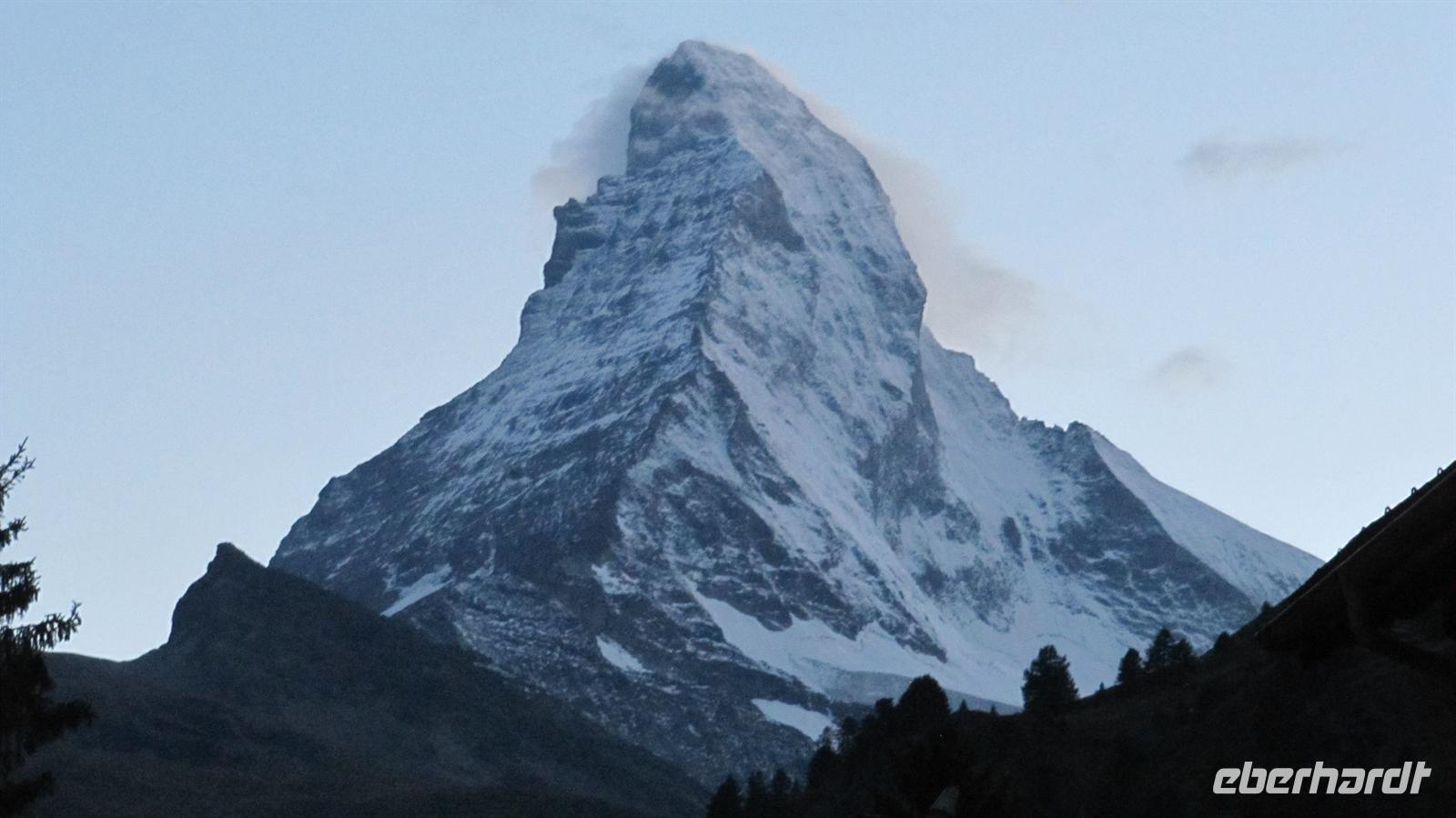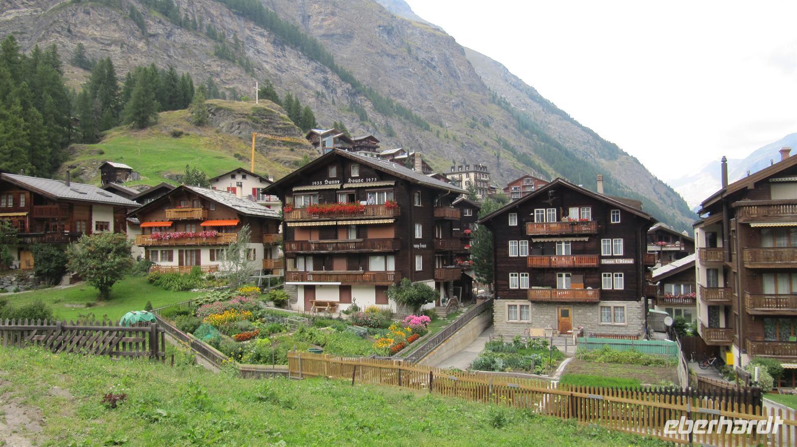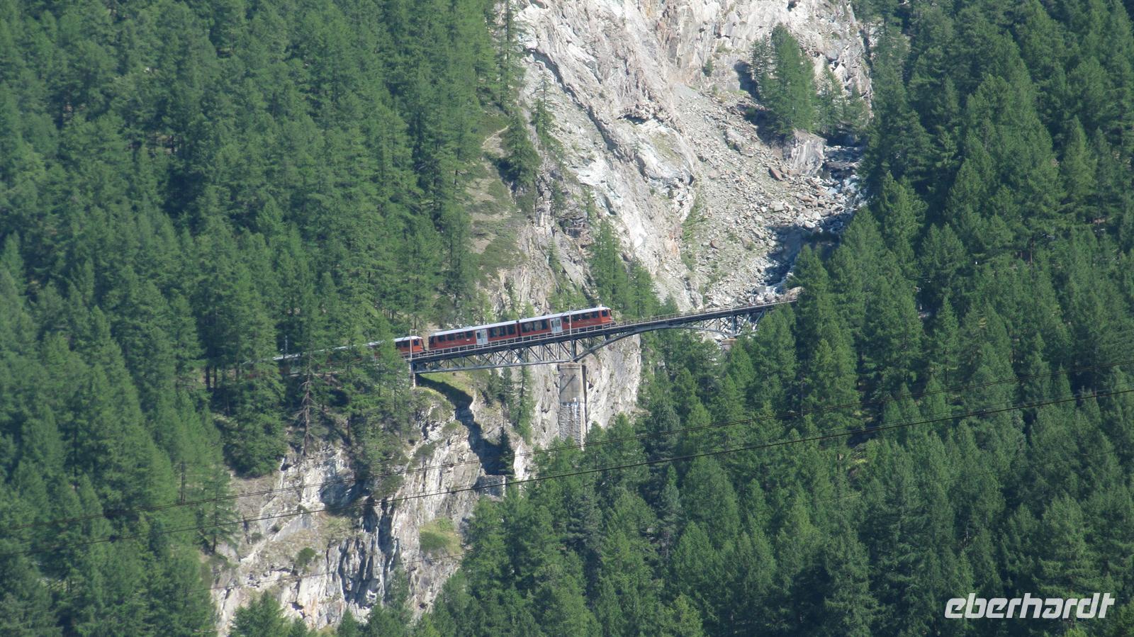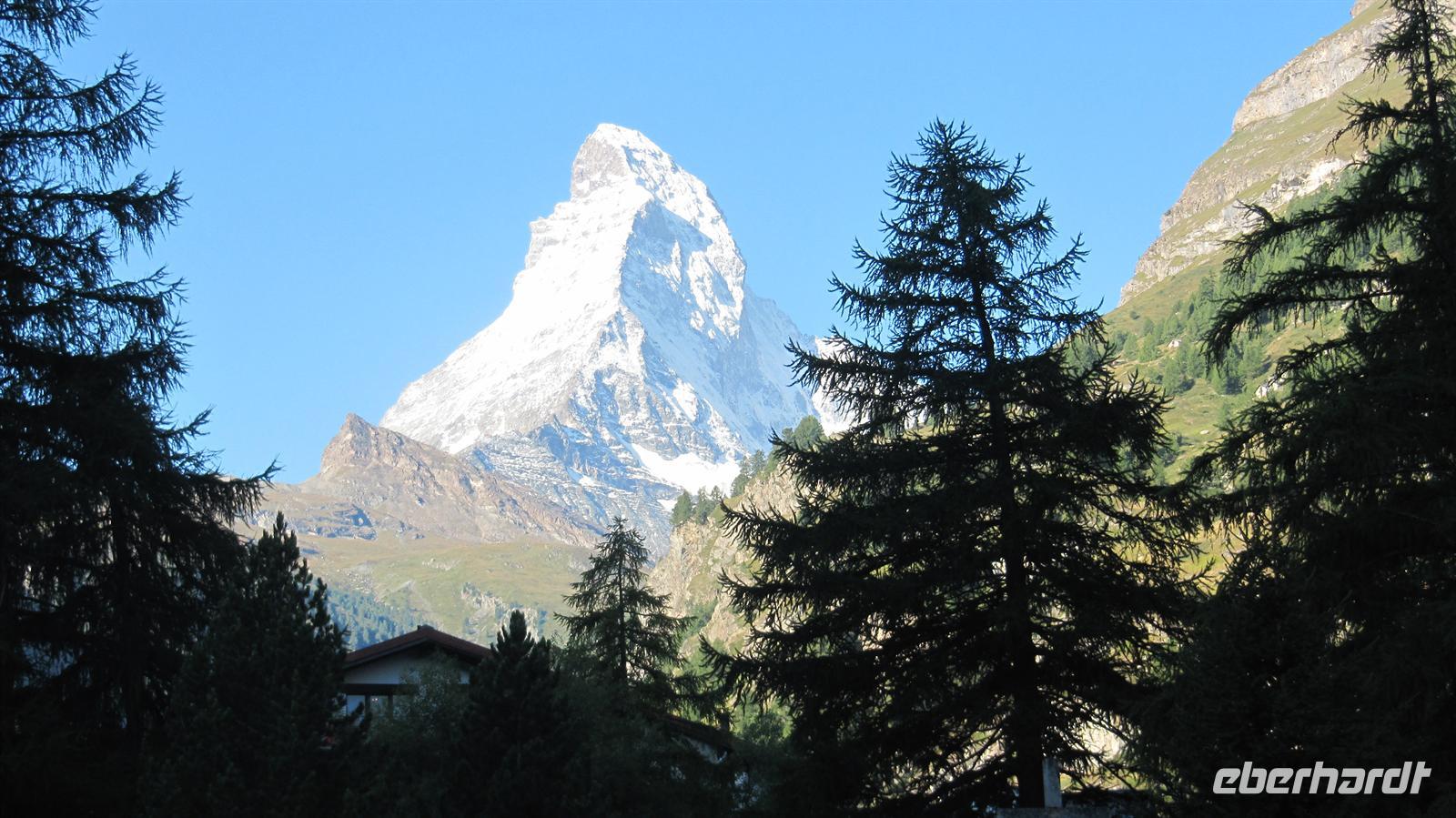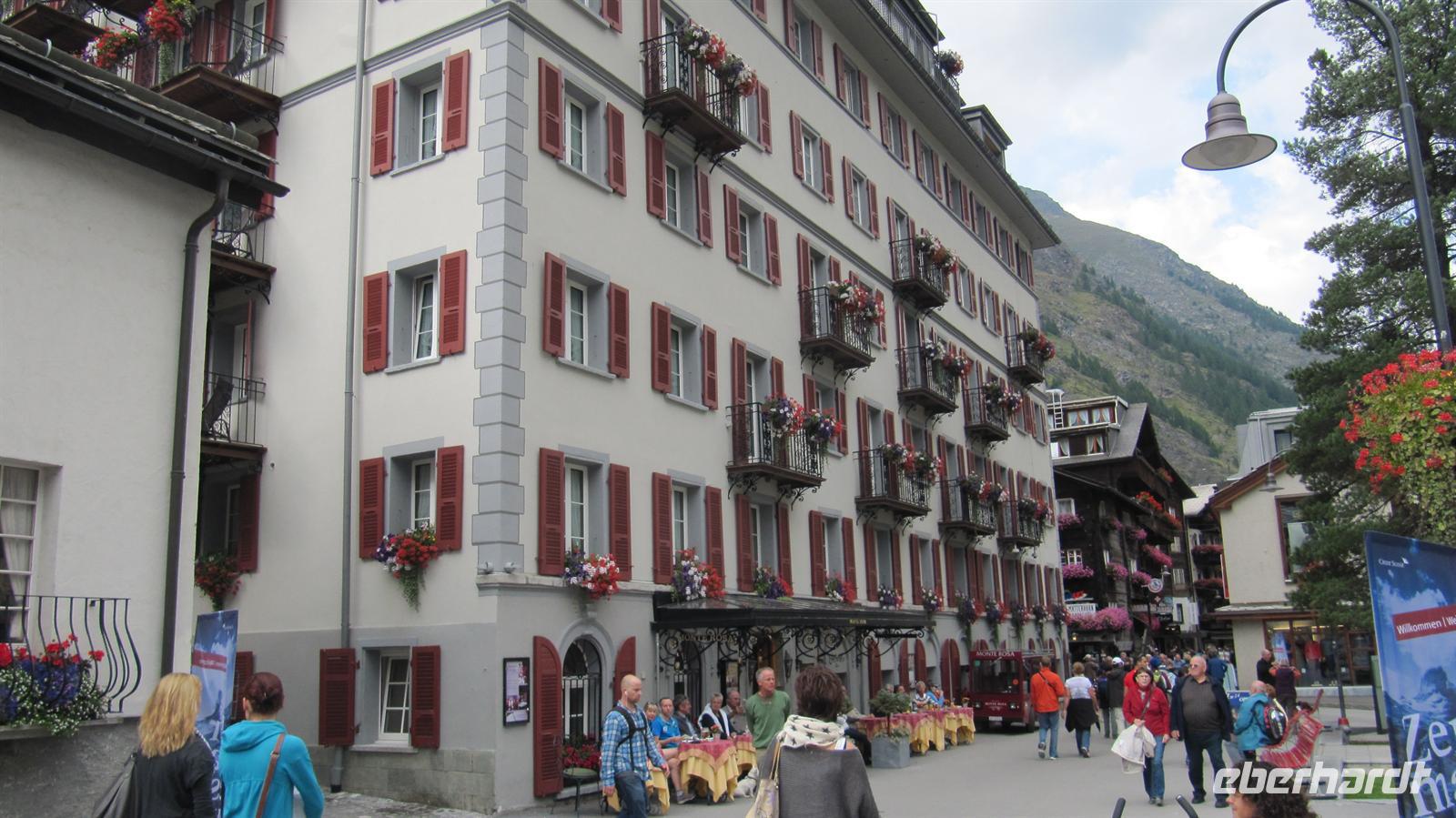 der Bergkirche wurde in den siebziger Jahren des 20. Jahrhunderts eine Felsenkirche in den Felsen gebaut. Diese besichtigten wir. Anschließend fuhren wir durch das Mattertal hinauf nach Täsch. Hier wurde unser Gepäck wieder umgeladen und mit dem Zug erreichten wir den berühmten Ferienort Zermatt am Fuße des Matterhorns. Leider verhüllte sich der Berg der Berge in Wolken. Nachdem wir unsere gemütlichen Zimmer im Hotel Perren bezogen hatten, spazierten wir gemeinsam durch Zermatt. Ich zeigte meinen Gästen das alte Zermatt mit den dunklen wettergegerbten Holzhäusern und Spychern. Wir sahen den Brunnen, der zu Ehren von Ullrich Inderbinen errichtet wurde. Ullrich Inderbinen war der älteste Bergführer der Welt und ist 104jährig 2004 verstorben. Er hatte das Matterhorn ca. 370 Mal bestiegen und letztmalig zu seinem neunzigsten Geburtstag. Danach besuchten wir die Englische Kirche und den Kirschplatz. Natürlich mussten wir die Murmeltiere am Murmeltierbrunnen streicheln. Die Legende sagt, dass man immer wieder nach Zermatt zurück kehrt, wenn man die Murmeltiere streichelt. Bei mir funktionierte es immer wieder. Die Geschichte Zermatts ist eng mit dem Matterhorn und seiner Erstbesteigung im Jahre 1865 verbunden. Sie trifft man immer wieder auf Suren dieser Bergbesteigung, ob in der Englischen Kirche, auf dem Friedhof oder am heutigen Hotel Monte Rosa. Nach unserem kleinen Rundgang erkundeten wir noch ganz individuell den berühmten Ort und hofften, dass sich uns das Matterhorn noch in seiner vollen Schönheit zeigt. Doch an diesem Nachmittag und Abend tat es uns diesen Gefallen nicht mehr.