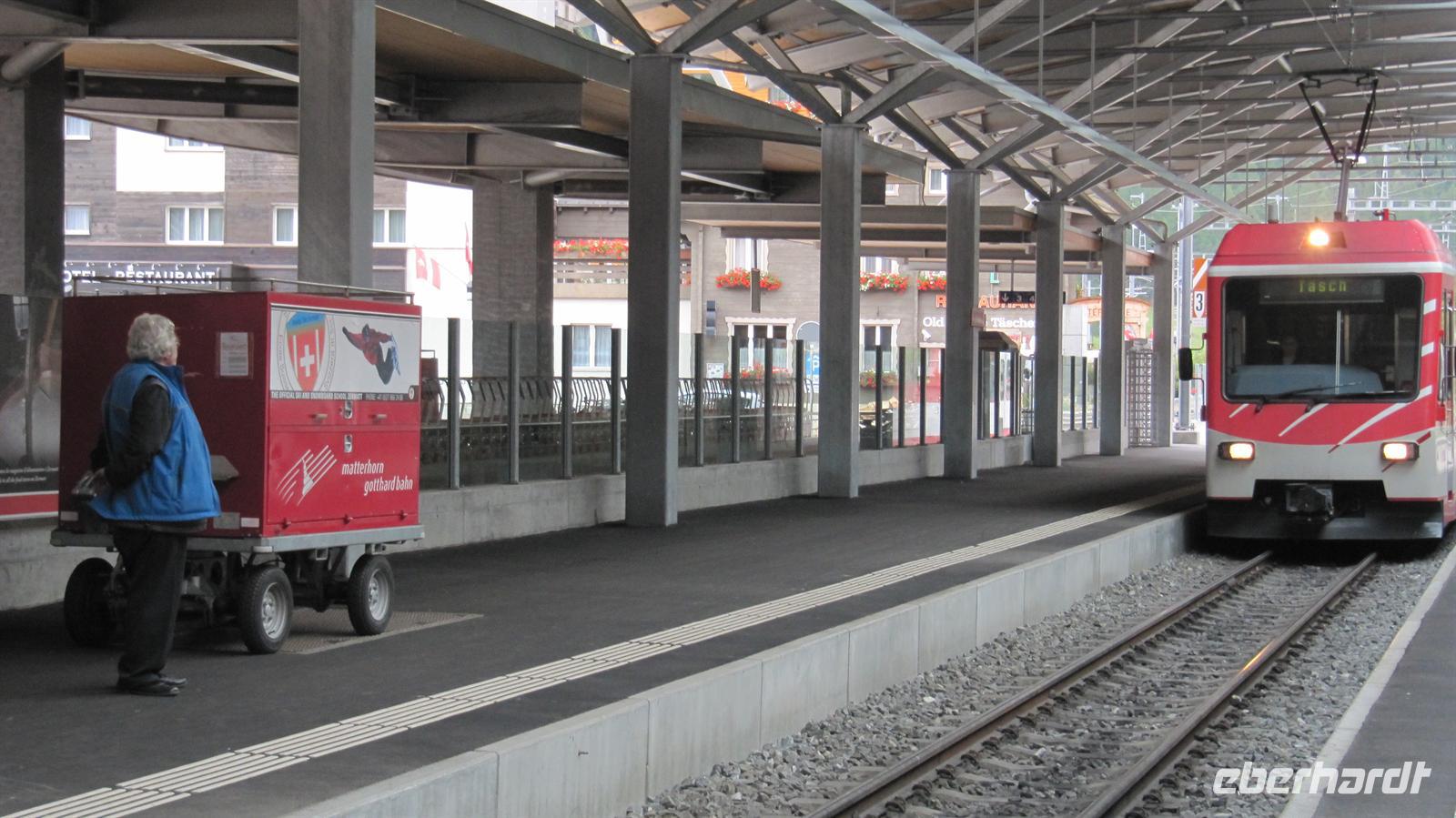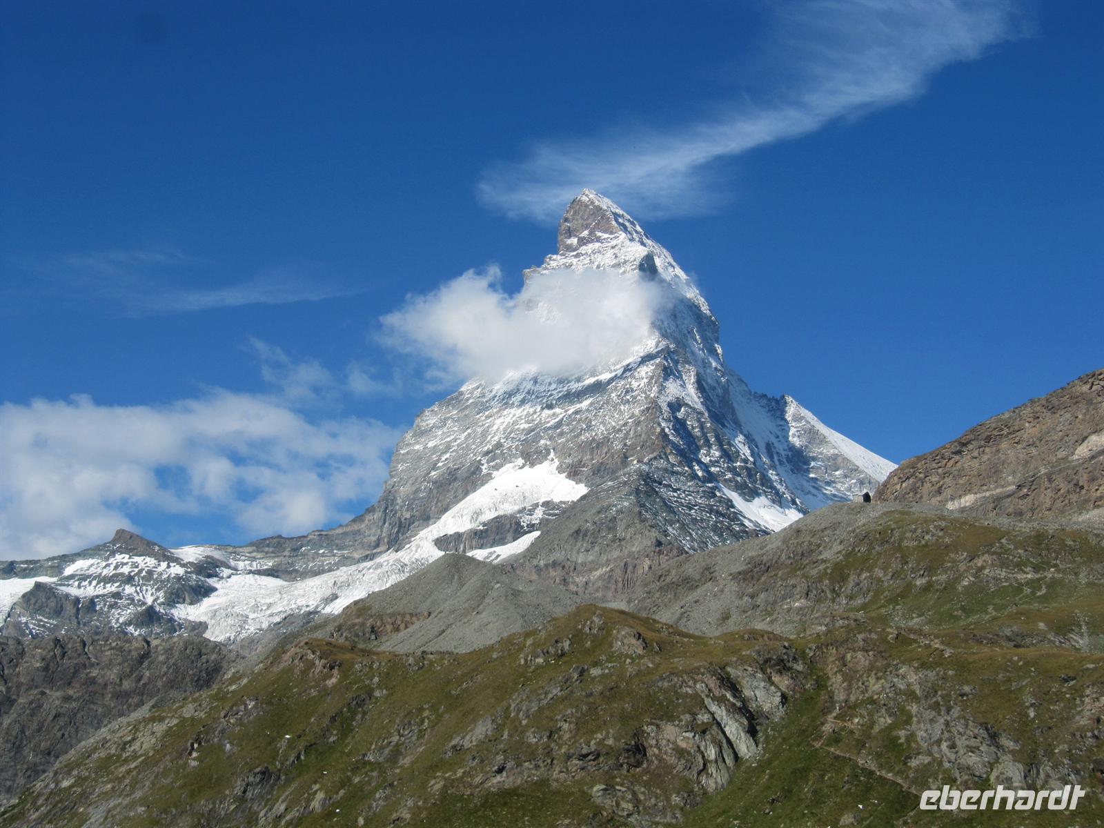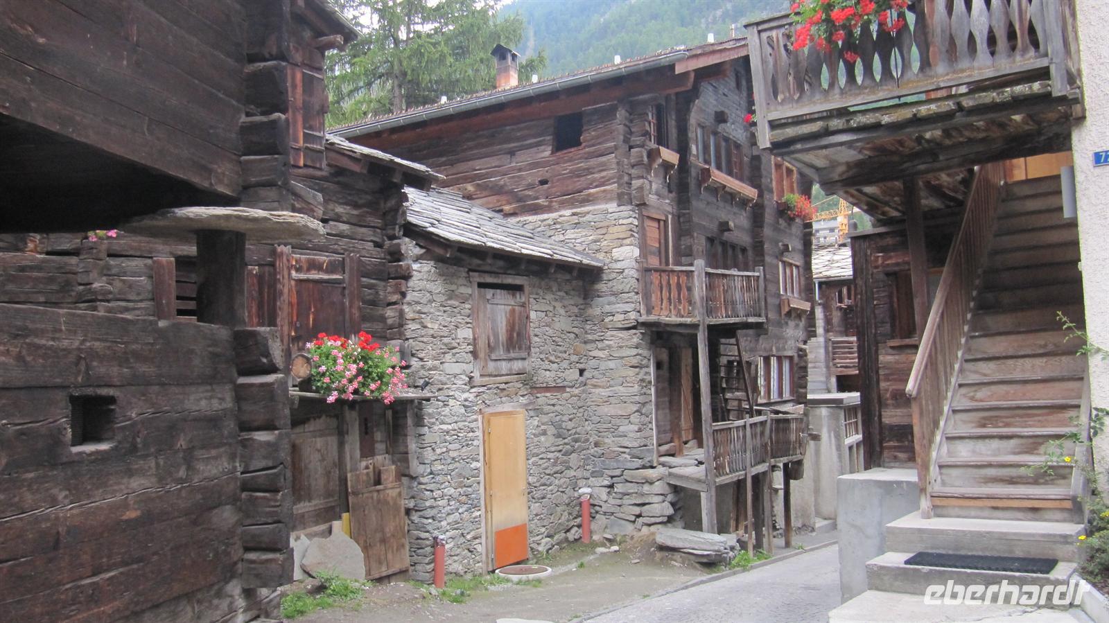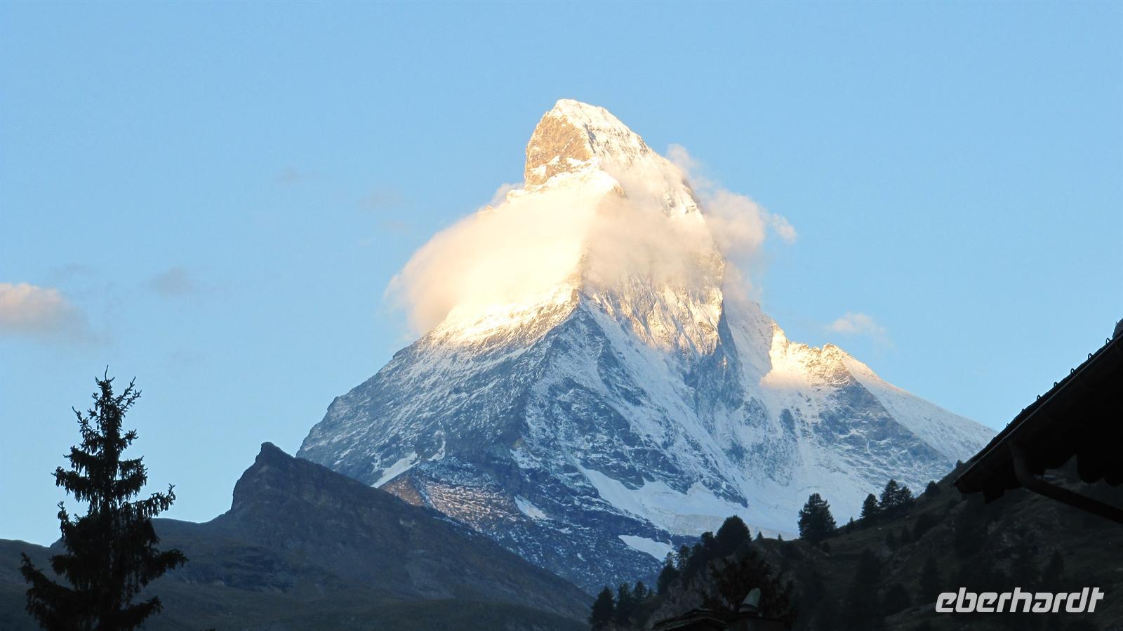 der Bergkirche wurde in den siebziger Jahren des 20. Jahrhunderts eine Felsenkirche in den Felsen gebaut. Diese besichtigten wir. Anschließend fuhren wir durch das Mattertal hinauf nach Täsch. Hier wurde unser Gepäck wieder umgeladen und mit dem Zug erreichten wir den berühmten Ferienort Zermatt am Fuße des Matterhorns. Leider verhüllte sich der Berg der Berge in Wolken. Nachdem wir unsere gemütlichen Zimmer im Hotel Perren bezogen hatten, spazierten wir gemeinsam durch Zermatt. Ich zeigte meinen Gästen das alte Zermatt mit den dunklen wettergegerbten Holzhäusern und Spychern. Wir sahen den Brunnen, der zu Ehren von Ullrich Inderbinen errichtet wurde. Ullrich Inderbinen war der älteste Bergführer der Welt und ist 104jährig 2004 verstorben. Er hatte das Matterhorn ca. 370 Mal bestiegen und letztmalig zu seinem neunzigsten Geburtstag. Danach besuchten wir die Englische Kirche und den Kirschplatz. Natürlich mussten wir die Murmeltiere am Murmeltierbrunnen streicheln. Die Legende sagt, dass man immer wieder nach Zermatt zurück kehrt, wenn man die Murmeltiere streichelt. Bei mir funktionierte es immer wieder. Die Geschichte Zermatts ist eng mit dem Matterhorn und seiner Erstbesteigung im Jahre 1865 verbunden. Sie trifft man immer wieder auf Suren dieser Bergbesteigung, ob in der Englischen Kirche, auf dem Friedhof oder am heutigen Hotel Monte Rosa. Nach unserem kleinen Rundgang erkundeten wir noch ganz individuell den berühmten Ort und hofften, dass sich uns das Matterhorn noch in seiner vollen Schönheit zeigt. Doch an diesem Nachmittag und Abend tat es uns diesen Gefallen nicht mehr.