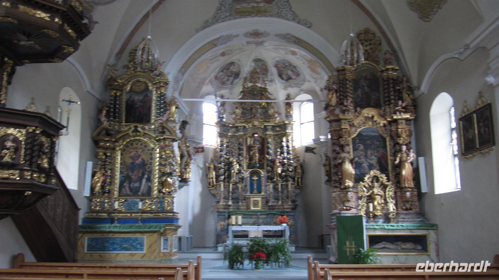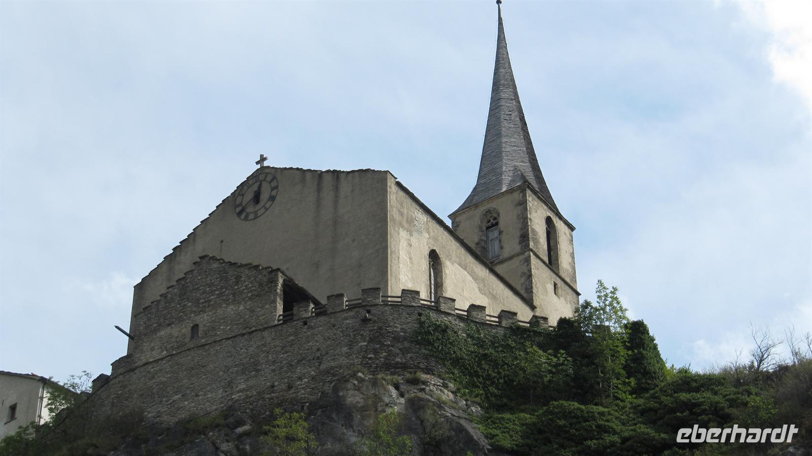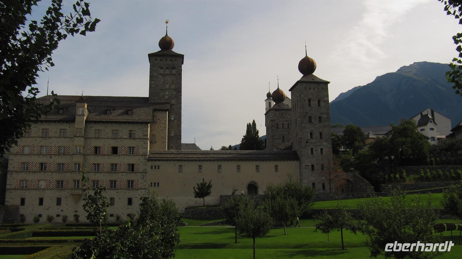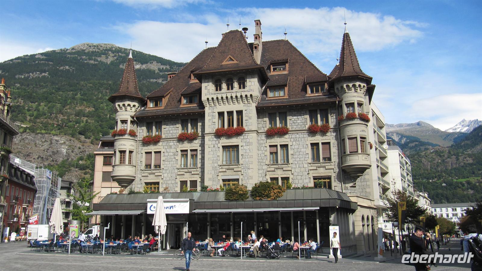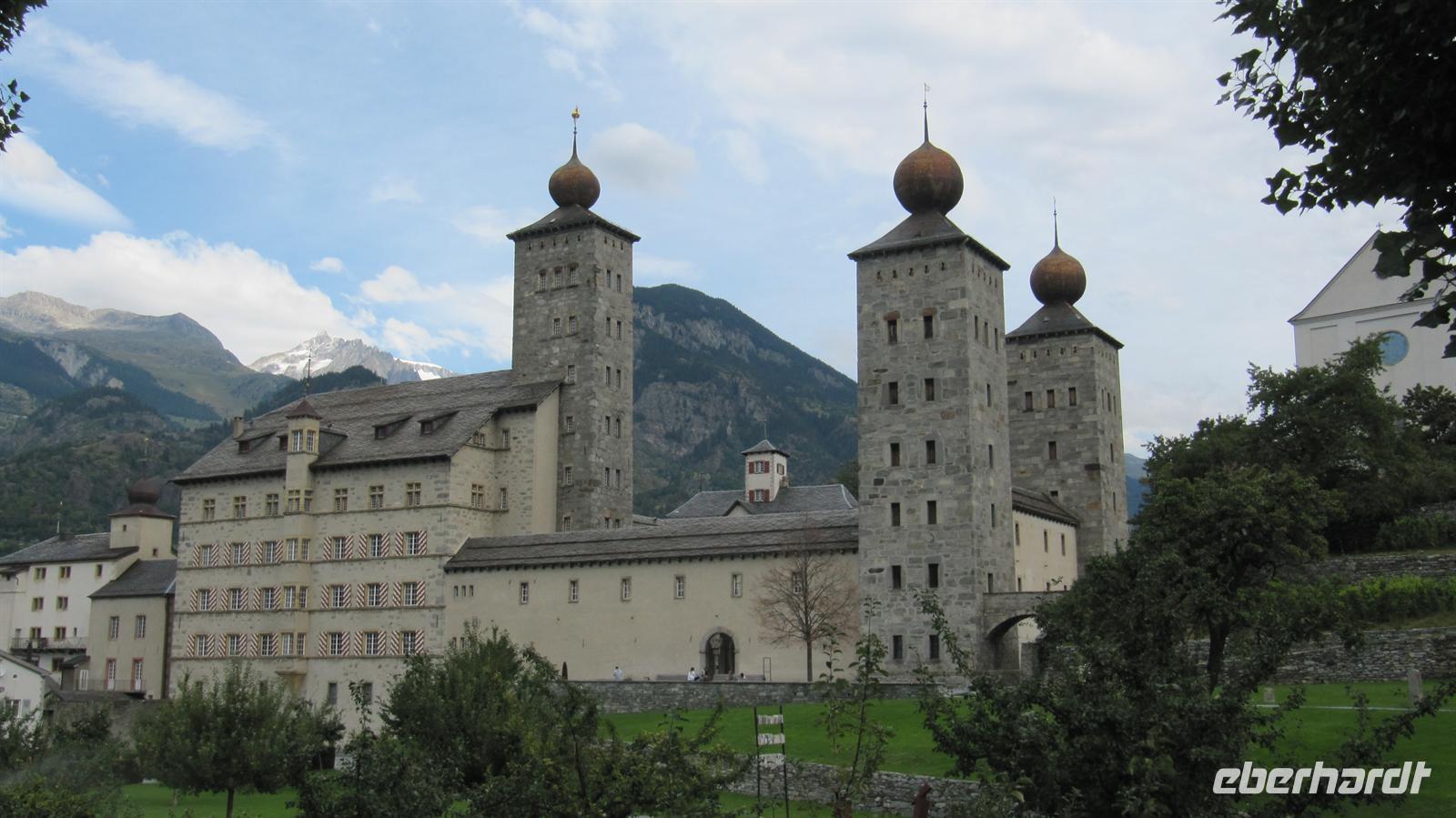 Am Morgen genossen wir nochmals die einmalige Ruhe und die wunderschöne Aussicht auf der Riederalp in die Berge. Es hieß heute Abschied nehmen von der Alp und wir fuhren mit der Seilbahn hinab ins Rhônetal. Alf, unser Chauffeur hatten bereits das Gepäck verstaut und so starten wir in Richtung Brig, dem Hauptort im Oberwallis und wichtigem Verkehrsknotenpunkt. Die Stadt wird durch das Stockalperschloss geprägt. Kasper Joder Stockalper herrschte im 17. Jahrhundert über die Stadt und die Region. Er wurde auch „Fugger der Alpen“ genannt, weil er mit allem handelte, was sich kaufen und erkaufen ließ. Ihm ist der der Seidenhandel über den Simplonpass und der Salzhandel zu verdanken. Die Säumerpfade ließ Stockalper ausbauen. Mit dem Stockalperschloss setzte er sich und der Stadt ein Denkmal. Die drei markanten Zwiebeltürme, benannt nach den heiligen drei Königen Kaspar, Melchior und Balthasar, sind weithin zu sehen. Wir spazierten durch die Alpenstadt bevor wir unsere Reise fortsetzten. Diese führte uns zunächst nach Raron. Hier befindet sich hoch auf einem Felsen eine Bergkirche aus dem 16. Jahrhundert. An der Südwand der Kirche ist der deutsche Dichter Rainer Maria Rilke begraben. Er lebte lange Jahre im Wallis und wollte hier auch seine letzte Ruhe finden. Unterhalb