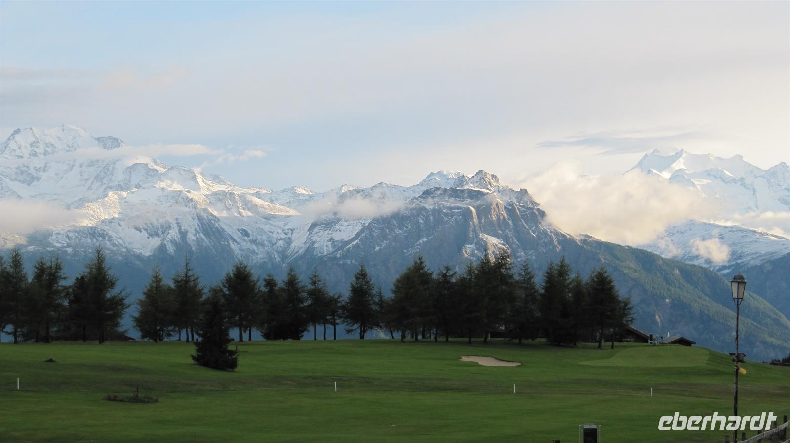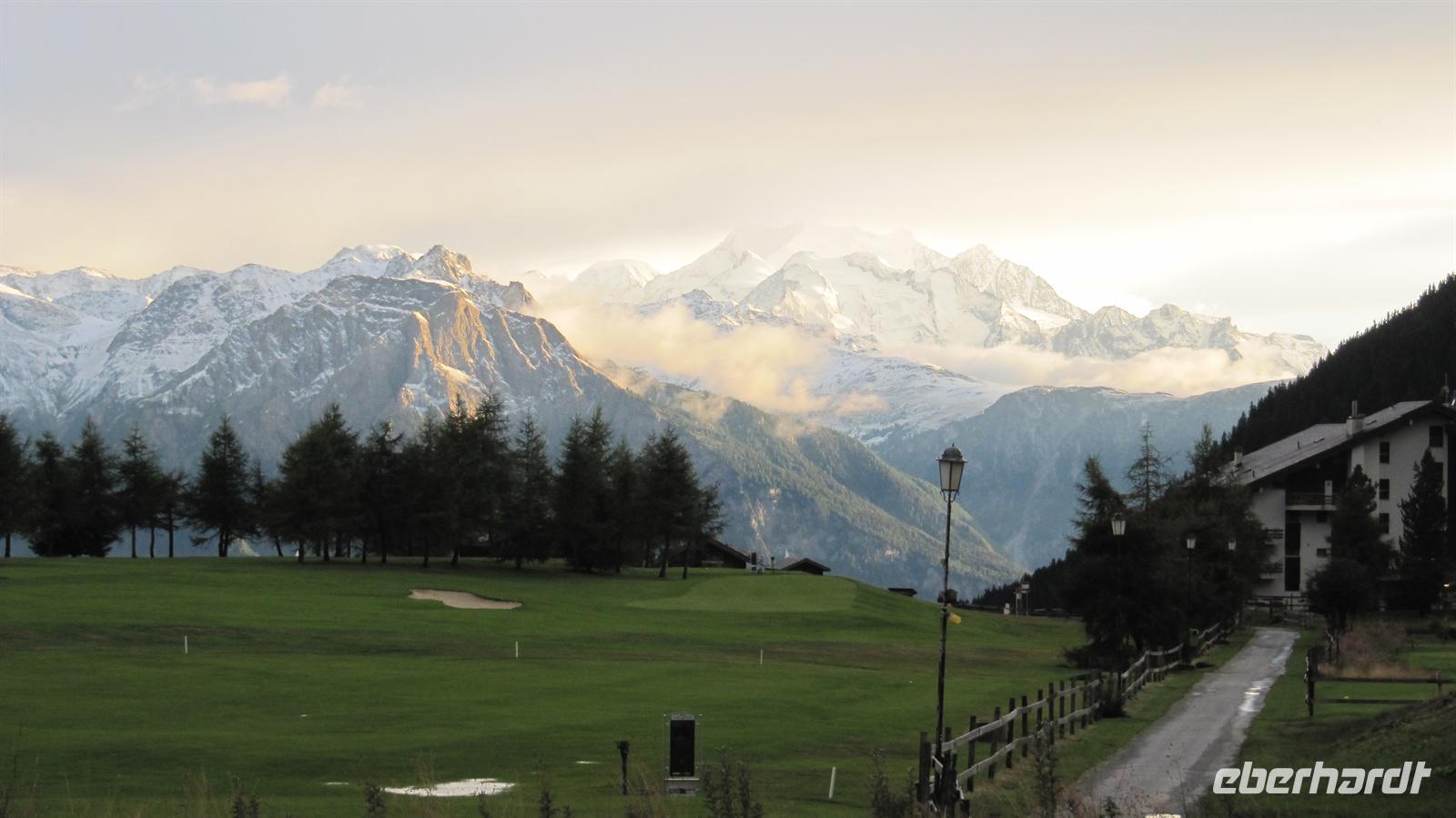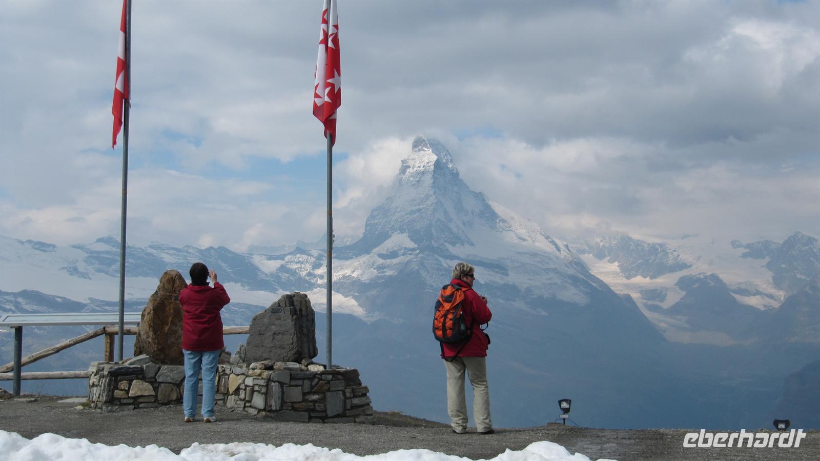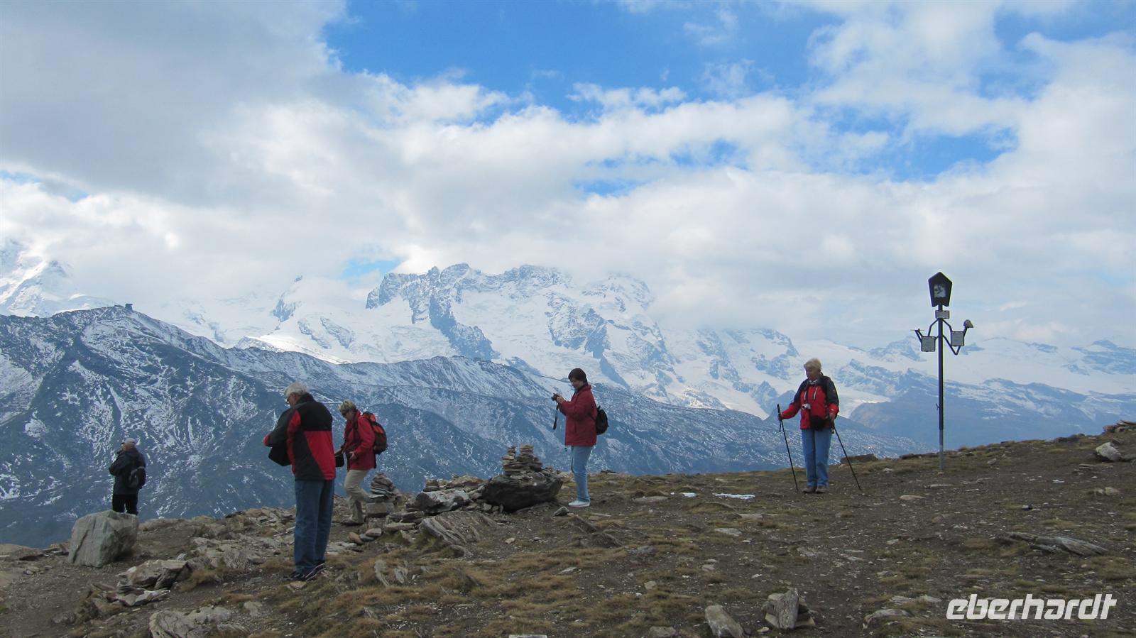 schneebedeckten Berge von der Duforspitze über die Monte Rosa Gruppe, das Matterhorn bis hin zum Weisshorn. Auch wenn sich die Berge ab und zu in Wolken hüllten, so war es ein beeindruckendes Naturschauspiel, an dem wir uns gar nicht satt sehen konnten. Wir verweilten eine ganze Zeit auf dem Gipfel bevor wir uns trennten. Einige Gäste fuhren den gesamten Weg wieder mit den Bergbahnen ist Tal und ein anderer Teil nutzte die Zeit zu verschiedensten Wanderungen. Mit einer kleinen Gruppe fuhr ich zur Station Blauherd zurück und wir wanderten auf dem Blumenweg nach Sunnegga. Der Weg führte durch Wiesen und bot uns immer wieder tolle Blicke auf das Matterhorn und die umliegenden Berge. Entlang des Weges waren Tafeln aufgestellt, auf denen die Alpenpflanzen erklärt werden. Unterwegs legten wir im kleinen Weiler Tufteren noch eine Rast ein. Auf Sunnegga angekommen, gönnten wir uns eine heiße Schokolade auf der herrlichen Aussichtsterrasse und genossen nochmals die Aussicht. Individuell kehrten wir mit der Standseilbahn nach Zermatt zurück. Den Nachmittag gestaltete dann jeder nach seinen Wünschen. Am Abend trafen wir uns alle zum Abendessen und tauschten unsere Erlebnisse vom Tag aus.