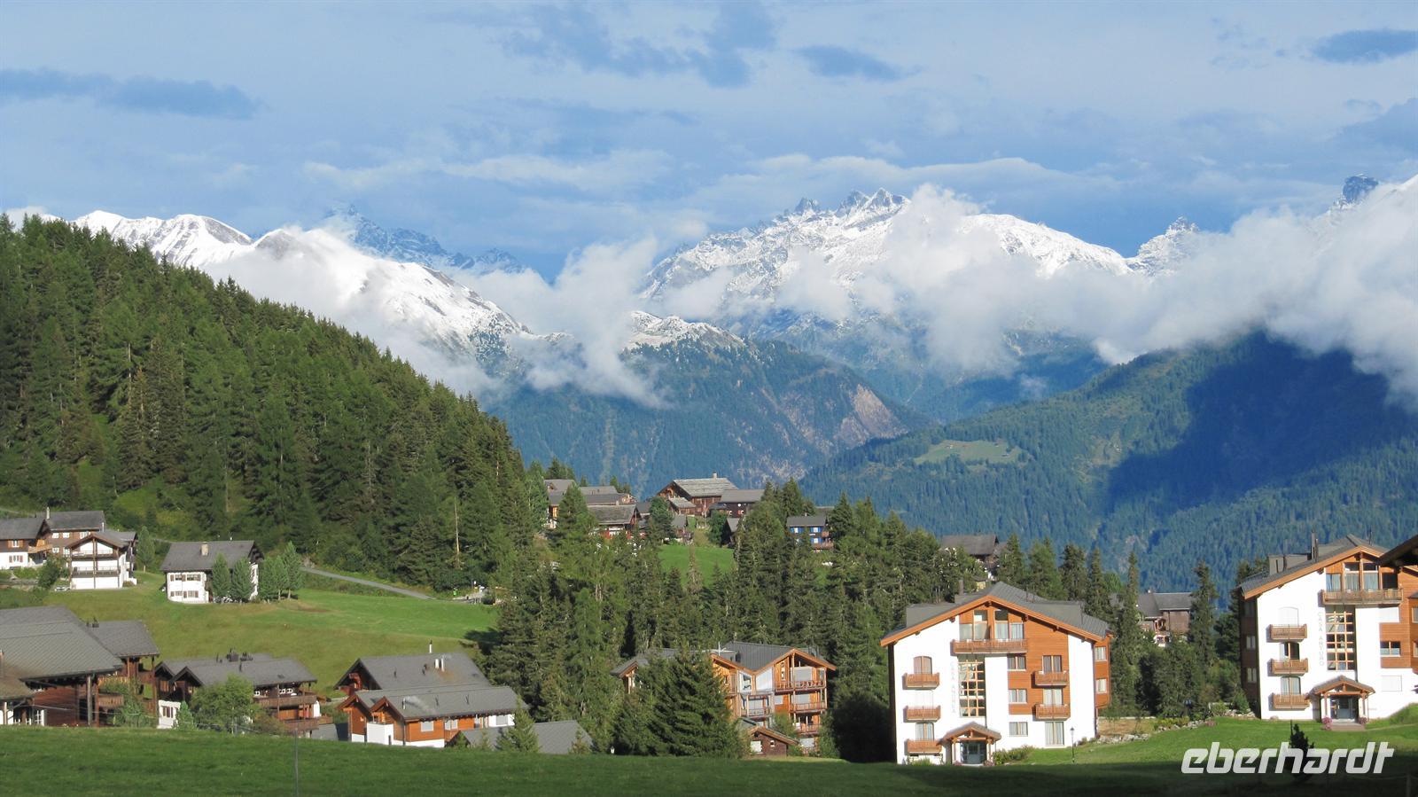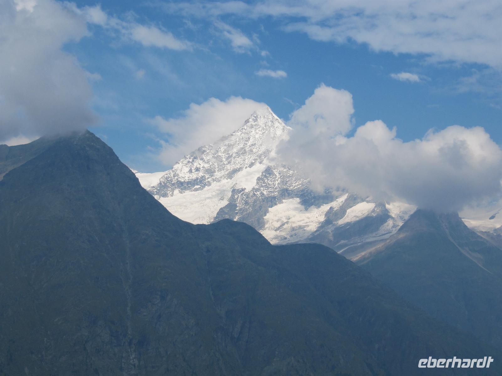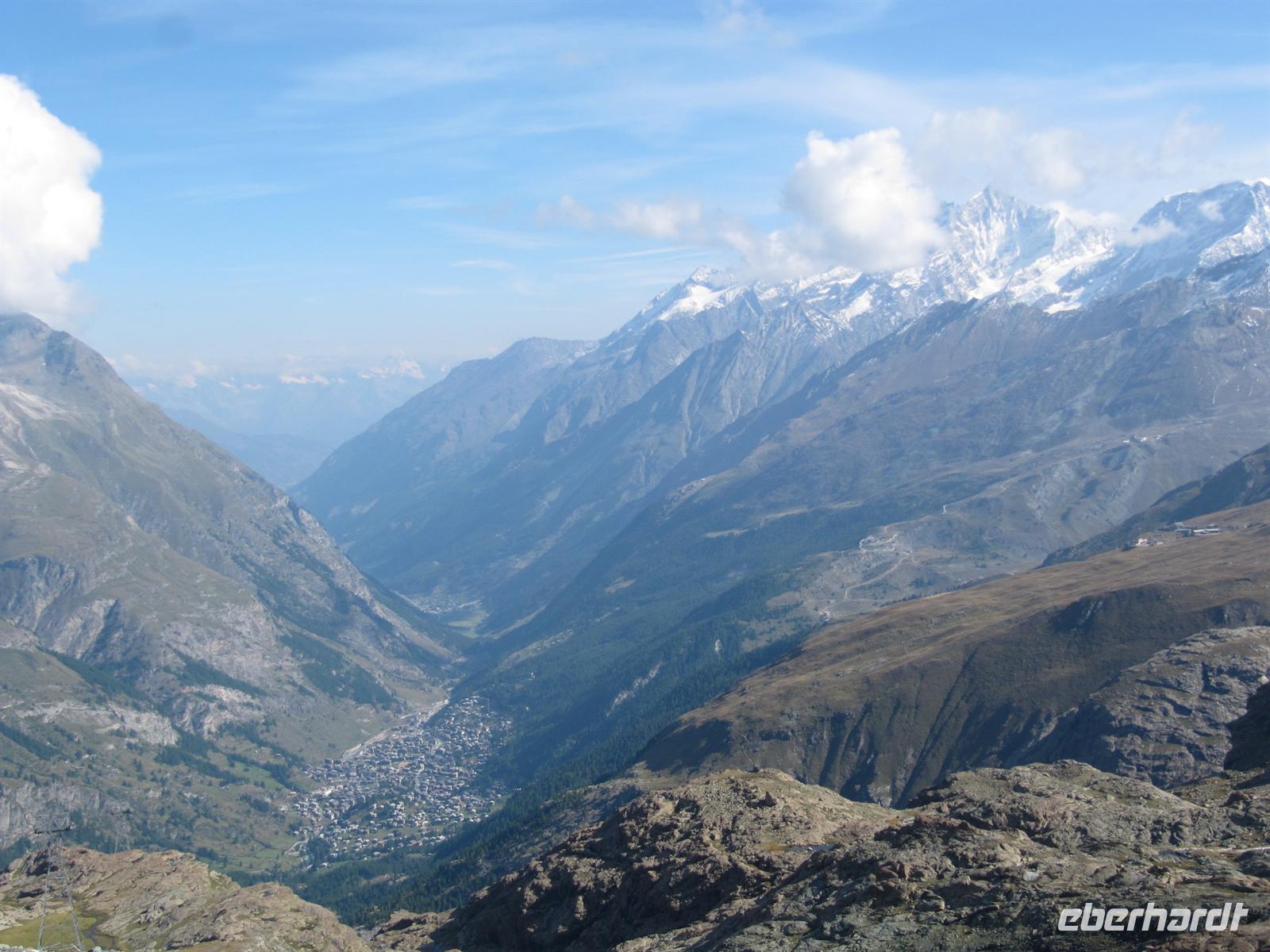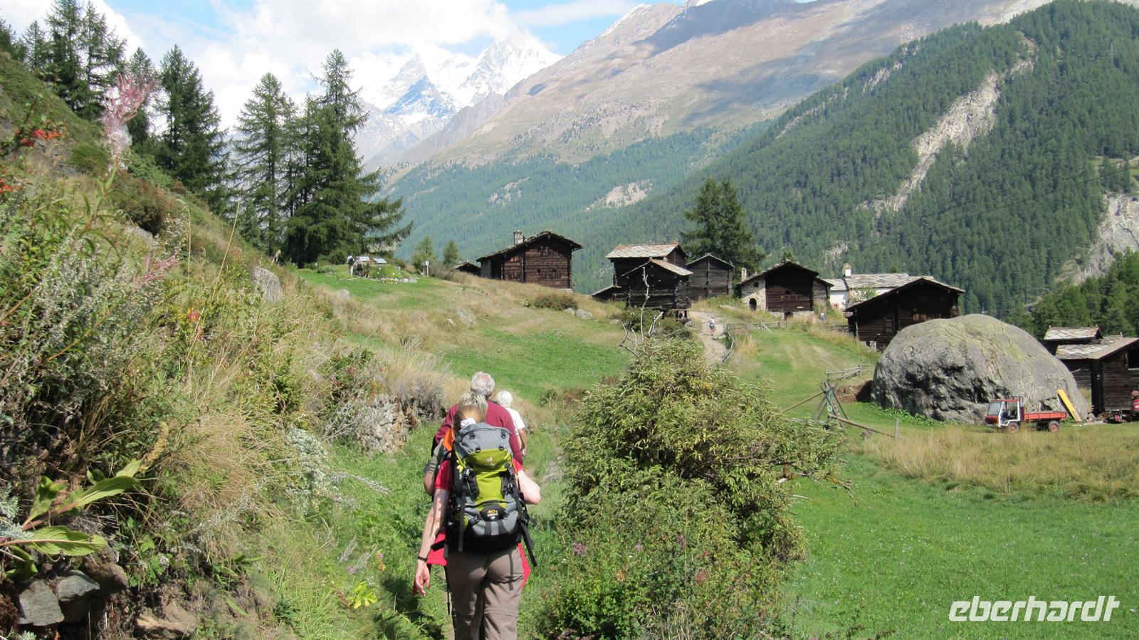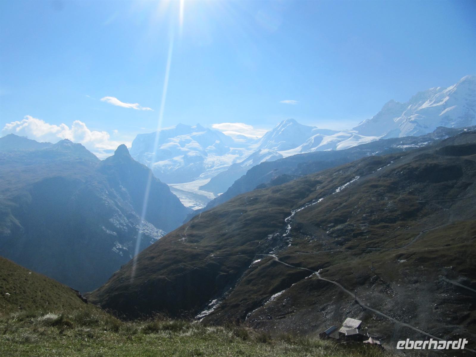 schneebedeckten Berge von der Duforspitze über die Monte Rosa Gruppe, das Matterhorn bis hin zum Weisshorn. Auch wenn sich die Berge ab und zu in Wolken hüllten, so war es ein beeindruckendes Naturschauspiel, an dem wir uns gar nicht satt sehen konnten. Wir verweilten eine ganze Zeit auf dem Gipfel bevor wir uns trennten. Einige Gäste fuhren den gesamten Weg wieder mit den Bergbahnen ist Tal und ein anderer Teil nutzte die Zeit zu verschiedensten Wanderungen. Mit einer kleinen Gruppe fuhr ich zur Station Blauherd zurück und wir wanderten auf dem Blumenweg nach Sunnegga. Der Weg führte durch Wiesen und bot uns immer wieder tolle Blicke auf das Matterhorn und die umliegenden Berge. Entlang des Weges waren Tafeln aufgestellt, auf denen die Alpenpflanzen erklärt werden. Unterwegs legten wir im kleinen Weiler Tufteren noch eine Rast ein. Auf Sunnegga angekommen, gönnten wir uns eine heiße Schokolade auf der herrlichen Aussichtsterrasse und genossen nochmals die Aussicht. Individuell kehrten wir mit der Standseilbahn nach Zermatt zurück. Den Nachmittag gestaltete dann jeder nach seinen Wünschen. Am Abend trafen wir uns alle zum Abendessen und tauschten unsere Erlebnisse vom Tag aus.