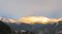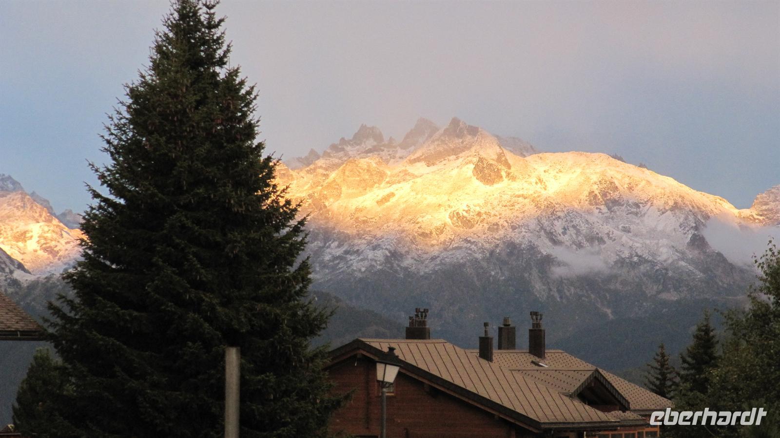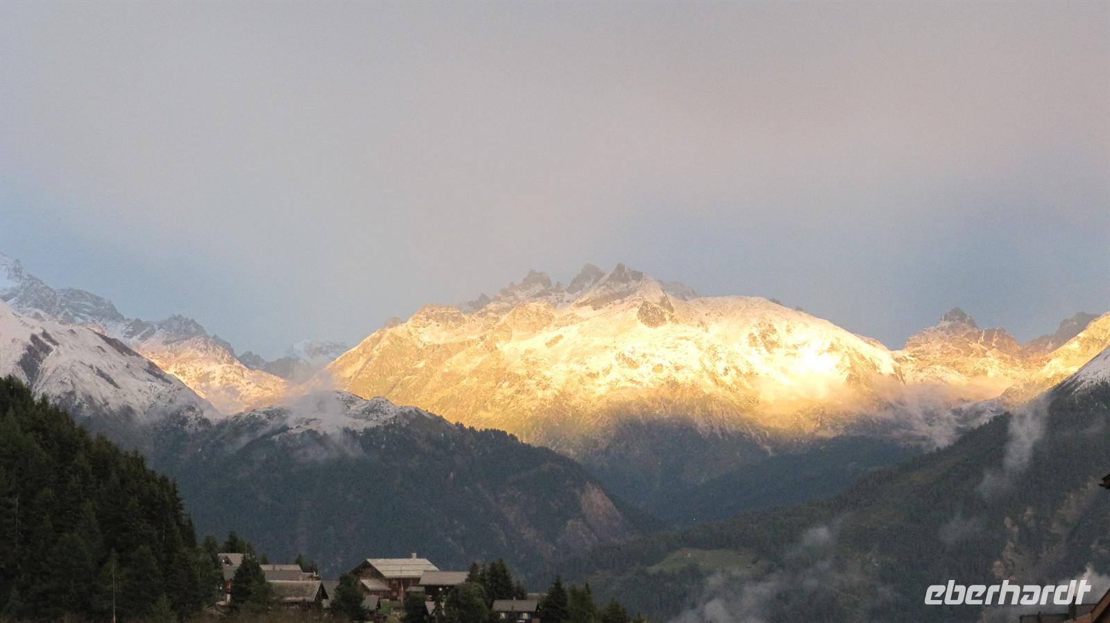 Nach kurzer Fahrt erreichten wir Mörel, Ausgangspunkt der Luftseilbahn auf die Riederalp. Unsere Koffer wurden auf Gepäckwagen verladen, der Bus geparkt und schon brachte uns die Gondel auf die Riederalp in 1.970 Metern Höhe, eine Terrasse hoch über dem Rhônetal gelegen. Bereits in der Seilbahn trafen wir Art Furrer, den Besitzer der Hotels auf der Riederalp und ein Original der Region. Das Art Furrer Resort war unser Hotel für die nächsten zwei Tage. Endlich hatte sich auch der Regen verzogen und die Berge tauchten aus den Wolken wieder auf. Der Tag endete mit einem fantastischen Sonnenuntergang und stimmungsvollen Bildern von den Bergen im Abendlicht. Wir genossen die einzigartige Ruhe auf der Riederalp. Es war am Abend und in der Nacht völlig still und einfach nur himmlisch!