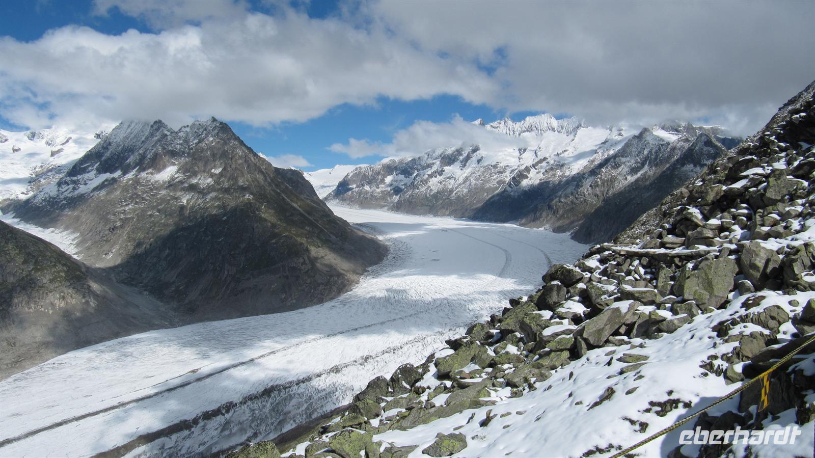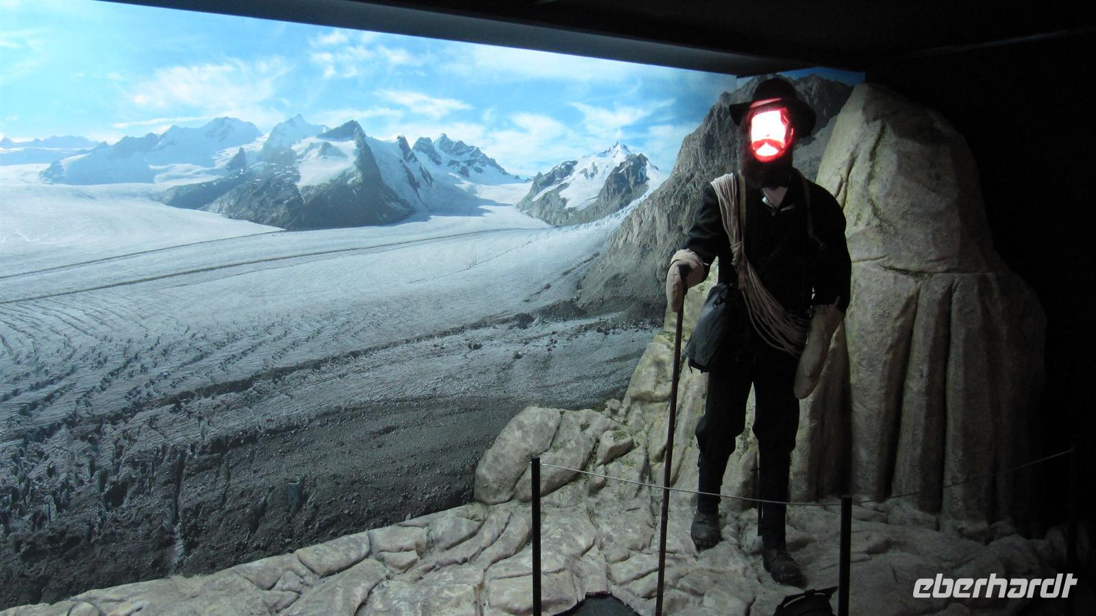 Bereits am Morgen kitzelte uns die Sonne mit ihren Strahlen wach und bei einem leckeren Frühstück starteten wir in einen erlebnisreichen Tag. Art Furrer erwartete uns schon und gemeinsam wanderten wir über den Herrenweg Richtung Bettmeralp. Art Furrer ist in einem kleinen Ort unterhalb der Riederalp geboren und aufgewachsen und hat viele Jahre in den USA, unter anderem als Skilehrer der Familie Kennedy und als Skiakrobat, gelebt. Dann kehrte er auf die Riederalp zurück und baute verschiedenste Hotels. Er erzählte uns aus seinem Leben und über die Natur auf der Alp und den Aletschgletscher. Gebannt lauschten wir seinen interessanten Ausführungen. An der Gopplerlücke verließ uns Art, weil er noch andere Gäste betreuen musste. Dennoch war diese Begegnung für uns aufschlussreich. Wir wanderten über Kuhweiden weiter zur Bettmeralp. Hier bestiegen wir die Gondelbahn zum Bettmerhorn und schwebten auf 2.647 Meter Höhe und landeten auf der Terrasse im Schnee . Das Bettmerhorn