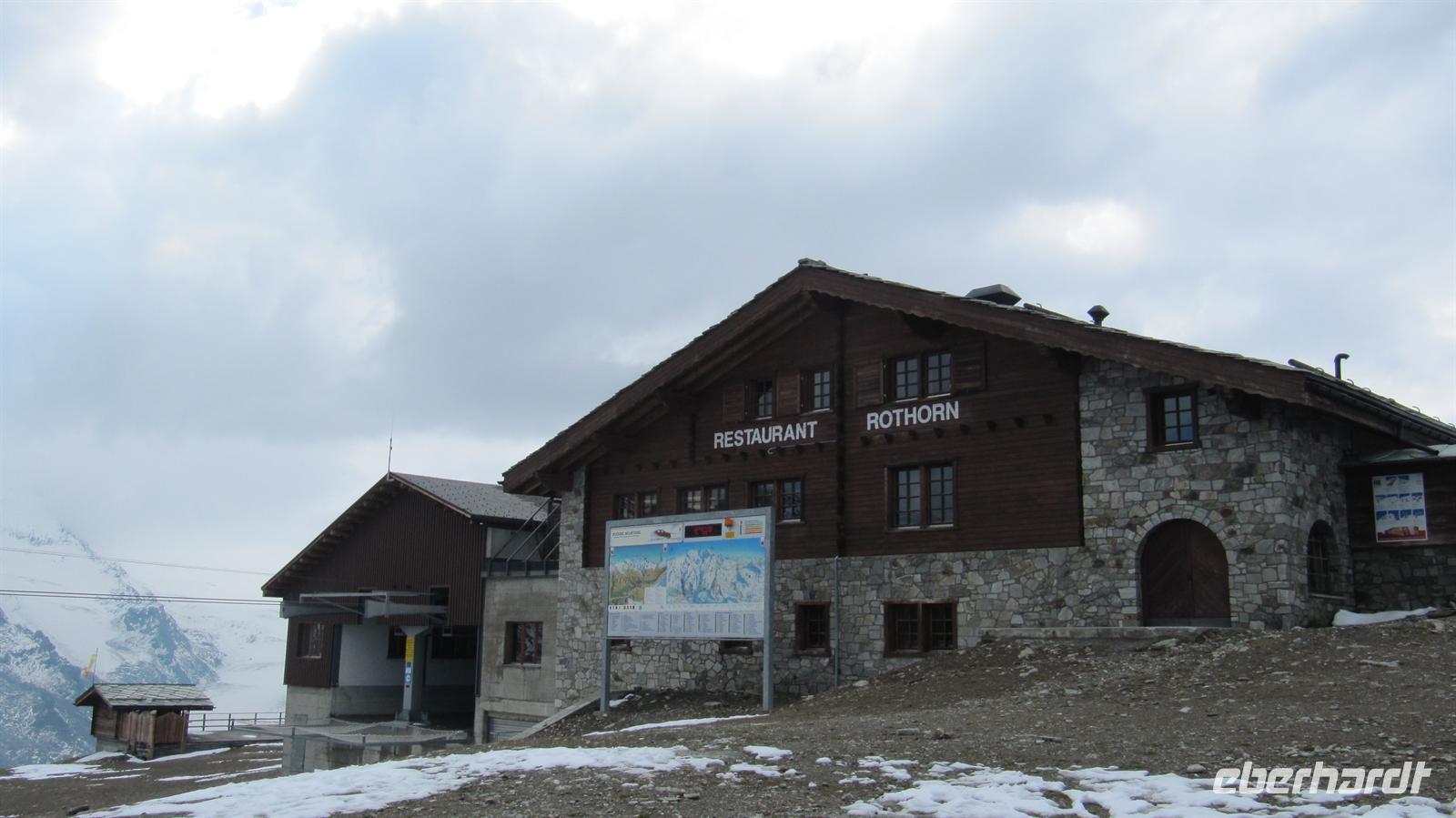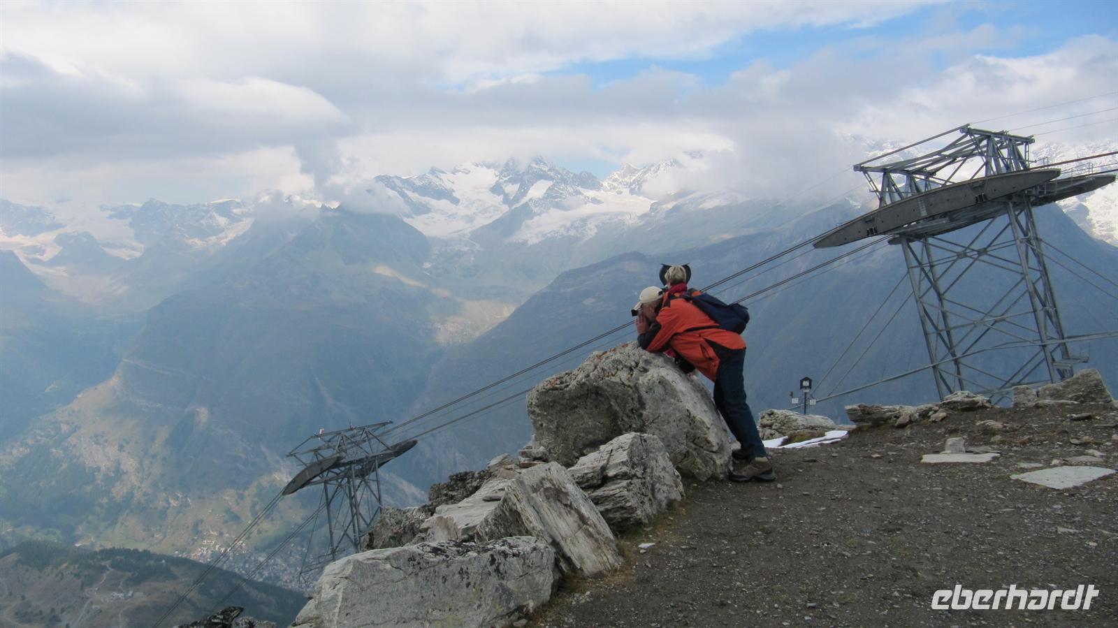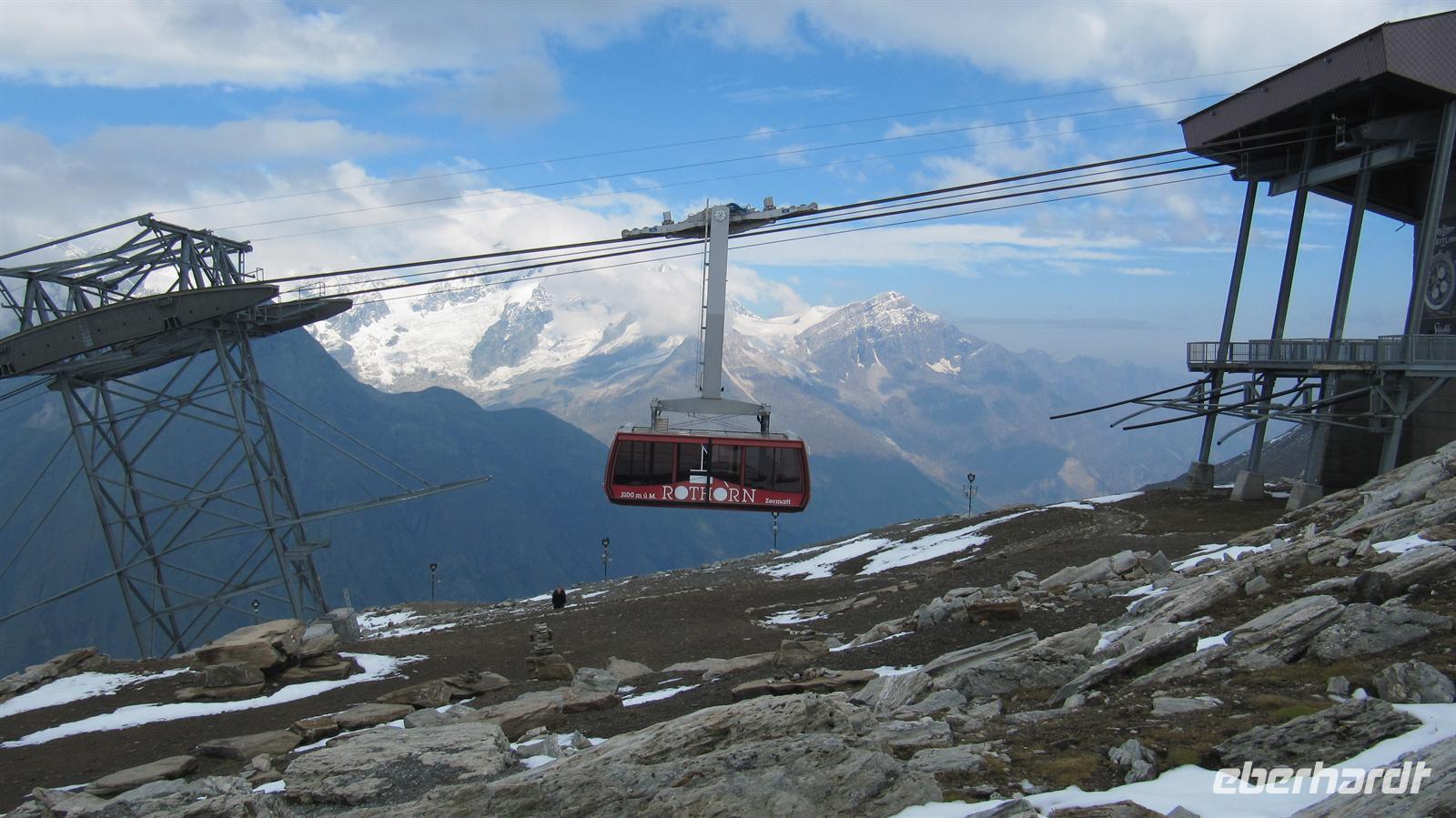 Nach dem Frühstück zeigte sich uns das Matterhorn kurz in seiner vollen Schönheit. Gut gelaunt starteten wir den Tag mit einem Spaziergang zur Talstation der Rothornbahn. Zunächst brachte uns die unterirdische Standseilbahn auf 2.288 Meter Höhe auf die Zwischenstation Sunnegga. Hier genossen wir die Aussicht zum Matterhorn, zur Monte Rosa Gruppe und den anderen Viertausender. Nun bestiegen wir die Gondelbahn mit der wir die Station Blauherd in 2.571 Metern Höhe erreichten. Nach einem kurzen Stopp ging es mit der Kabinenbahn auf den Gipfel des Rothorns in 3.103 Metern Höhe. Hier bot sich uns ein atemberaubendes Panorama der