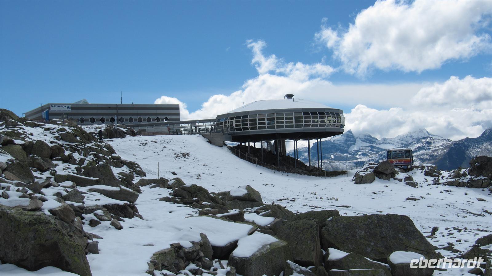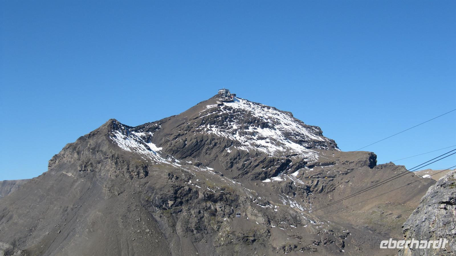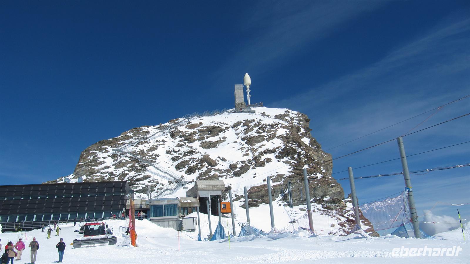 Nach dem Frühstück zeigte sich uns das Matterhorn kurz in seiner vollen Schönheit. Gut gelaunt starteten wir den Tag mit einem Spaziergang zur Talstation der Rothornbahn. Zunächst brachte uns die unterirdische Standseilbahn auf 2.288 Meter Höhe auf die Zwischenstation Sunnegga. Hier genossen wir die Aussicht zum Matterhorn, zur Monte Rosa Gruppe und den anderen Viertausender. Nun bestiegen wir die Gondelbahn mit der wir die Station Blauherd in 2.571 Metern Höhe erreichten. Nach einem kurzen Stopp ging es mit der Kabinenbahn auf den Gipfel des Rothorns in 3.103 Metern Höhe. Hier bot sich uns ein atemberaubendes Panorama der