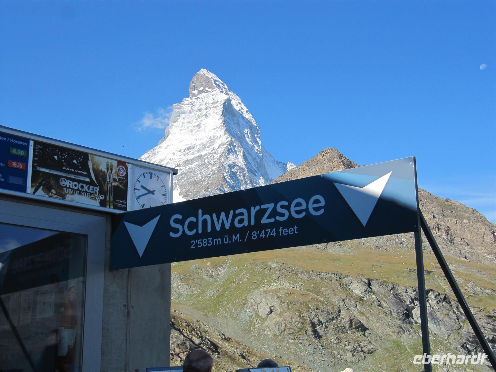 Heute begrüßte uns das Matterhorn in seiner vollen Pracht. Also stand unserem fakultativen Ausflug auf das Kleine Matterhorn nichts im Wege. Wir spazierten zunächst entlang der Vispa zur Talstation der Gondelbahn, welche uns über Furi zunächst nach Schwarzsee brachte. Hier legten wir einen Stopp ein und genossen die Aussicht auf das Matterhorn. Einfach atemberaubend! Wir sahen auch schon unser Ziel in 3.883 Metern Höhe, das Kleine Matterhorn. Nun setzten wir unsere Fahrt mit der Gondelbahn bis zur Station „Trockener Steg“ fort. Auch hier schauten wir uns zunächst um und konnten die Hörnlihütte am Fuße des Matterhorns sehr gut sehen. Sie ist Ausgangsspunkt für die Bergsteiger, die den Berg der Berge besteigen möchten. Mit der großen Kabinenbahn erreichten wir unser Ziel, das Kleine Matterhorn in 3.883 Metern Höhe. Natürlich