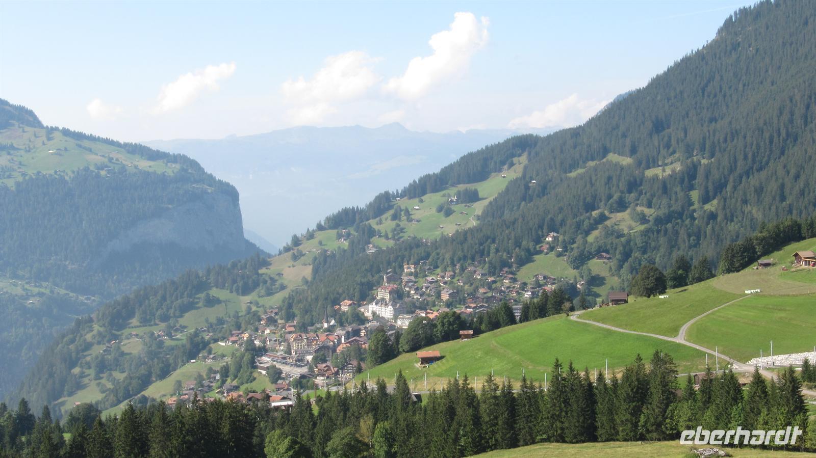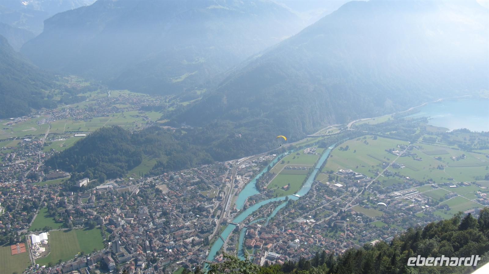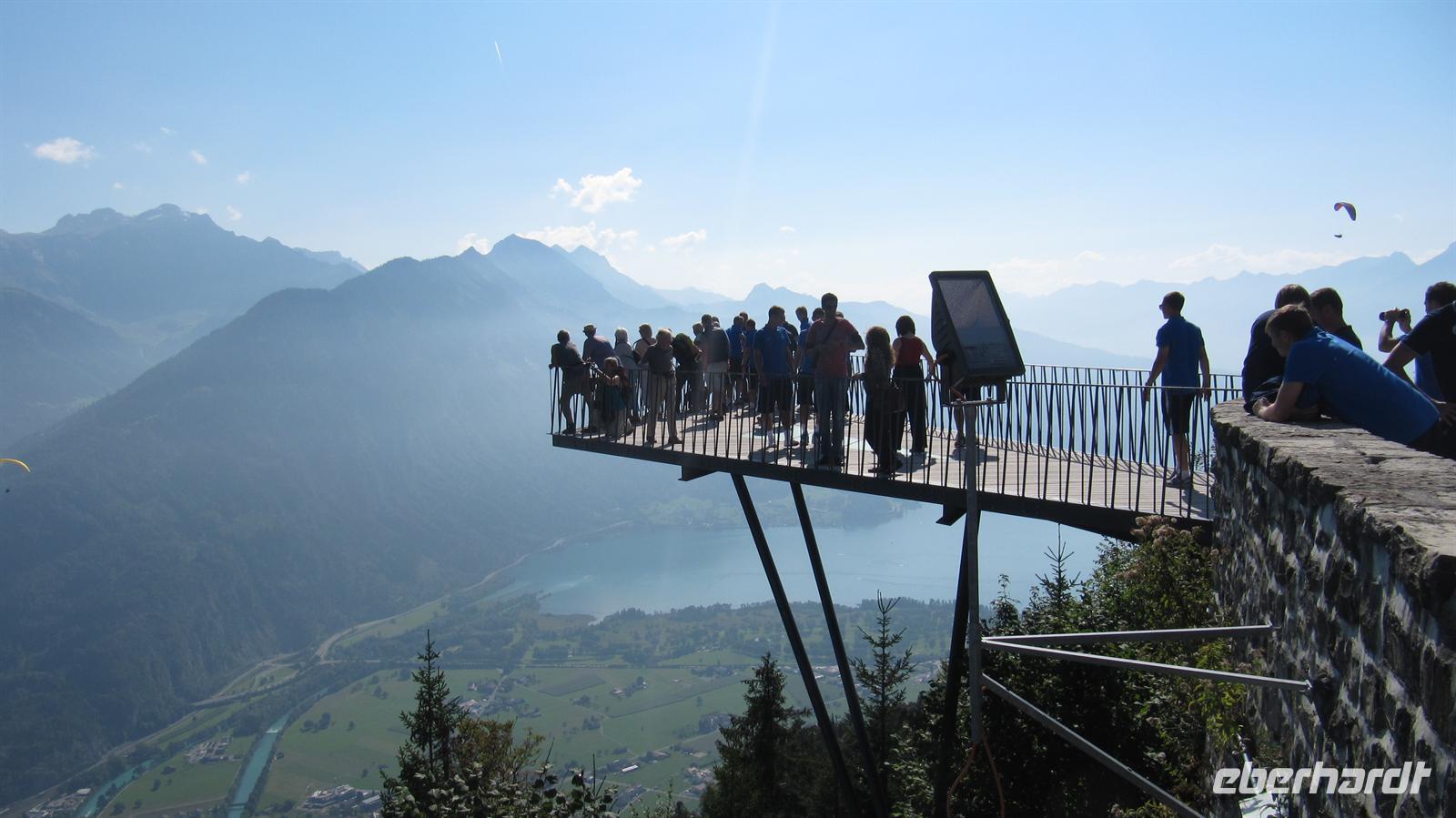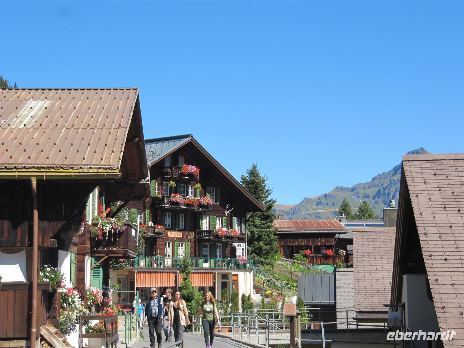 verläuft, erreichten wir den Gipfel in 2.970 Metern Höhe. Uns bot sich ein einmaliges 360°-Panorama vom Mont Blanc über die Walliser und Berner Alpen bis hin zu Eiger, Mönch und Jungfrau und dem Schwarzwald. Auf der großen Aussichtsterrasse und im Drehrestaurant verweilten wir und ließen unsere Blicke schweifen. Anschließend brachten uns die Seilbahnen nach Mürren zurück. Wir spazierten durch den hübschen Ort, der auf einer Sonnenterrasse hoch über dem Lauterbrunnental liegt. Mit den Seilbahnen ging es zurück nach Stechelberg, wo wir unseren Bus bestiegen und vorbei am Straubachfall, den bereits Johann Wolfgang von Goethe in einem Gedicht beschrieb, nach Interlaken zurück. Da so tolles Wetter war, erklommen wir am Nachmittag mit der Standseilbahn den Hausberg von Interlaken, den Harder Kulm in 1.322 Metern Höhe. Auch hier bot sich uns ein herrlicher Blick über den Brienzer See und den Thunersee und Interlaken vor der Kulisse von Eiger, Mönch und Jungfrau. Auf dem Zwei-Seen-Steg schienen wir über der Landschaft zu schweben. Bei einem leckeren Abendessen im Garten des Hotels ließen wir diesen wunderschönen Tag und die Reise ausklingen.