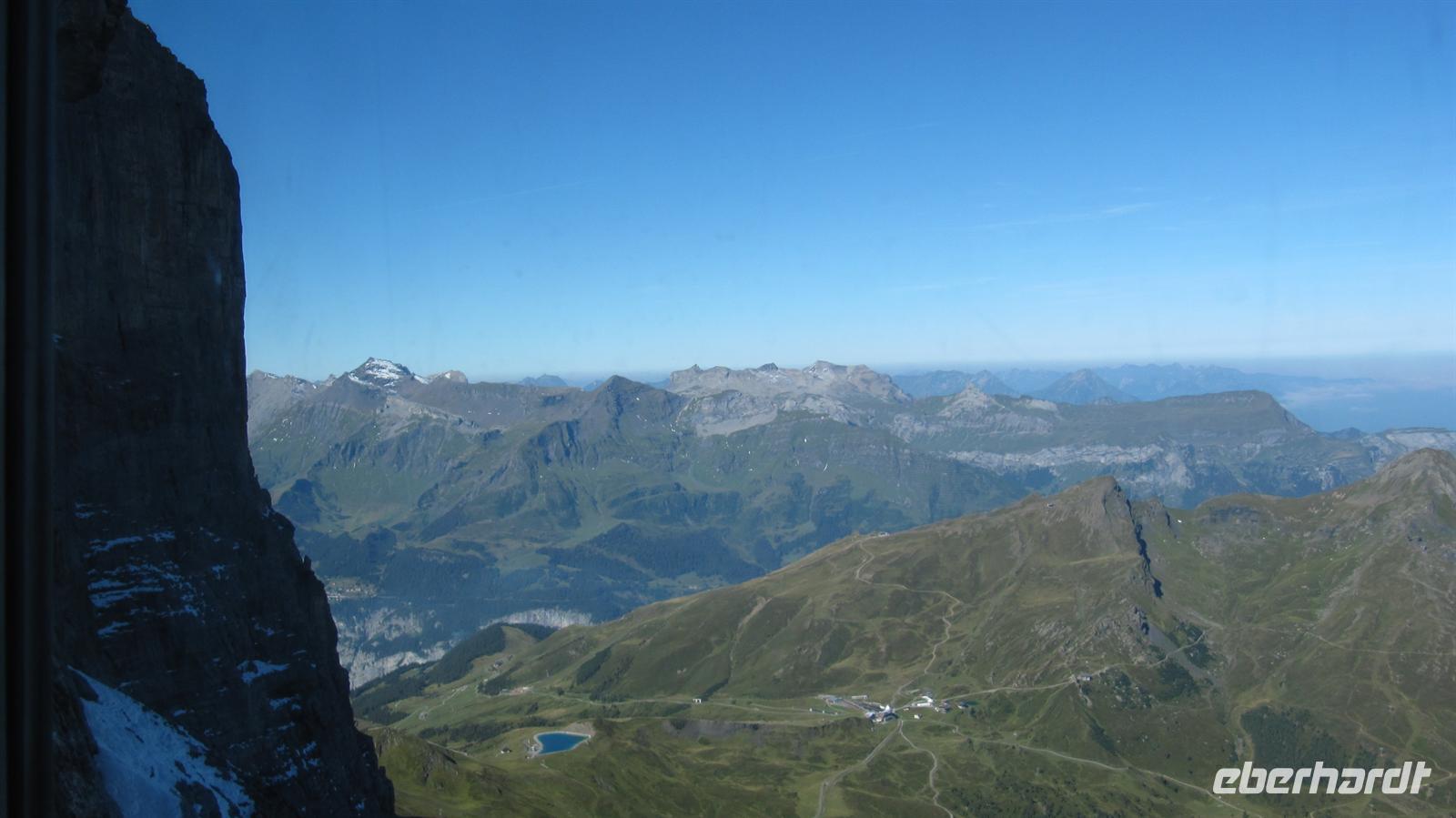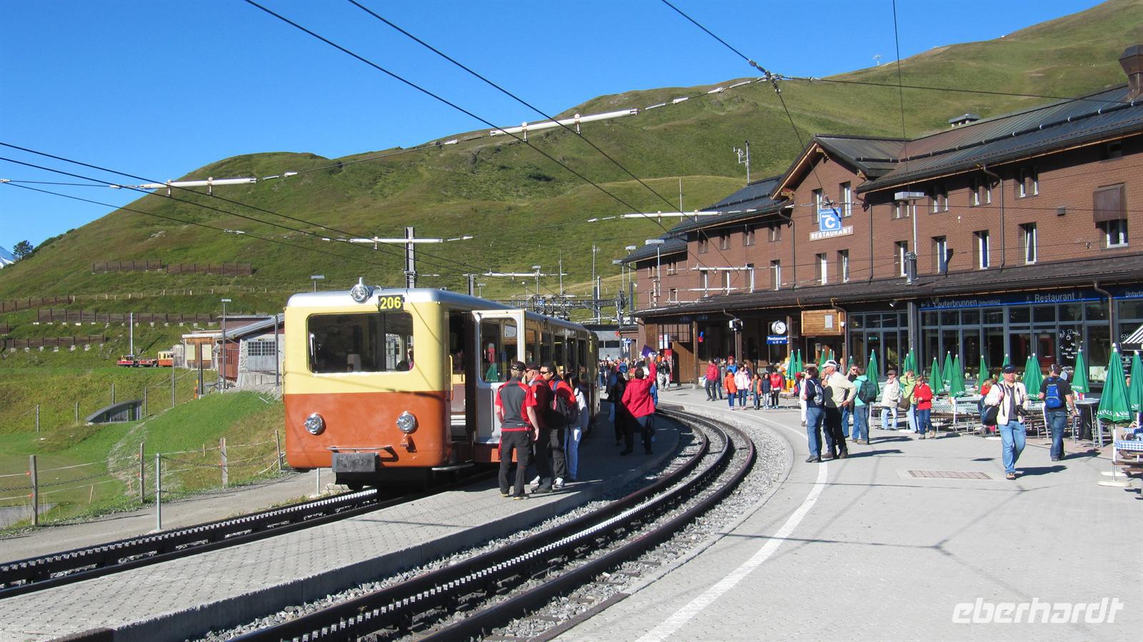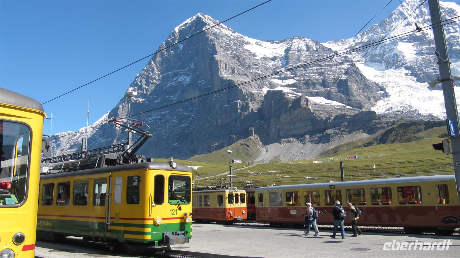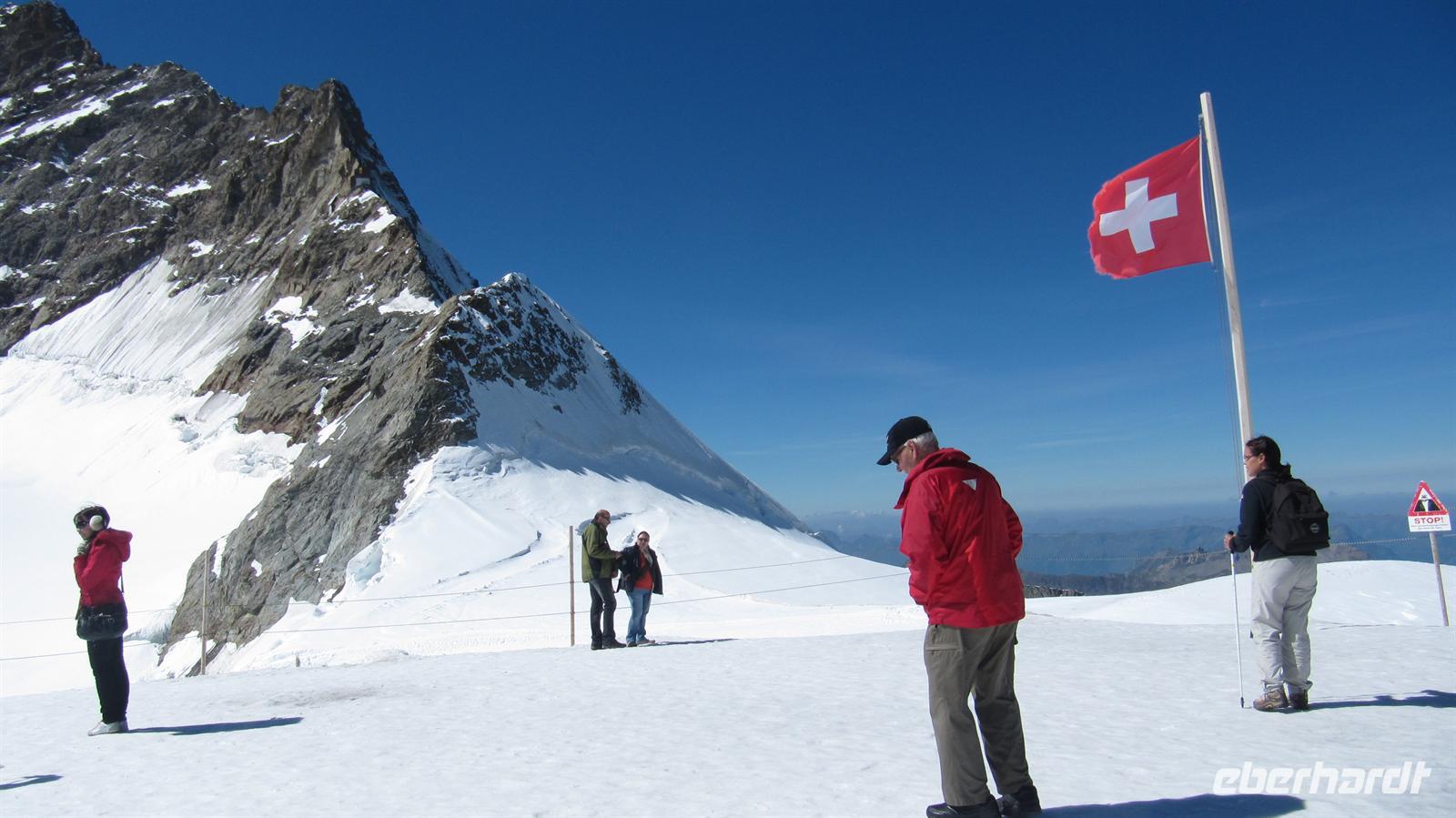 Der heutige Tag versprach wieder Traumwetter und wir freuten uns auf ein tolles Erlebnis. Mit dem Bus fuhren wir zunächst nach Grindelwald -Grund. Dort besteigen wir die Wengeralp-Bahn zur Kleinen Scheidegg. Schon während der Fahrt eröffneten sich uns herrliche Blicke in die Berwelt des Berner Oberlandes. Wir sahen den Männlichen, die Schynige Platte und natürlich das Dreigestirn Eiger, Mönch und Jungfrau. Angekommen auf der Kleinen Scheidegg hatten wir die Eigernordwand in ihrer vollen Größe vor uns. Wir sahen das Jungfraujoch, unser Ziel in gleißendem Sonnenlicht. Nun ging es mit der Jungfraubahn durch den Eiger. An zwei Haltestellen konnten wir durch Fenster einmal direkt in die Eigernordwand schauen und ein zweites Mal zum Eismeer,