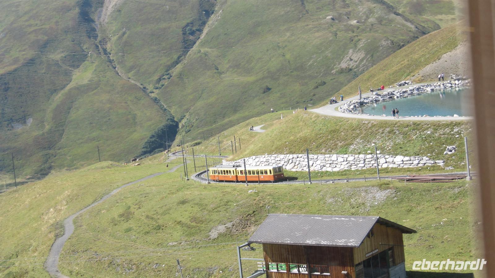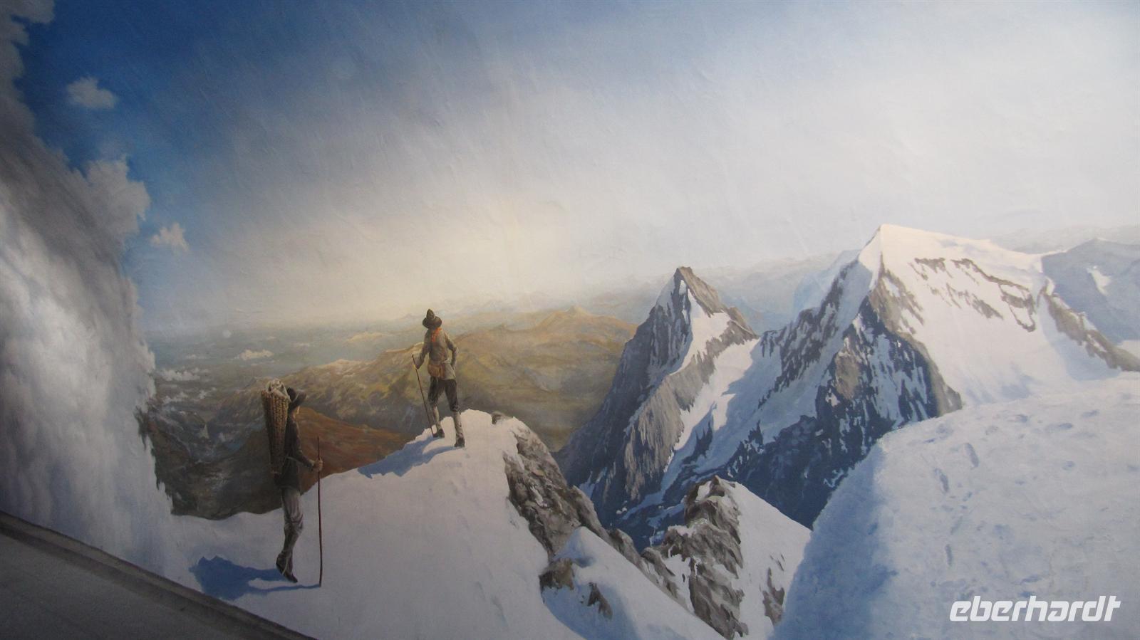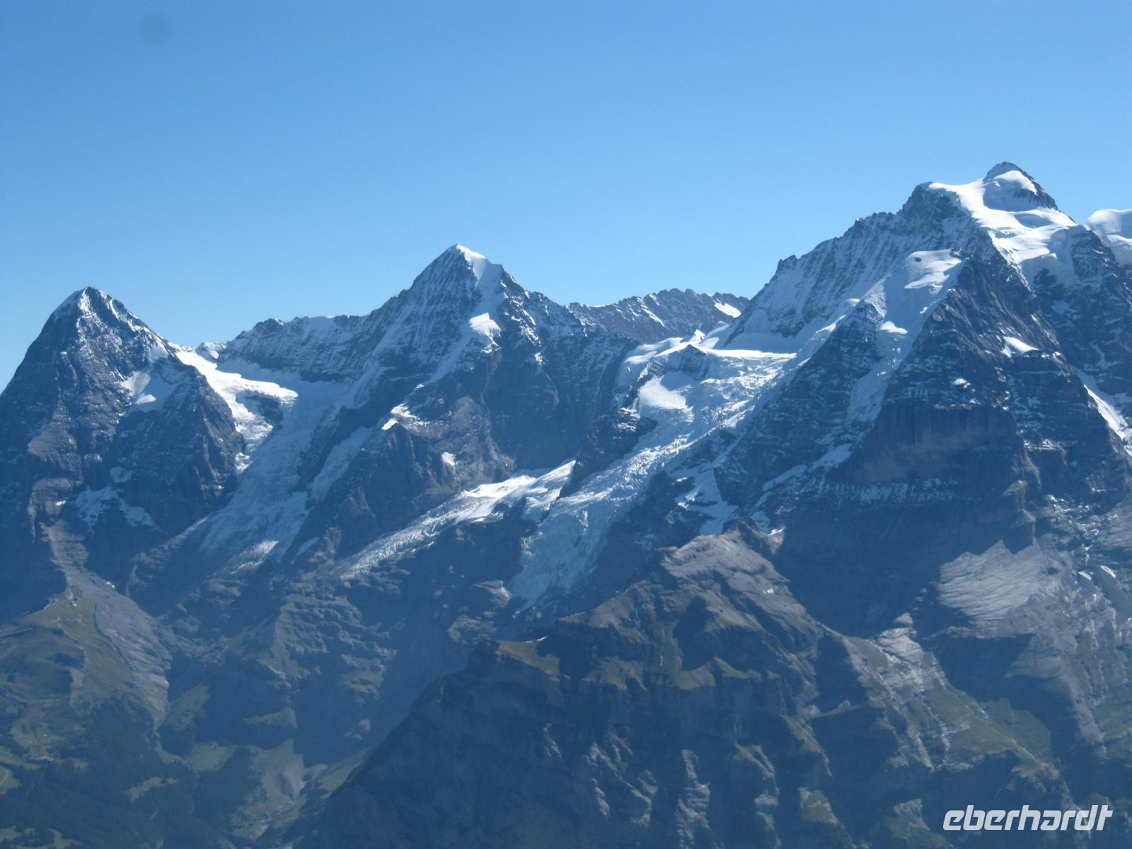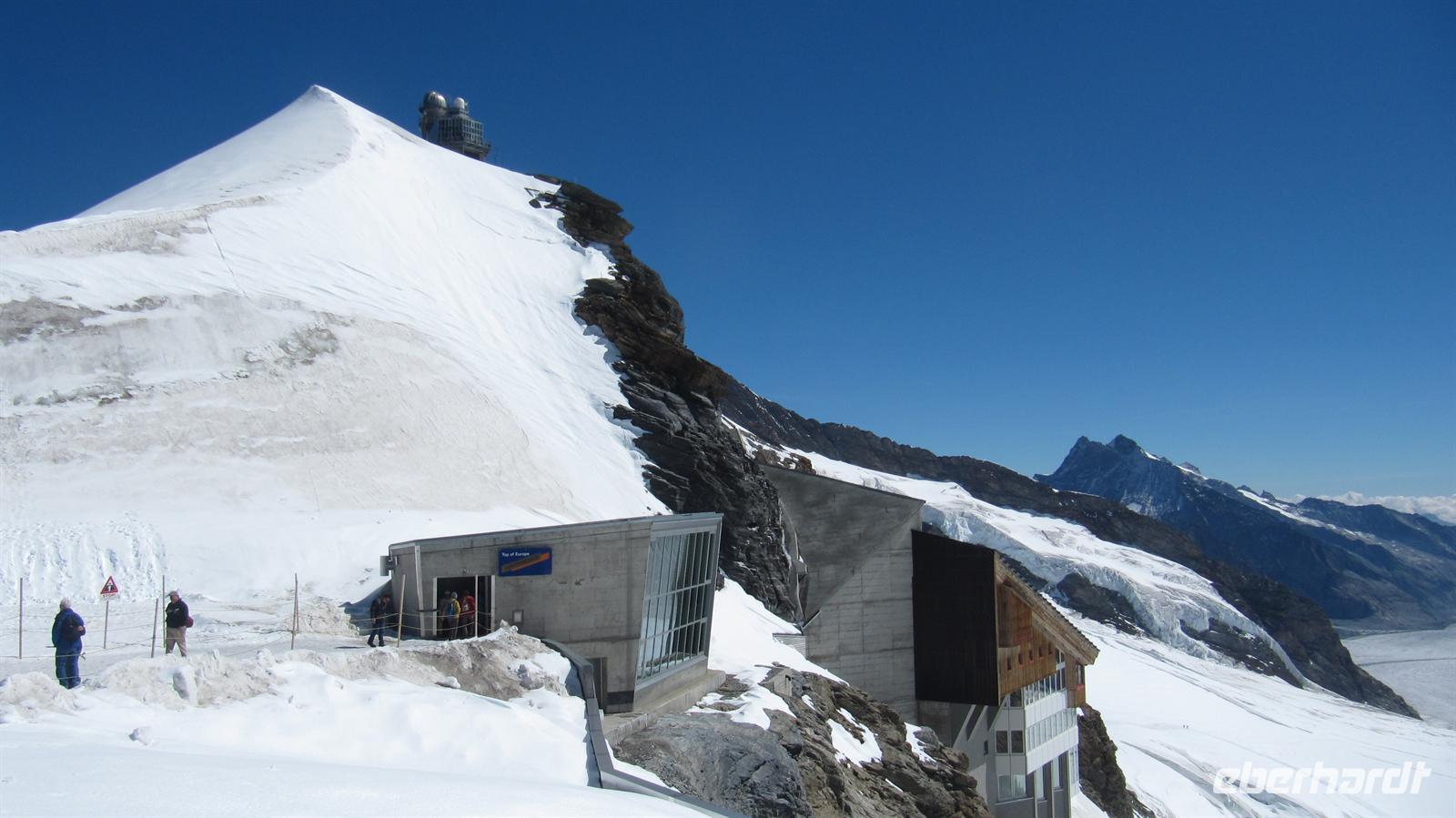 Der heutige Tag versprach wieder Traumwetter und wir freuten uns auf ein tolles Erlebnis. Mit dem Bus fuhren wir zunächst nach Grindelwald -Grund. Dort besteigen wir die Wengeralp-Bahn zur Kleinen Scheidegg. Schon während der Fahrt eröffneten sich uns herrliche Blicke in die Berwelt des Berner Oberlandes. Wir sahen den Männlichen, die Schynige Platte und natürlich das Dreigestirn Eiger, Mönch und Jungfrau. Angekommen auf der Kleinen Scheidegg hatten wir die Eigernordwand in ihrer vollen Größe vor uns. Wir sahen das Jungfraujoch, unser Ziel in gleißendem Sonnenlicht. Nun ging es mit der Jungfraubahn durch den Eiger. An zwei Haltestellen konnten wir durch Fenster einmal direkt in die Eigernordwand schauen und ein zweites Mal zum Eismeer,