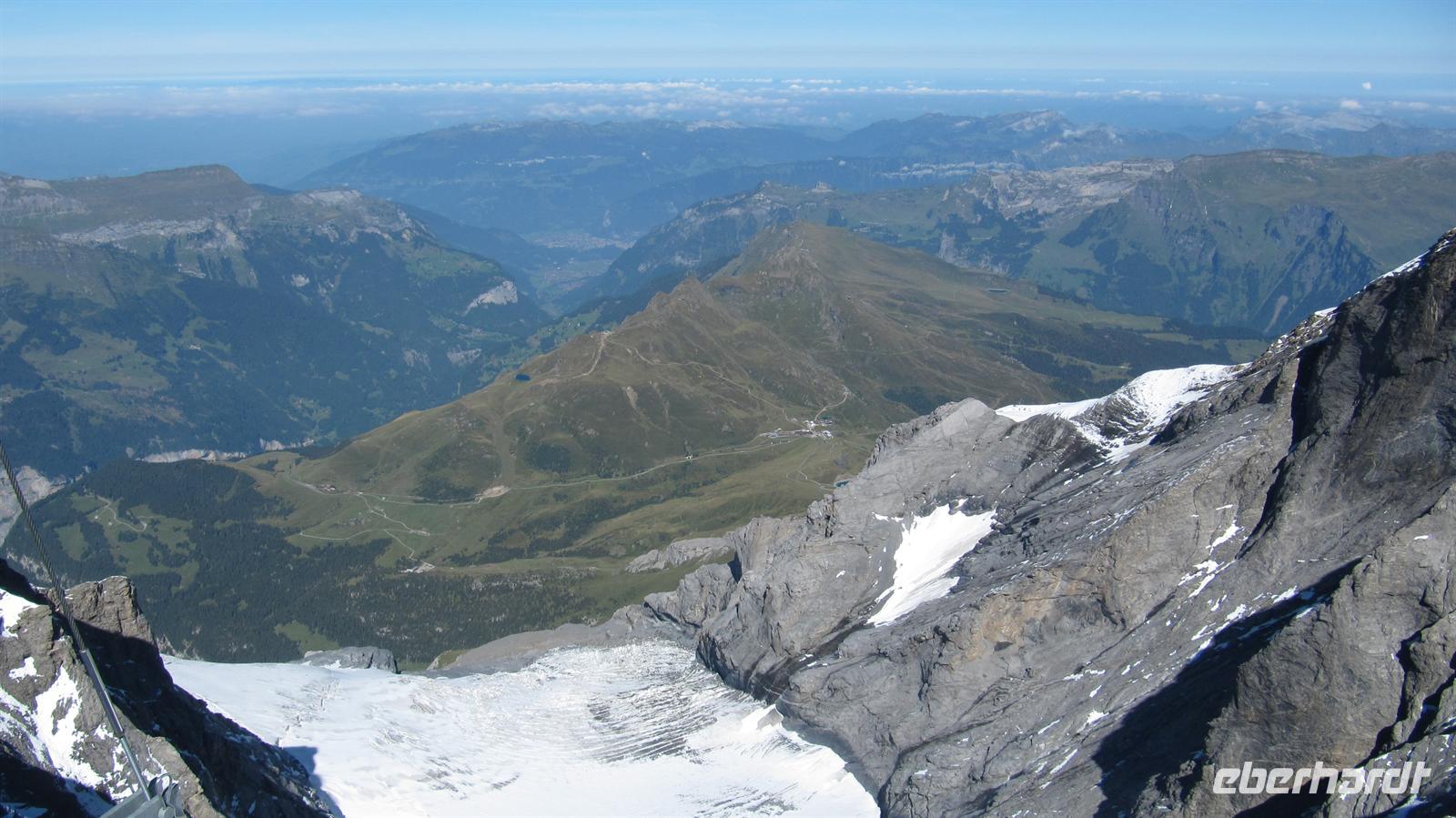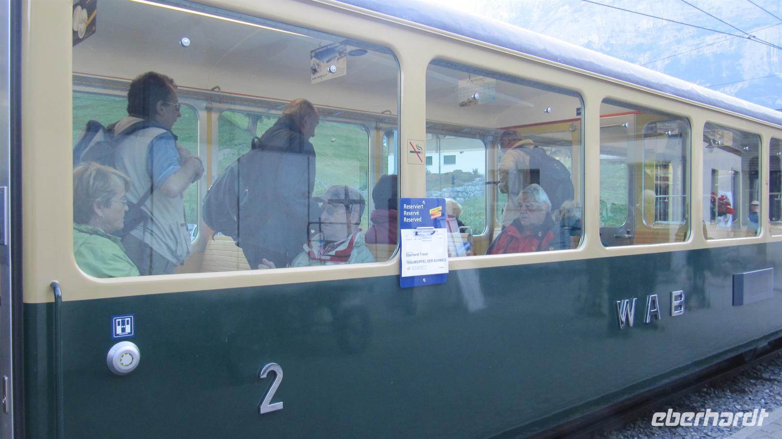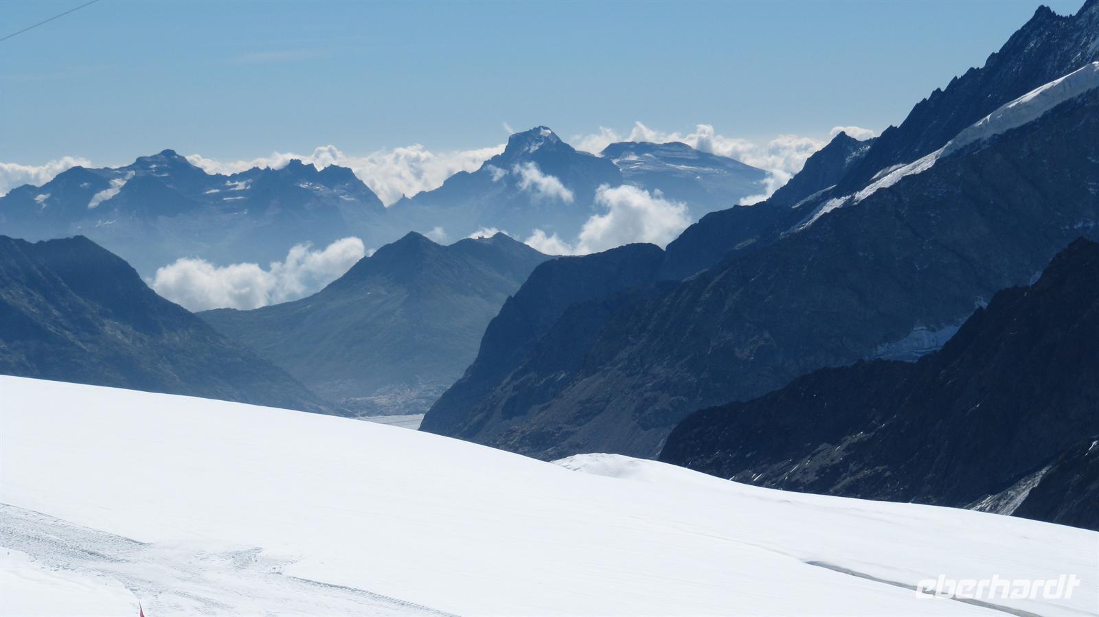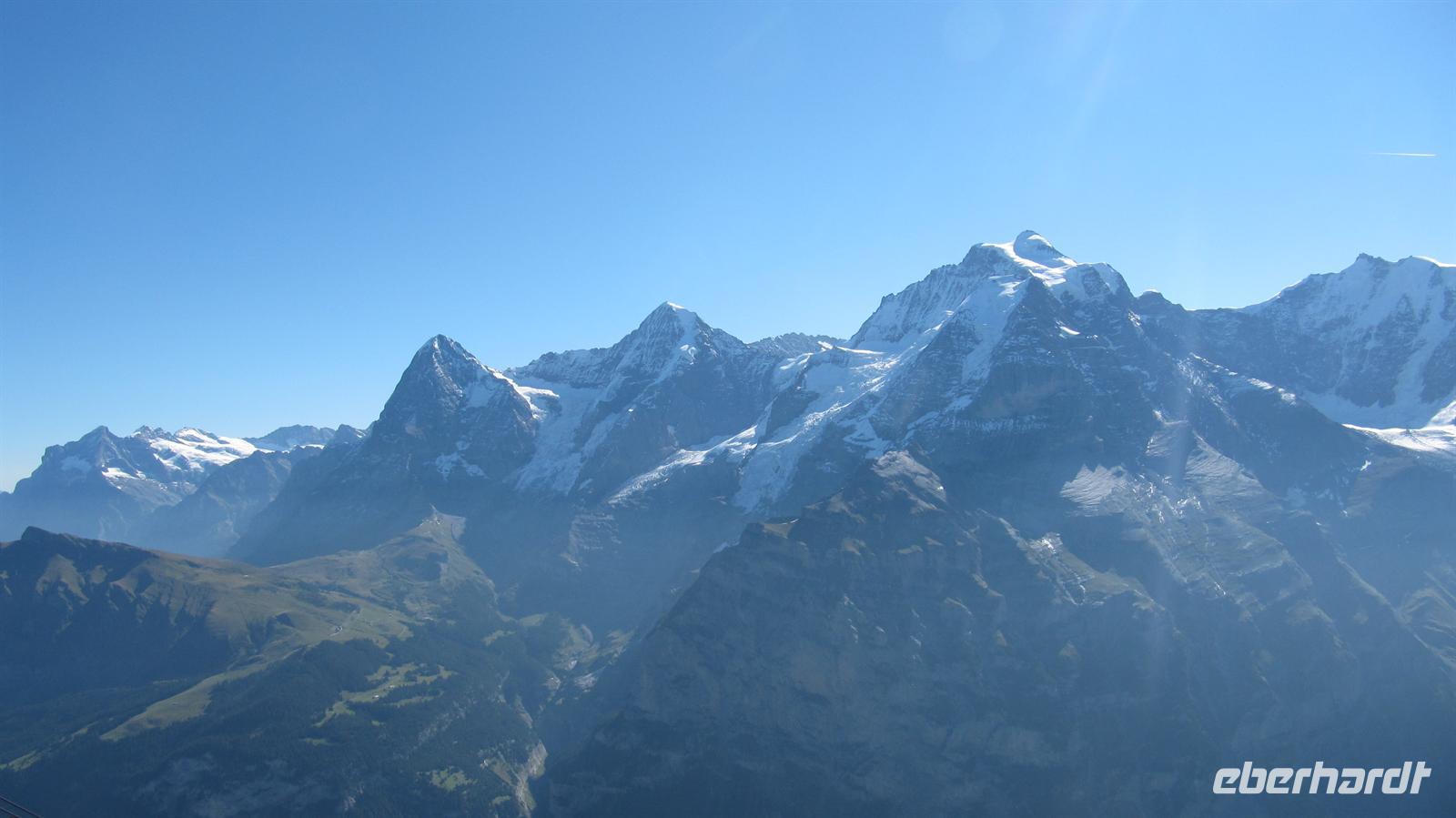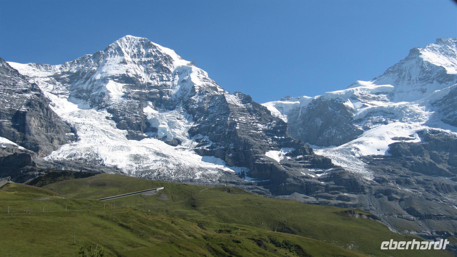Der heutige Tag versprach wieder Traumwetter und wir freuten uns auf ein tolles Erlebnis. Mit dem Bus fuhren wir zunächst nach Grindelwald -Grund. Dort besteigen wir die Wengeralp-Bahn zur Kleinen Scheidegg. Schon während der Fahrt eröffneten sich uns herrliche Blicke in die Berwelt des Berner Oberlandes. Wir sahen den Männlichen, die Schynige Platte und natürlich das Dreigestirn Eiger, Mönch und Jungfrau. Angekommen auf der Kleinen Scheidegg hatten wir die Eigernordwand in ihrer vollen Größe vor uns. Wir sahen das Jungfraujoch, unser Ziel in gleißendem Sonnenlicht. Nun ging es mit der Jungfraubahn durch den Eiger. An zwei Haltestellen konnten wir durch Fenster einmal direkt in die Eigernordwand schauen und ein zweites Mal zum Eismeer,