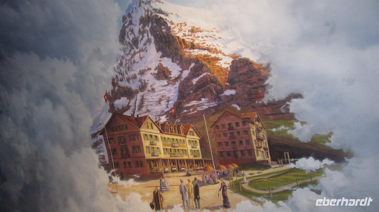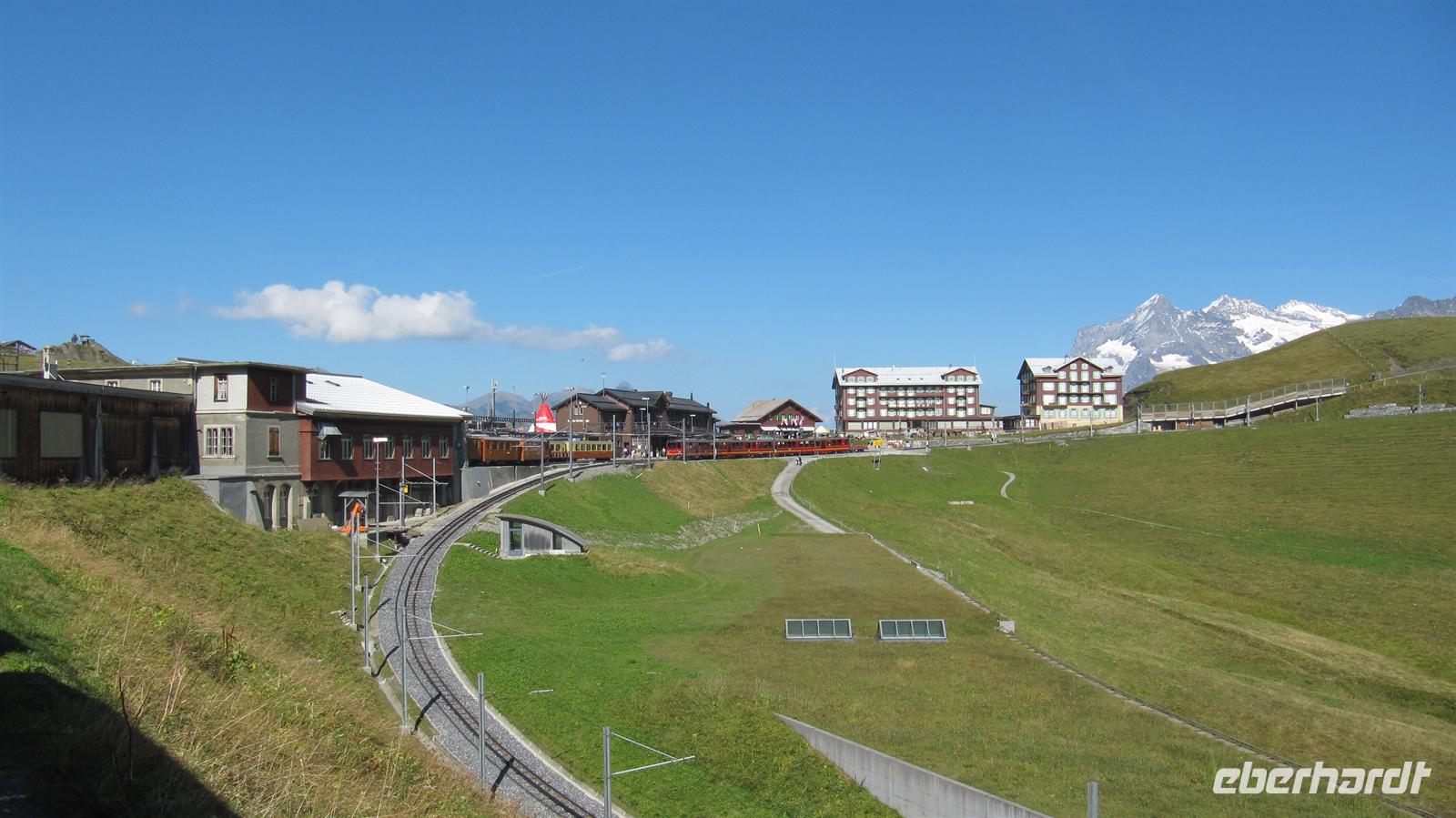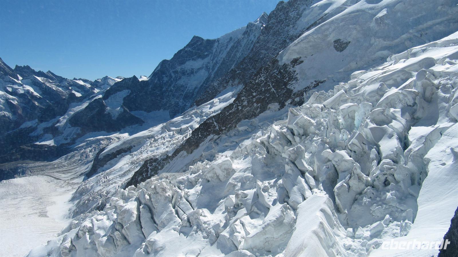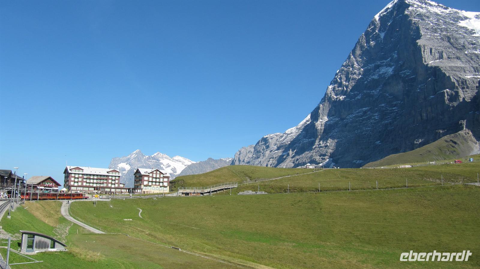 Der heutige Tag versprach wieder Traumwetter und wir freuten uns auf ein tolles Erlebnis. Mit dem Bus fuhren wir zunächst nach Grindelwald -Grund. Dort besteigen wir die Wengeralp-Bahn zur Kleinen Scheidegg. Schon während der Fahrt eröffneten sich uns herrliche Blicke in die Berwelt des Berner Oberlandes. Wir sahen den Männlichen, die Schynige Platte und natürlich das Dreigestirn Eiger, Mönch und Jungfrau. Angekommen auf der Kleinen Scheidegg hatten wir die Eigernordwand in ihrer vollen Größe vor uns. Wir sahen das Jungfraujoch, unser Ziel in gleißendem Sonnenlicht. Nun ging es mit der Jungfraubahn durch den Eiger. An zwei Haltestellen konnten wir durch Fenster einmal direkt in die Eigernordwand schauen und ein zweites Mal zum Eismeer,