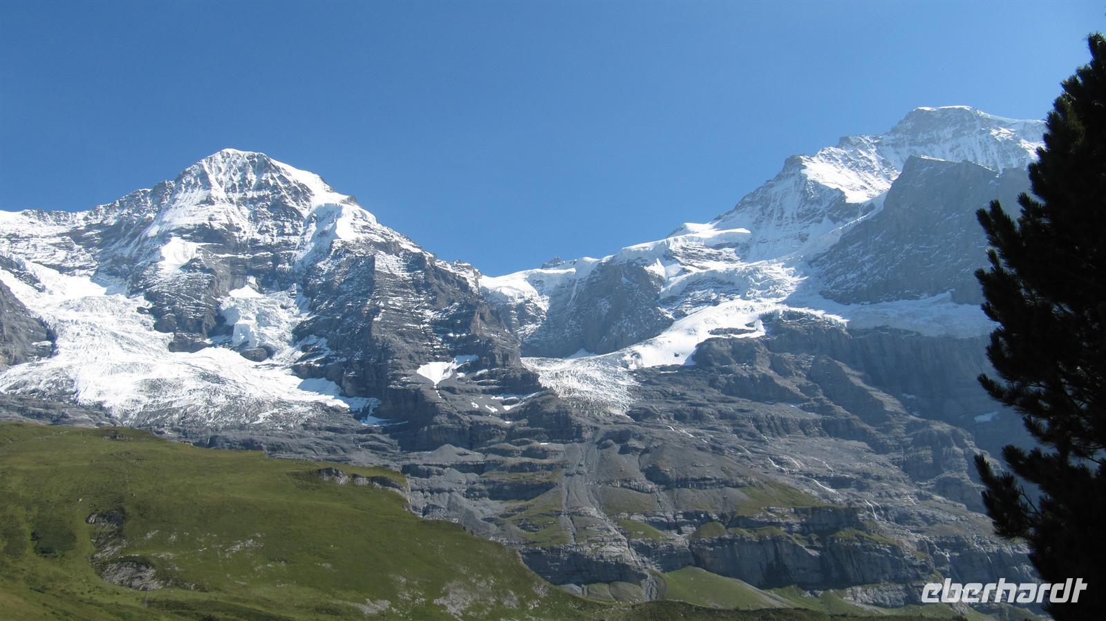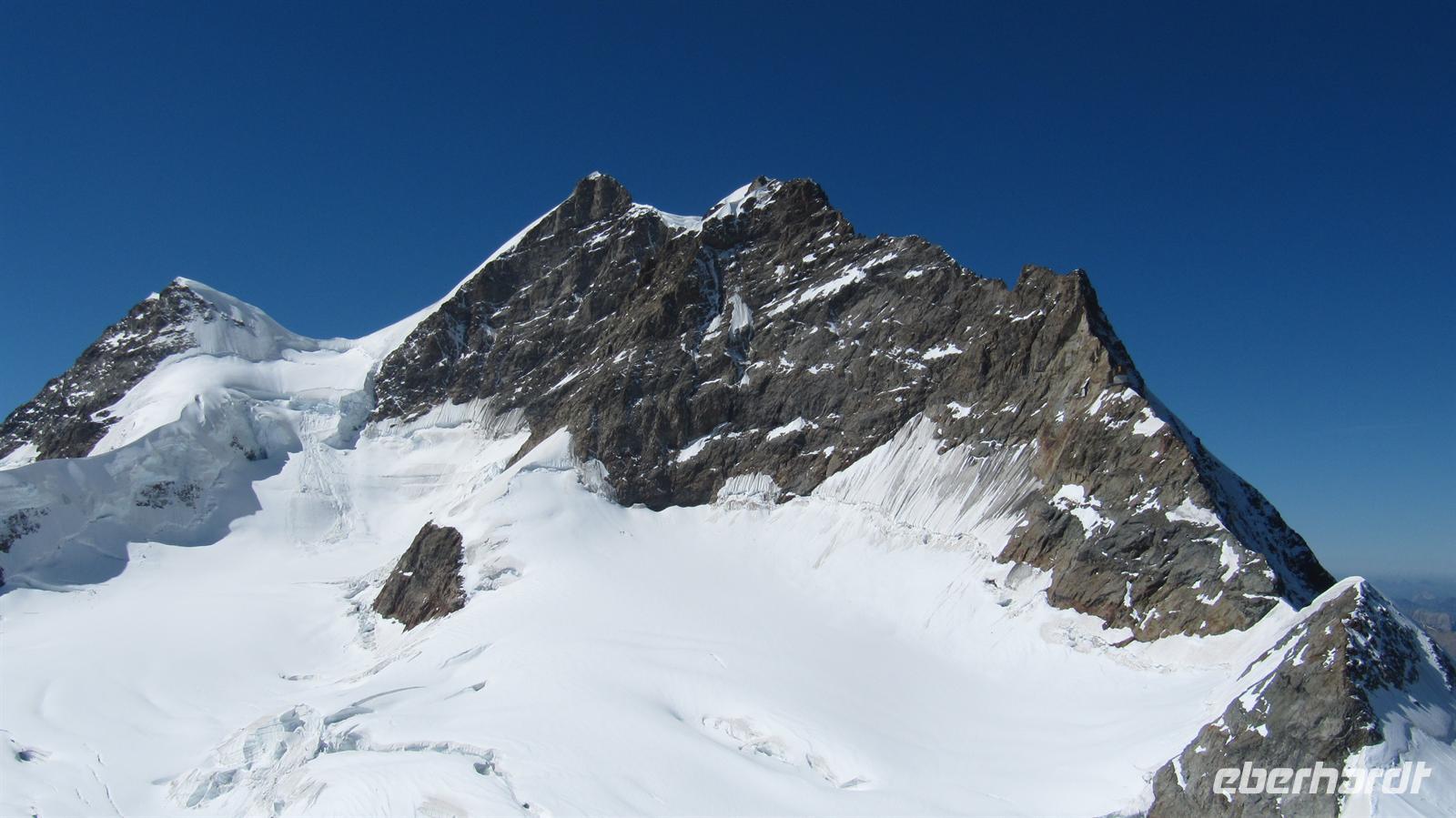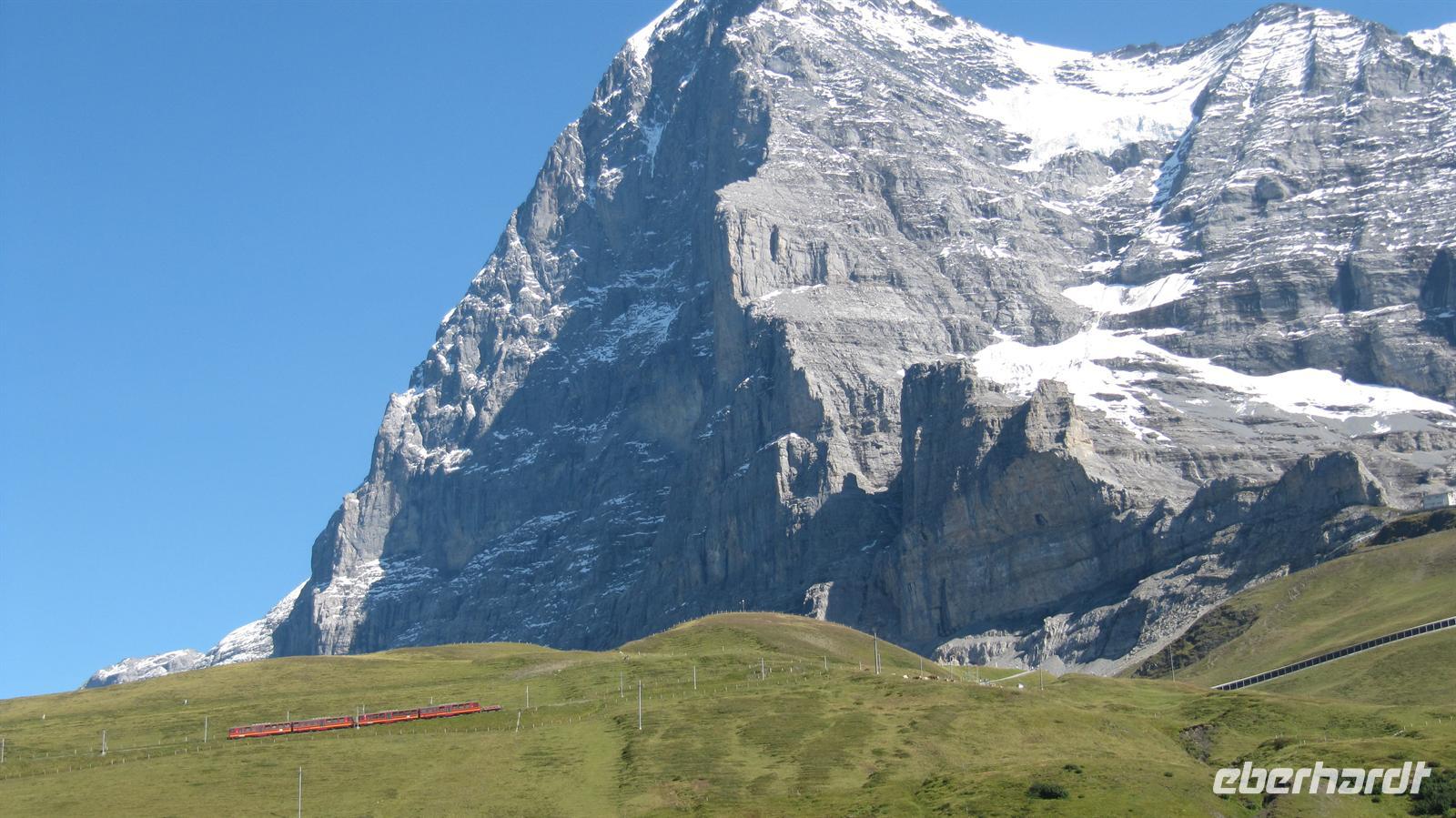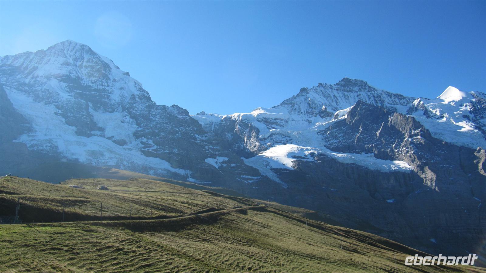 Der heutige Tag versprach wieder Traumwetter und wir freuten uns auf ein tolles Erlebnis. Mit dem Bus fuhren wir zunächst nach Grindelwald -Grund. Dort besteigen wir die Wengeralp-Bahn zur Kleinen Scheidegg. Schon während der Fahrt eröffneten sich uns herrliche Blicke in die Berwelt des Berner Oberlandes. Wir sahen den Männlichen, die Schynige Platte und natürlich das Dreigestirn Eiger, Mönch und Jungfrau. Angekommen auf der Kleinen Scheidegg hatten wir die Eigernordwand in ihrer vollen Größe vor uns. Wir sahen das Jungfraujoch, unser Ziel in gleißendem Sonnenlicht. Nun ging es mit der Jungfraubahn durch den Eiger. An zwei Haltestellen konnten wir durch Fenster einmal direkt in die Eigernordwand schauen und ein zweites Mal zum Eismeer,