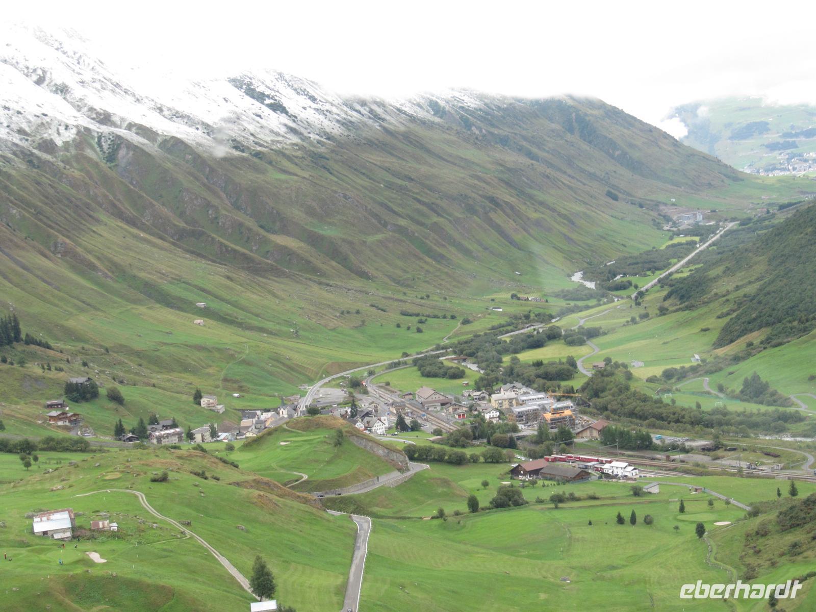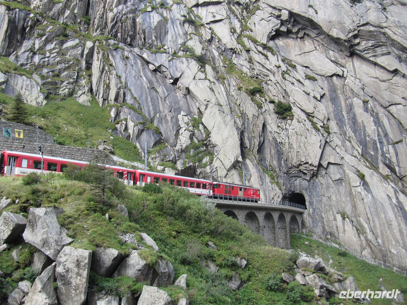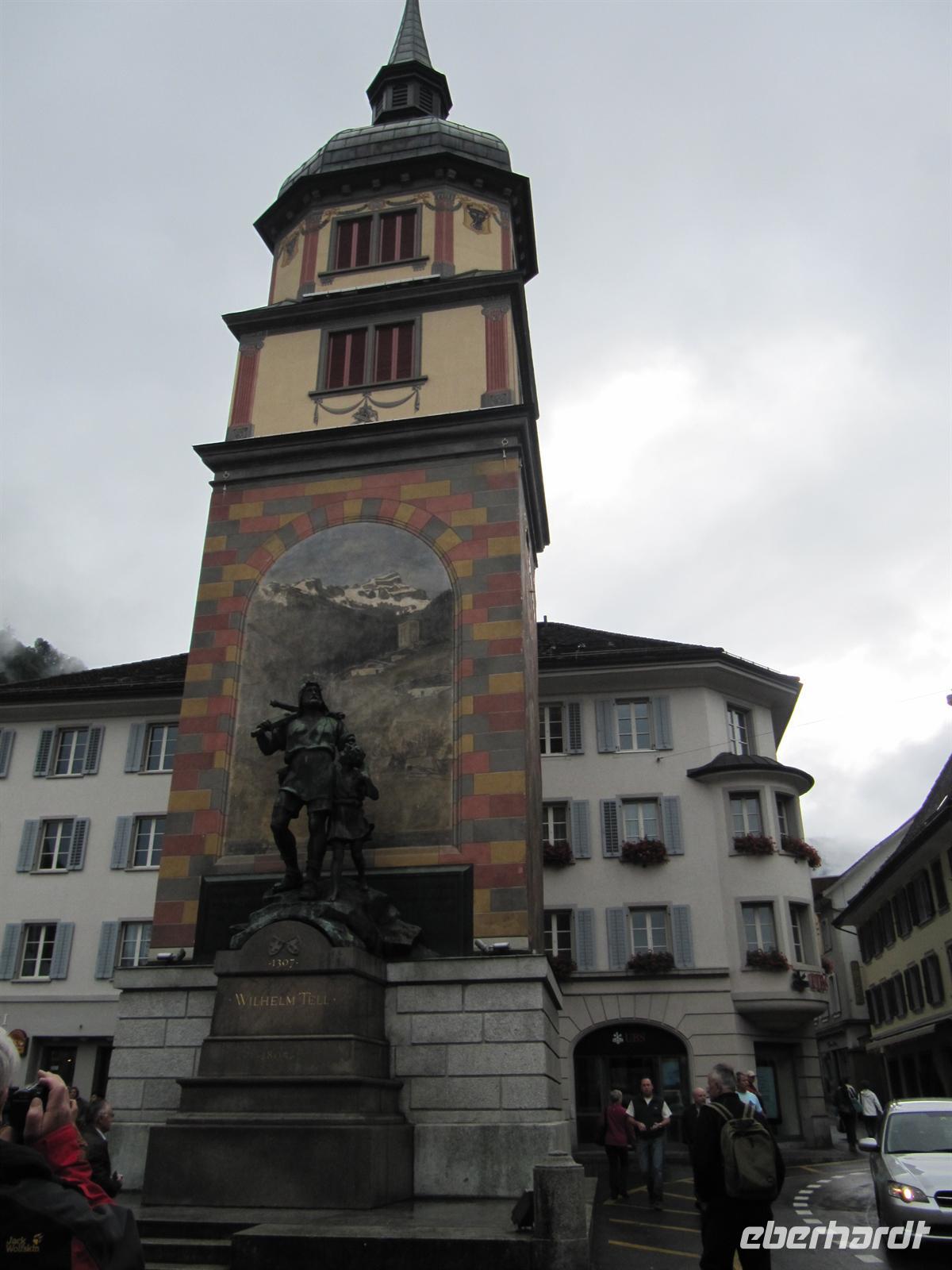 Engelberg verabschiedete sich von uns immer noch mit Regen und es hatte bis auf 1.600 Meter geschneit. Am Morgen waren alle Pässe gesperrt. Nun überlegten wir erst mal, wie wir zur Riederalp fahren. Wir entschlossen uns, zunächst entlang des Urner Sees nach Altdorf zu fahren. Rund um den Urner See liegen die Orte, wo sich die Tellsgeschichte abgespielt haben soll. In Altdor befindet sich das Tell-Denkmal an der Stelle, wo sich die Apfelschuss-Szene der berühmten Tell-Geschichte zugetragen haben soll. Vor dem mittelalterlichen Wohnturm mit einer Abbildung des Schächentals steht Wilhelm Tell mit seinem Sohn Walther. Anschließend spazierten wir zum Tell-Spielhaus. Hier wird seit 500 Jahren die Tellsgeschichte aufgeführt. Nun führte uns die Route zunächst weiter auf der Autobahn Richtung Süden. Inzwischen waren die Pässe wieder freigegeben und wir fuhren zur Schöllenenschlucht. An der Teufelsbrücke legten wir eine Pause ein. Der Legende nach wollten die Bewohner des Ursenentales eine Brücke über die Schlucht bauen und baten den Teufel um Hilfe. Er war einverstanden verlangte aber als Lohn die Seele des ersten Lebewesens, welches die Brücke überquert. Er dachte natürlich, dass ein Mensch als erster über die Brücke geht, aber die schlauen Erbauer der Brücke schickten als erstes einen Ziegenbock über die Brücke und der Teufel zog ab. Nun fuhren wir nach Andermatt und durch das Ursenen- und das Hospental zur Furkastraße. Über beeindruckende Serpentinen