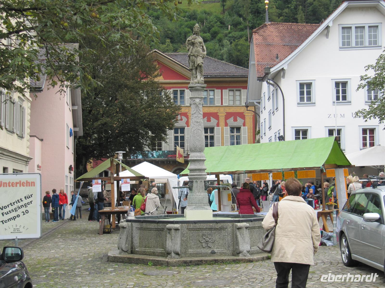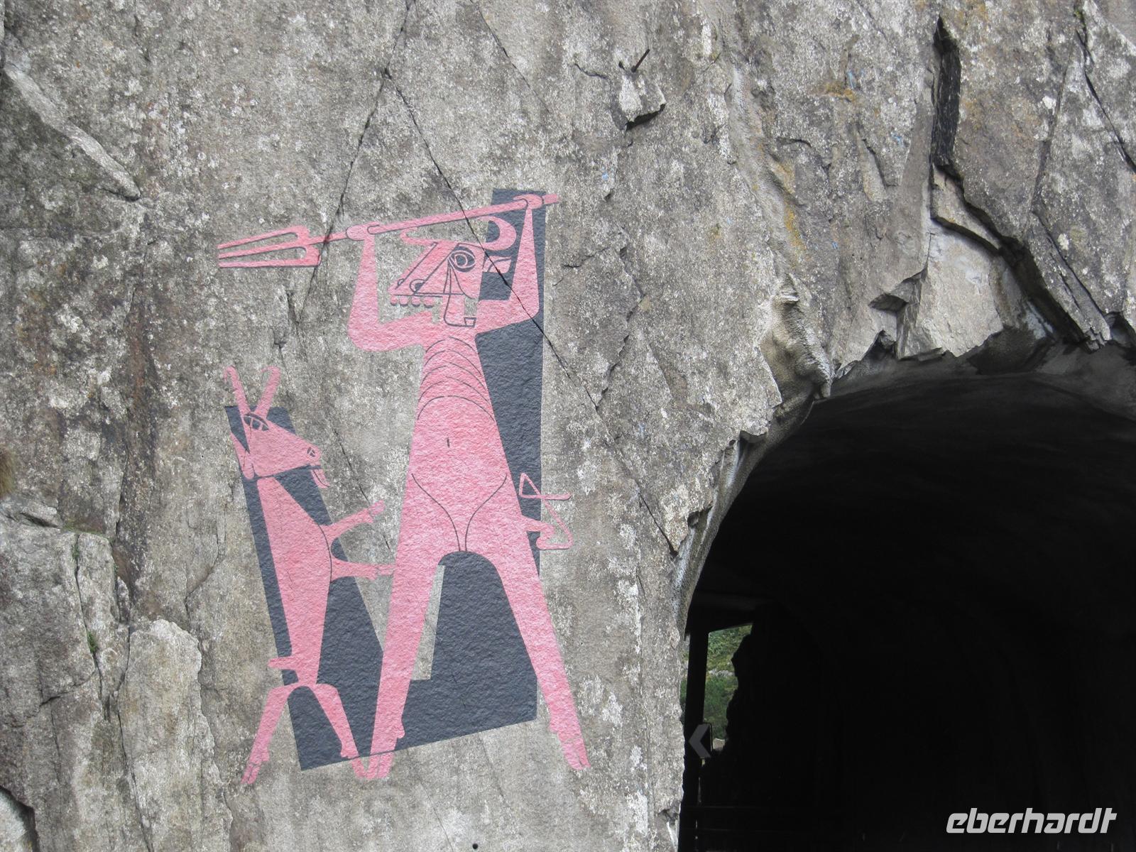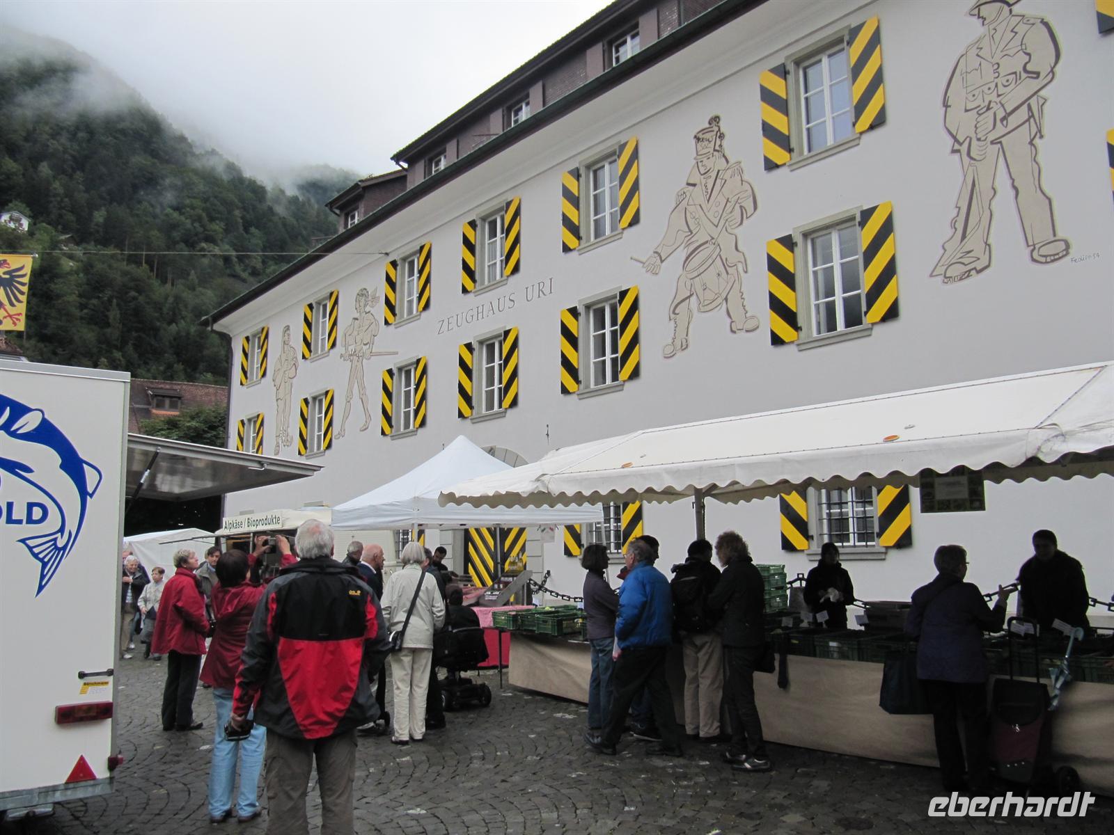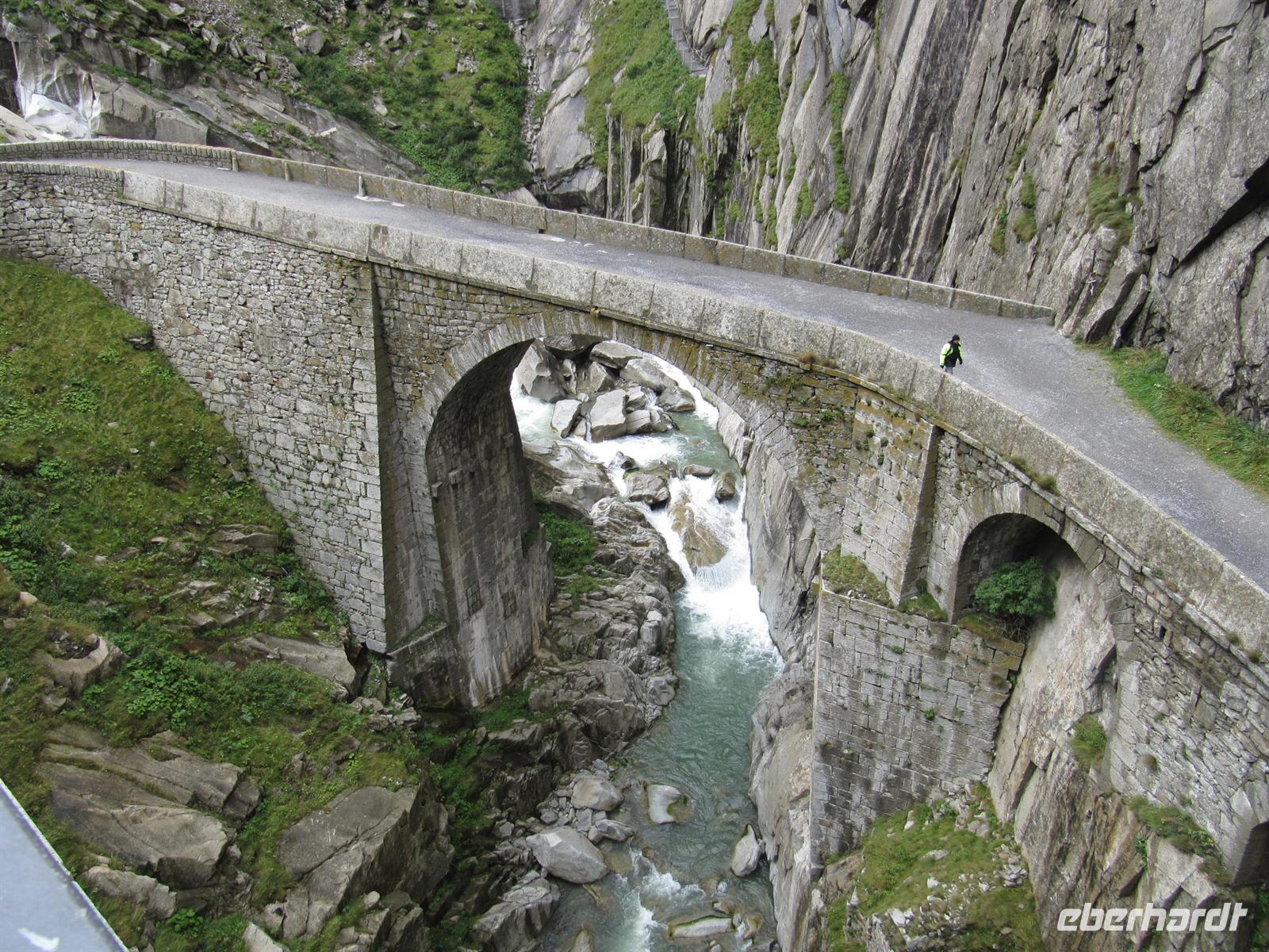 Engelberg verabschiedete sich von uns immer noch mit Regen und es hatte bis auf 1.600 Meter geschneit. Am Morgen waren alle Pässe gesperrt. Nun überlegten wir erst mal, wie wir zur Riederalp fahren. Wir entschlossen uns, zunächst entlang des Urner Sees nach Altdorf zu fahren. Rund um den Urner See liegen die Orte, wo sich die Tellsgeschichte abgespielt haben soll. In Altdor befindet sich das Tell-Denkmal an der Stelle, wo sich die Apfelschuss-Szene der berühmten Tell-Geschichte zugetragen haben soll. Vor dem mittelalterlichen Wohnturm mit einer Abbildung des Schächentals steht Wilhelm Tell mit seinem Sohn Walther. Anschließend spazierten wir zum Tell-Spielhaus. Hier wird seit 500 Jahren die Tellsgeschichte aufgeführt. Nun führte uns die Route zunächst weiter auf der Autobahn Richtung Süden. Inzwischen waren die Pässe wieder freigegeben und wir fuhren zur Schöllenenschlucht. An der Teufelsbrücke legten wir eine Pause ein. Der Legende nach wollten die Bewohner des Ursenentales eine Brücke über die Schlucht bauen und baten den Teufel um Hilfe. Er war einverstanden verlangte aber als Lohn die Seele des ersten Lebewesens, welches die Brücke überquert. Er dachte natürlich, dass ein Mensch als erster über die Brücke geht, aber die schlauen Erbauer der Brücke schickten als erstes einen Ziegenbock über die Brücke und der Teufel zog ab. Nun fuhren wir nach Andermatt und durch das Ursenen- und das Hospental zur Furkastraße. Über beeindruckende Serpentinen