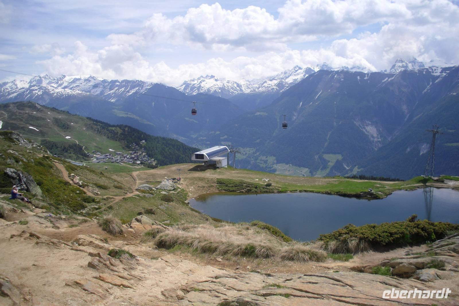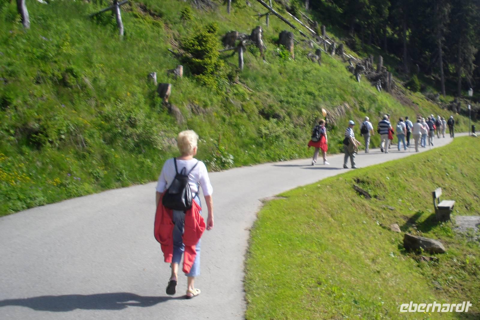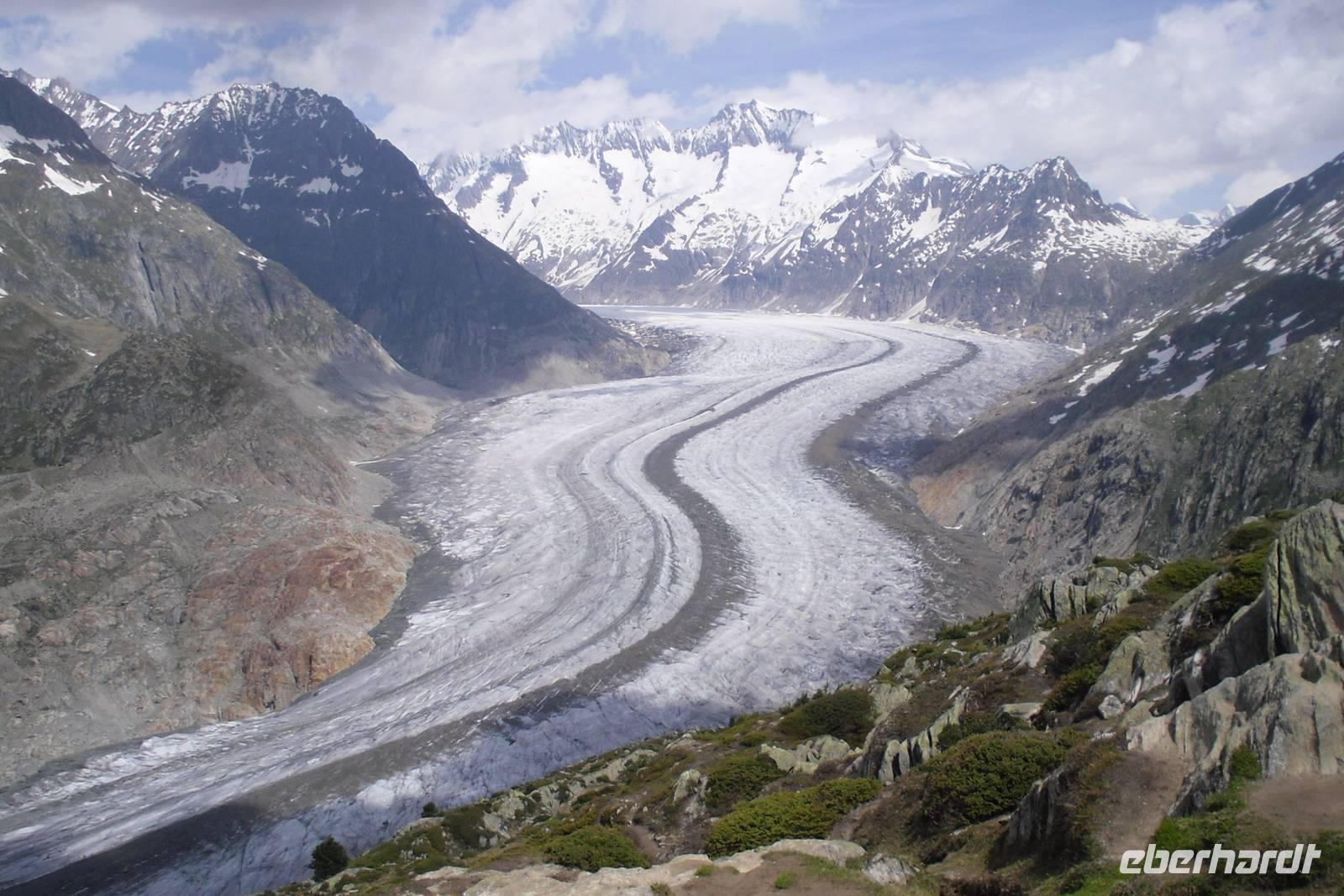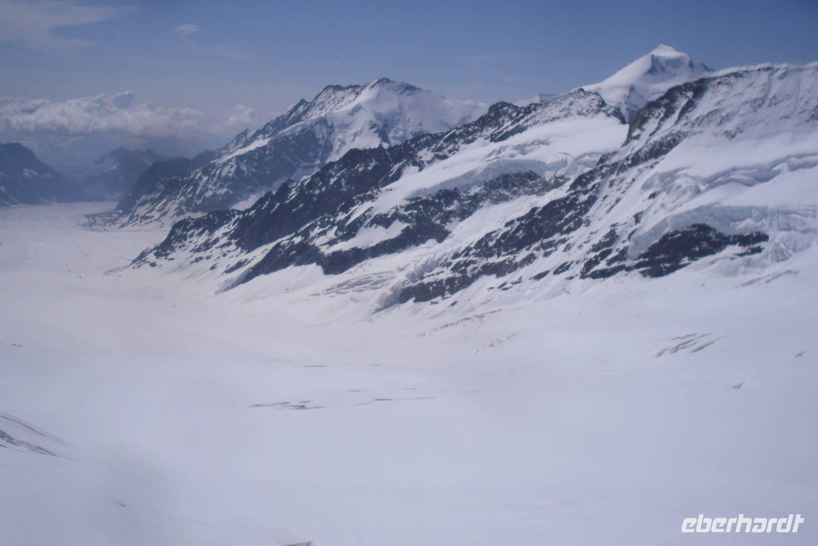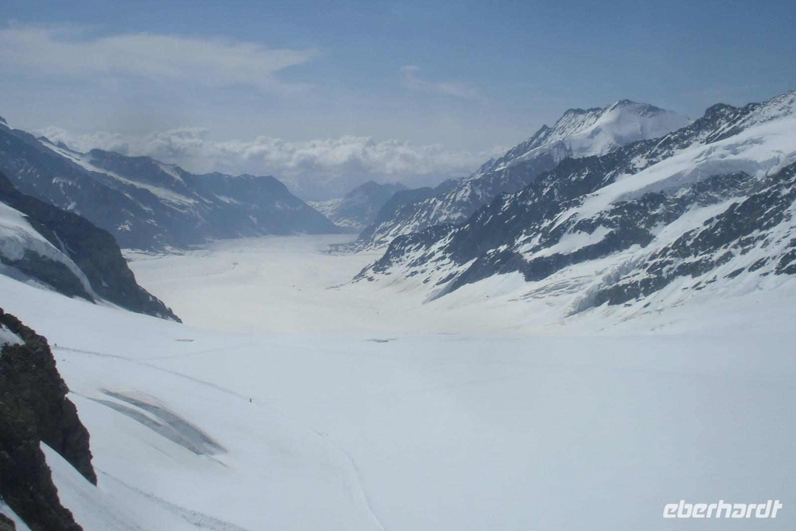 Nach einem reichhaltigen Frühstück machten wir uns zu einer gemeinsamen Wanderung zur benachbarten Bettmeralp auf - wir nahmen die bequeme und asphaltierte Straße. Nach einer reichlichen Stunde erreichten wir dann die Bahnstation zum Bettmerhorn. Mit einer Umlaufbahn ging es weiter hinauf und nach weiteren 15 Minuten kamen wir dann schließlich oben auf dem Bettmerhorn an. Von hier aus genießt man einen grandiosen Blick auf den etwa 23 Kilometer langen Aletschgletscher, den längsten Gletscher der Alpen und auf die Berner Alpen mit Eiger, Mönch und Jungfrau. Wir waren begeistert, denn auch der Wettergott spielte heute wieder voll mit! Wir nutzten auch die Gelegenheit zum Besuch der Ausstellung "Faszination Aletsch" - unbedingt empfehlenswert! Den Rückweg zur Riederalp gestalteten wir ganz individuell, denn es gibt hier unzählige Wandermöglichkeiten. Ein Teil der Gruppe wanderte beispielsweise ein Stück dem Bettmersee entlang und dann einen herrlichen Panoramaweg hinüber zur Riederalp - vor allem die Botaniker kamen hier voll auf ihre Kosten - Alpenpflanzen aller Art und in verschiedenen Farben! Wir erfreuten uns heute einfach an der Natur und der Idylle hier oben! Der Nachmittag stand zur freien Verfügung und so manch einer nutzte die Annehmlichkeiten unseres Hotels, denn dieses verfügte auch über ein kleines Hallenbad und einen Wellness-Bereich mit Sauna. Zum Abendessen sahen wir uns alle wieder und tauschten uns über die herrlichen Eindrücke des Tages aus. Auch der Hotelier Art Furrer besuchte uns - ein ganz besonderes Highlight, denn die meisten Gäste kannten ihn schließlich bisher nur aus dem Fernsehen!