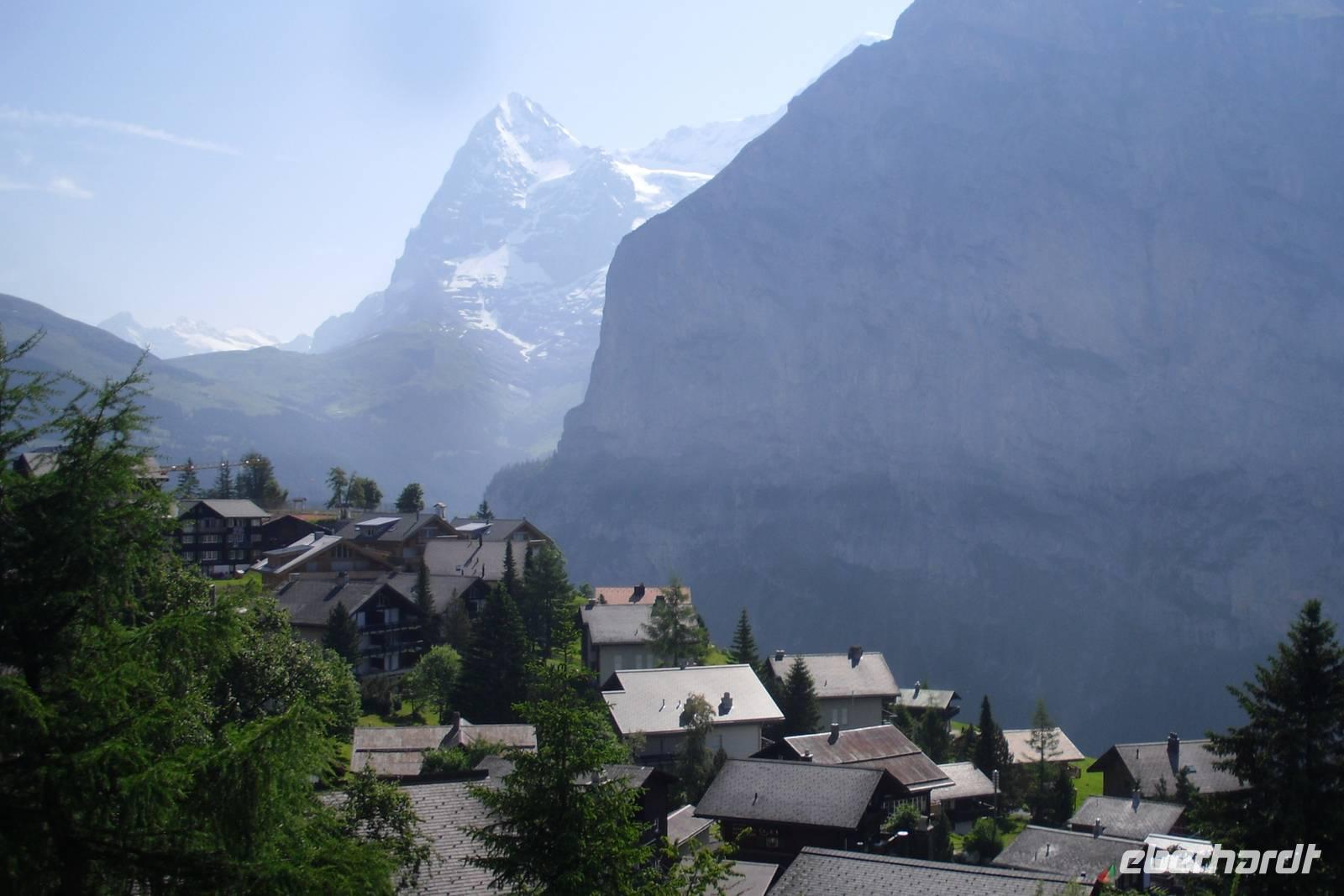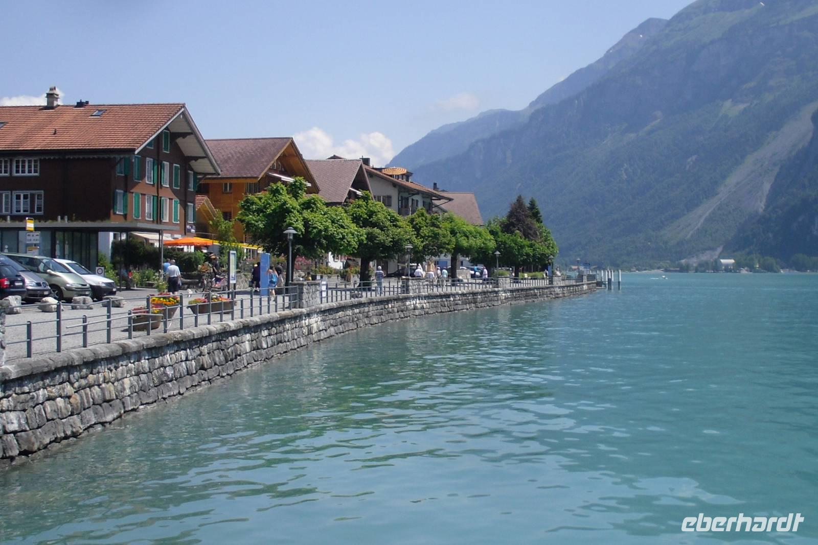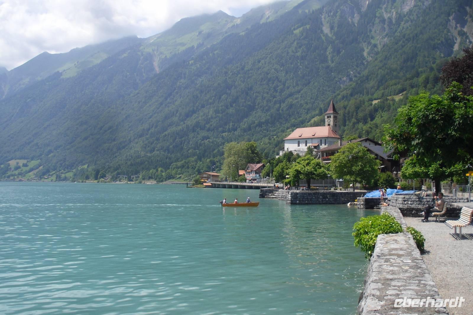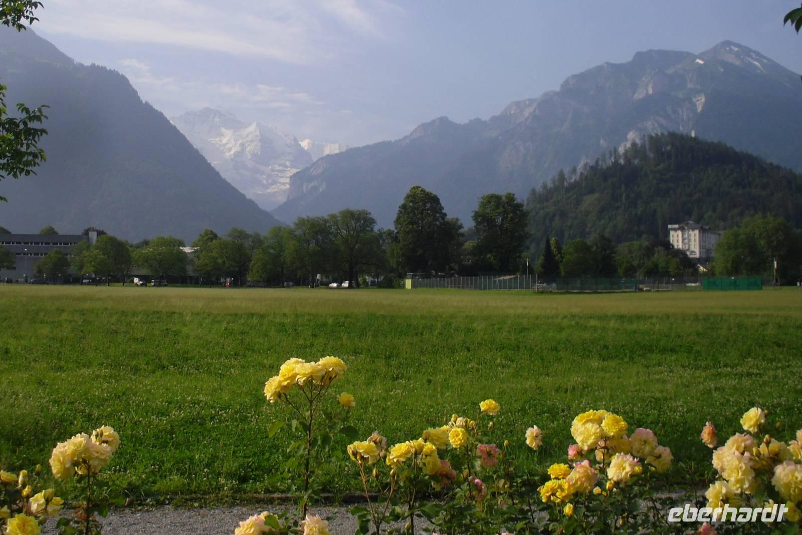 Unsere Zeit in Zermatt war nun auch schon wieder vorüber. Gut gelaunt und mit herrlichen Gebirgserlebnissen im Gepäck fuhren wir am Morgen mit dem Pendelzug nach Täsch, wo uns unser Bus mitsamt unserem Gepäck bereits erwartete. Endlich wieder mal Bus fahren..., zwei Tage mit mehr oder weniger langen Wanderstrecken lagen hinter uns - einigen war die Müdigkeit anzusehen. Wir fuhren ins Rhonetal und dann weiter über Brig und Fiesch im Goms zum 2.165 Meter hohen Grimselpass. Auf der Passhöhe machen wir einen längeren Halt und die meisten von uns besuchten den hiesigen Murmeltierpark. Weiter ging es nun vorbei am Grimsel- und Räterichsbodensee hinunter ins Haslital, vorbei an der Aareschlucht und Meiringen ins Holzschnitzerdorf Brienz. Am Nachmittag bummelten wir hier am Brienzer See entlang oder besuchten eine der zahlreichen Holzschnitzereien. Entlang der Norduferseite des Brienzer Sees gelangten wir nach Interlaken. Am Nachmittag erreichten wir schließlich unser Hotel "Carlton-Europe". Hier sollten wir nun die letzten drei Nächte unserer Traumreise durch die Schweiz verbringen. Interlaken, zwischen dem Brienzer und dem Thuner See gelegen, war einfach der ideale Ausgangspunkt für unser Ausflugsprogramm in die Jungfrau-Region.