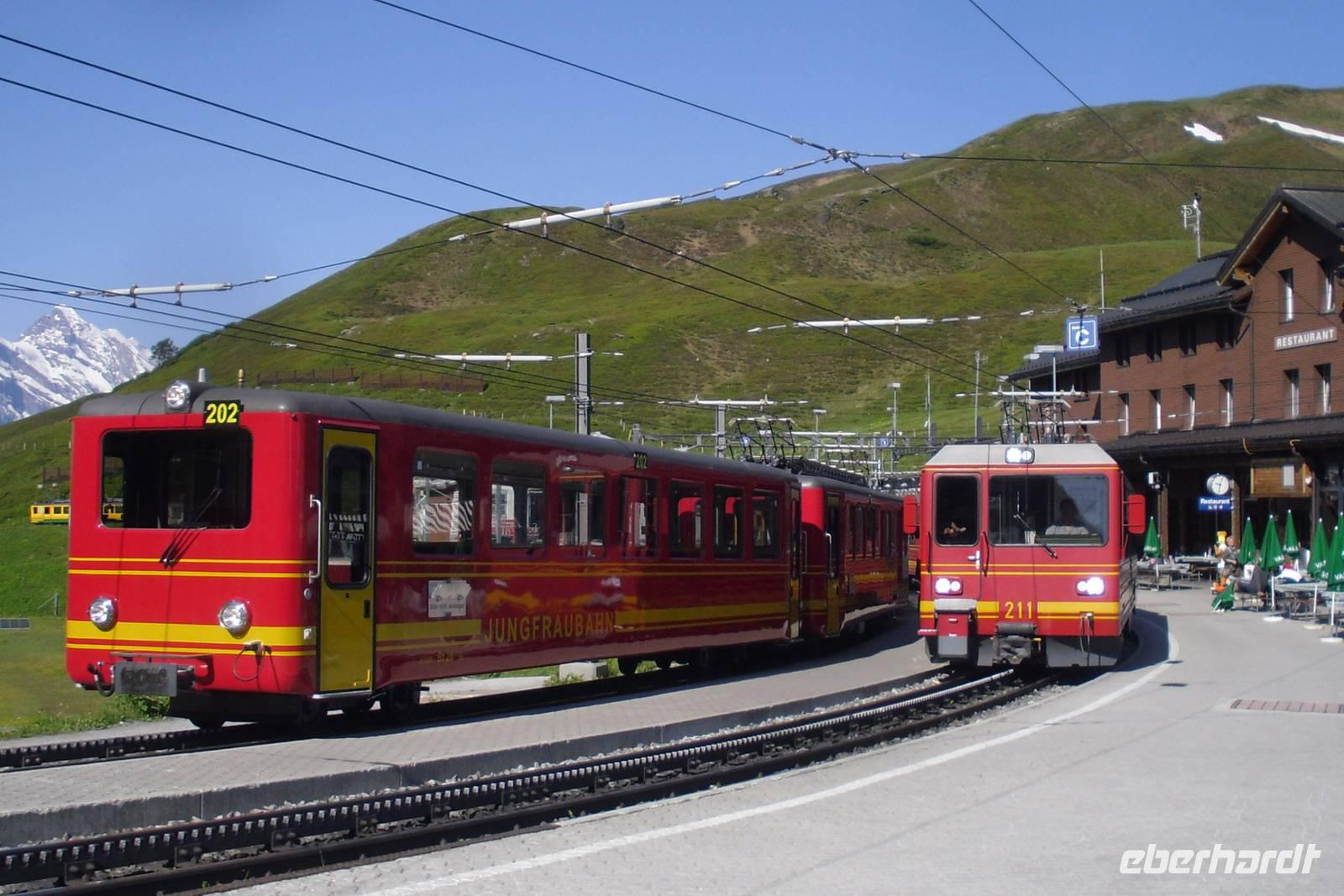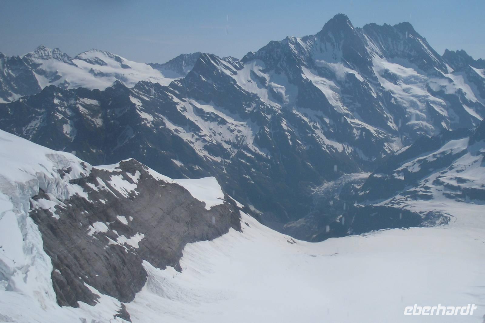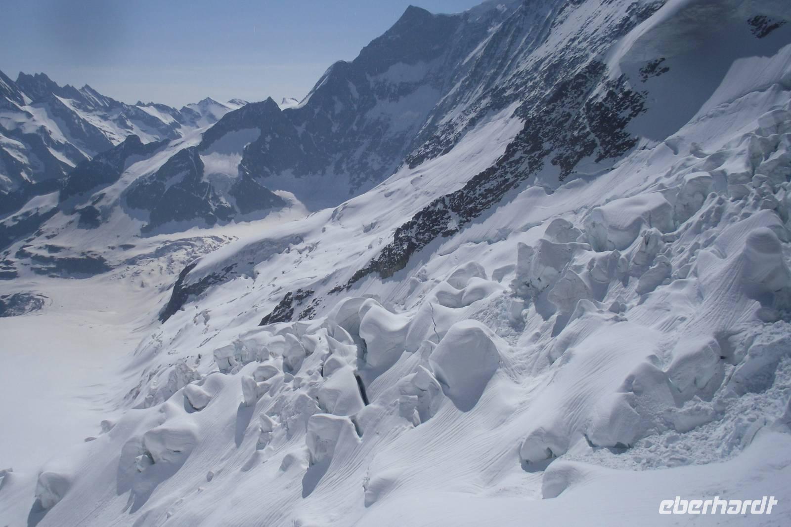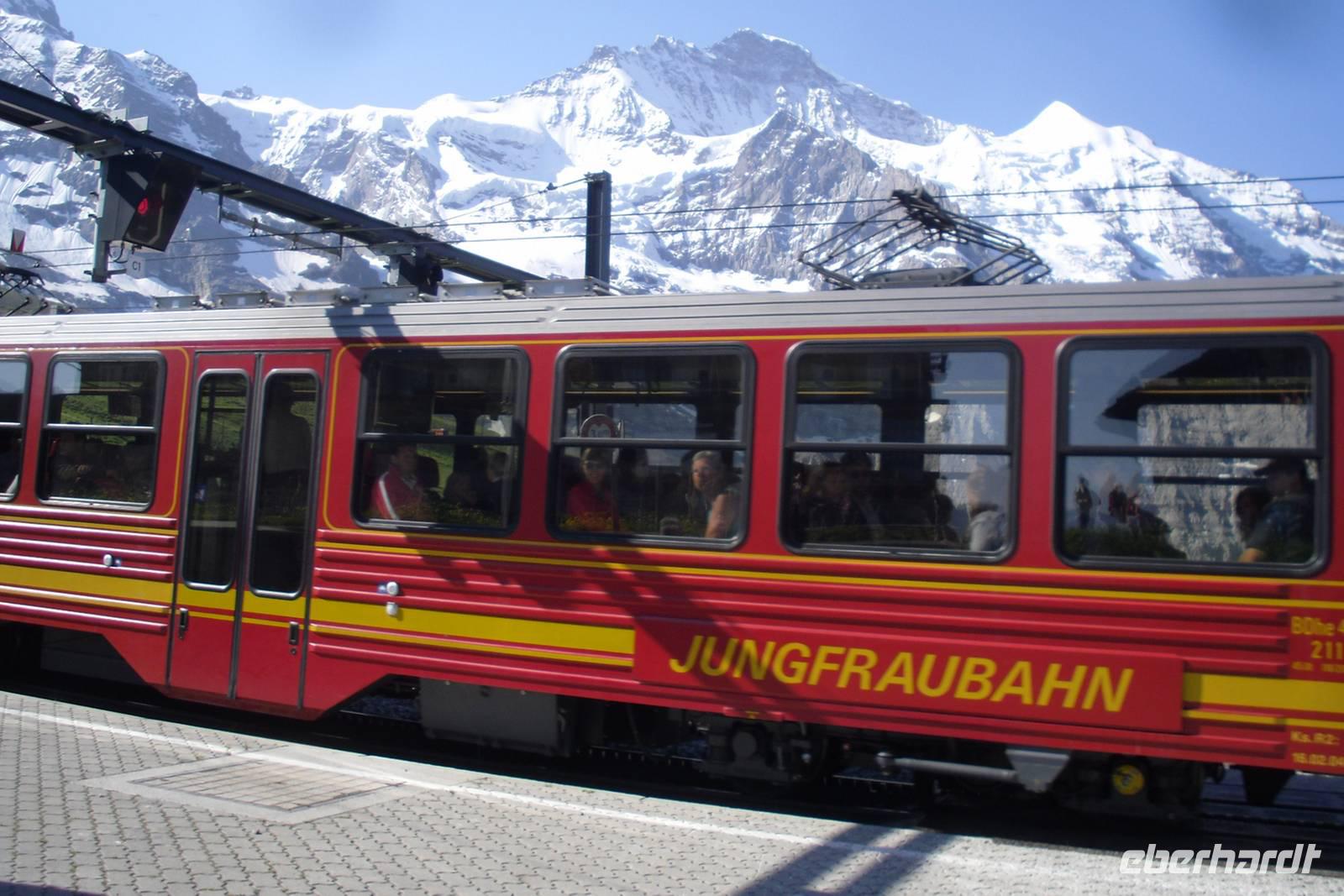 Mit wiederum perfekten Wetteraussichten ging es gleich früh in das südlich von Interlaken gelegene Lauterbrunnental. Unser Bus brachte uns zum Bahnhof von Lauterbrunnen und von dort aus setzten wir unsere Fahrt mit der Wengernalpbahn bis zur Kleinen Scheidegg und schließlich mit der Jungfraubahn zum Jungfraujoch fort. Es handelt sich hier um den höchstgelegenen Schienenbahnhof Europas - 3.454 Meter über dem Meer! Die Luft ist hier oben ziemlich dünn und überall wird man darauf hingewiesen, dass man langsam gehen sollte. Die meisten von uns besuchten zuerst die Sphinx-Terrassen - einzigartige Aussichten auf die umliegenden Berge und Gletscher erwarteten uns - einfach grandios und nicht mit Worten zu beschreiben, zumal kaum ein Wölkchen den Himmel trübte! Der Rundweg führte uns anschließend weiter zum Eispalast, hier findet man herrliche Eisskulpturen - allerdings aufgepasst, es ist teilweise ziemlich glatt hier...! Nach einem etwa knapp 4-stündigen Aufenthalt fuhren wir mit der Jungfraubahn zurück auf die Kleine Scheidegg und von dort erreichten wir mit der Wengernalpbahn am späten Nachmittag das "Gletscherdorf" Grindelwald, einem der meist besuchten Luftkurorte und Wintersportplätze des Berner Oberlandes. Der Ort auf etwa 1.000 Metern liegt weit verstreut auf den Matten des Talhangs der Schwarzen Lütschine. Unser Bus stand schließlich am Bahnhof "Grindelwald-Grund" für uns zur Abholung bereit. Wir waren alle ziemlich müde, denn die Höhenunterschiede der letzten Tage machten sich jetzt bemerkbar. Mit herrlichen Gebirgserlebnissen ausgestattet, erreichten wir am frühen Abend erneut unser Hotel in Interlaken.
