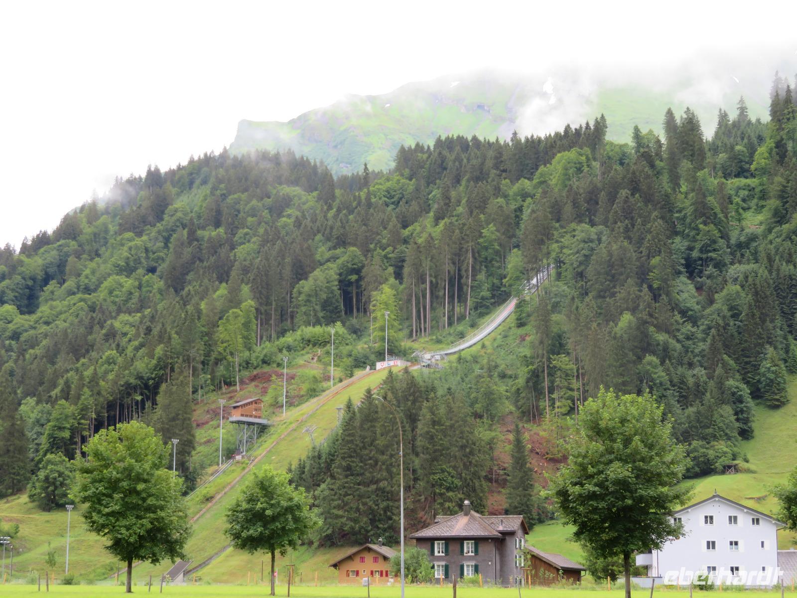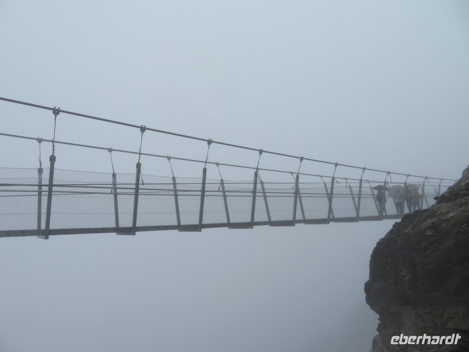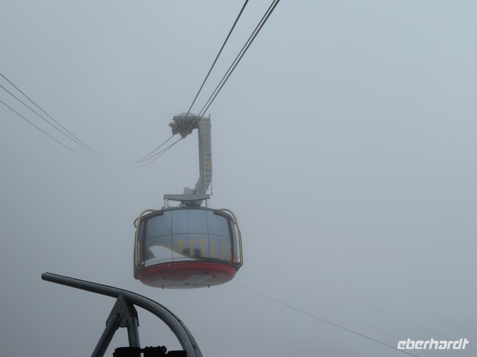 Entlang der Engelberger Ar gehen wir zur Talstation der Titlisbahn. Mit der Umlaufgondelbahn fahren wir zunächst bis zur Station Trübsee. Wir gehen auf die Terrasse des Restaurants und werfen einen Blick auf den Trübsee. Aber leider regnet es auch hier. Also geht es mit der Gondelbahn wieter zur Station Stand. Wir wechseln die Bahn und steigen in die Kabine der Rotair. Diese runde Gondel dreht sich während der Fahrt zum Gipfel des Titlis einmal um ihre eigene Achse. Leider läuft auch hier das Programm: „Wie Sie sehen, sehen Sie nichts". Der Gipfel liegt in dicken Regenwolken und die herrliche Sicht vom Gipfel in 3.020 Metern Höhe auf die umliegenden Berge bleibt uns verwährt. Wir besuchen die Gletschergrotte, welche sich ca. 20 Meter unter der Oberfläche befindet. Eine Fahrt mit dem IceFlyer über den Gletscher lohnt nicht. Einige Gäste wagen den Gang über die Hängebrücke. Wir verlassen den Berg und fahren zur Station Trübsee zurück. Eigentlich wollen wir auf dem schönen Wanderweg um den See wandern. Doch inzwischen sind die Wolken soweit runter gezogen, dass wir den See von der Station gar nicht mehr sehen können. Also entscheiden wir uns zur Rückkehr nach Engelberg. Den Nachmittag verbringen wir mit einem Bummel in Engelberg.