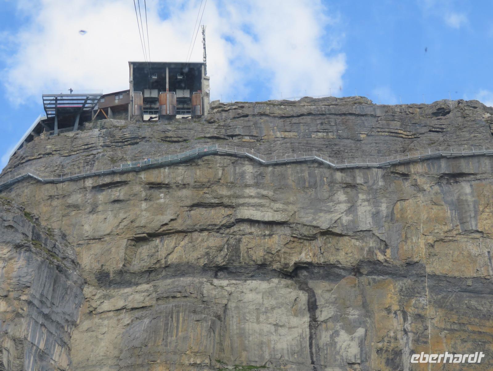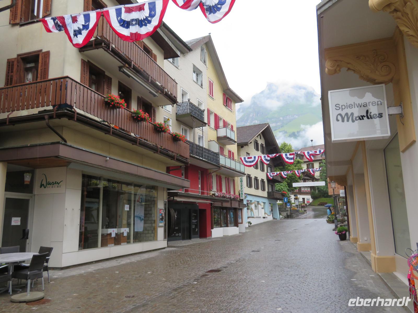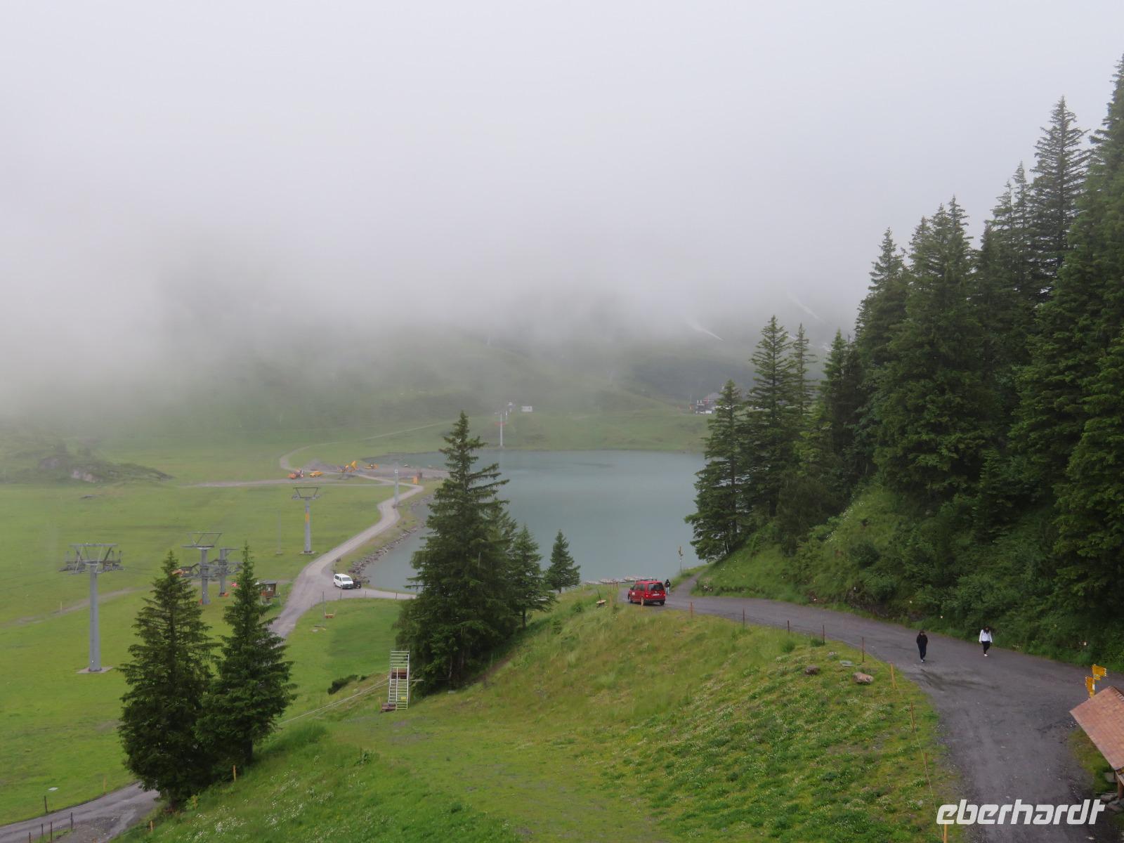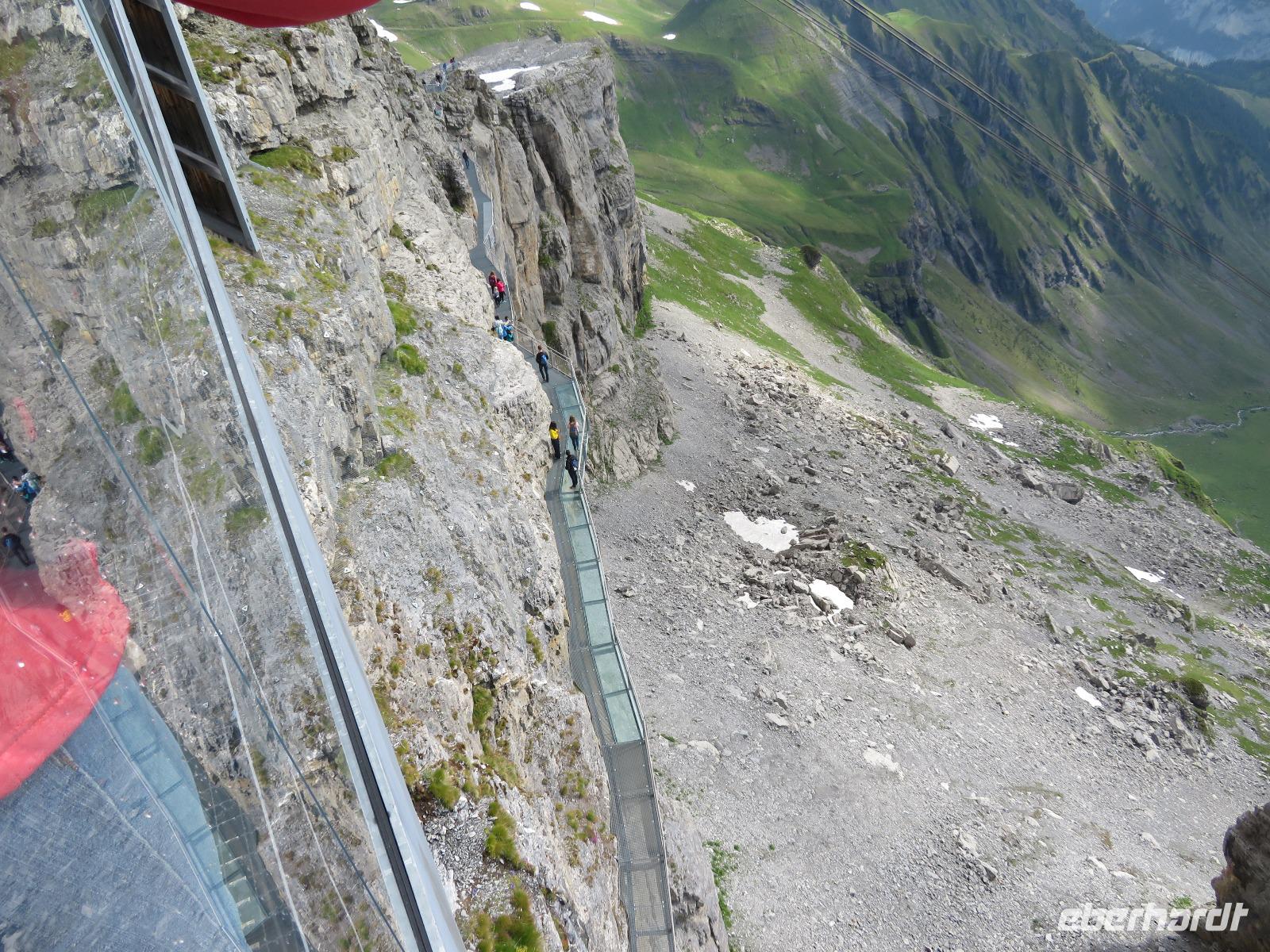 Entlang der Engelberger Ar gehen wir zur Talstation der Titlisbahn. Mit der Umlaufgondelbahn fahren wir zunächst bis zur Station Trübsee. Wir gehen auf die Terrasse des Restaurants und werfen einen Blick auf den Trübsee. Aber leider regnet es auch hier. Also geht es mit der Gondelbahn wieter zur Station Stand. Wir wechseln die Bahn und steigen in die Kabine der Rotair. Diese runde Gondel dreht sich während der Fahrt zum Gipfel des Titlis einmal um ihre eigene Achse. Leider läuft auch hier das Programm: „Wie Sie sehen, sehen Sie nichts". Der Gipfel liegt in dicken Regenwolken und die herrliche Sicht vom Gipfel in 3.020 Metern Höhe auf die umliegenden Berge bleibt uns verwährt. Wir besuchen die Gletschergrotte, welche sich ca. 20 Meter unter der Oberfläche befindet. Eine Fahrt mit dem IceFlyer über den Gletscher lohnt nicht. Einige Gäste wagen den Gang über die Hängebrücke. Wir verlassen den Berg und fahren zur Station Trübsee zurück. Eigentlich wollen wir auf dem schönen Wanderweg um den See wandern. Doch inzwischen sind die Wolken soweit runter gezogen, dass wir den See von der Station gar nicht mehr sehen können. Also entscheiden wir uns zur Rückkehr nach Engelberg. Den Nachmittag verbringen wir mit einem Bummel in Engelberg.