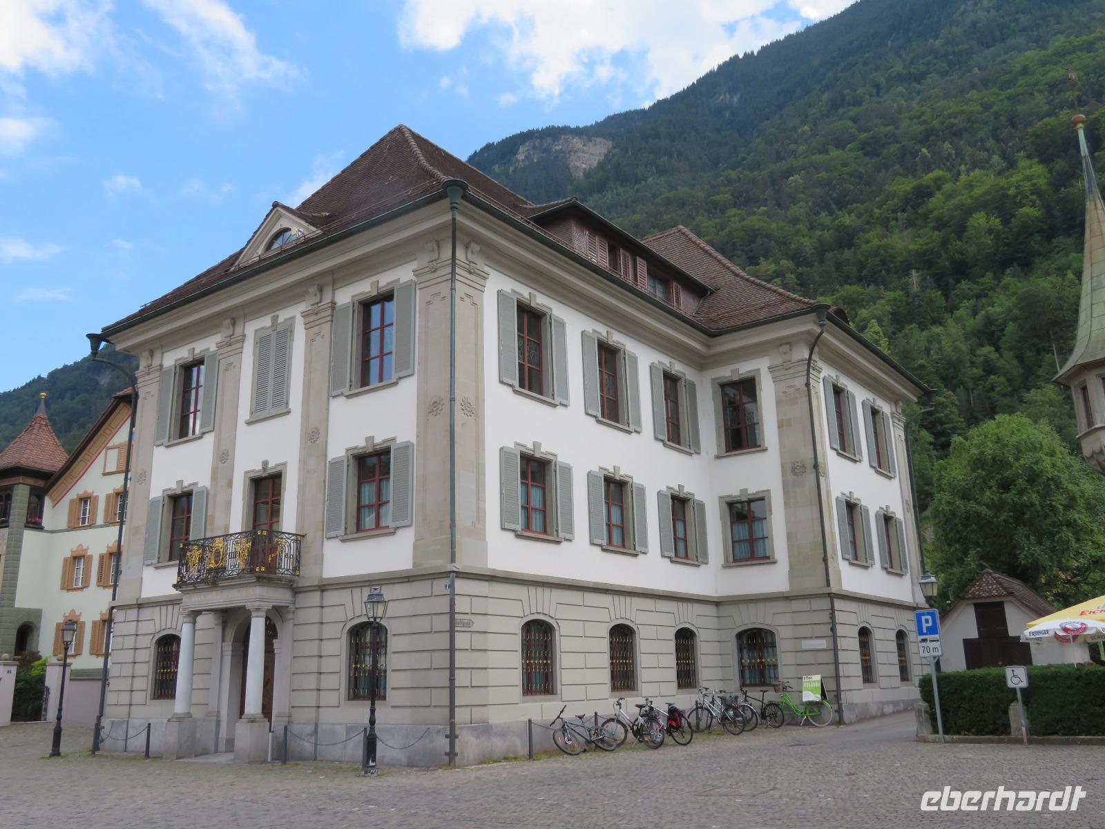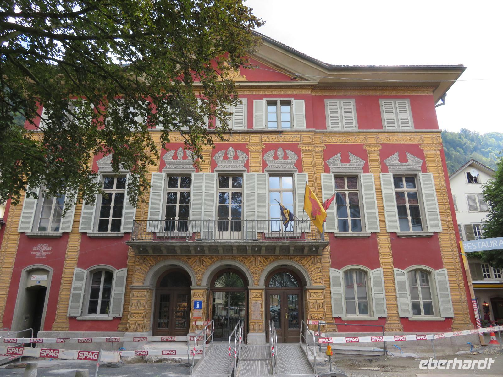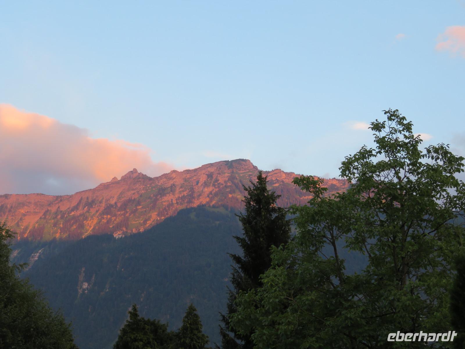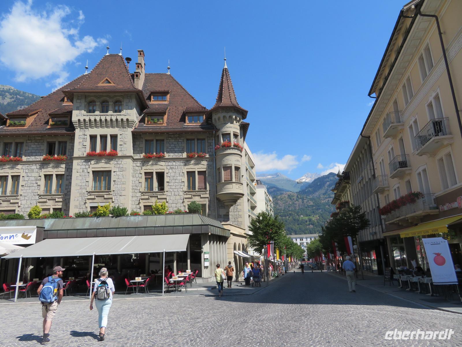 Heute heißt es nun Abschied nehmen von Zermatt und dem Matterhorn bei Traumwetter. Wir spazieren zum Bahnhof und der Pendelzug der Matterhorn-Gotthard-Bahn bringt uns zurück nach Täsch. Unser Chauffeur Ingo erwartet uns bereits mit dem Bus und wir beginnen unsere Panoramafahrt ins Berner Oberland. Zunächst geht es durch das Mattertal ins Rhônetal. An der Hängebrücke Fürgangen-Mühlebach legen wir einen kurzen Stopp ein. Einige gehen auf die Brücke die sich in 92 Metern Höhe 280 Meter lang über die Lammaschlucht spannt. Uns führt unsere Reise durch das liebliche Goms. Wir fahren durch die hübschen Dörfer mit den typischen Walliser Holzhäusern. In Niederwald, dem Geburtsort von Cäsar Ritz, dem großen Hotelier, machen wir eine Pause. Wir besuchen den Ortskern und sehen die schönen Häuser. Wir besuchen das Grab der Familie Ritz auf dem Friedhof an der prunkvollen Kirche. In diesem Jahr begeht der Ort den 100.Todestag von Cesar Ritz. Anschließend geht es nunins Grimselgebiet. Von Oberwald reisen wir nach Gletsch. Die Furka- und die Grimselpassstraße treffen hier zusammen. Es ist ein atemberaubender Anblick bei einmaliger Sicht, wie sich beide Straßen die Berge hinaufwinden. Unser Bus muss nun klettern, denn es geht auf den Grimselpass. In 2.164 Metern Höhe angekommen legen wir einen Foto-Stopp ein. Anschließend fahren wir wieder über die Kehren und Kurven hinab Richtung Berner Oberland. Am Käsestand von Judith machen wir unsere Mittagspause. Mit einem kleinen Käseimbiss mit gutem Walliser Wein werden wir überrascht. Wir geniessen die Ausblicke in die wunderschöne Bergwelt. Die Landschaft des Grimselgebietes ist faszinierend. Die Region ist auch das Wasserschloss der Schweiz, denn hier wird Energie aus Wasserkraft gewonnen. Wir fahren weiter ins Haslital und durch Meiringen. Hier lebte einst Arthur Canendoyle und schrieb einige seiner Sherlock Homes Romane. Durch das Haslital erreichen wir Brienz, das Holzschnitzerdorf am Nordufer des smaragdgrünen Brienzer Sees. Es bleibt genügend Zeit zu einem Spaziergang am Ufer des Sees. Entlang des Sees fahren wir nach Interlaken. Im Hotel „Carlton-Europe" werden wir bereits erwartet. Wir beziehen unsere Zimmer und haben vor dem Abendessen noch Zeit für erste Erkundungen in Interlaken.