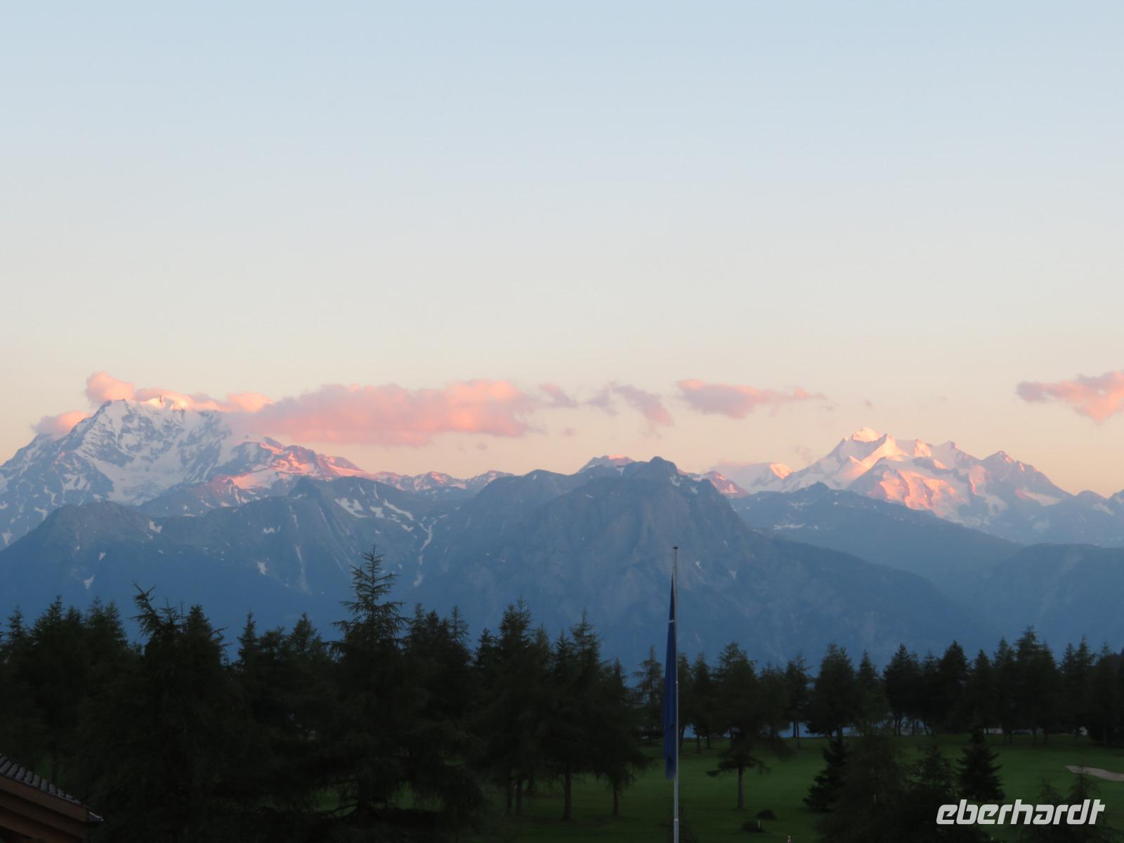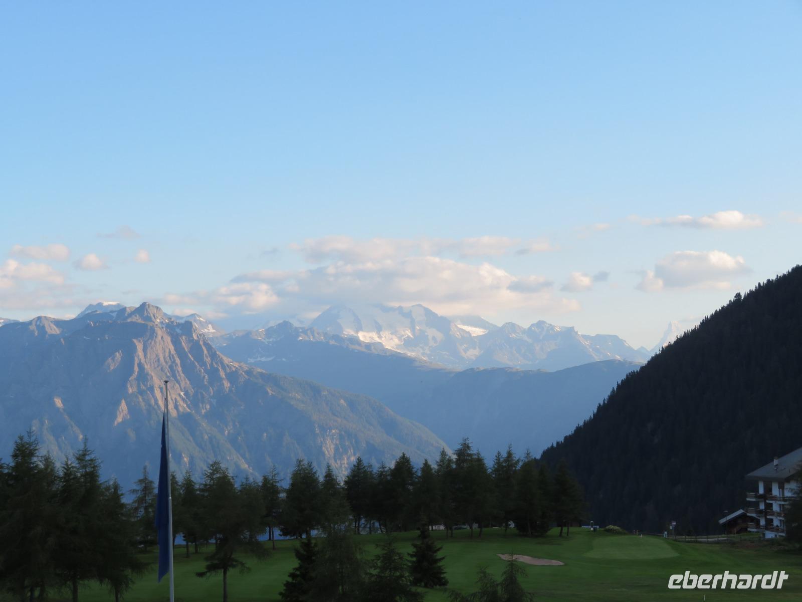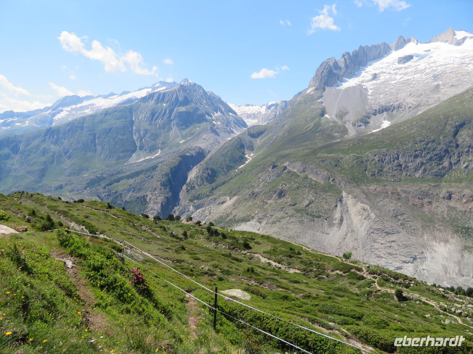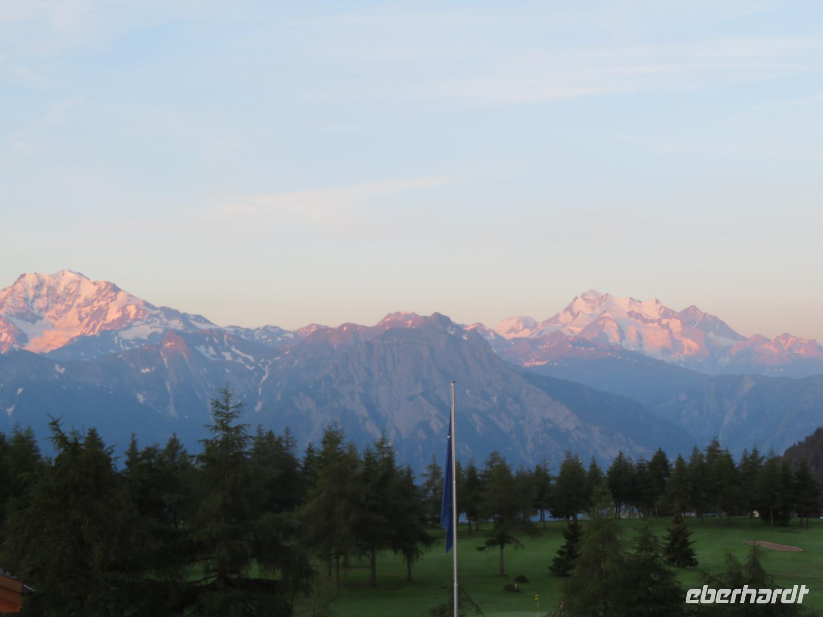 Uns weckt heute strahlender Sonnenschein. Wir freuen uns auf einen erlebnisreichen Tag. Gemeinsam wandern wir Gästen über die Promenade Richtung Bettmeralp. Schon während der Wanderung bewundern wir das fantastische Panorama und erfreuen uns an der herrlichen Pracht der bunten Bergblumen. Die Gondelbahn bringt uns auf das Bettmerhorn auf 2.647 Meter Höhe. Wir befinden uns mitten im UNESCO-Weltnaturerbe „Jungfrau-Aletsch-Bietschhorn". Zunächst stockt uns der Atem im Angesicht des einmaligen Panoramas, welches uns auf der Terrasse des Restaurants eröffnet. Vom Mont Blanc über das markante Weisshorn und natürlich das Matterhorn, den Dom und die Monte Rosa Gruppe mit der Duforspitze bis hin zum Monte Leone liegt die gesamte Alpenkette im strahlenden Sonnenschein ohne ein Wölkchen am Himmel vor uns. Wir können uns kaum von diesem Anblick loslösen. Immer wieder klicken die Auslöser der Kameras. Aber es gibt ja noch mehr zu sehen. Wir gehen zum Aussichtspunkt hoch über dem Aletschgletscher. Er leigt uns zu Füßen und wir sehen auch hier, wie sich die Gletscher zurückziehen. Der Aletschgletscher ist mit 23 Kilometern der längste Gletscher der Alpen. In der Ausstellung „Faszination Aletsch" erfahren wir interessante Details zum Gletscher. Nach einem ausgiebigen Aufenthalt auf dem Berg fahren wir mit der Gondelbahn zur Bettmeralp. Einige Gäste nutzten den Tag für individuelleTouren zurück zur Riederalp. Mit einer größeren Gruppe wandern wir vorbei am Bettmersee zurück zur Gopplerlücke. Auch dabei genießen wir immer wieder die einzigartige Bergwelt. Durch bunte Wiesen mit wilden Orchideen, Alpenklee, Habichtskraut, Bergmagariten, Alpen-Glockenblumen und anderen Blumen führt uns die Tour über den Herrenweg zur Riederalp. Wir alle genießen diese schöne Wanderung. Auf der Riederalp angekommen, fahren wir mit der Gondelbahn auf die Moosfluh. Vom Aussichtspunkt bietet sich uns aus einer ganz anderen Perspektive ein toller Blick auf den Aletschgletscher und dessen Gletscherzunge. Den restlichen Nachmittag nutzen wir zum Entspannen im Hallenbad oder um einfach vom Balkon aus die Blicke und Gedanken in die wunderschöne Bergwelt schweifen zu lassen. Wir sind uns einig: Ein herrlicher Tag geht zu Ende!