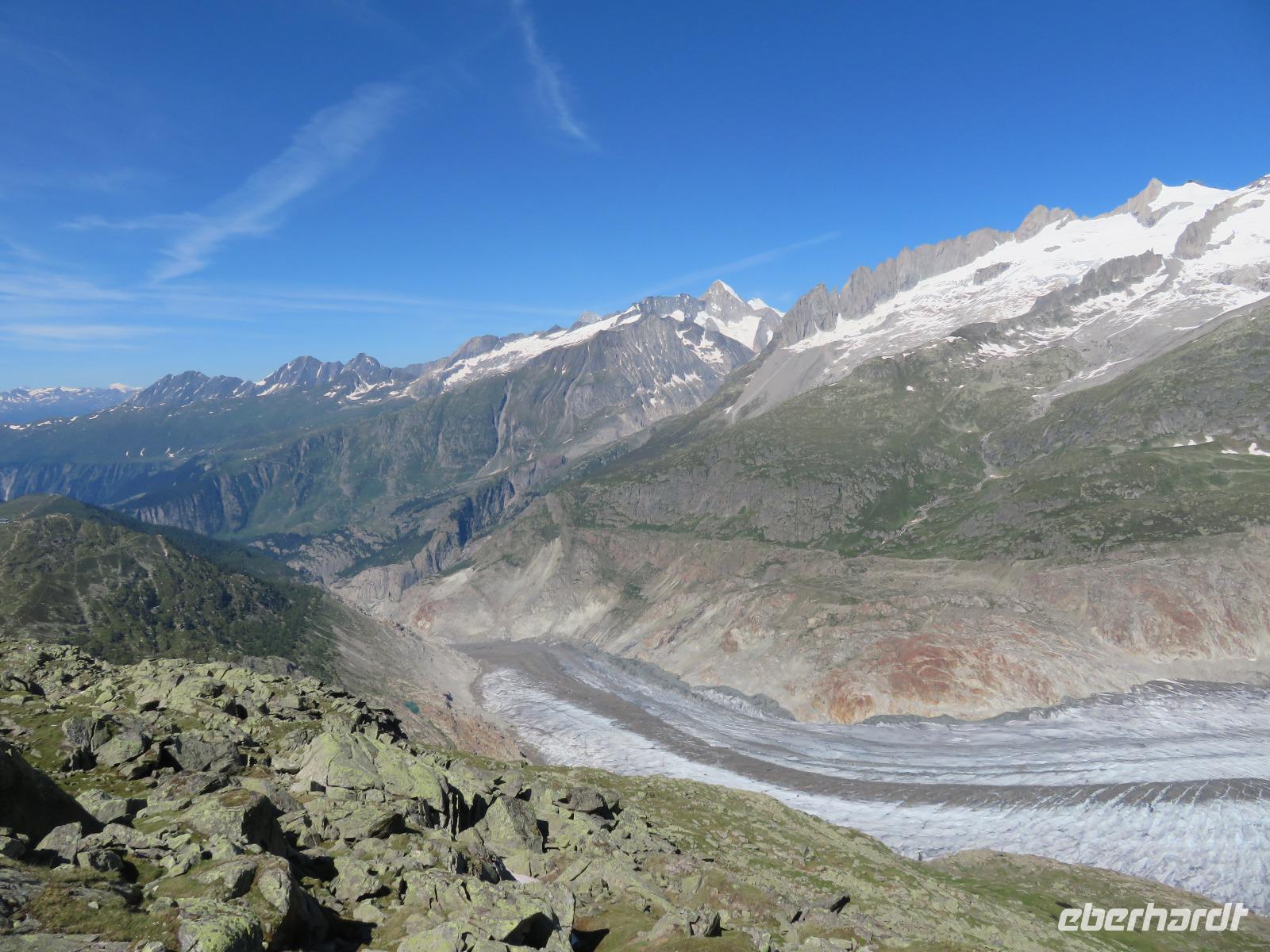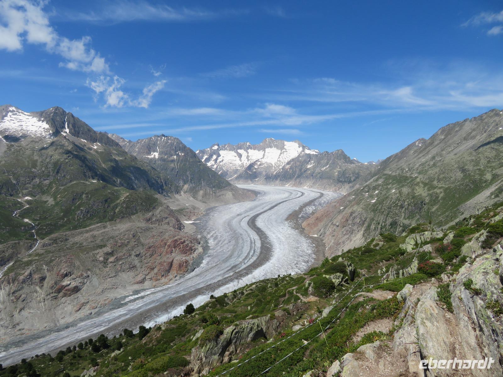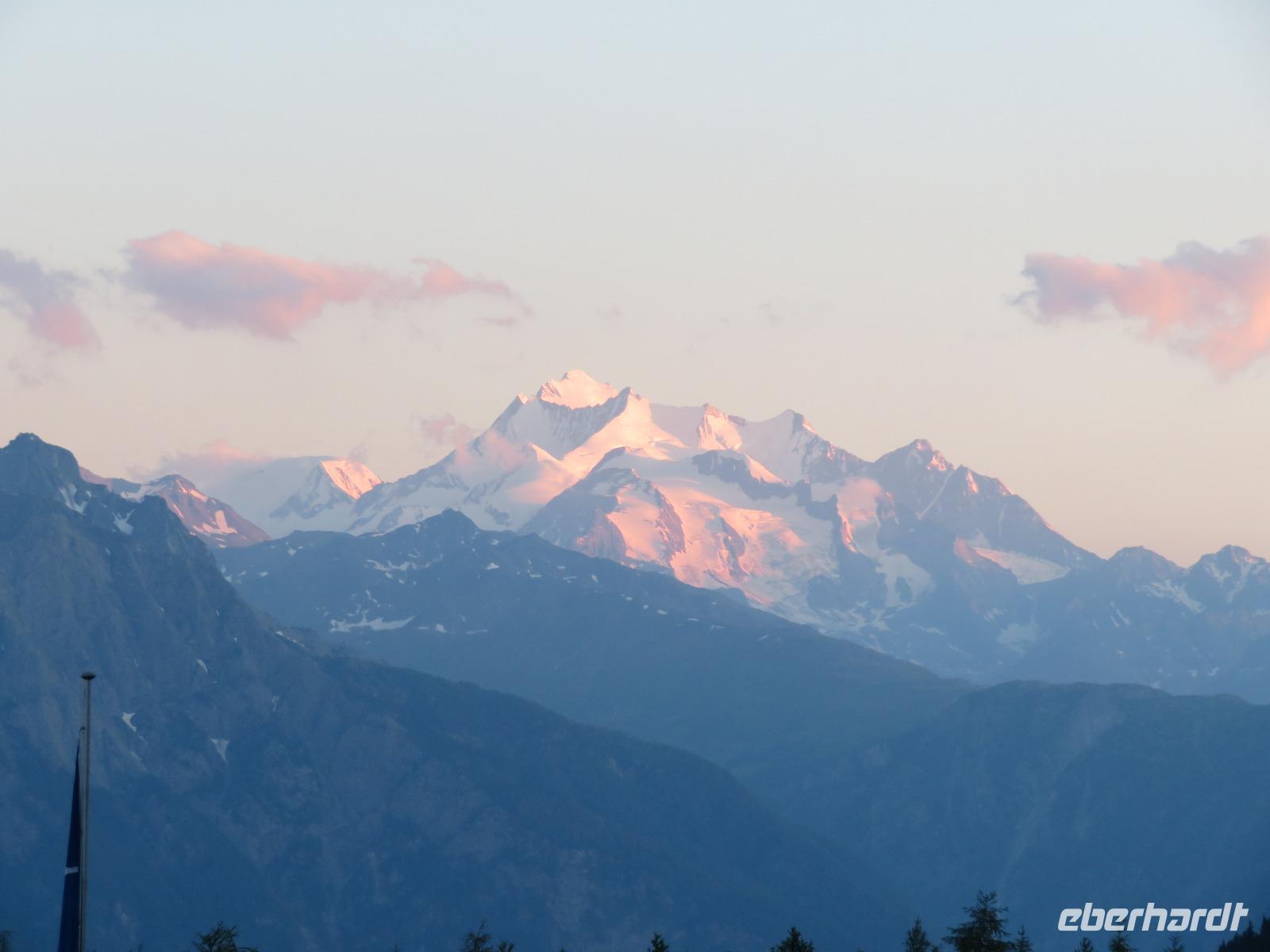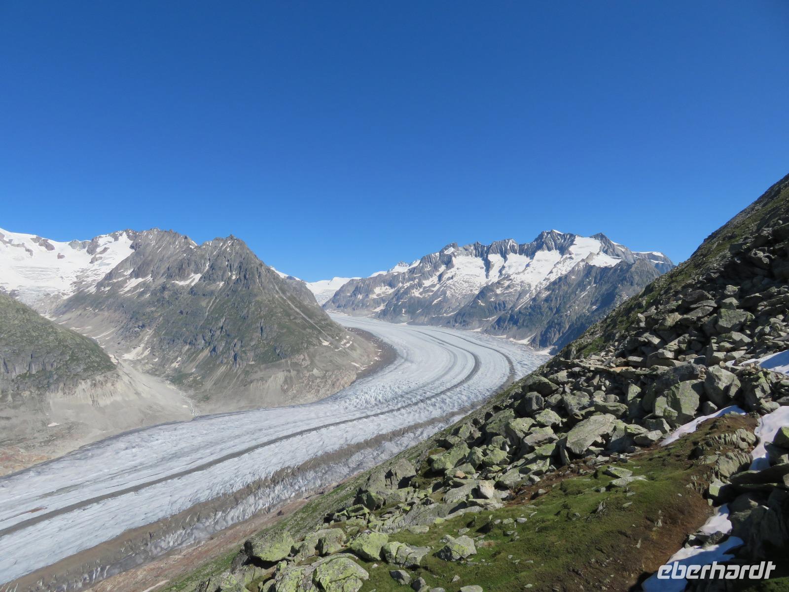 Uns weckt heute strahlender Sonnenschein. Wir freuen uns auf einen erlebnisreichen Tag. Gemeinsam wandern wir Gästen über die Promenade Richtung Bettmeralp. Schon während der Wanderung bewundern wir das fantastische Panorama und erfreuen uns an der herrlichen Pracht der bunten Bergblumen. Die Gondelbahn bringt uns auf das Bettmerhorn auf 2.647 Meter Höhe. Wir befinden uns mitten im UNESCO-Weltnaturerbe „Jungfrau-Aletsch-Bietschhorn". Zunächst stockt uns der Atem im Angesicht des einmaligen Panoramas, welches uns auf der Terrasse des Restaurants eröffnet. Vom Mont Blanc über das markante Weisshorn und natürlich das Matterhorn, den Dom und die Monte Rosa Gruppe mit der Duforspitze bis hin zum Monte Leone liegt die gesamte Alpenkette im strahlenden Sonnenschein ohne ein Wölkchen am Himmel vor uns. Wir können uns kaum von diesem Anblick loslösen. Immer wieder klicken die Auslöser der Kameras. Aber es gibt ja noch mehr zu sehen. Wir gehen zum Aussichtspunkt hoch über dem Aletschgletscher. Er leigt uns zu Füßen und wir sehen auch hier, wie sich die Gletscher zurückziehen. Der Aletschgletscher ist mit 23 Kilometern der längste Gletscher der Alpen. In der Ausstellung „Faszination Aletsch" erfahren wir interessante Details zum Gletscher. Nach einem ausgiebigen Aufenthalt auf dem Berg fahren wir mit der Gondelbahn zur Bettmeralp. Einige Gäste nutzten den Tag für individuelleTouren zurück zur Riederalp. Mit einer größeren Gruppe wandern wir vorbei am Bettmersee zurück zur Gopplerlücke. Auch dabei genießen wir immer wieder die einzigartige Bergwelt. Durch bunte Wiesen mit wilden Orchideen, Alpenklee, Habichtskraut, Bergmagariten, Alpen-Glockenblumen und anderen Blumen führt uns die Tour über den Herrenweg zur Riederalp. Wir alle genießen diese schöne Wanderung. Auf der Riederalp angekommen, fahren wir mit der Gondelbahn auf die Moosfluh. Vom Aussichtspunkt bietet sich uns aus einer ganz anderen Perspektive ein toller Blick auf den Aletschgletscher und dessen Gletscherzunge. Den restlichen Nachmittag nutzen wir zum Entspannen im Hallenbad oder um einfach vom Balkon aus die Blicke und Gedanken in die wunderschöne Bergwelt schweifen zu lassen. Wir sind uns einig: Ein herrlicher Tag geht zu Ende!
