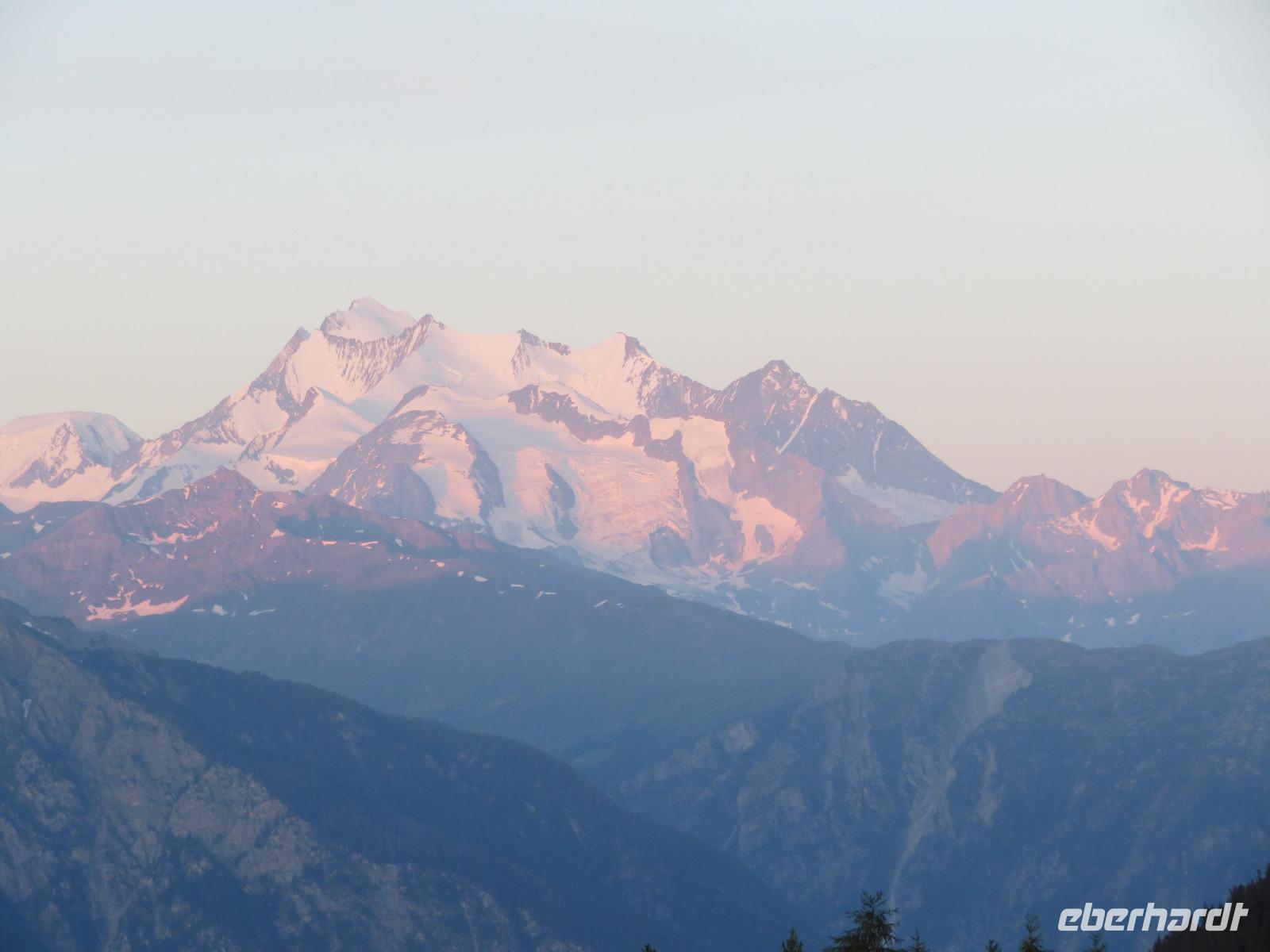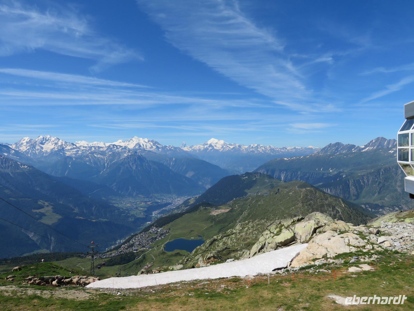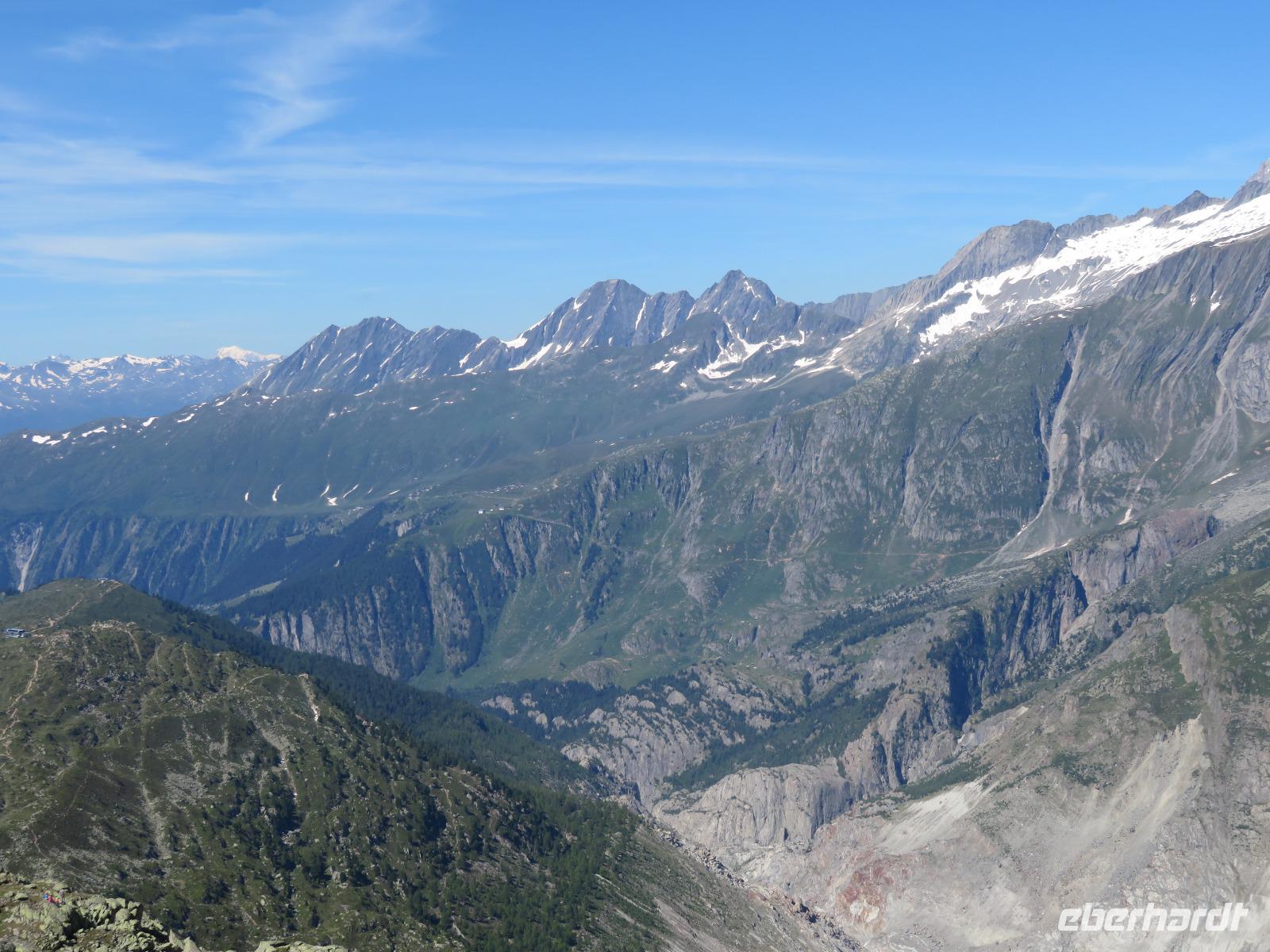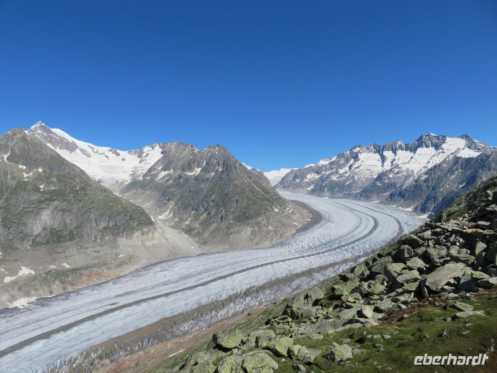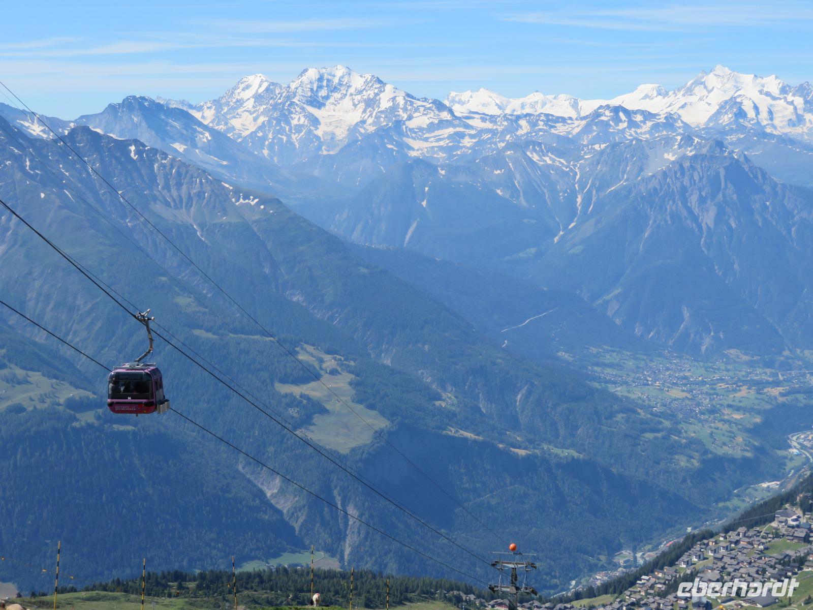 Uns weckt heute strahlender Sonnenschein. Wir freuen uns auf einen erlebnisreichen Tag. Gemeinsam wandern wir Gästen über die Promenade Richtung Bettmeralp. Schon während der Wanderung bewundern wir das fantastische Panorama und erfreuen uns an der herrlichen Pracht der bunten Bergblumen. Die Gondelbahn bringt uns auf das Bettmerhorn auf 2.647 Meter Höhe. Wir befinden uns mitten im UNESCO-Weltnaturerbe „Jungfrau-Aletsch-Bietschhorn". Zunächst stockt uns der Atem im Angesicht des einmaligen Panoramas, welches uns auf der Terrasse des Restaurants eröffnet. Vom Mont Blanc über das markante Weisshorn und natürlich das Matterhorn, den Dom und die Monte Rosa Gruppe mit der Duforspitze bis hin zum Monte Leone liegt die gesamte Alpenkette im strahlenden Sonnenschein ohne ein Wölkchen am Himmel vor uns. Wir können uns kaum von diesem Anblick loslösen. Immer wieder klicken die Auslöser der Kameras. Aber es gibt ja noch mehr zu sehen. Wir gehen zum Aussichtspunkt hoch über dem Aletschgletscher. Er leigt uns zu Füßen und wir sehen auch hier, wie sich die Gletscher zurückziehen. Der Aletschgletscher ist mit 23 Kilometern der längste Gletscher der Alpen. In der Ausstellung „Faszination Aletsch" erfahren wir interessante Details zum Gletscher. Nach einem ausgiebigen Aufenthalt auf dem Berg fahren wir mit der Gondelbahn zur Bettmeralp. Einige Gäste nutzten den Tag für individuelleTouren zurück zur Riederalp. Mit einer größeren Gruppe wandern wir vorbei am Bettmersee zurück zur Gopplerlücke. Auch dabei genießen wir immer wieder die einzigartige Bergwelt. Durch bunte Wiesen mit wilden Orchideen, Alpenklee, Habichtskraut, Bergmagariten, Alpen-Glockenblumen und anderen Blumen führt uns die Tour über den Herrenweg zur Riederalp. Wir alle genießen diese schöne Wanderung. Auf der Riederalp angekommen, fahren wir mit der Gondelbahn auf die Moosfluh. Vom Aussichtspunkt bietet sich uns aus einer ganz anderen Perspektive ein toller Blick auf den Aletschgletscher und dessen Gletscherzunge. Den restlichen Nachmittag nutzen wir zum Entspannen im Hallenbad oder um einfach vom Balkon aus die Blicke und Gedanken in die wunderschöne Bergwelt schweifen zu lassen. Wir sind uns einig: Ein herrlicher Tag geht zu Ende!